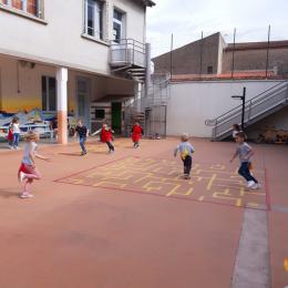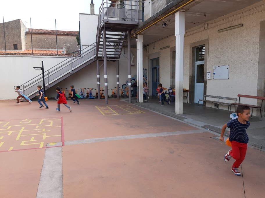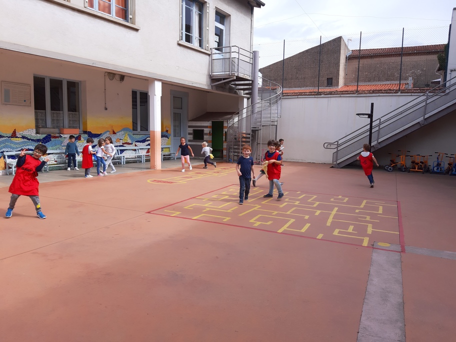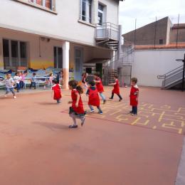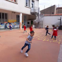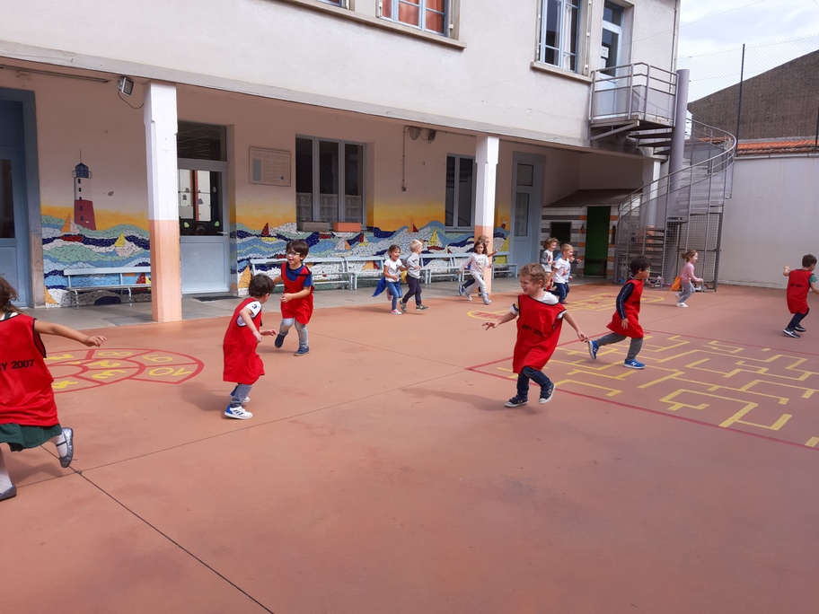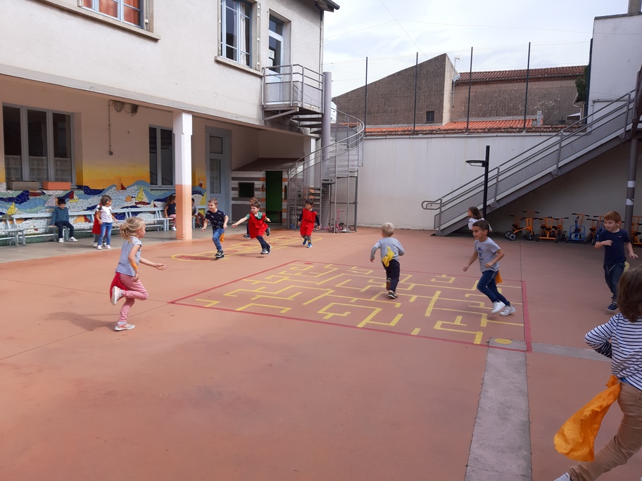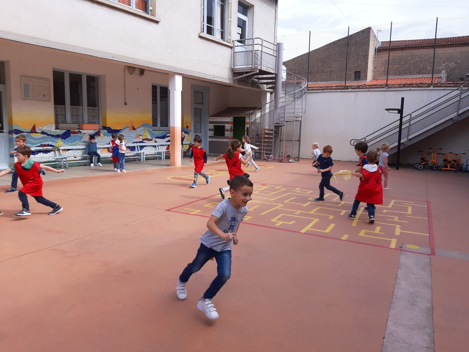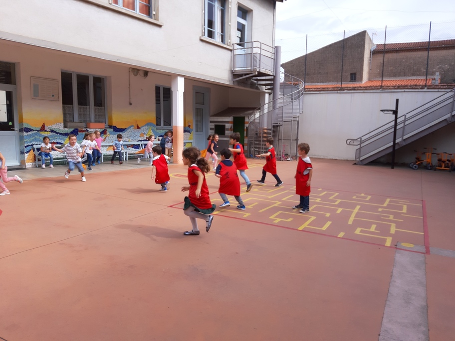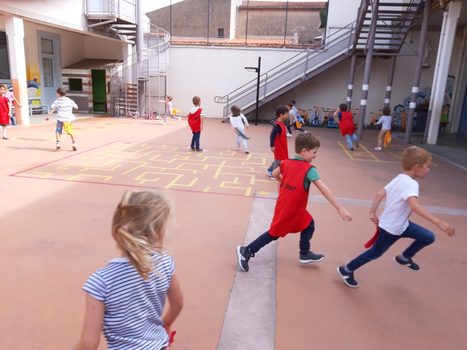 Nous avons joué à nous déplacer dans toute la cour en suivant un code sonore (marche lente, trot et course) puis nous avons joué aux renards/ poules et coqs : courir avec un foulard accroché dans le dos sans se le faire attraper!