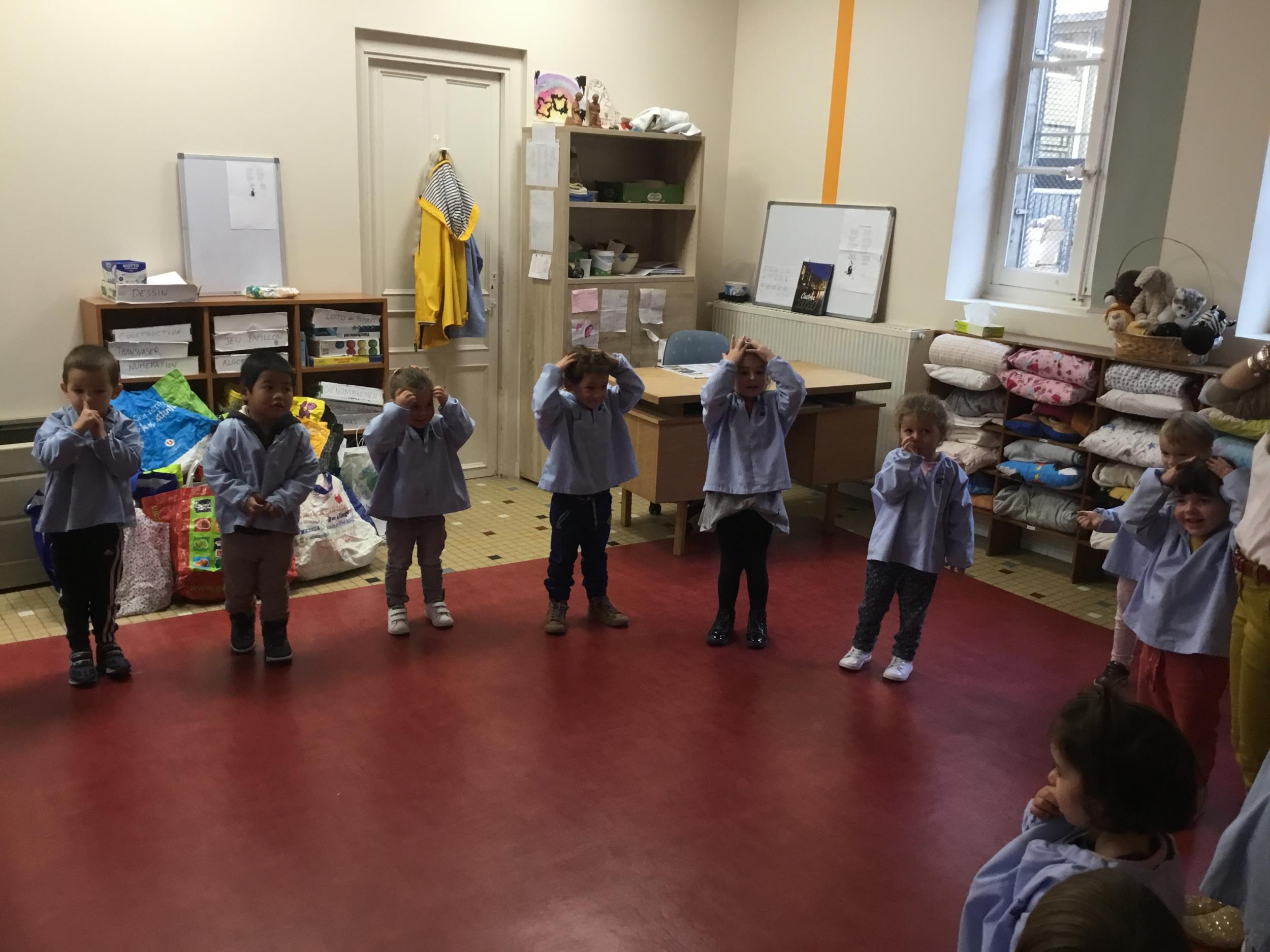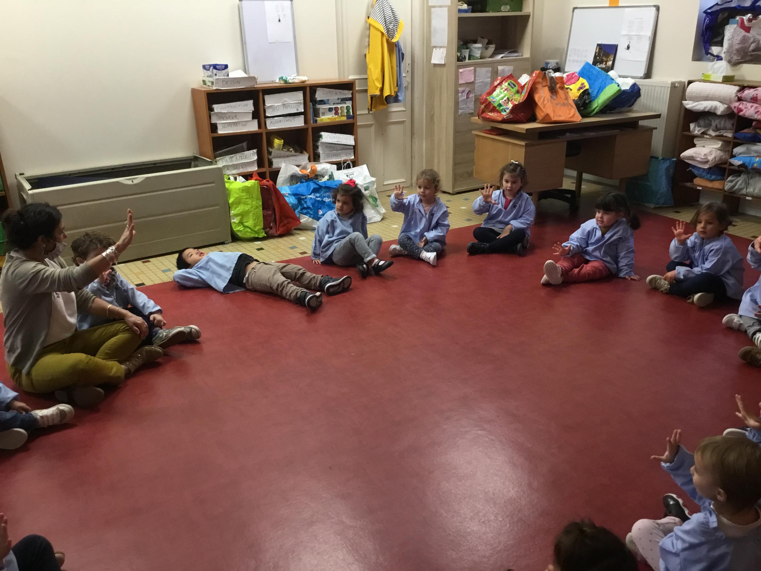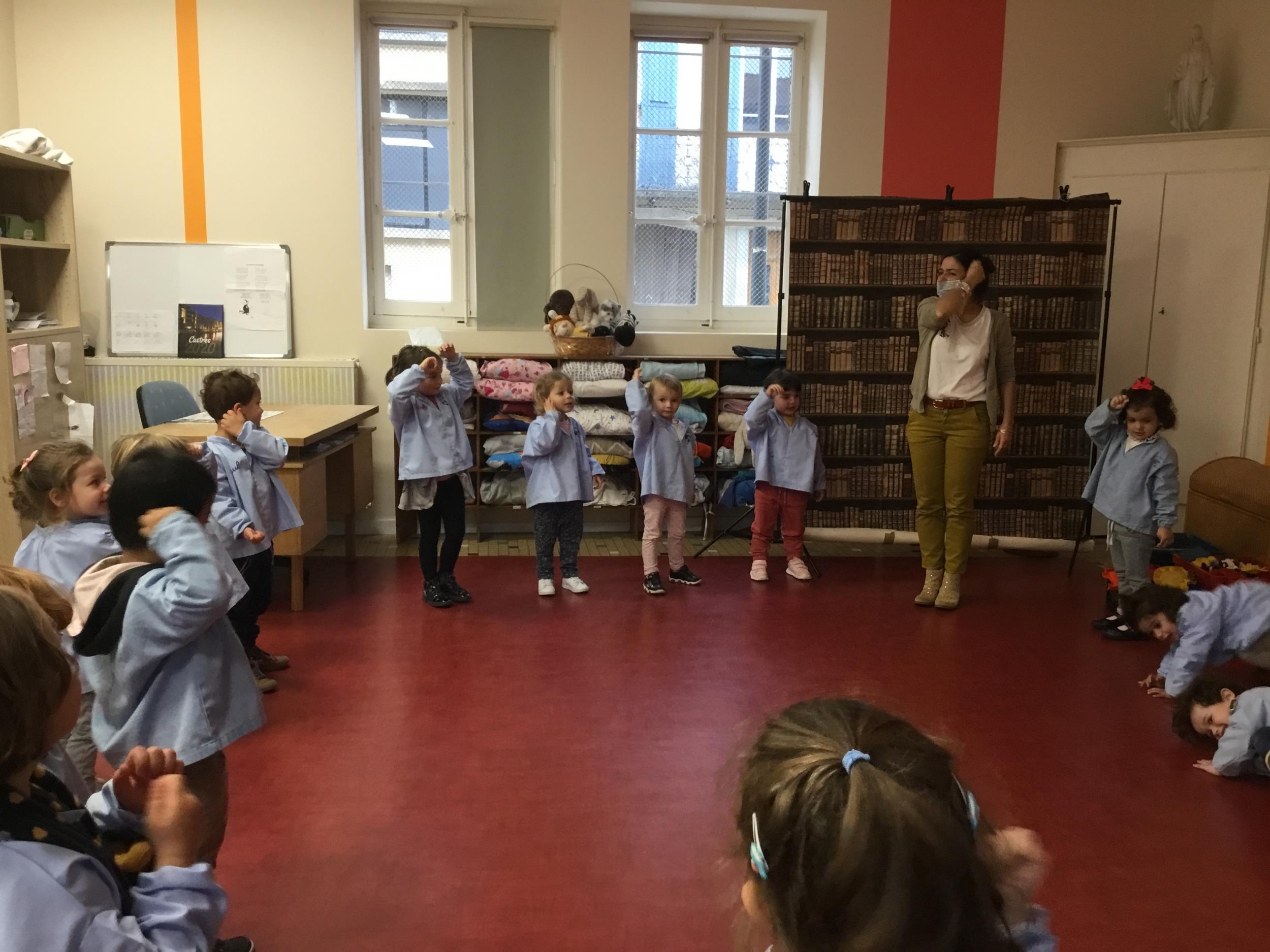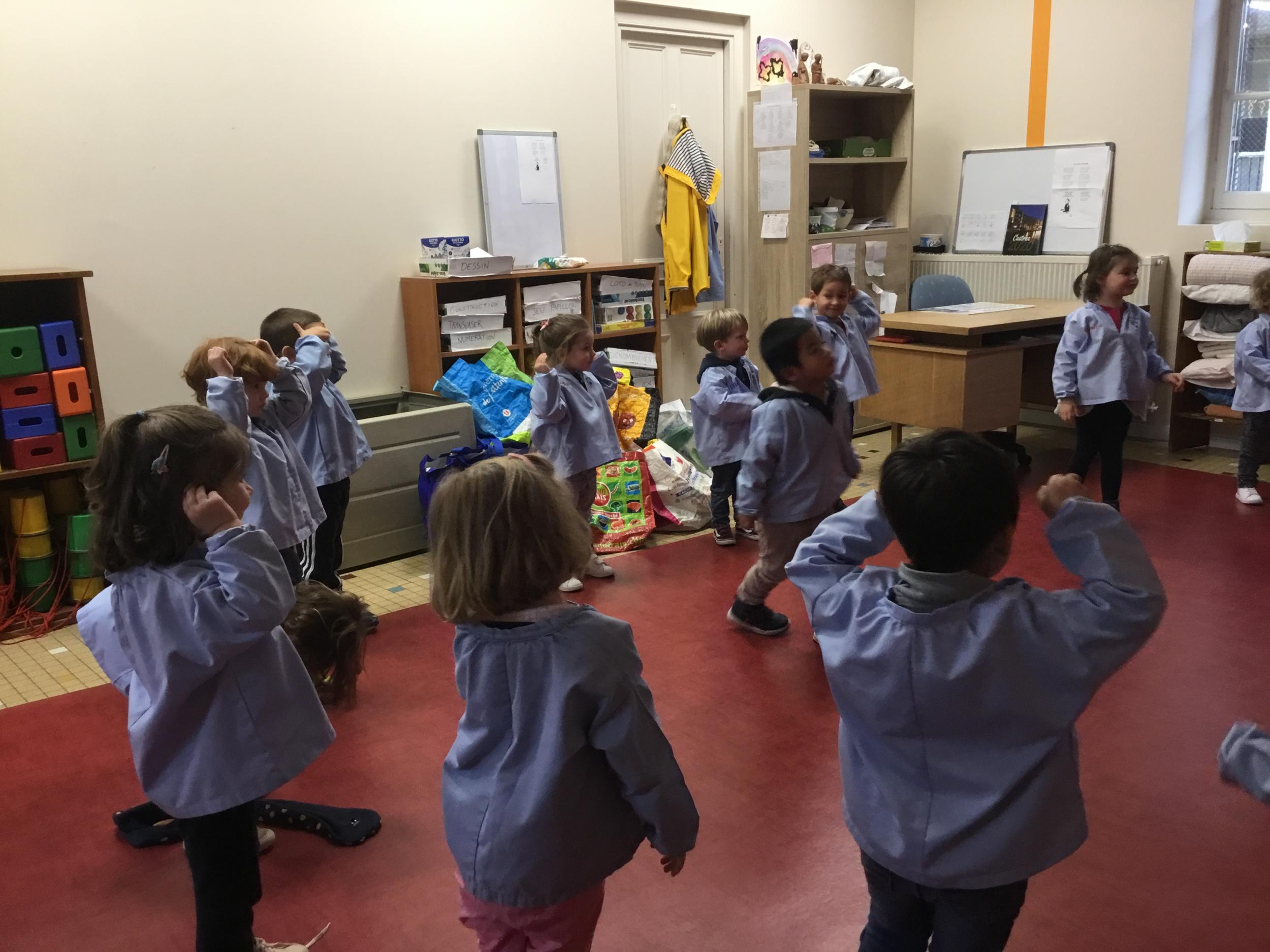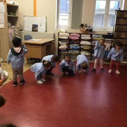 Pour prendre conscience de son corps, nous mimons le réveil et départ à l’école.