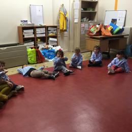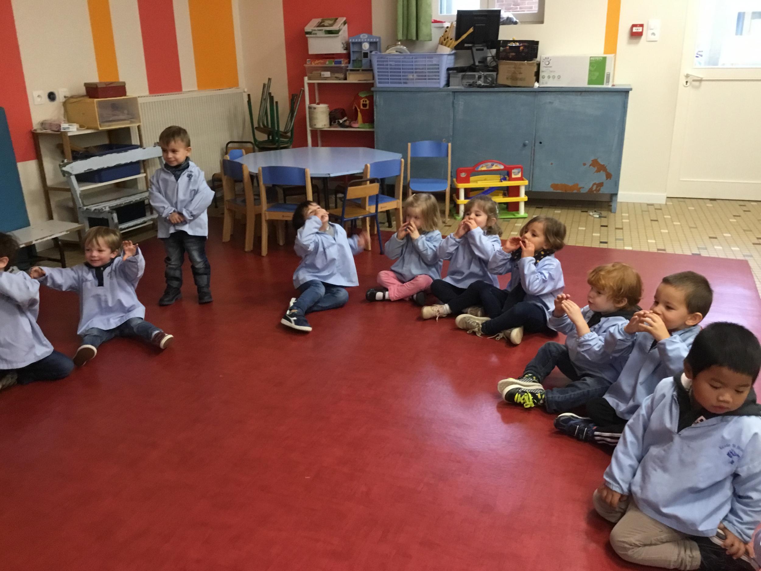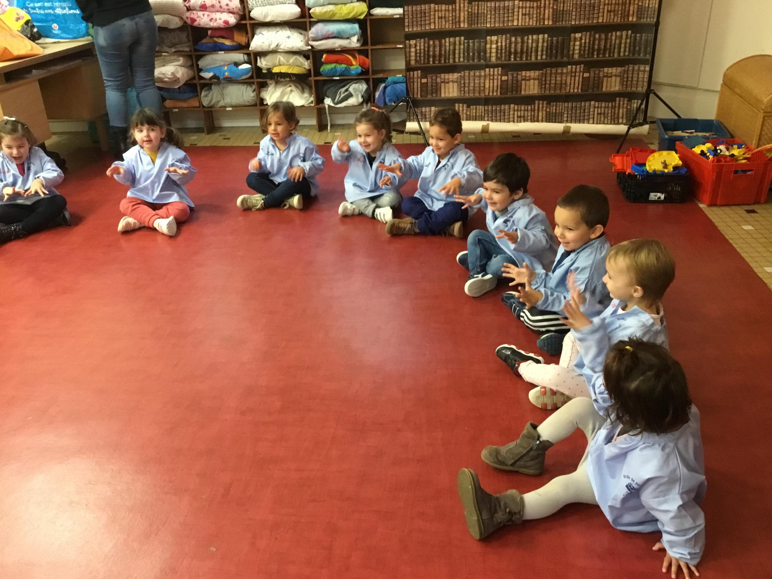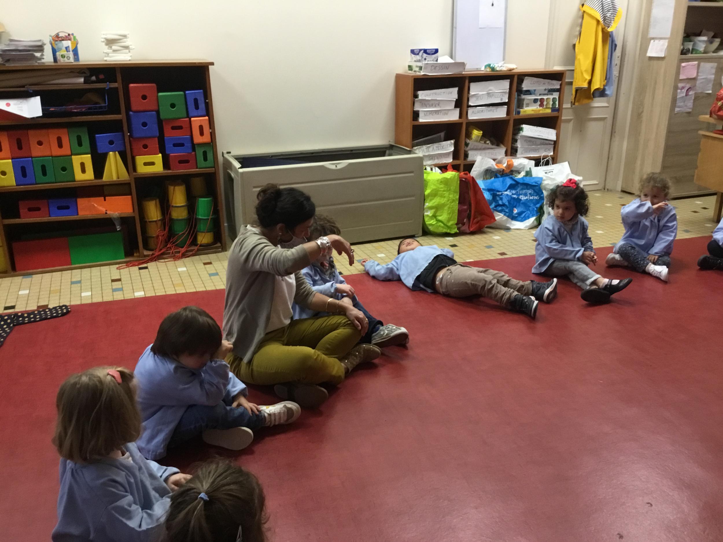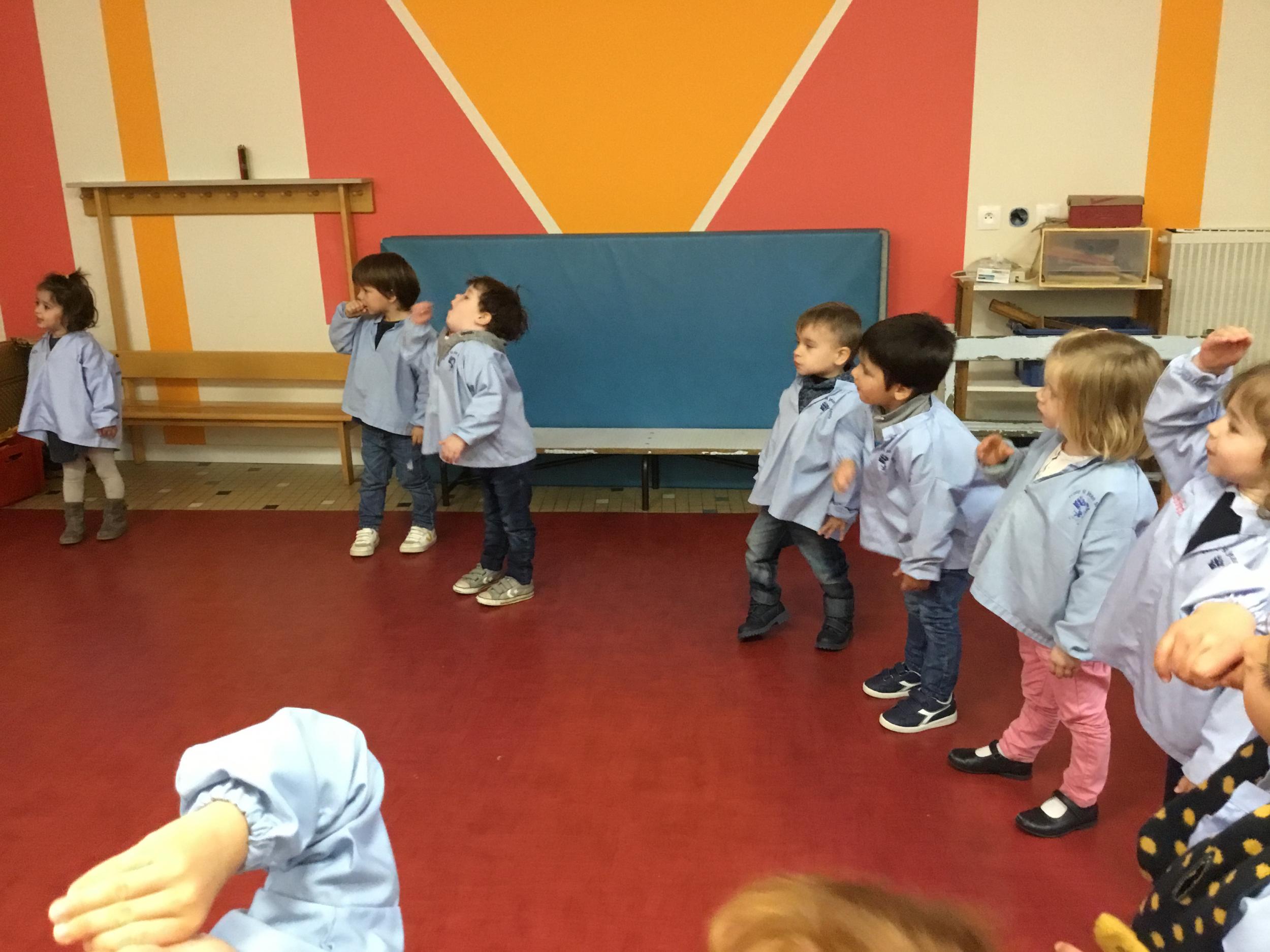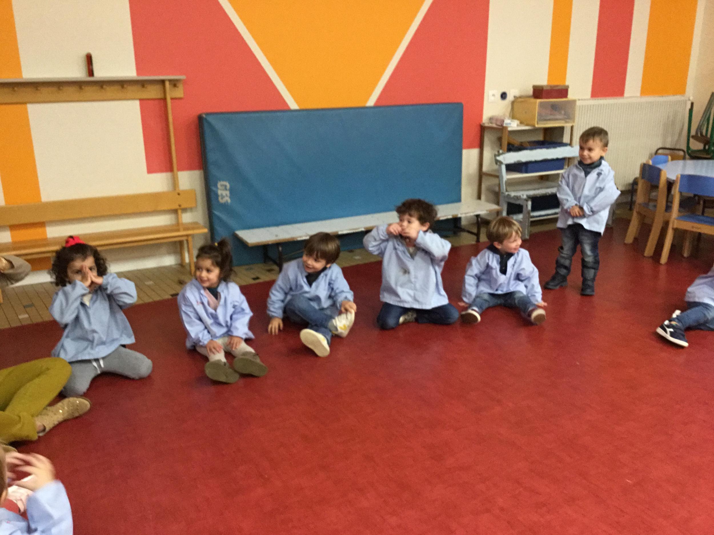 Pour prendre conscience de son corps, nous mimons le réveil et départ à l’école.