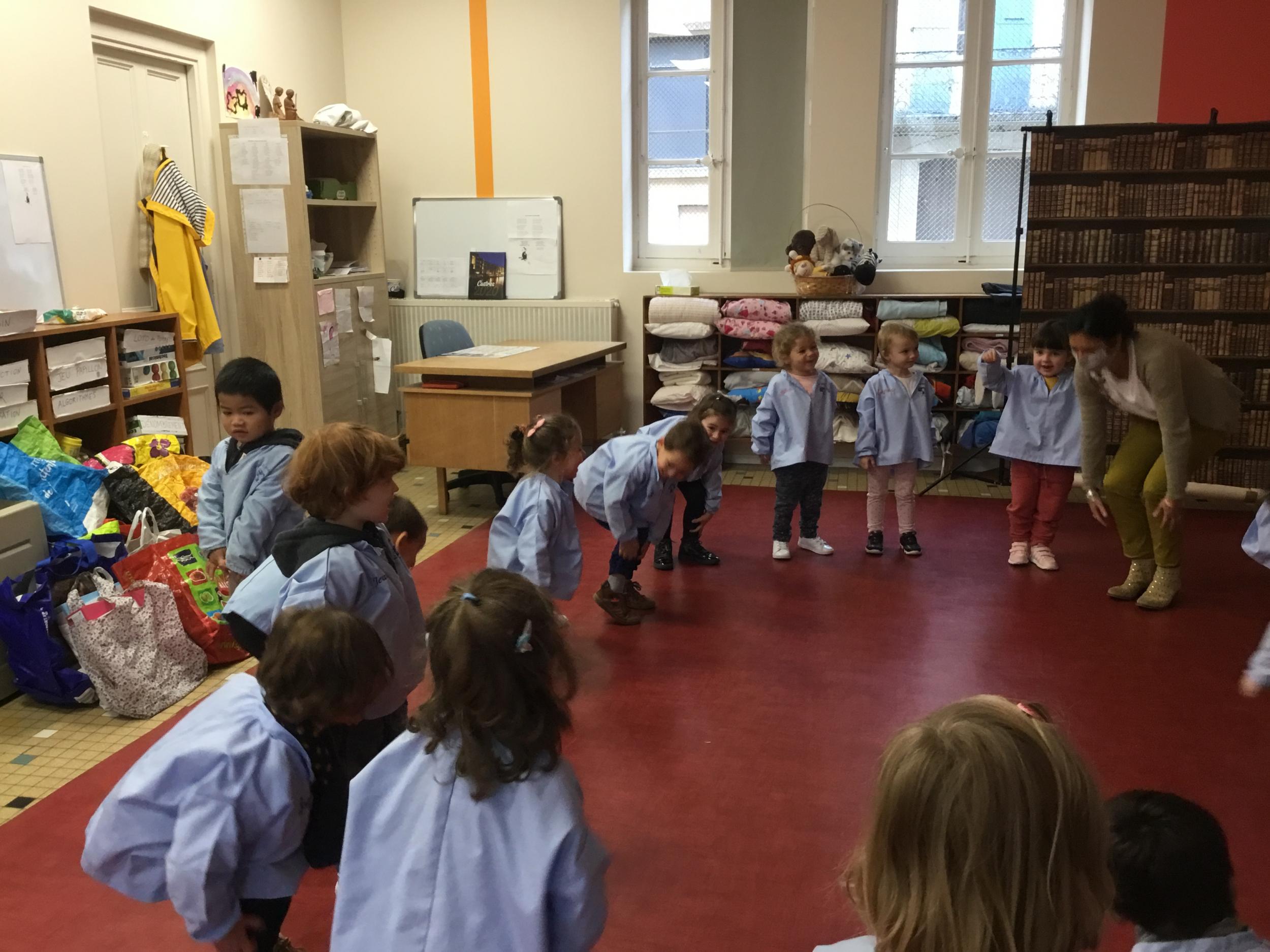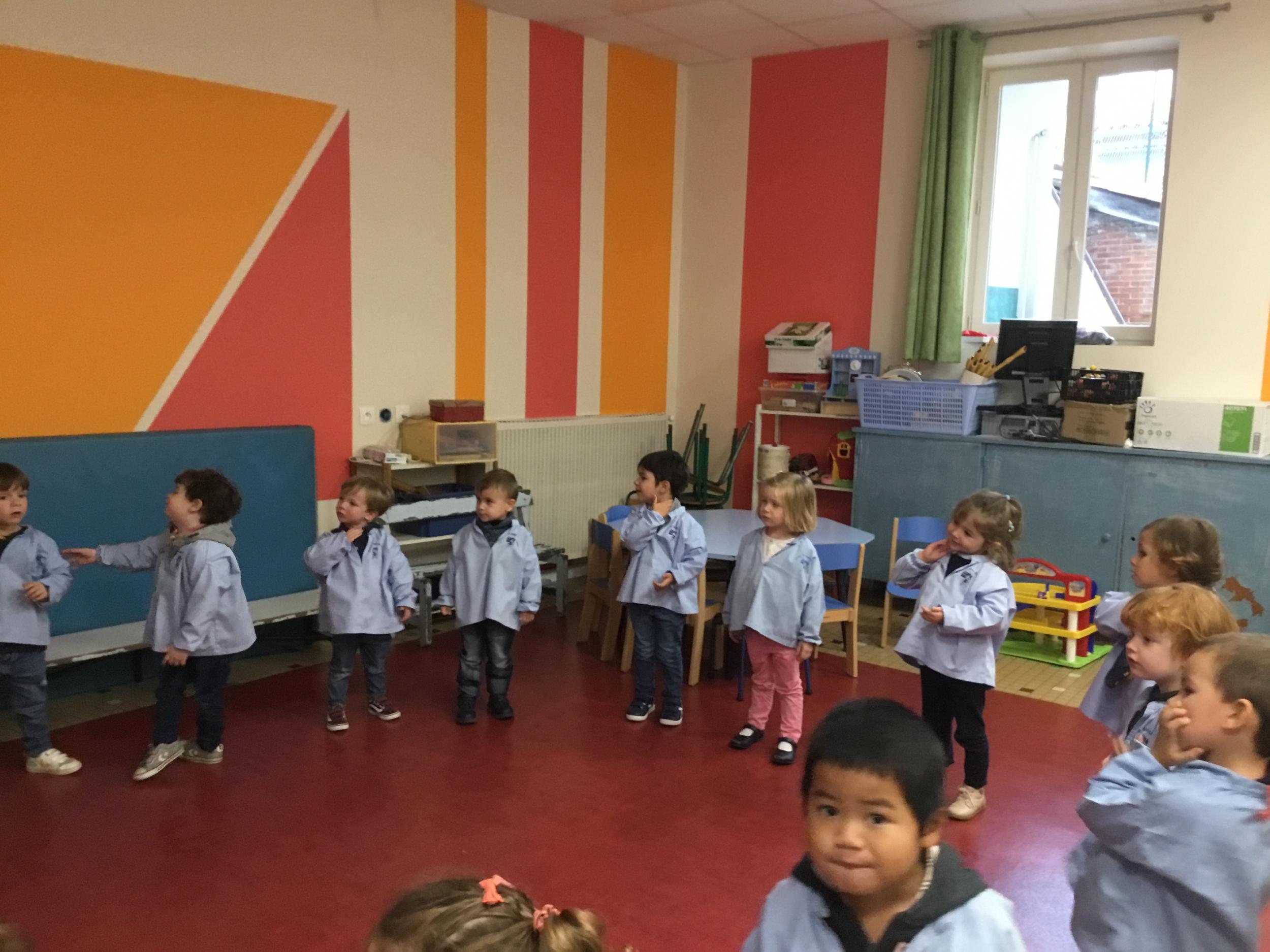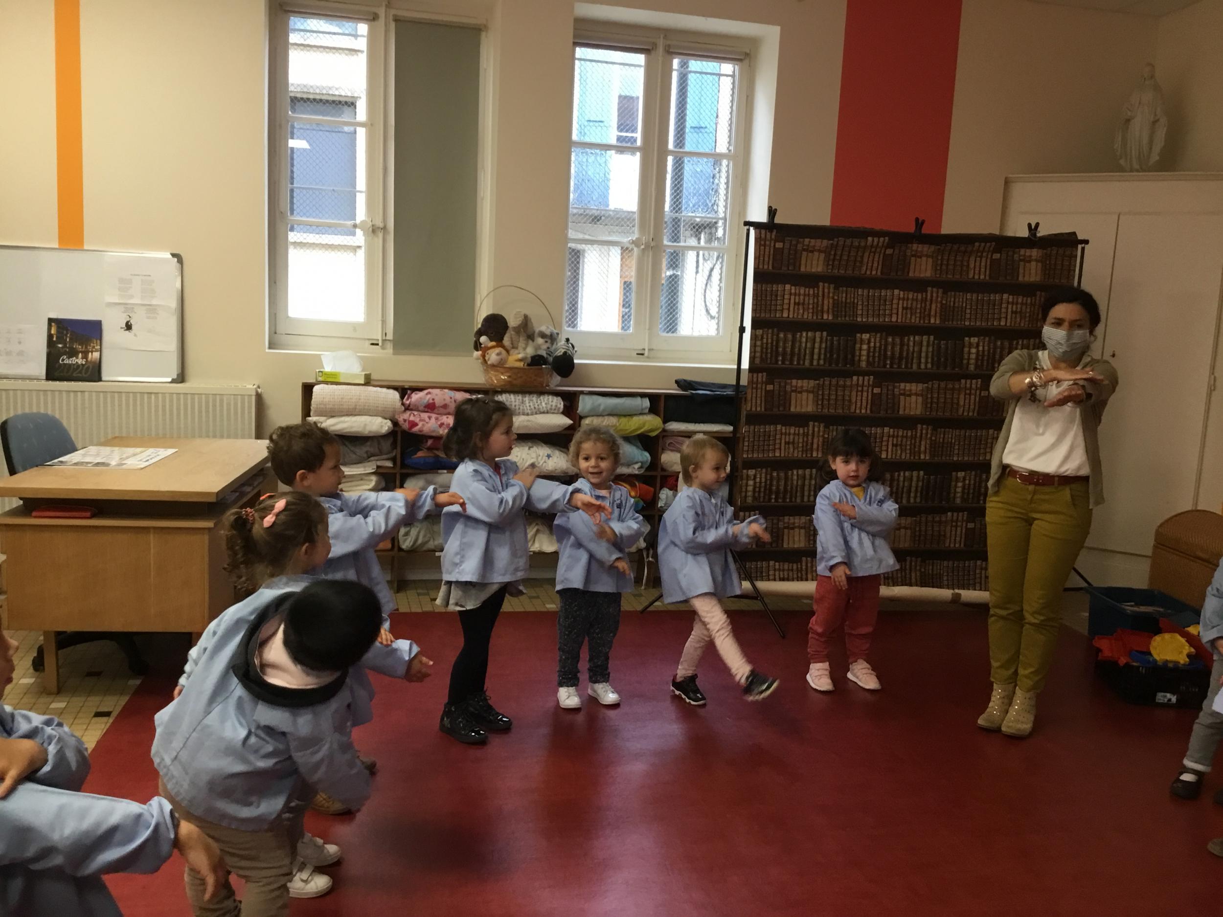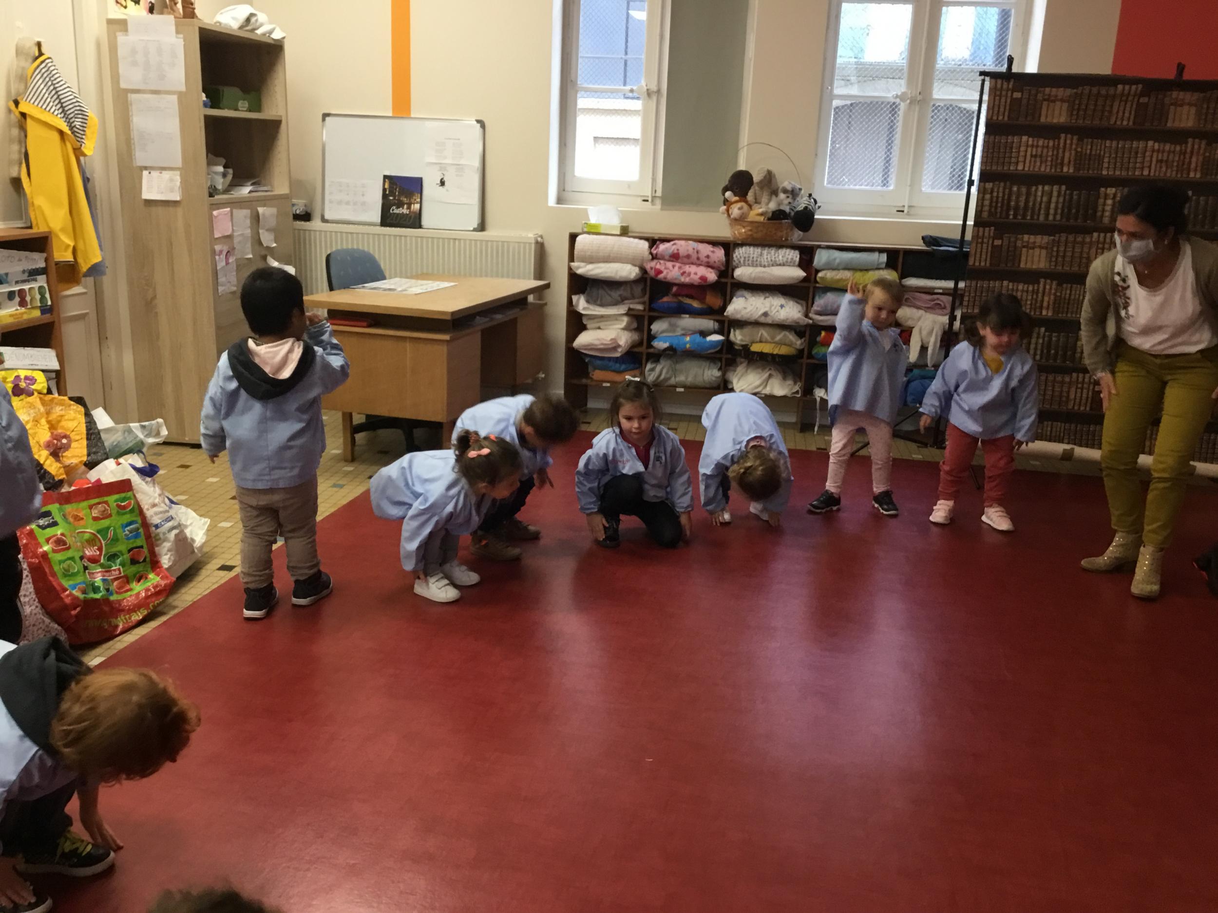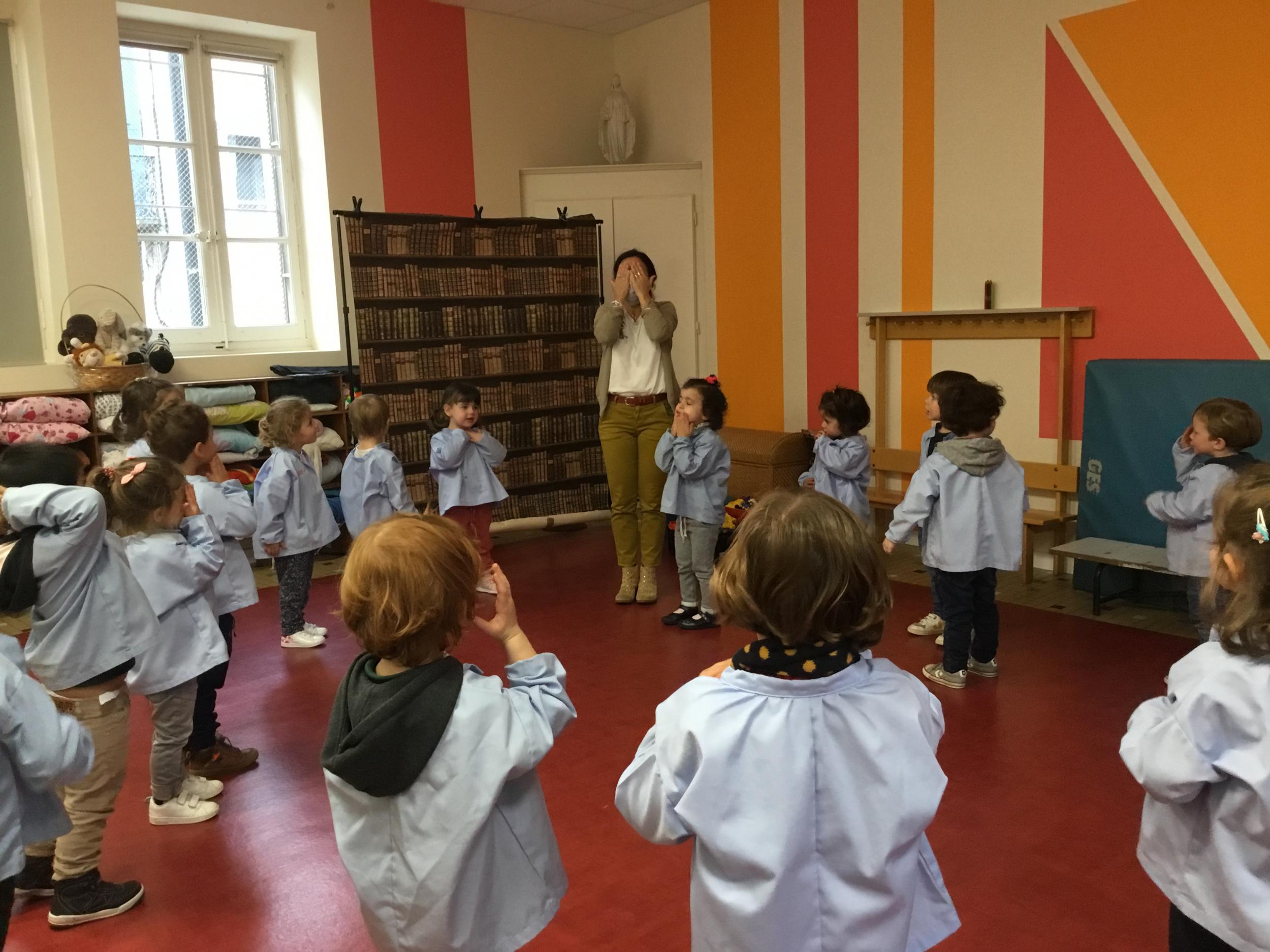 Pour prendre conscience de son corps, nous mimons le réveil et départ à l’école.