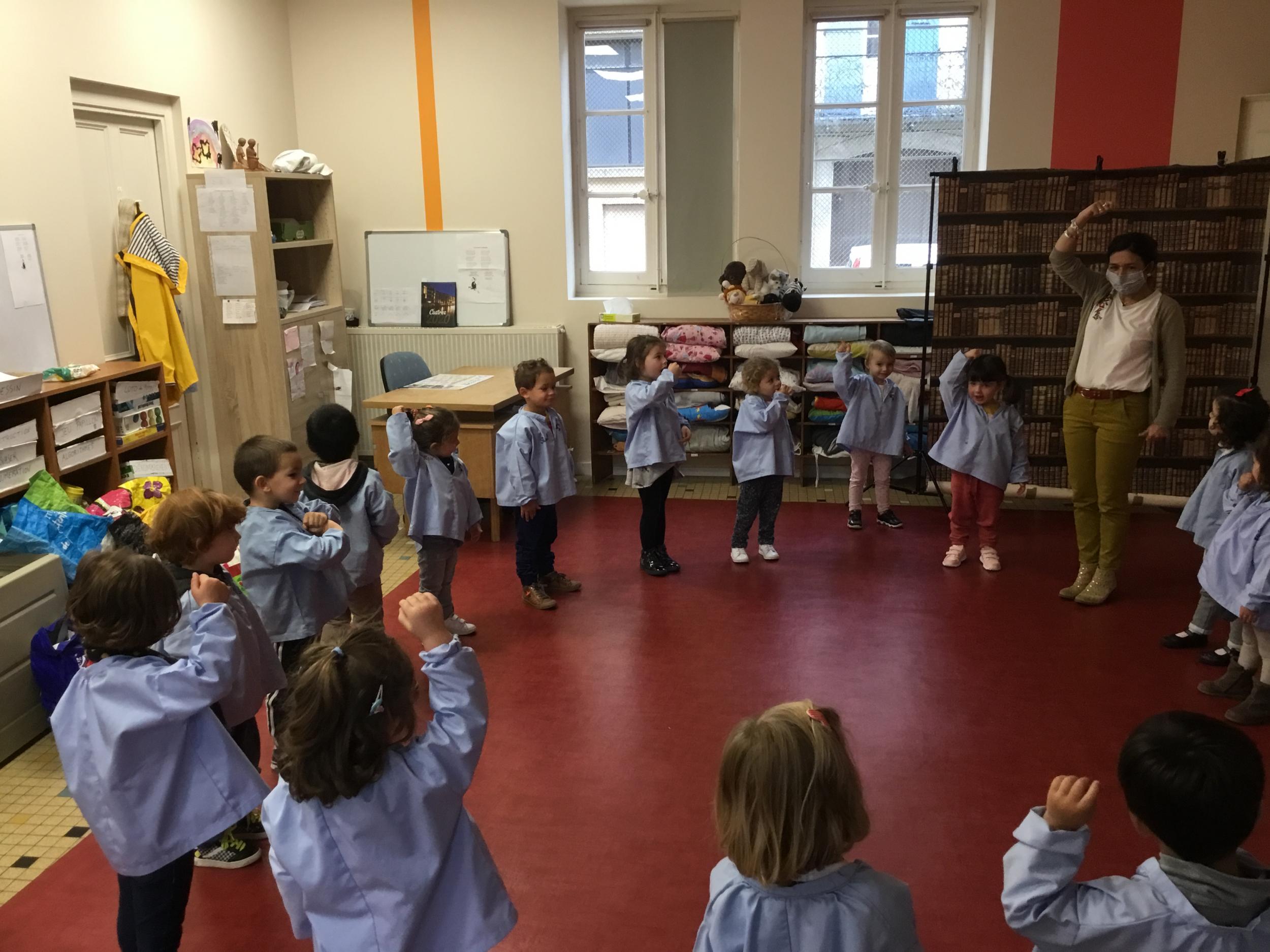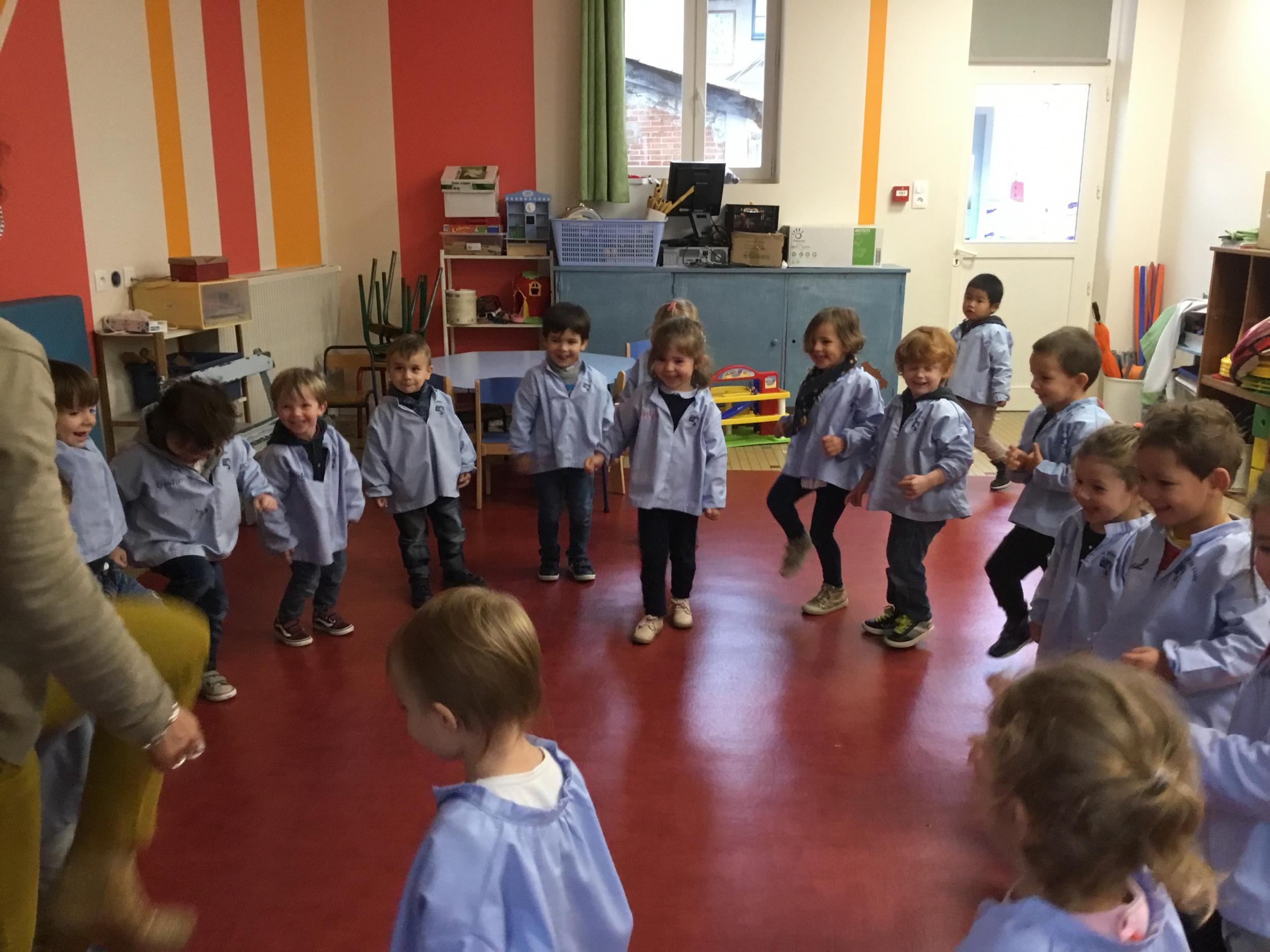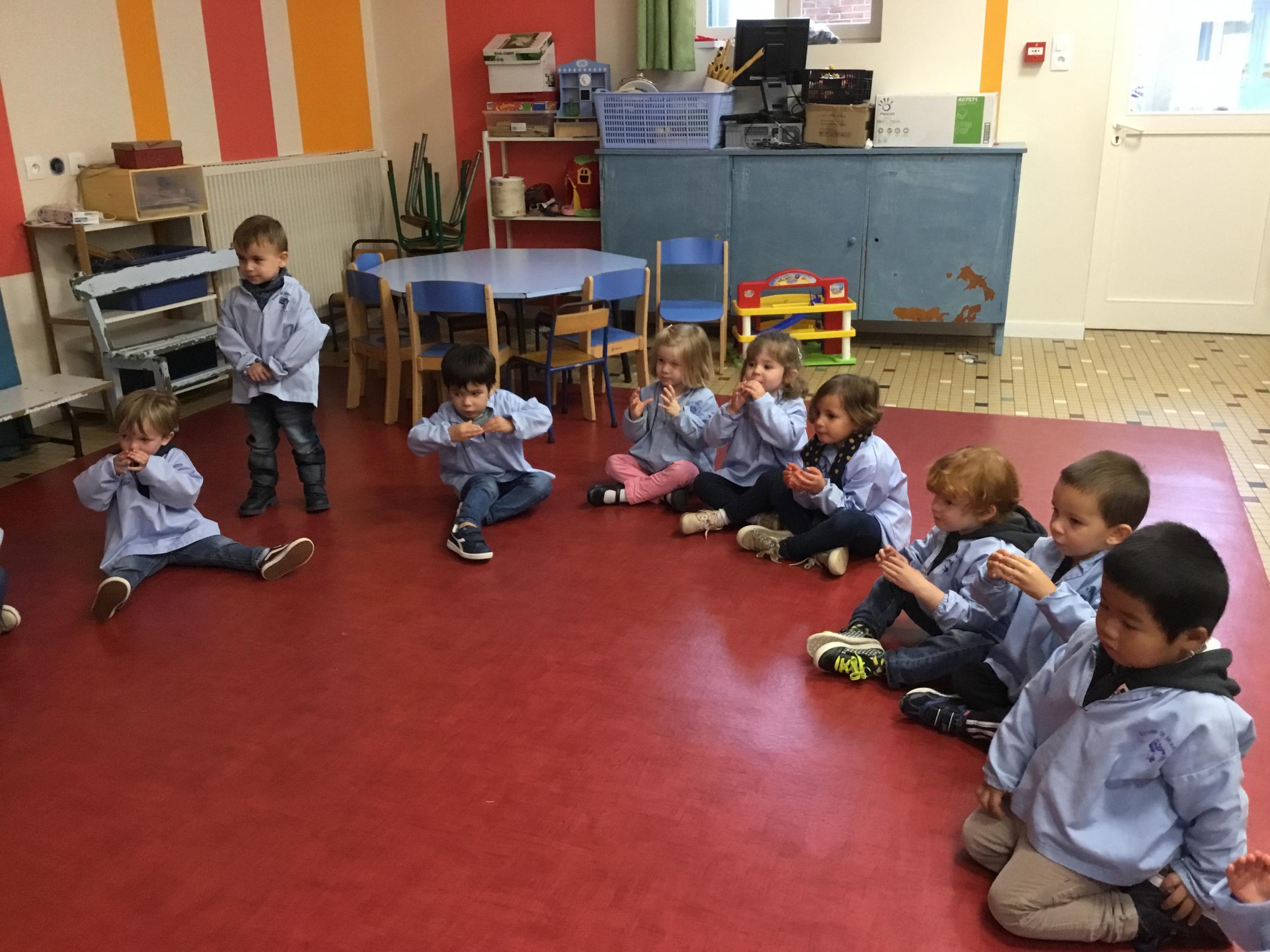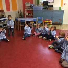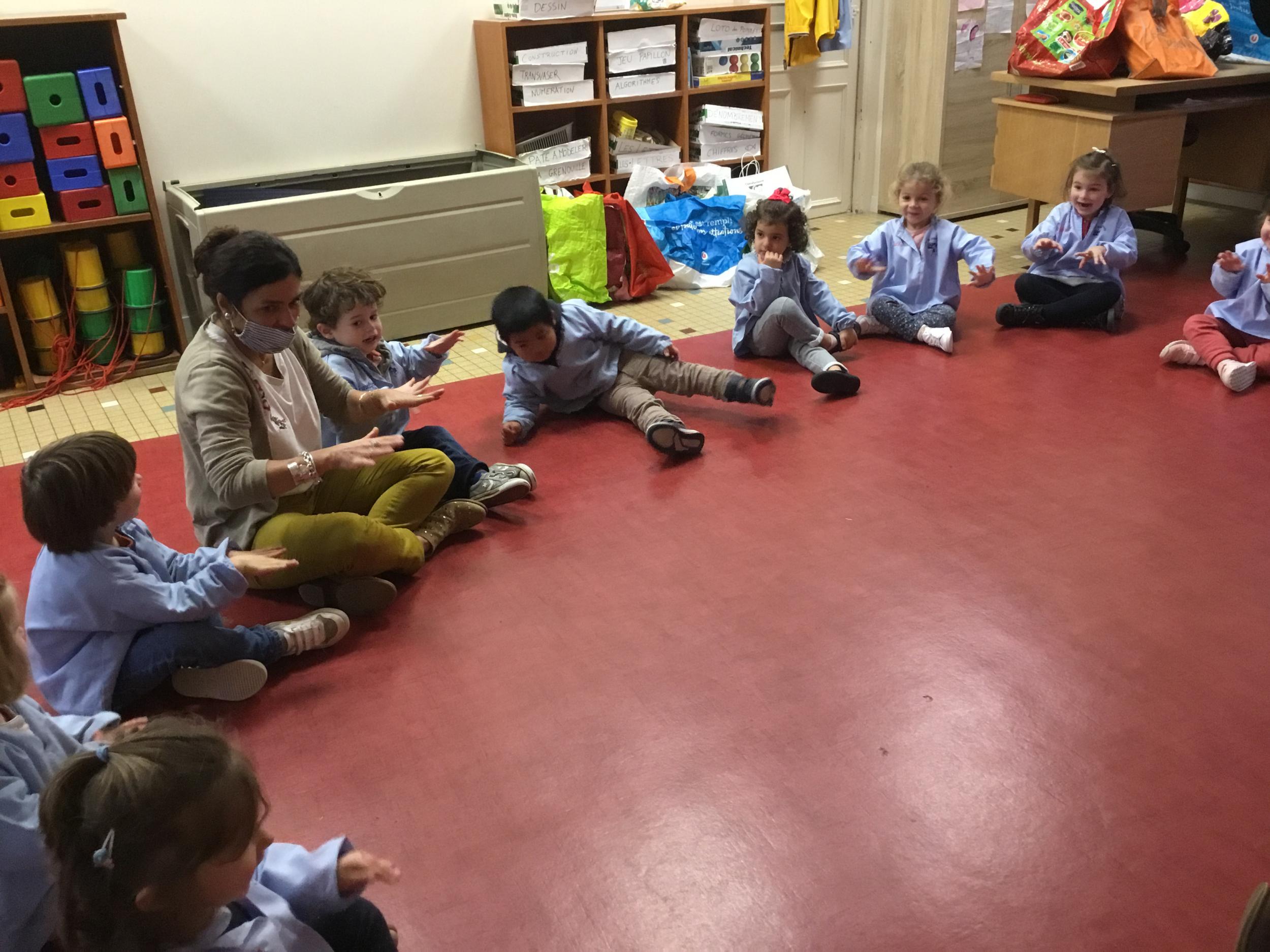 Pour prendre conscience de son corps, nous mimons le réveil et départ à l’école.