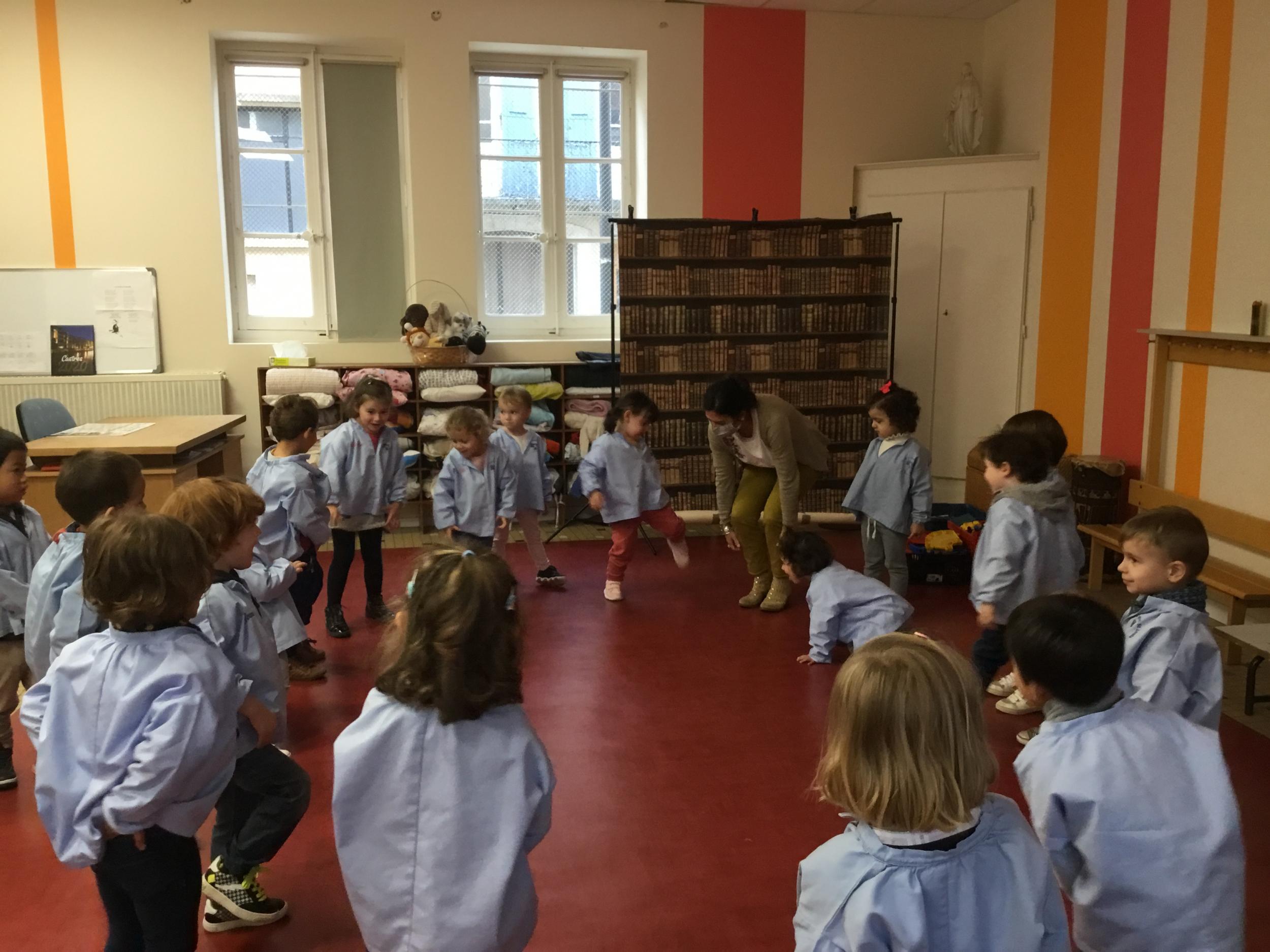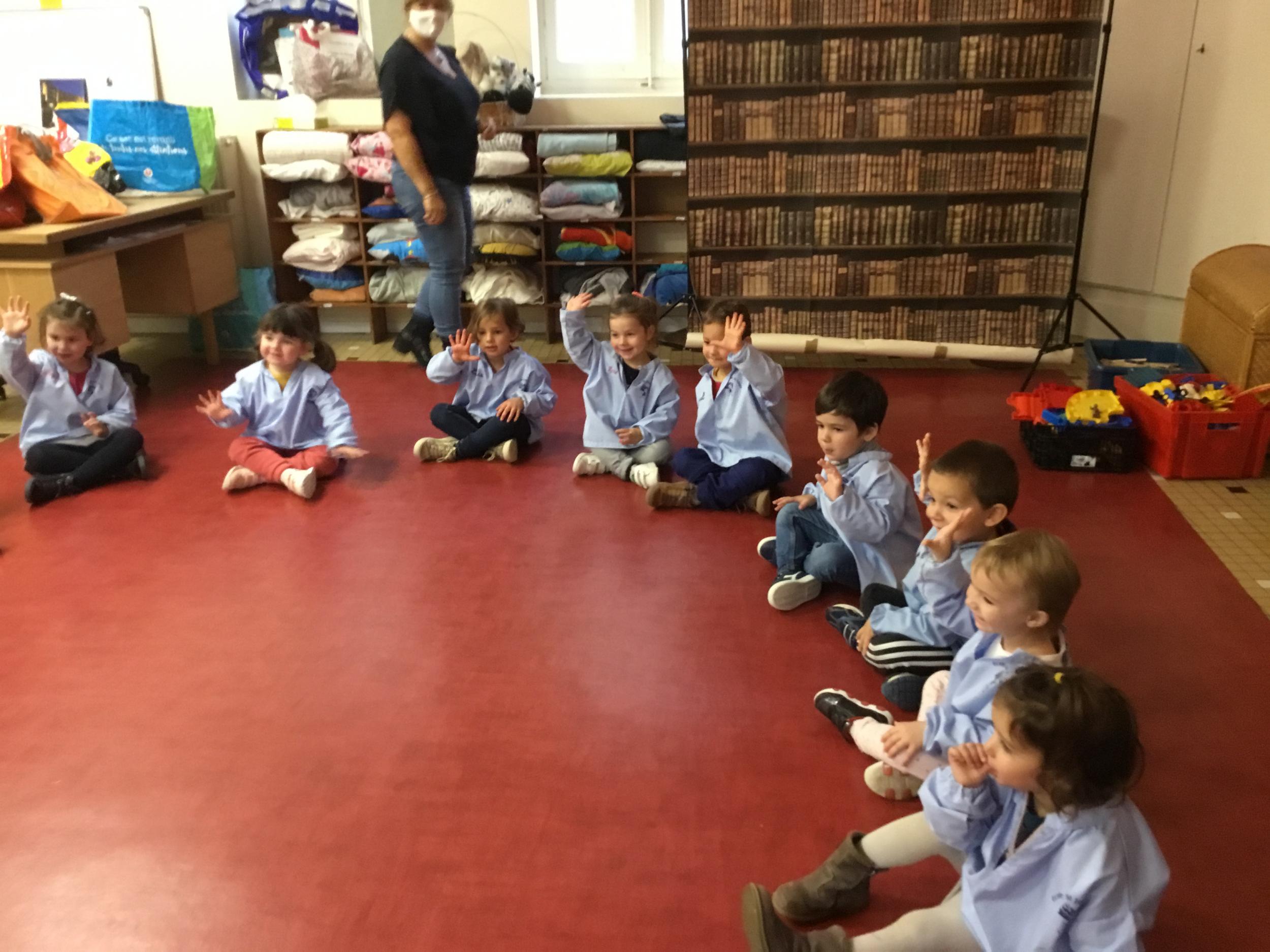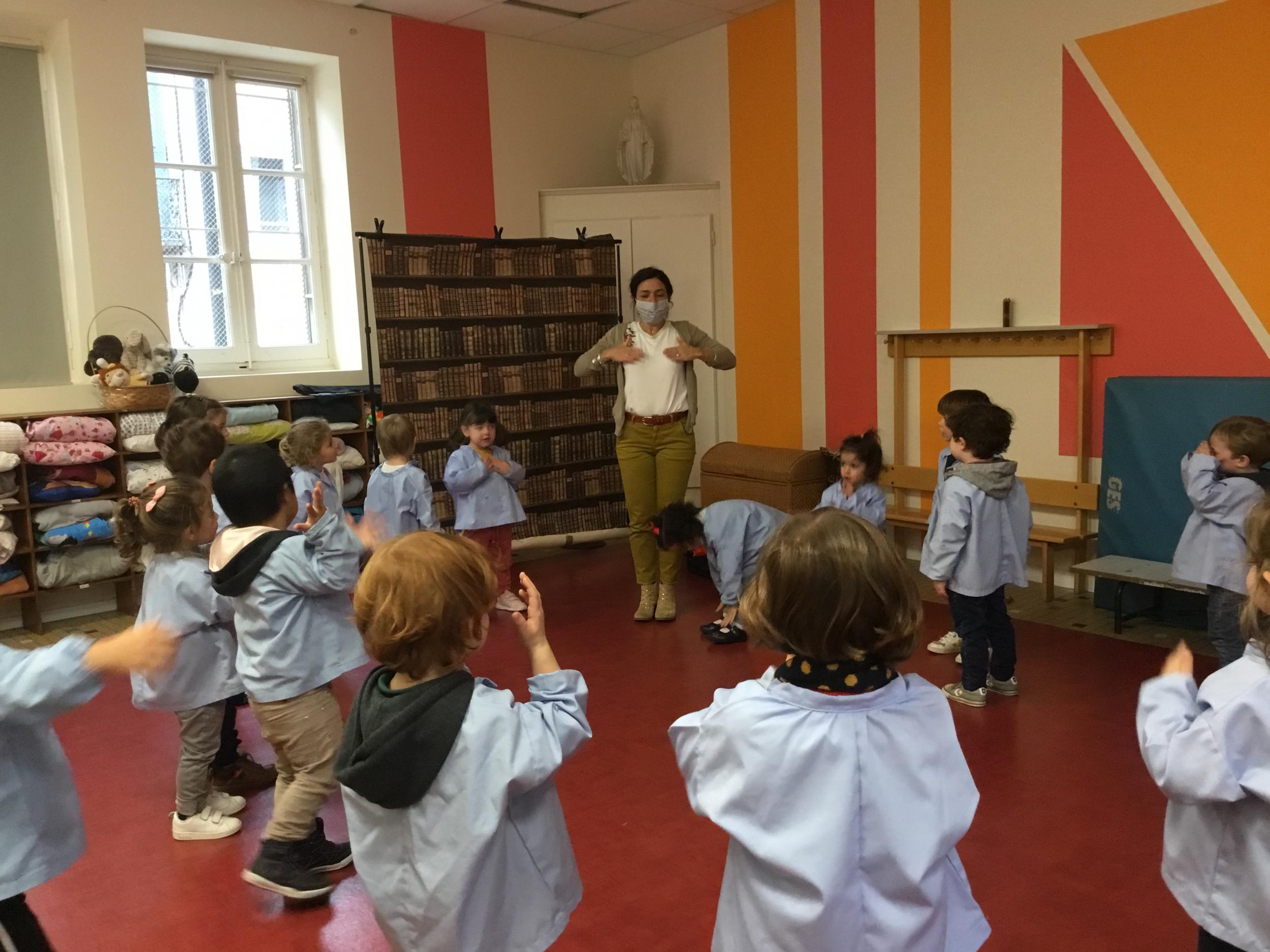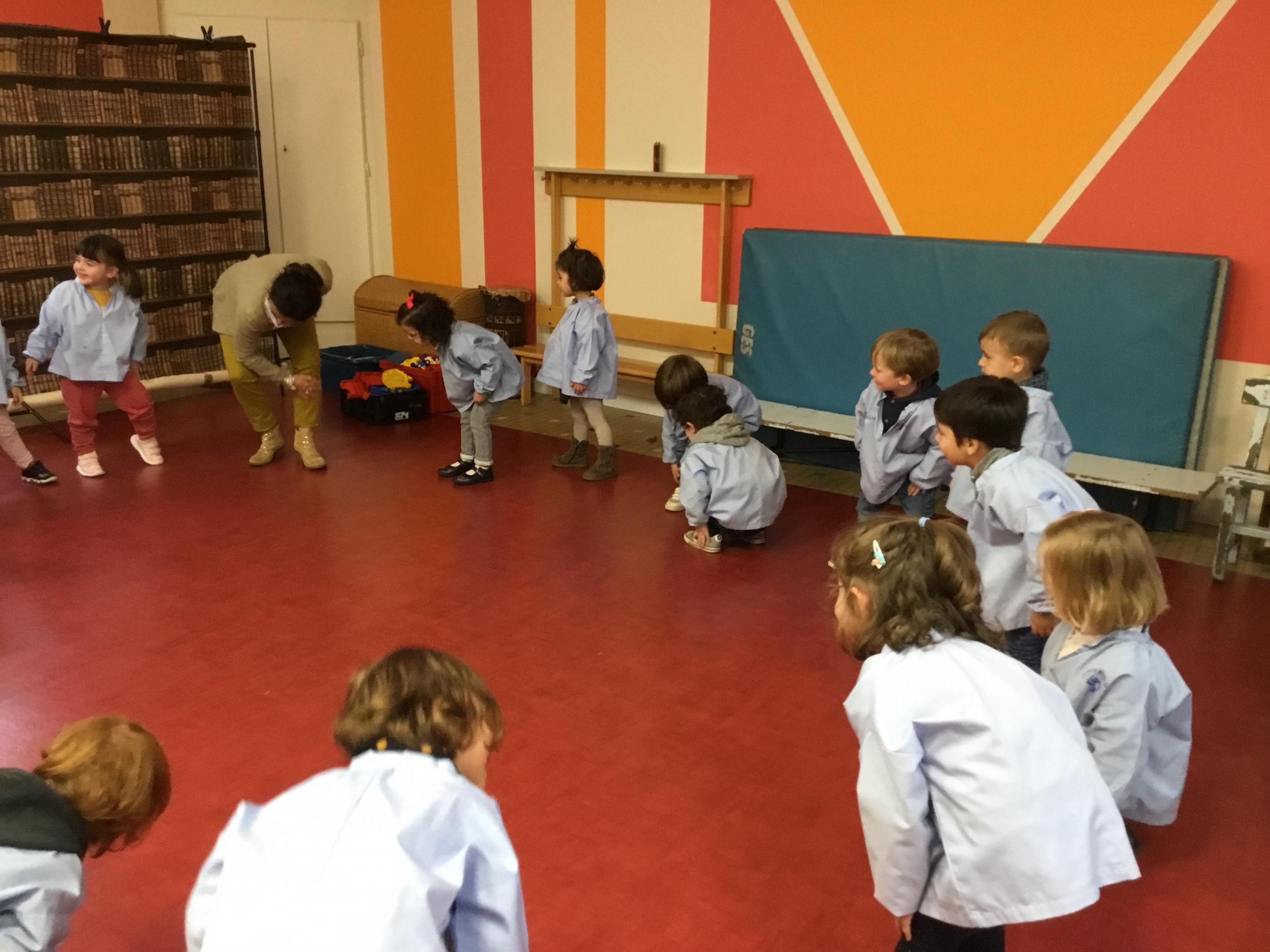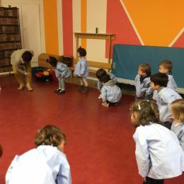 Pour prendre conscience de son corps, nous mimons le réveil et départ à l’école.