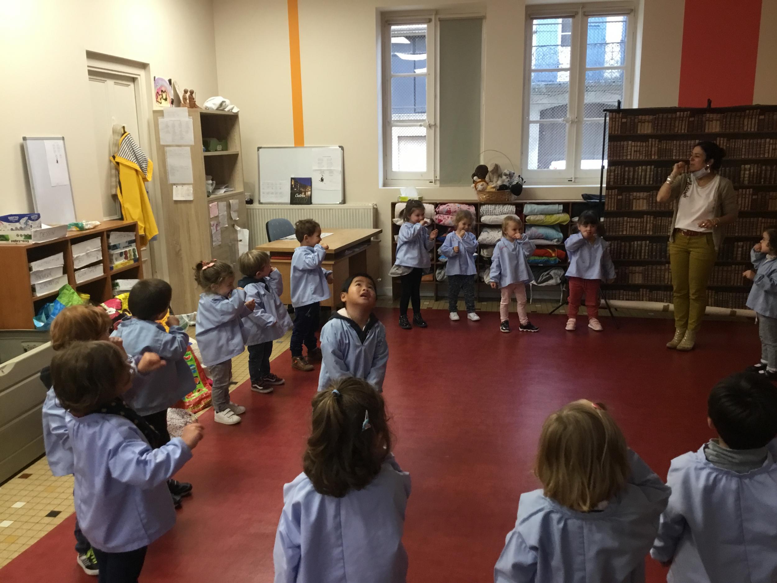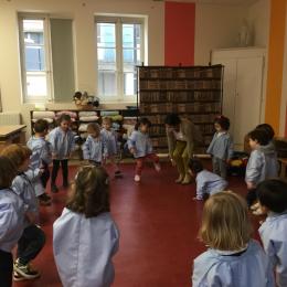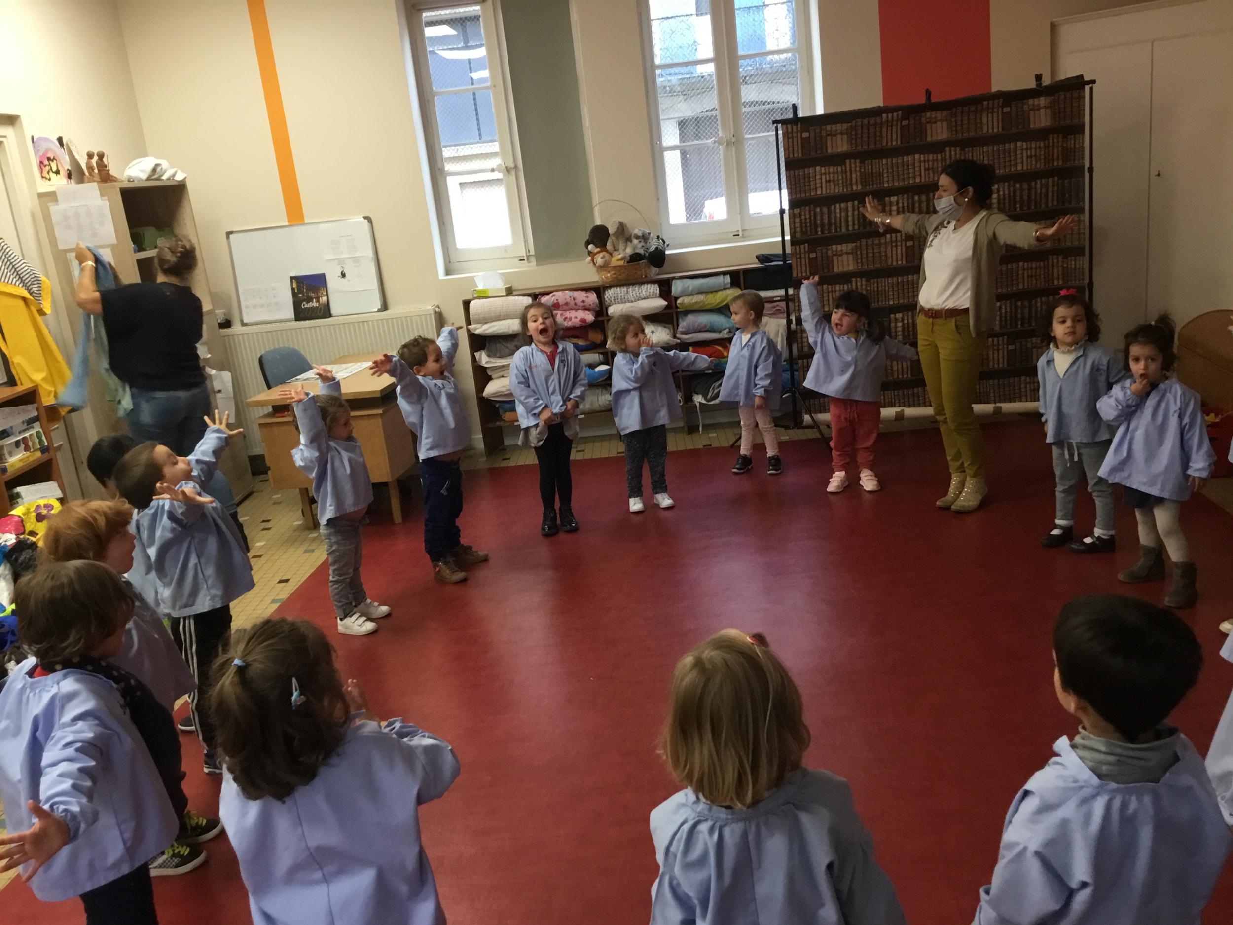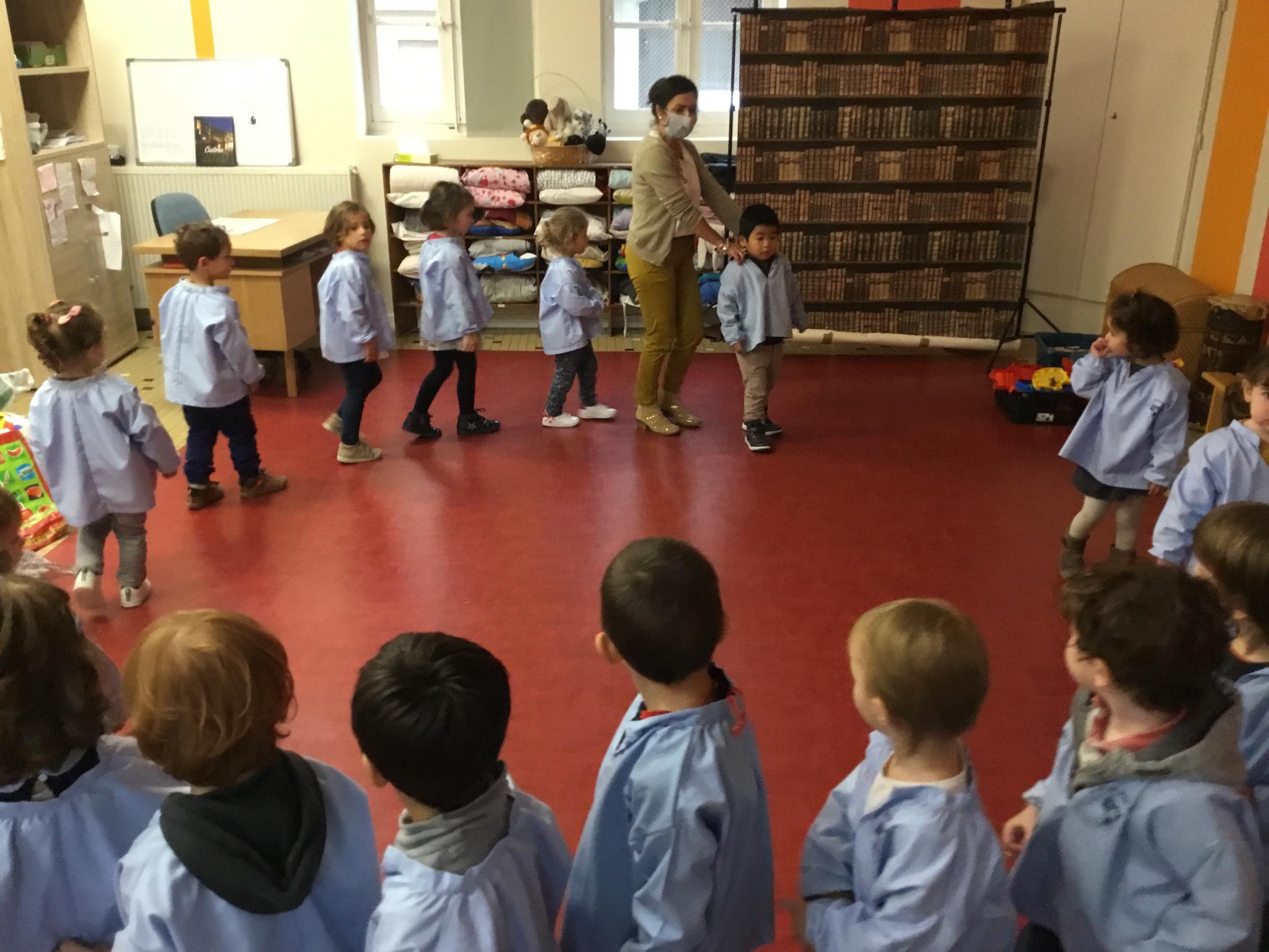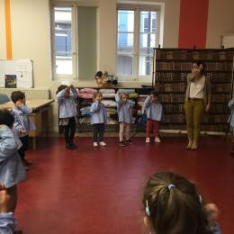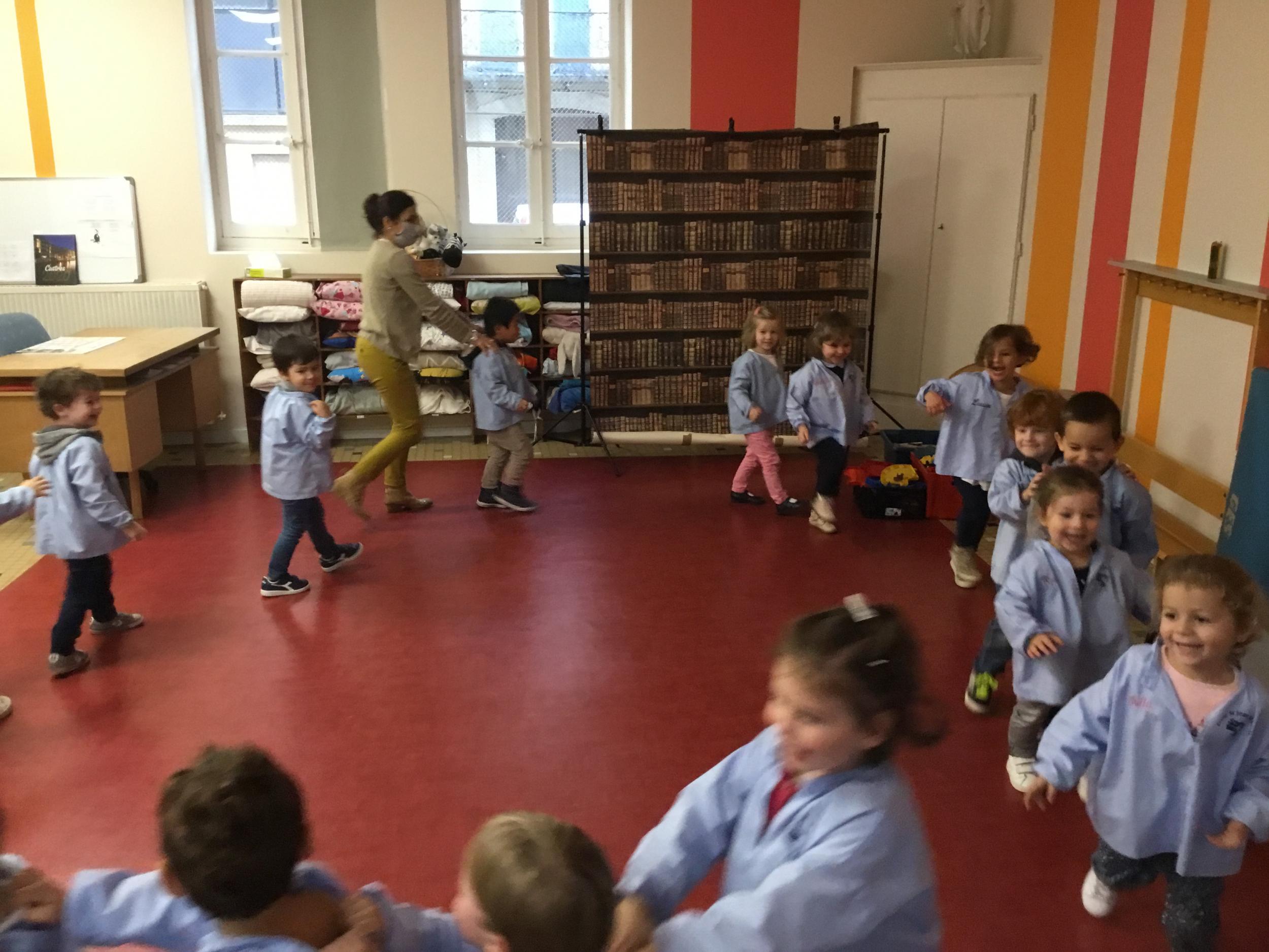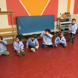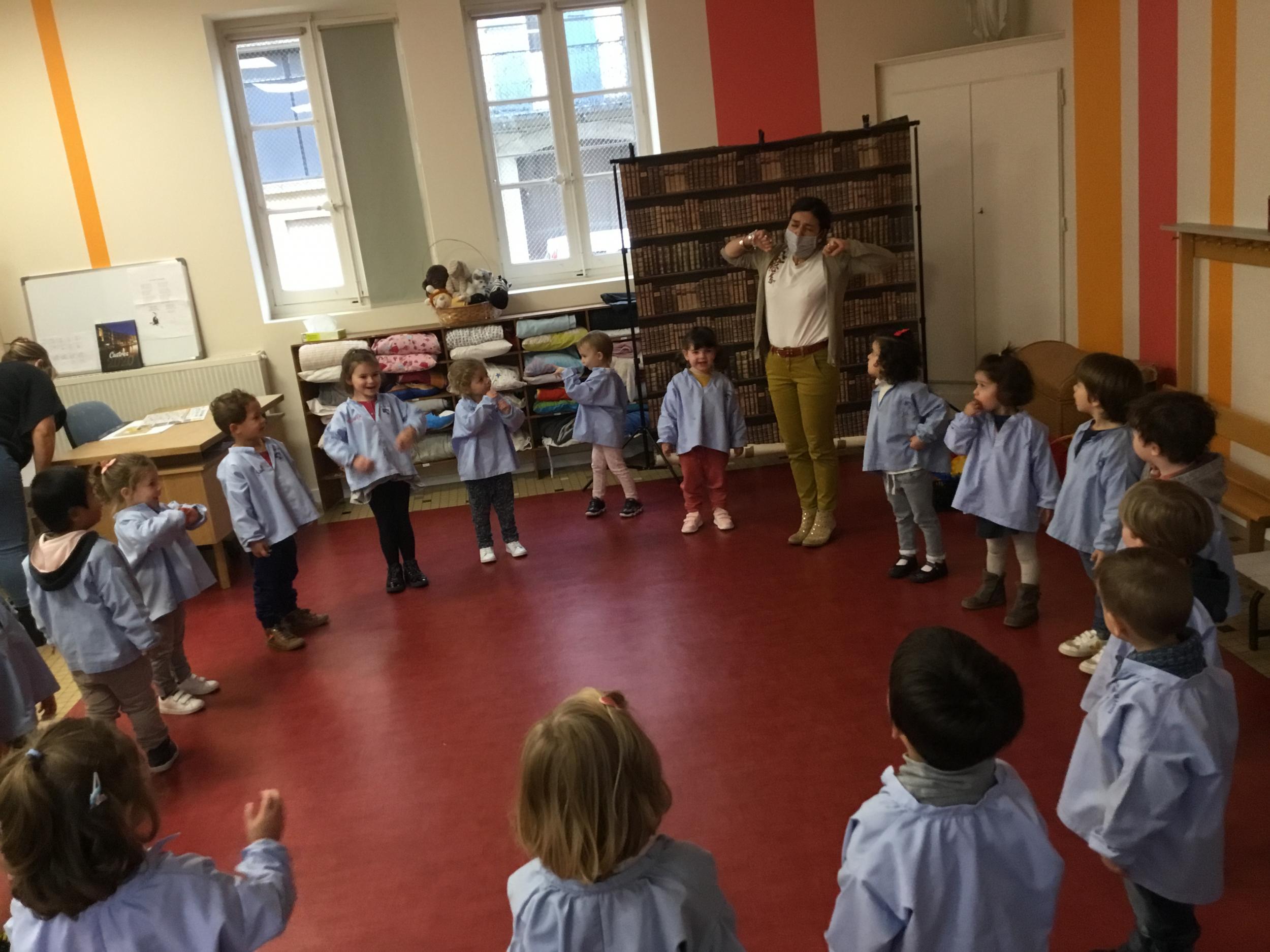 Pour prendre conscience de son corps, nous mimons le réveil et départ à l’école.