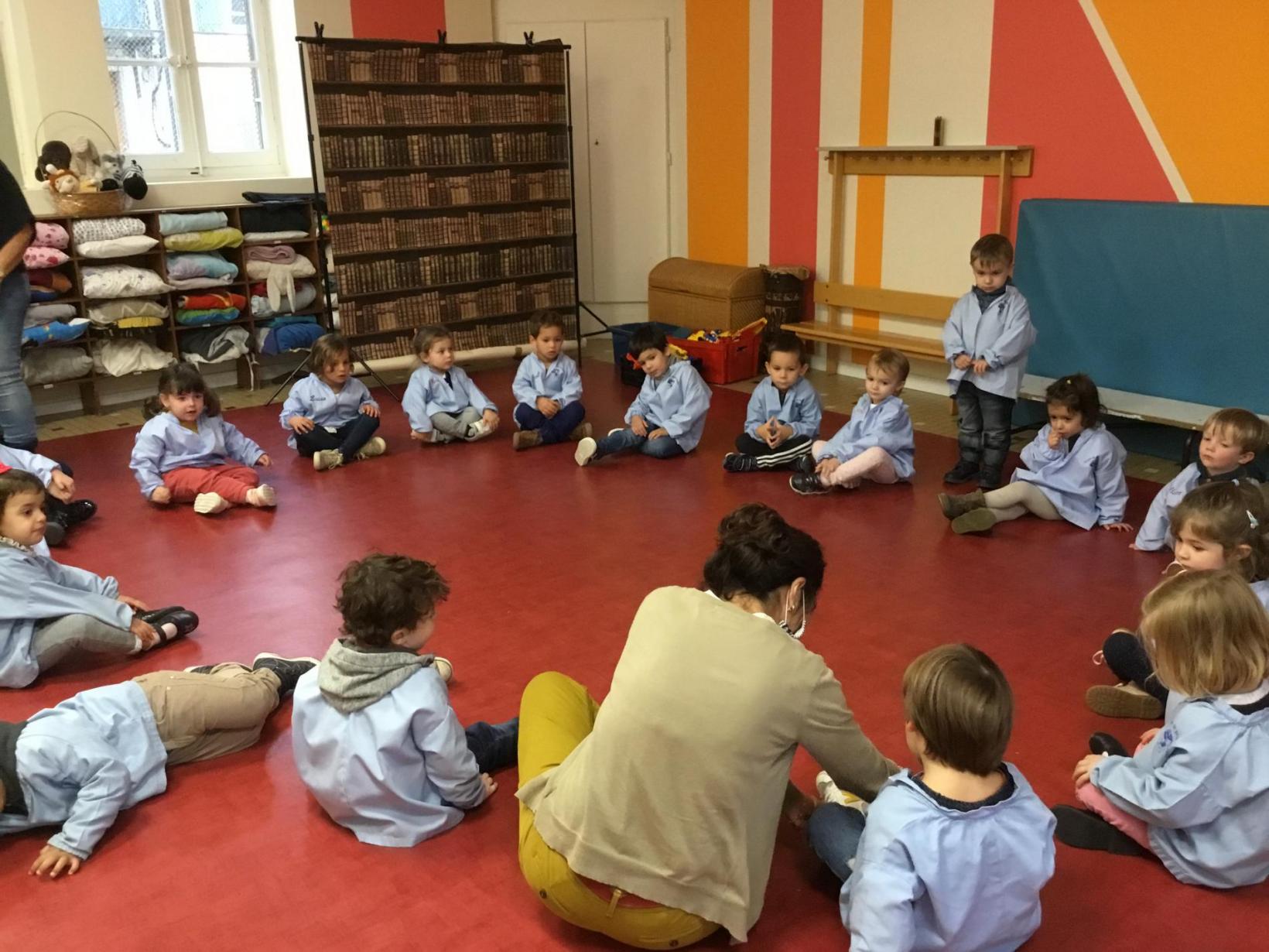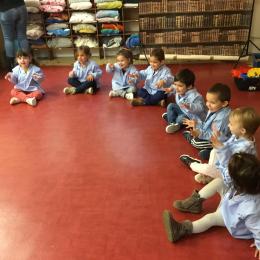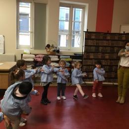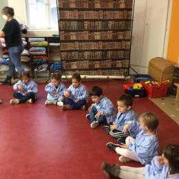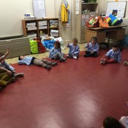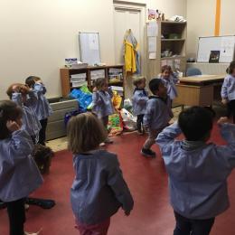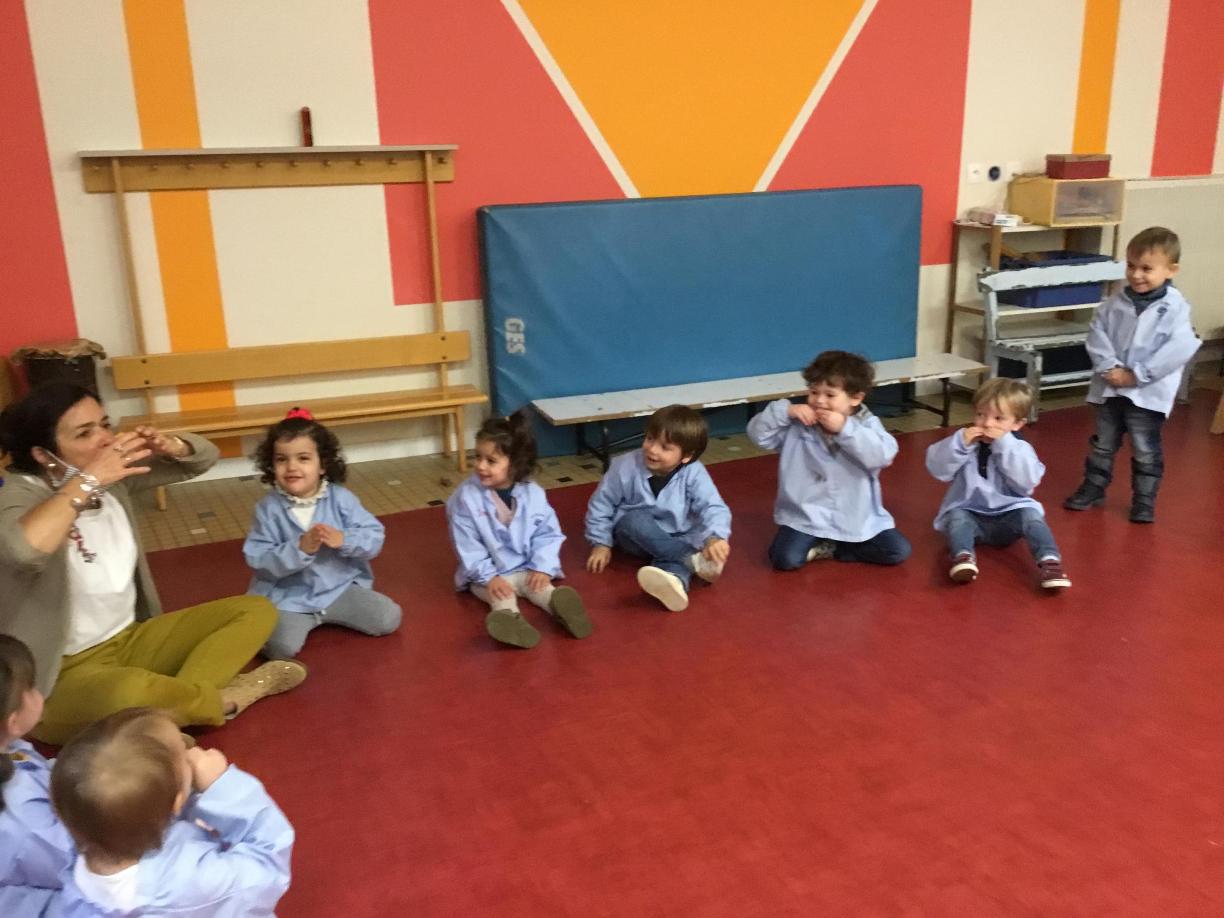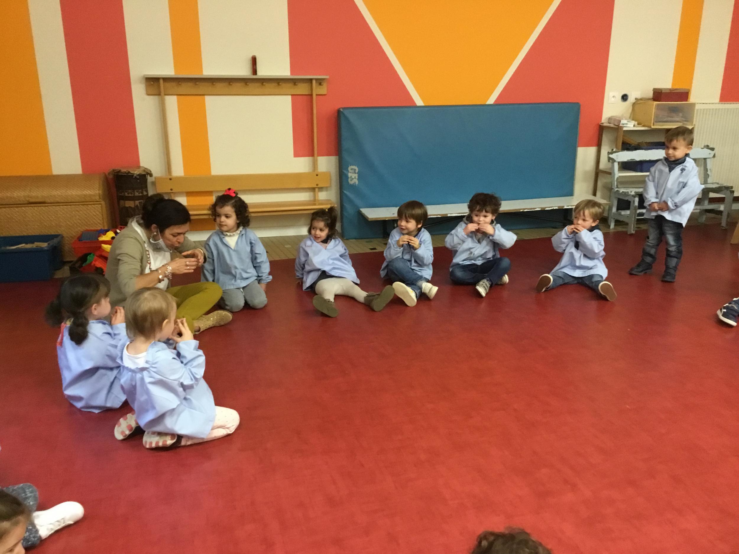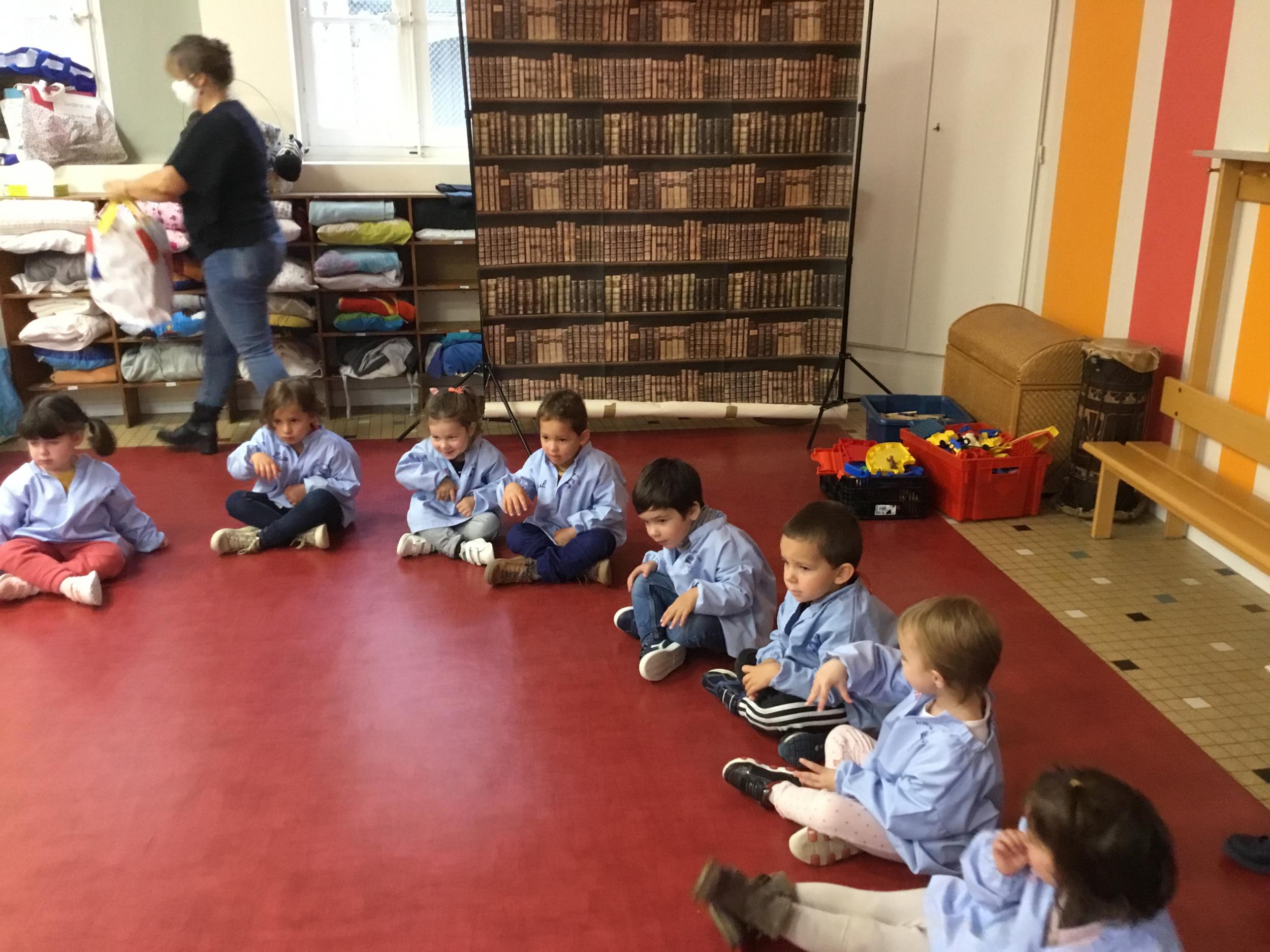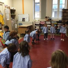 Pour prendre conscience de son corps, nous mimons le réveil et départ à l’école.