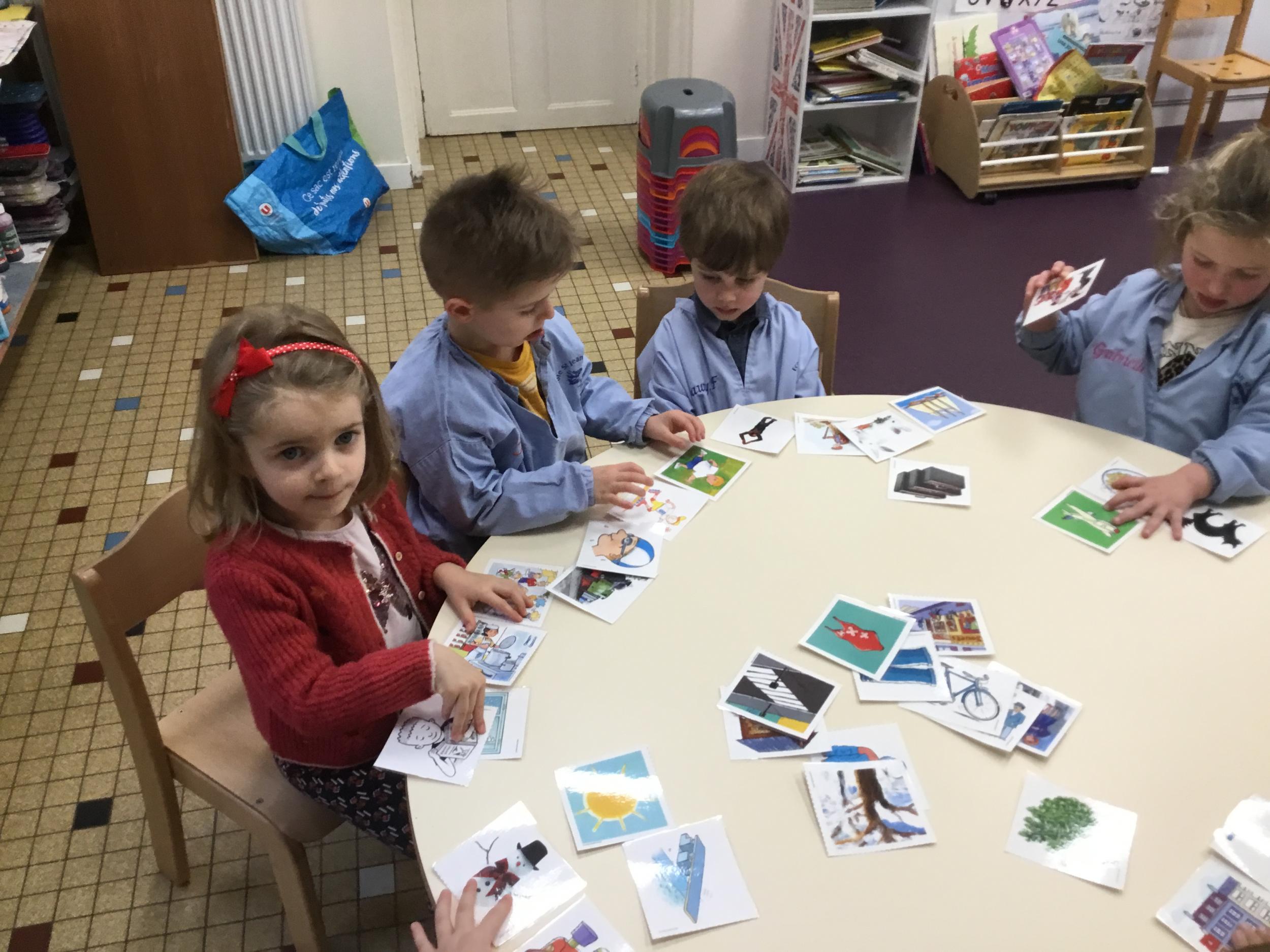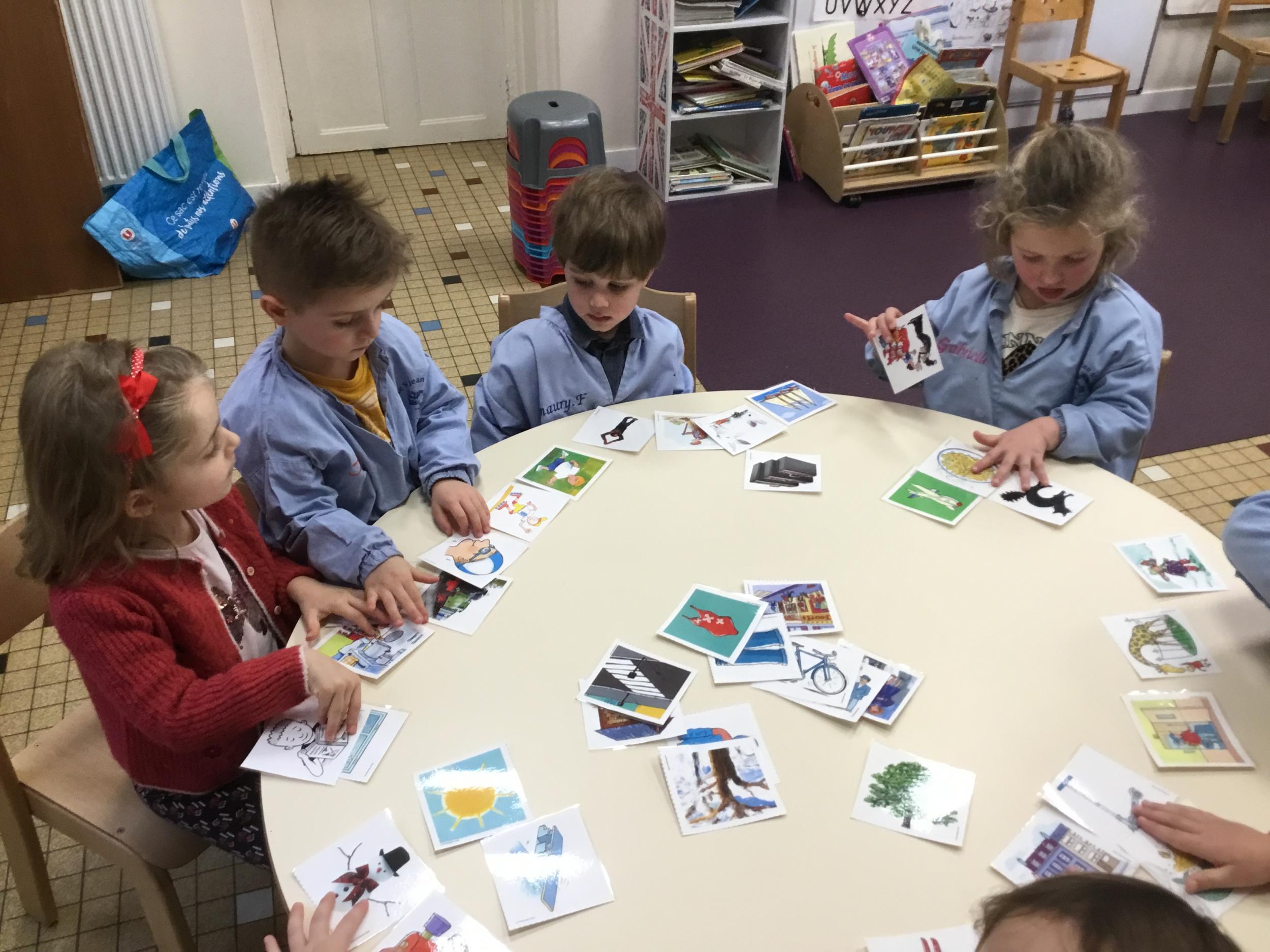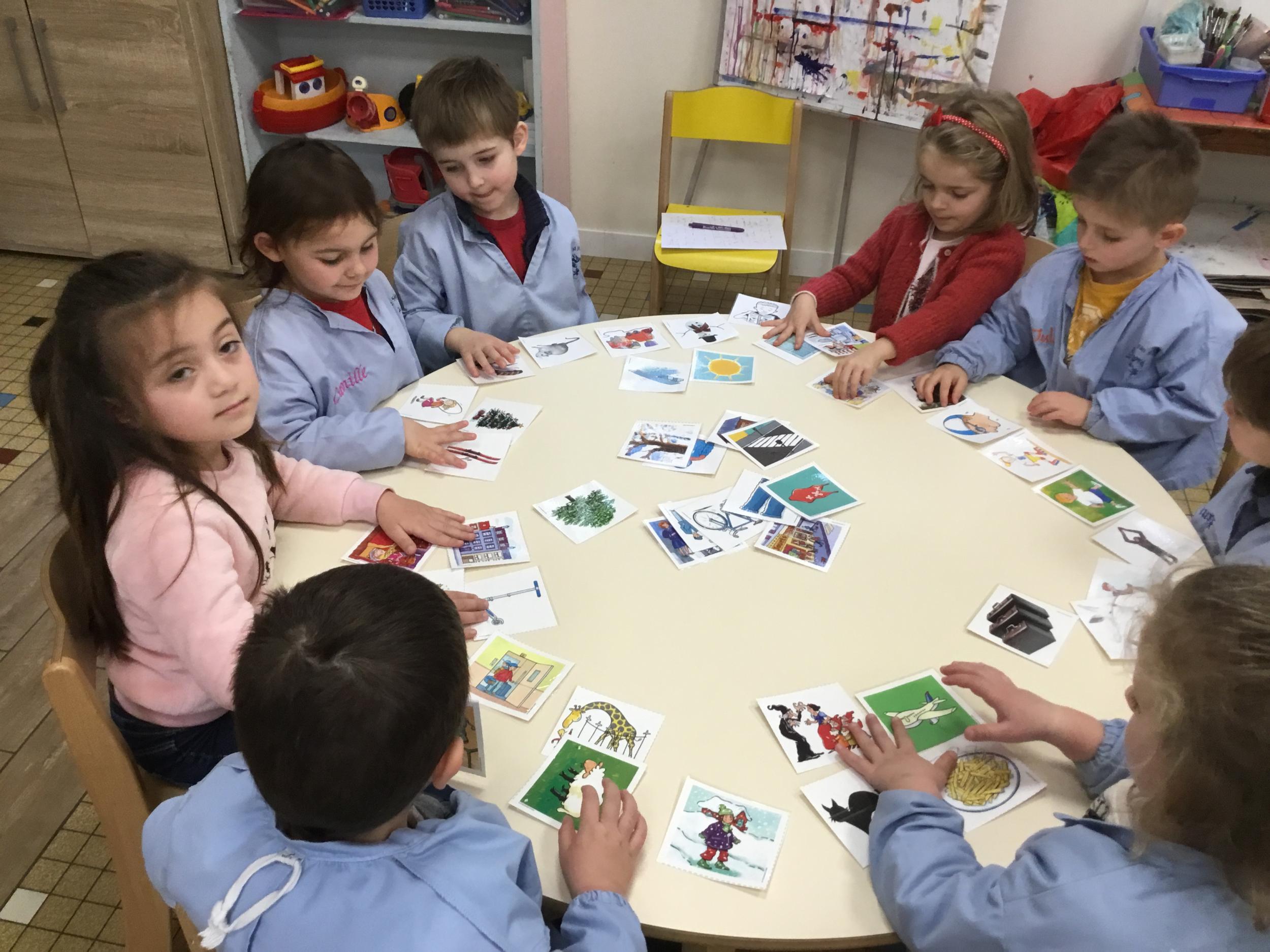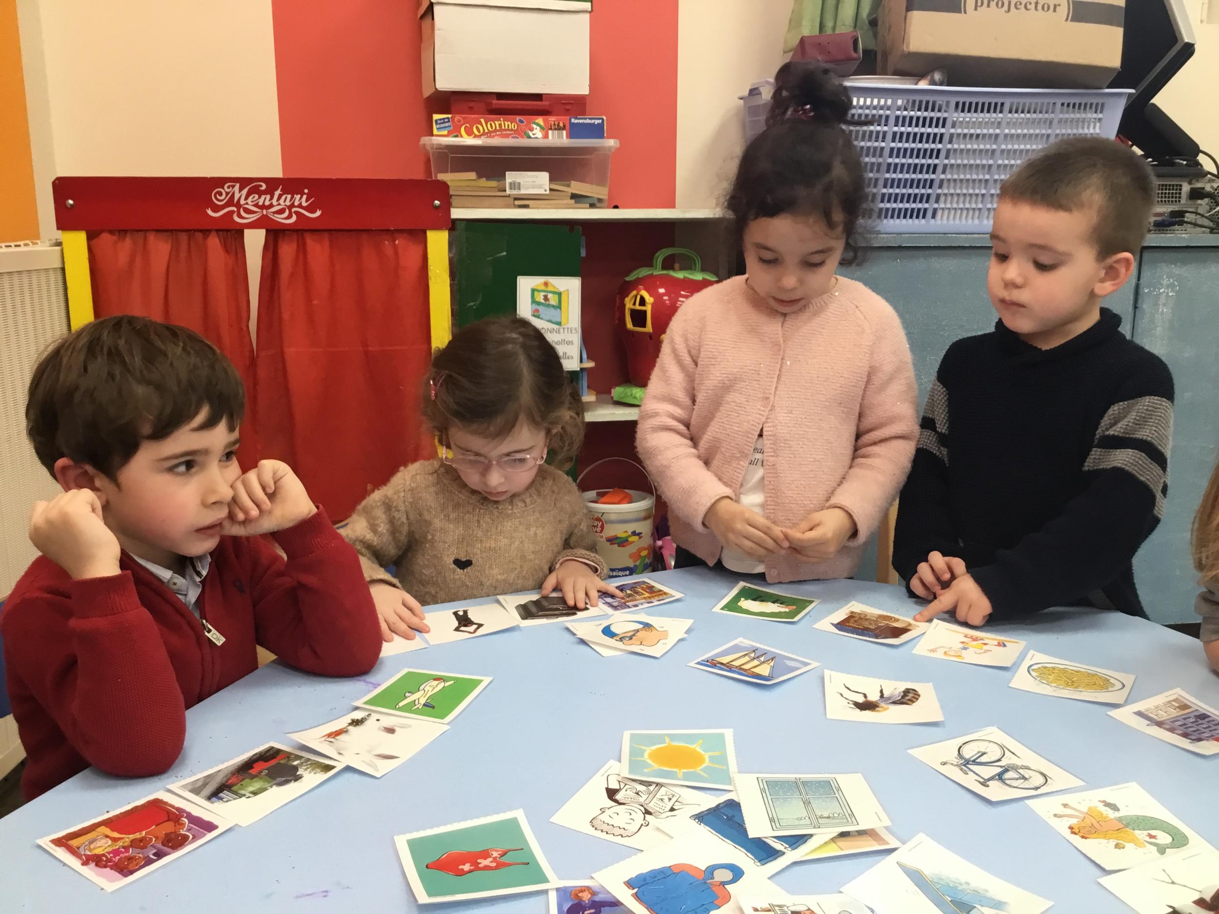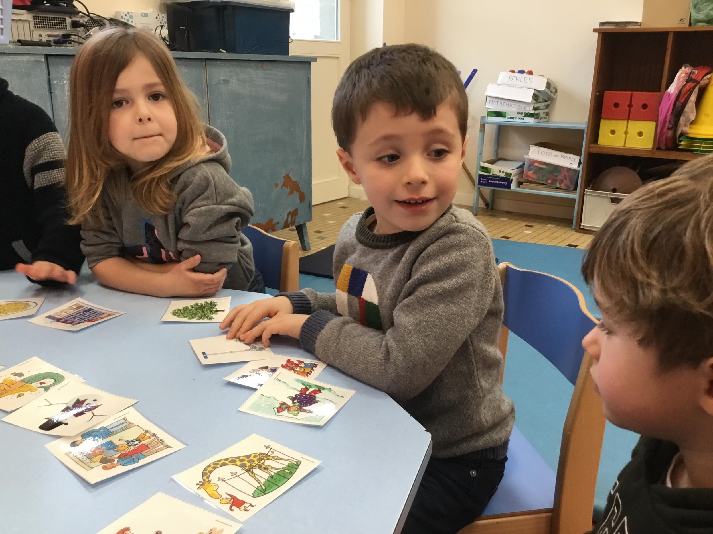 J’ai proposé aux enfants des cartes images à choisir pour inventer et raconter une histoire. Ils devaient choisir 4 cartes dont 2 personnages un lieu et une action. Ils devaient les ordonner devant eux dans l’ordre chronologique avant de raconter aux autres élèves leur histoire. Le maître les aider à structurer leur propos si besoin.