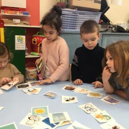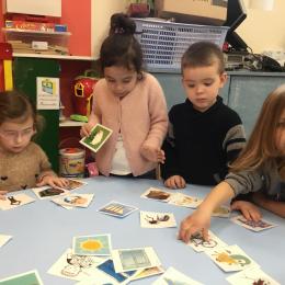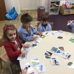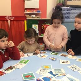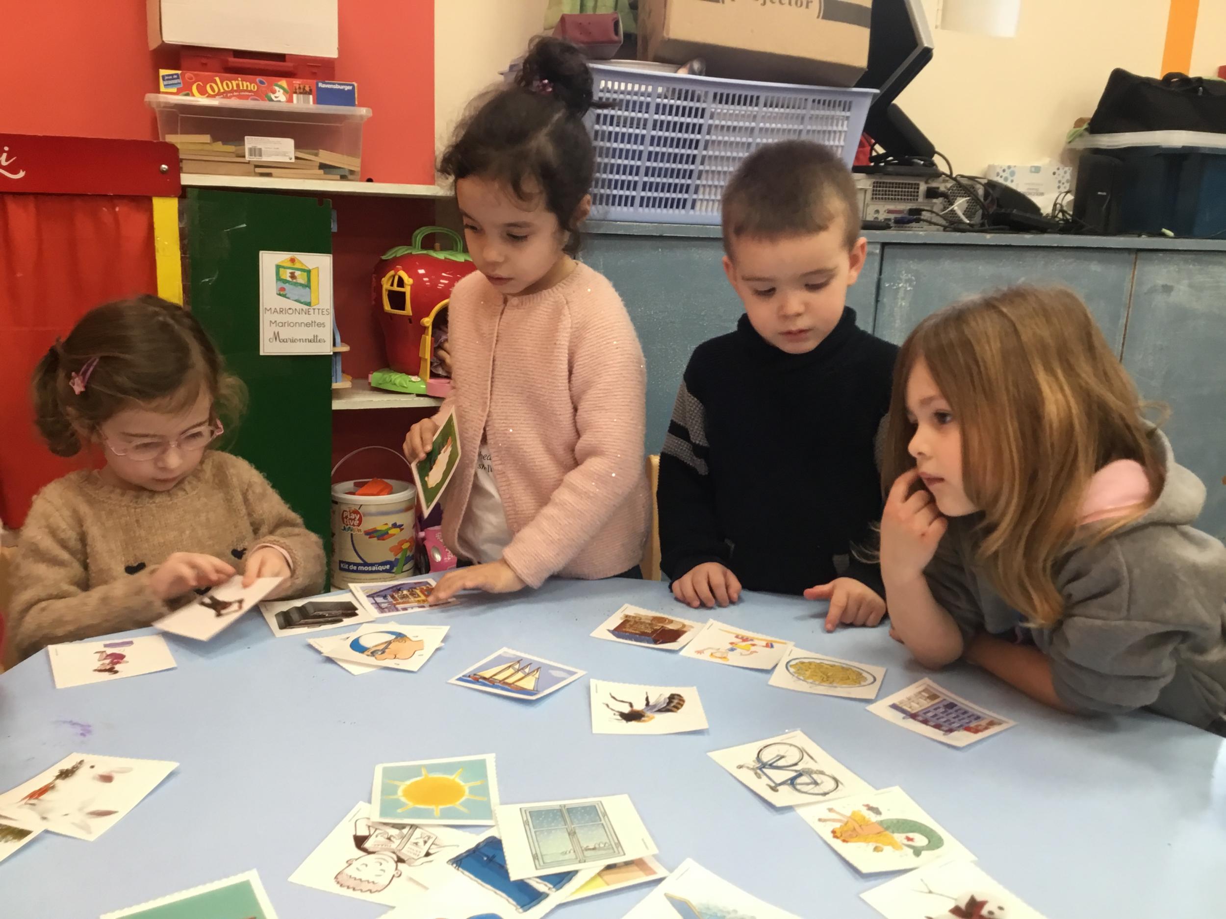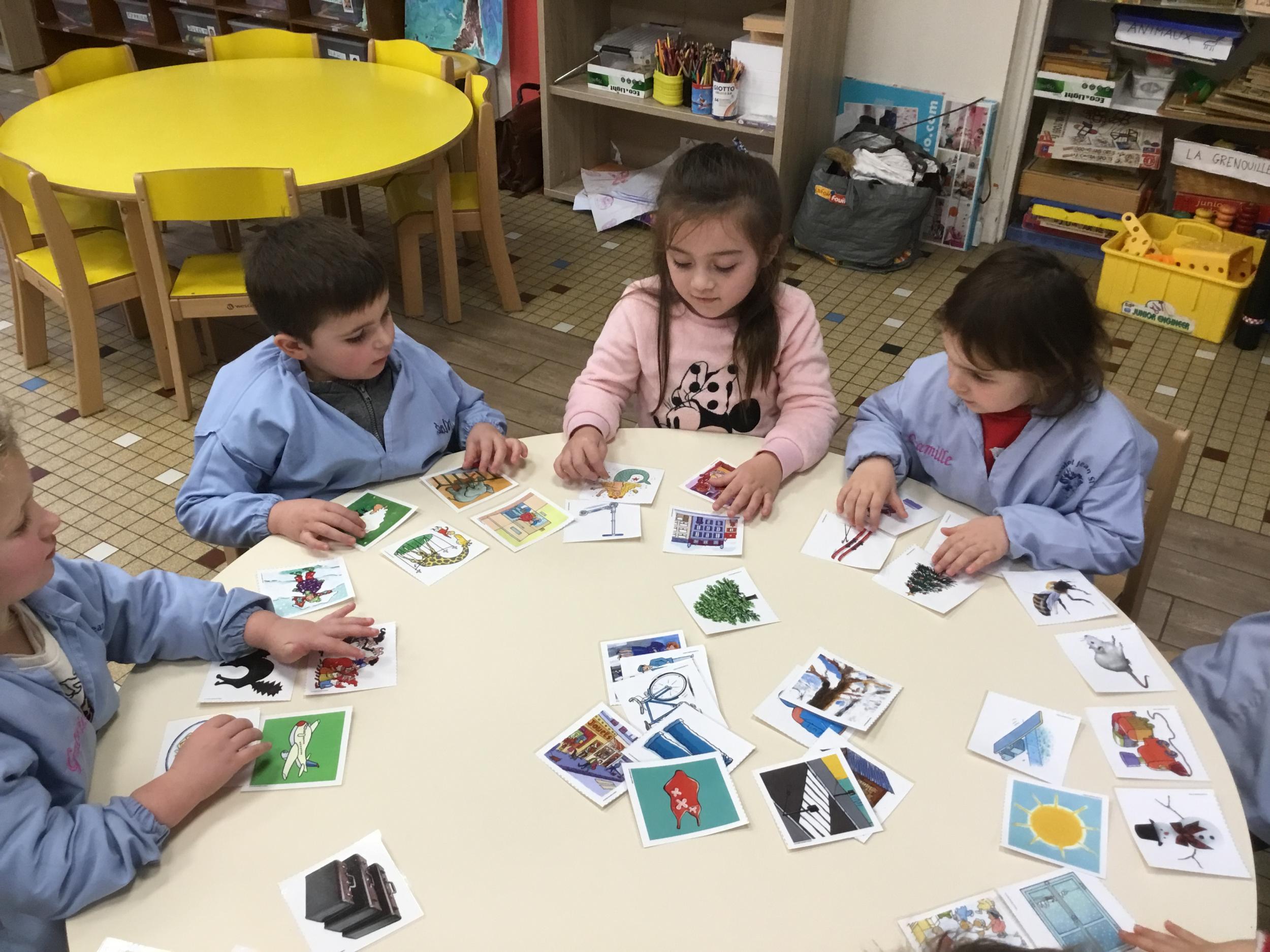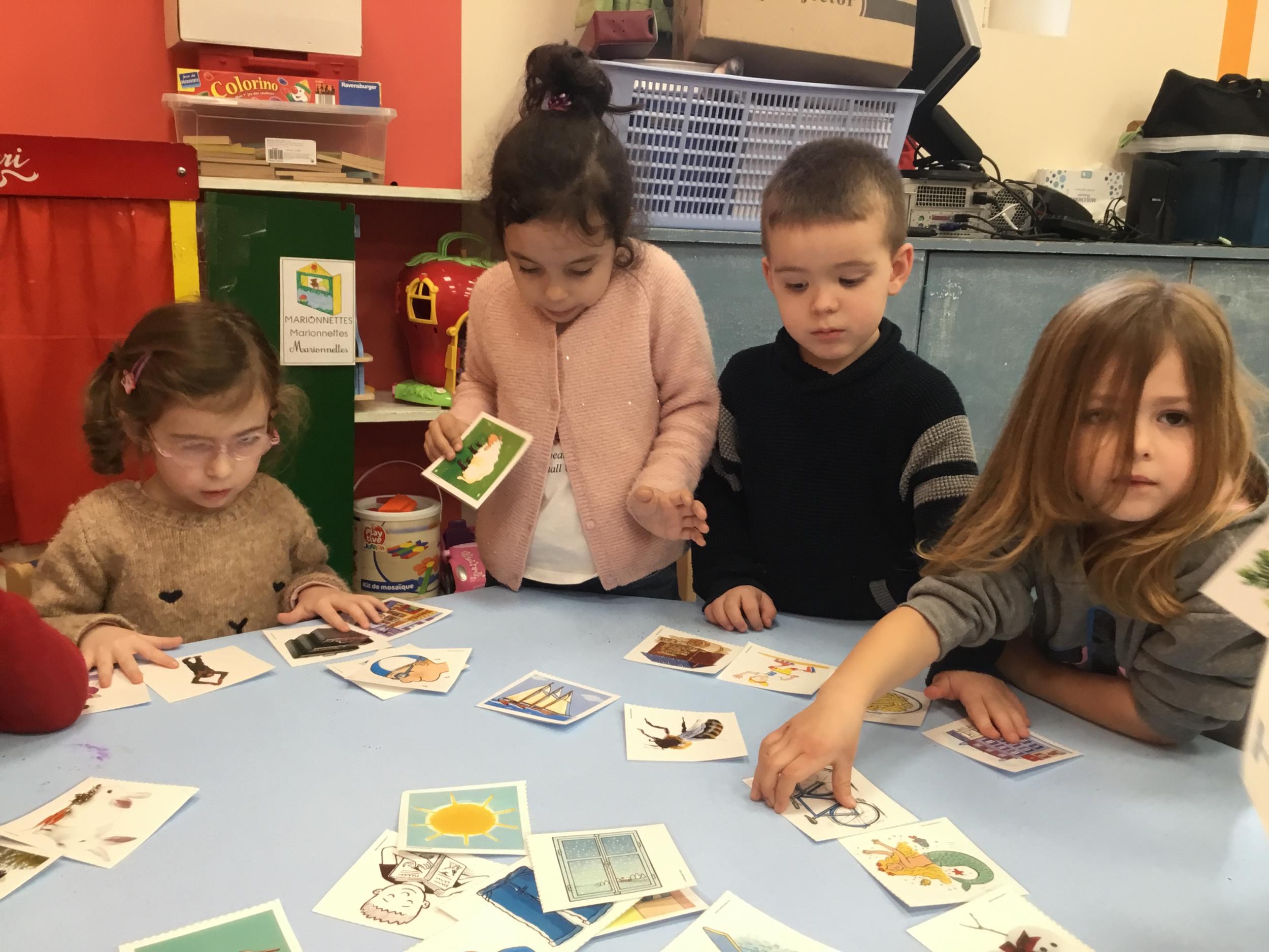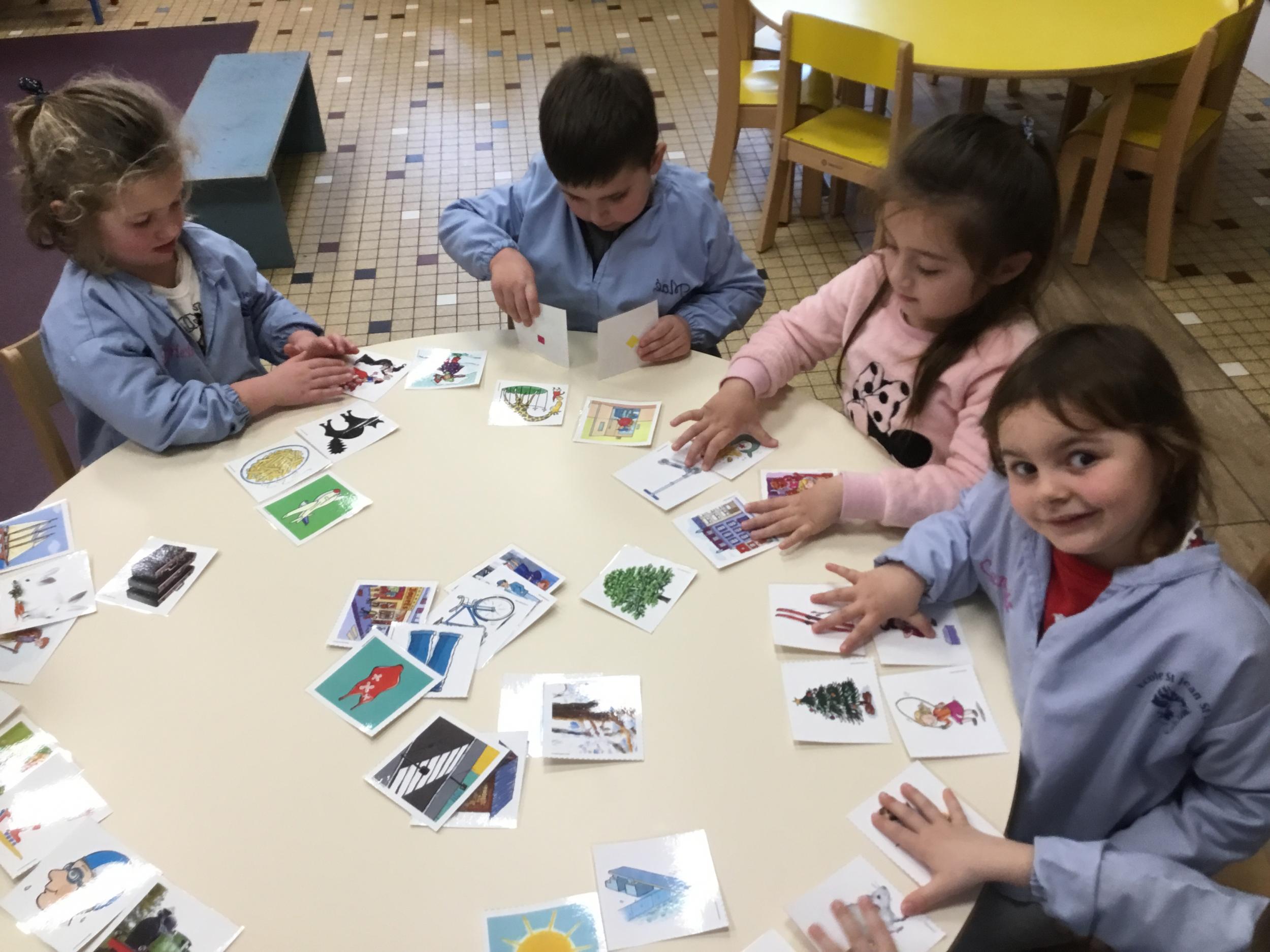 J’ai proposé aux enfants des cartes images à choisir pour inventer et raconter une histoire. Ils devaient choisir 4 cartes dont 2 personnages un lieu et une action. Ils devaient les ordonner devant eux dans l’ordre chronologique avant de raconter aux autres élèves leur histoire. Le maître les aider à structurer leur propos si besoin.