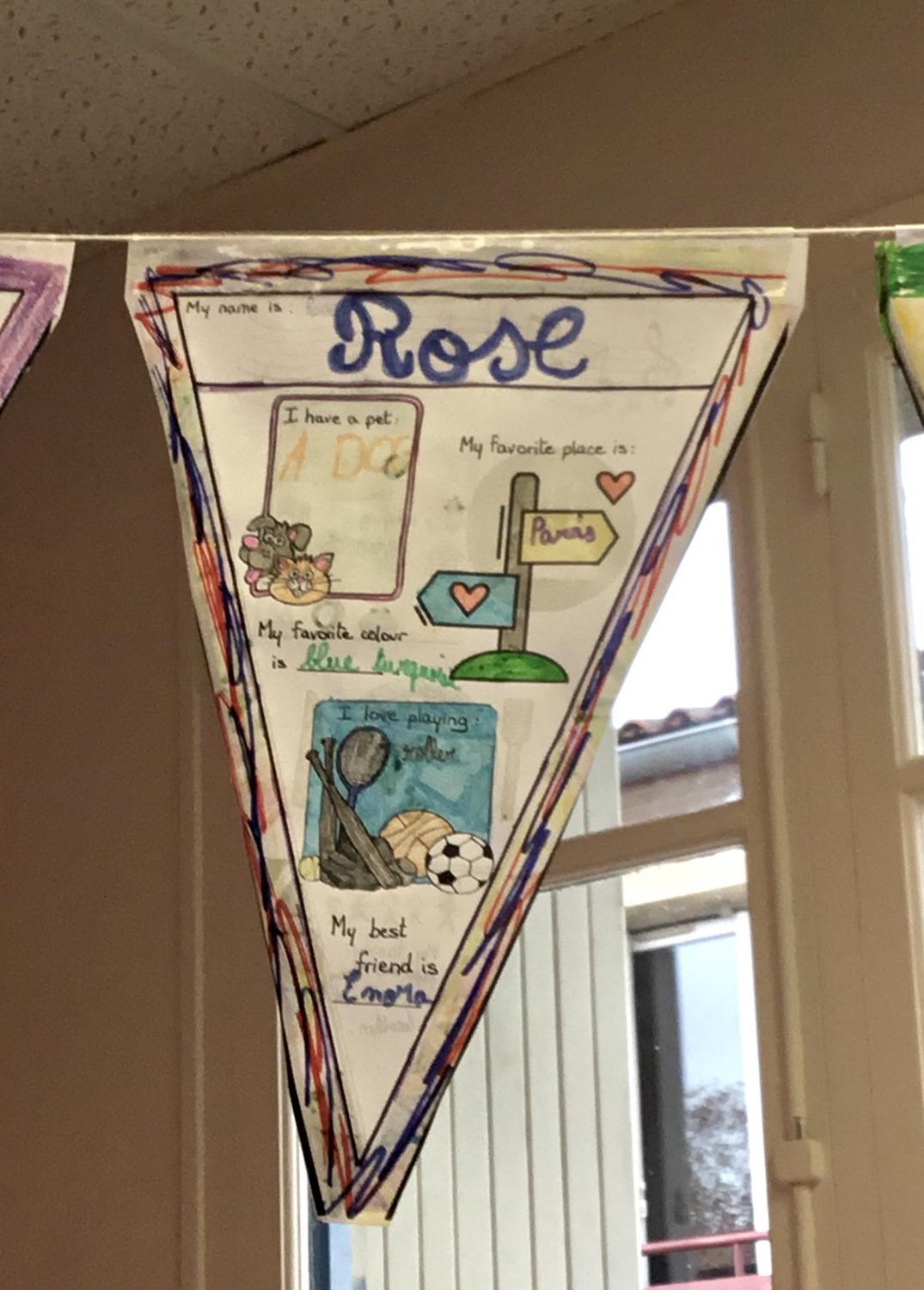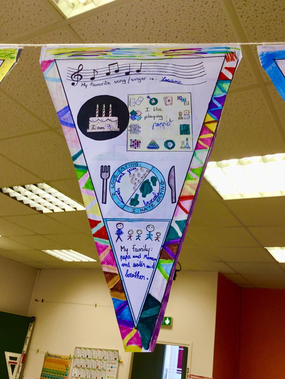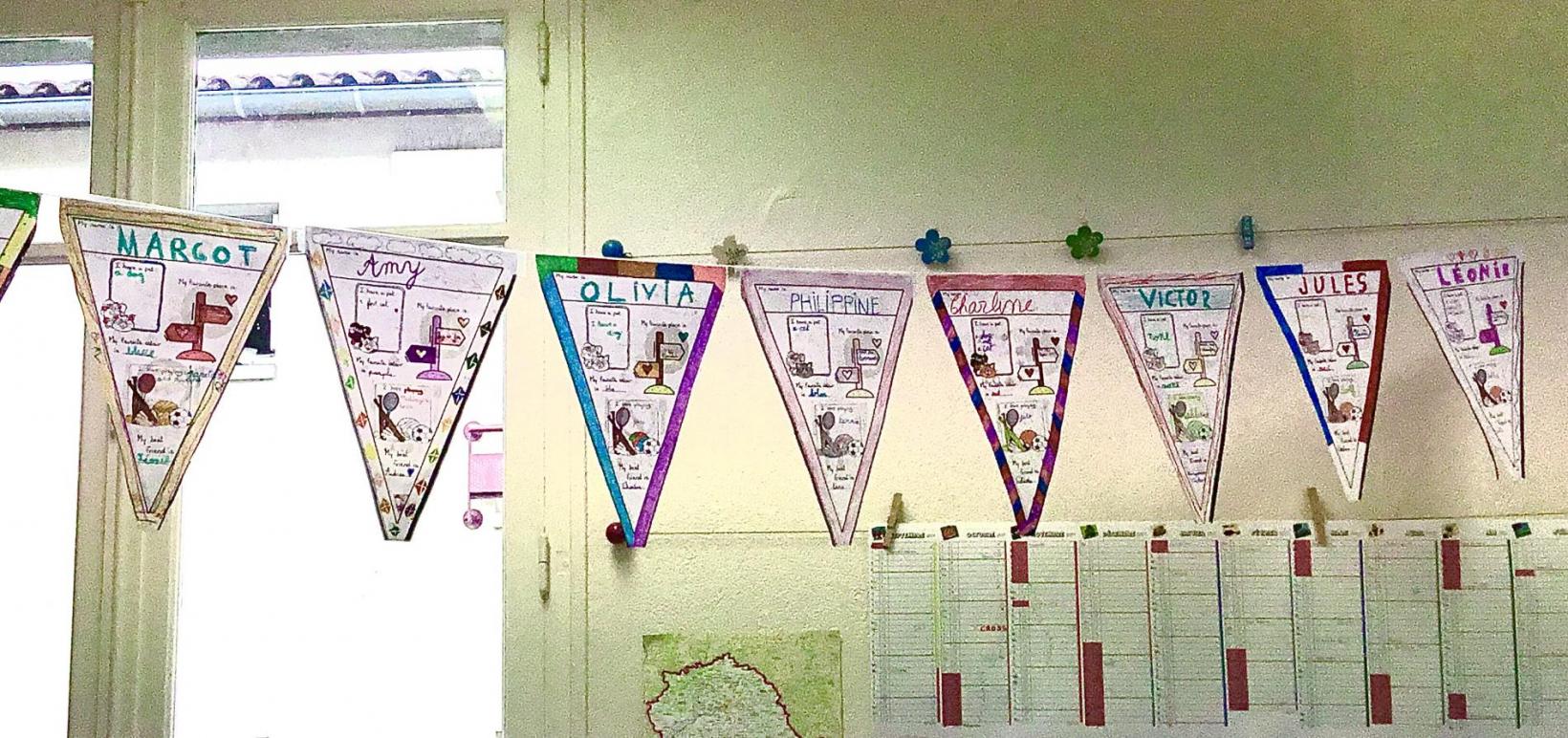 Les fanions sont des triangles en papier sur lesquels il y a toutes sortes d’informations sur les camarades. Chaque élève a réalisé son fanion.