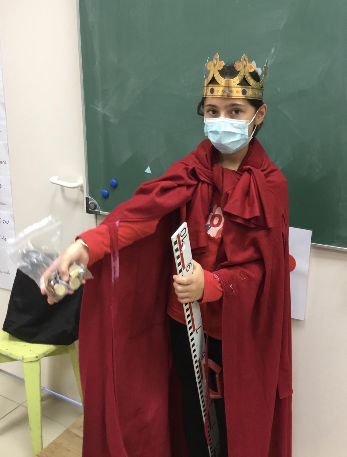* Clovis (joué par Lou) chevauche son destrier (la règle) pour distribuer des pièces d’or aux pauvres. Il est vêtu d’une tunique pourpre pour imiter les empereurs romains comme César.