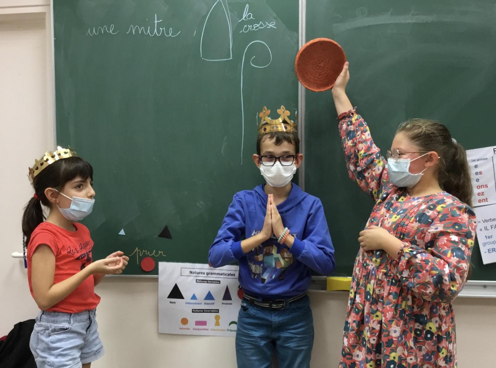 La maîtresse amène des accessoires, par exemple on a une couronne qui sert à représenter le roi. Elle choisit les élèves qui passeront au tableau faire les mimes.