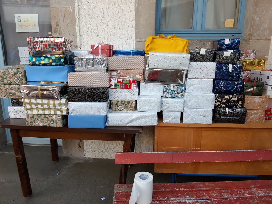 Il fallait remplir des boîtes à chaussures avec : quelque chose de chaud, quelque chose de bon (pour les fêtes), quelque chose de ludique (un jeu, un livre...), quelque chose d'utile (un produit d'hygiène) et une jolie carte faite par les enfants.