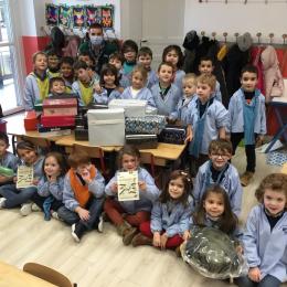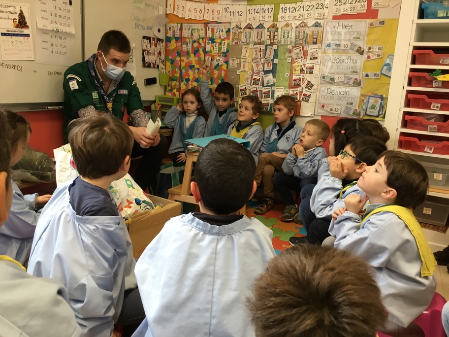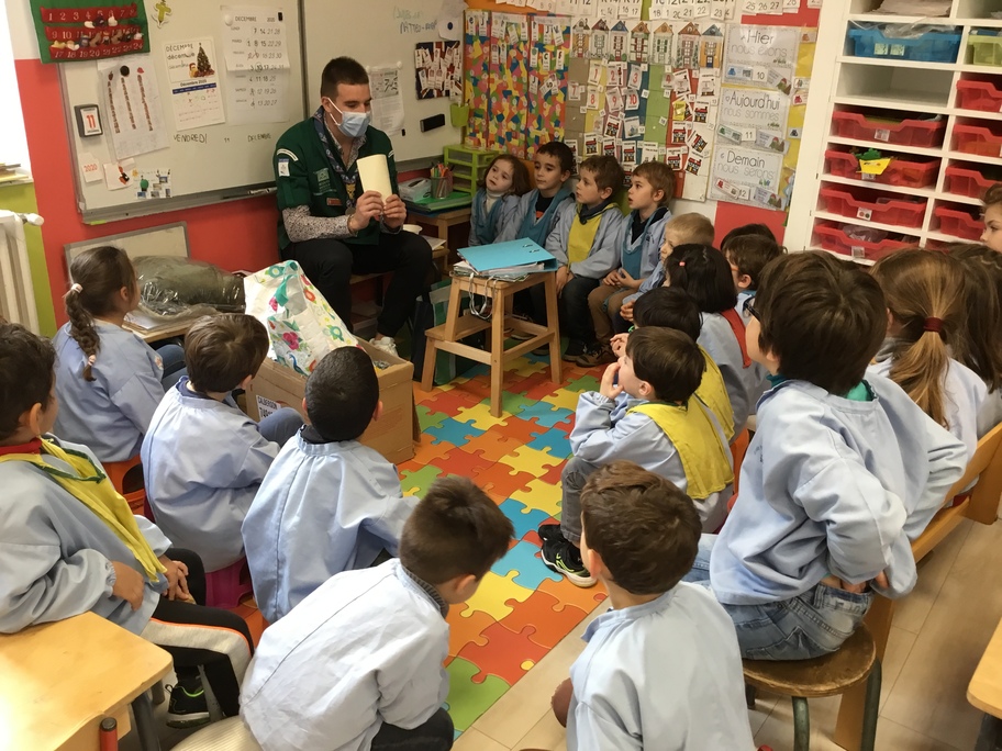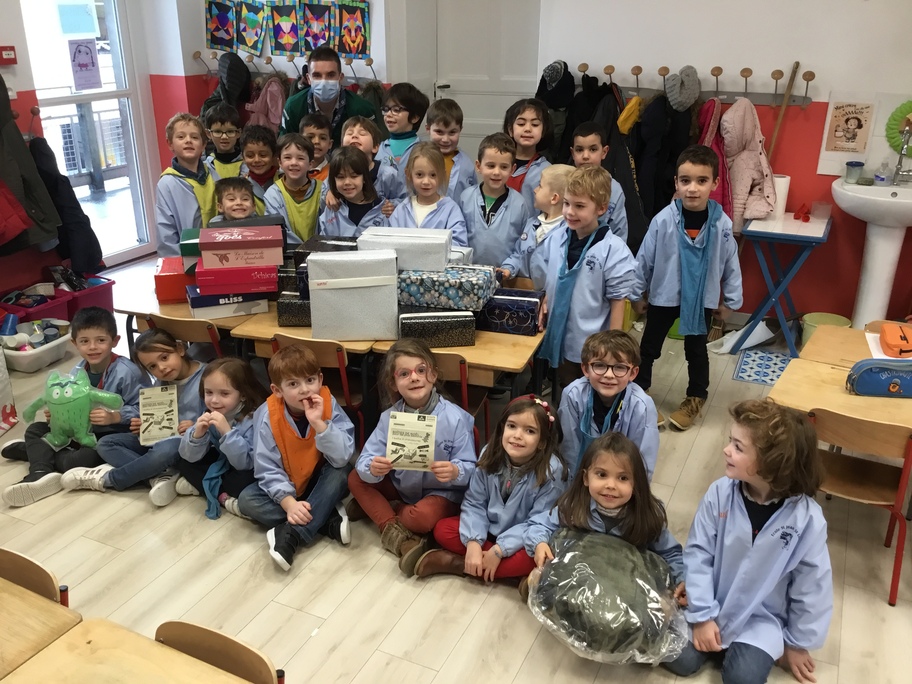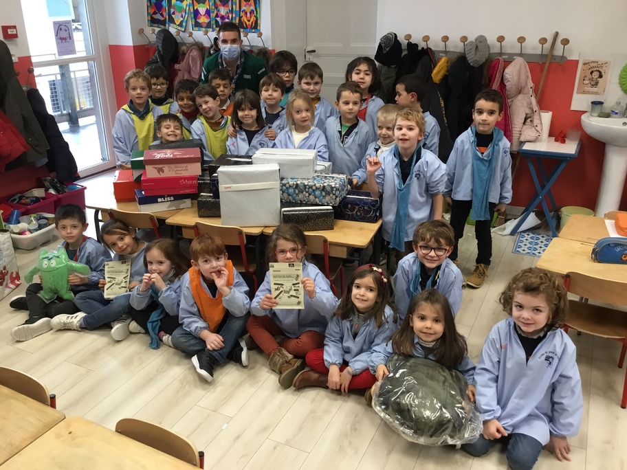 Alexis, un des compagnons, est venu nous reparler de ce projet. En lien avec la Croix Rouge, il est ensuite venu à l'école avec Mathis pour récolter toutes les boîtes! Ils ont été surpris du nombre de boîtes confectionnées par l'école puisqu'on dépassait largement la centaine!