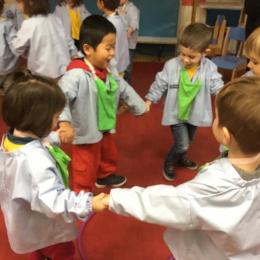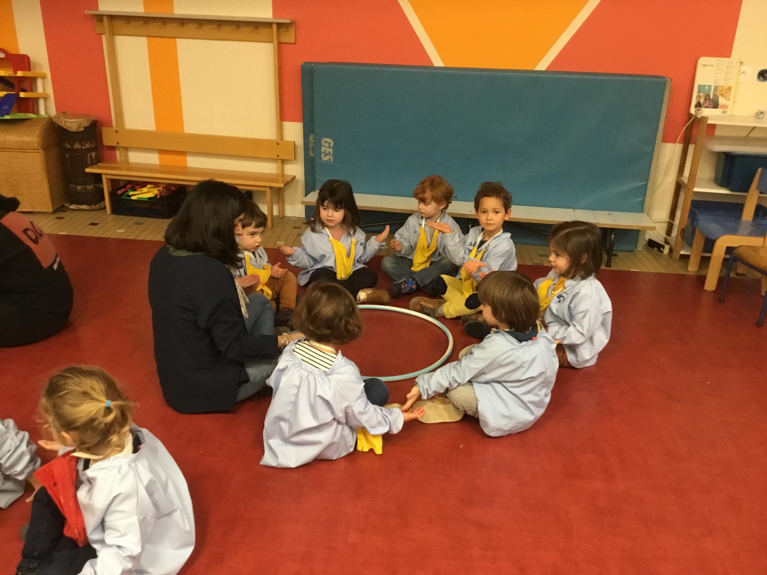 Enfin, pour se calmer , les enfants se sont assis en ronde et la maîtresse a montré un nouveau jeu qui se joue en chantant. Il s’agit de se faire passer un petit clap en tapant sa main droite sur la main gauche de son voisin. Bien entendu, nous ne prononçons pas encore les mots droite et gauche !!! Mais la maîtresse a expliqué et montré comment on pouvait jouer.