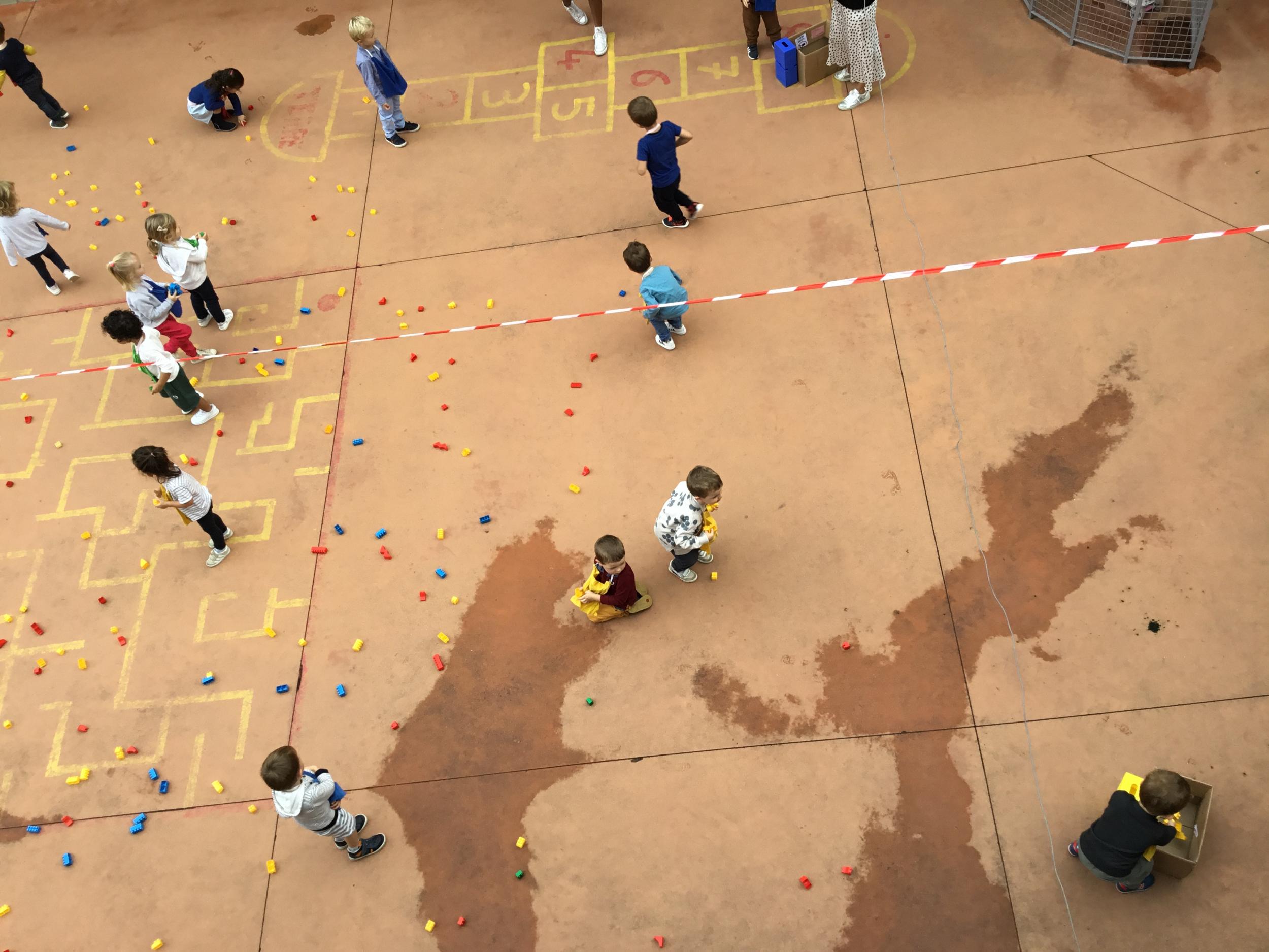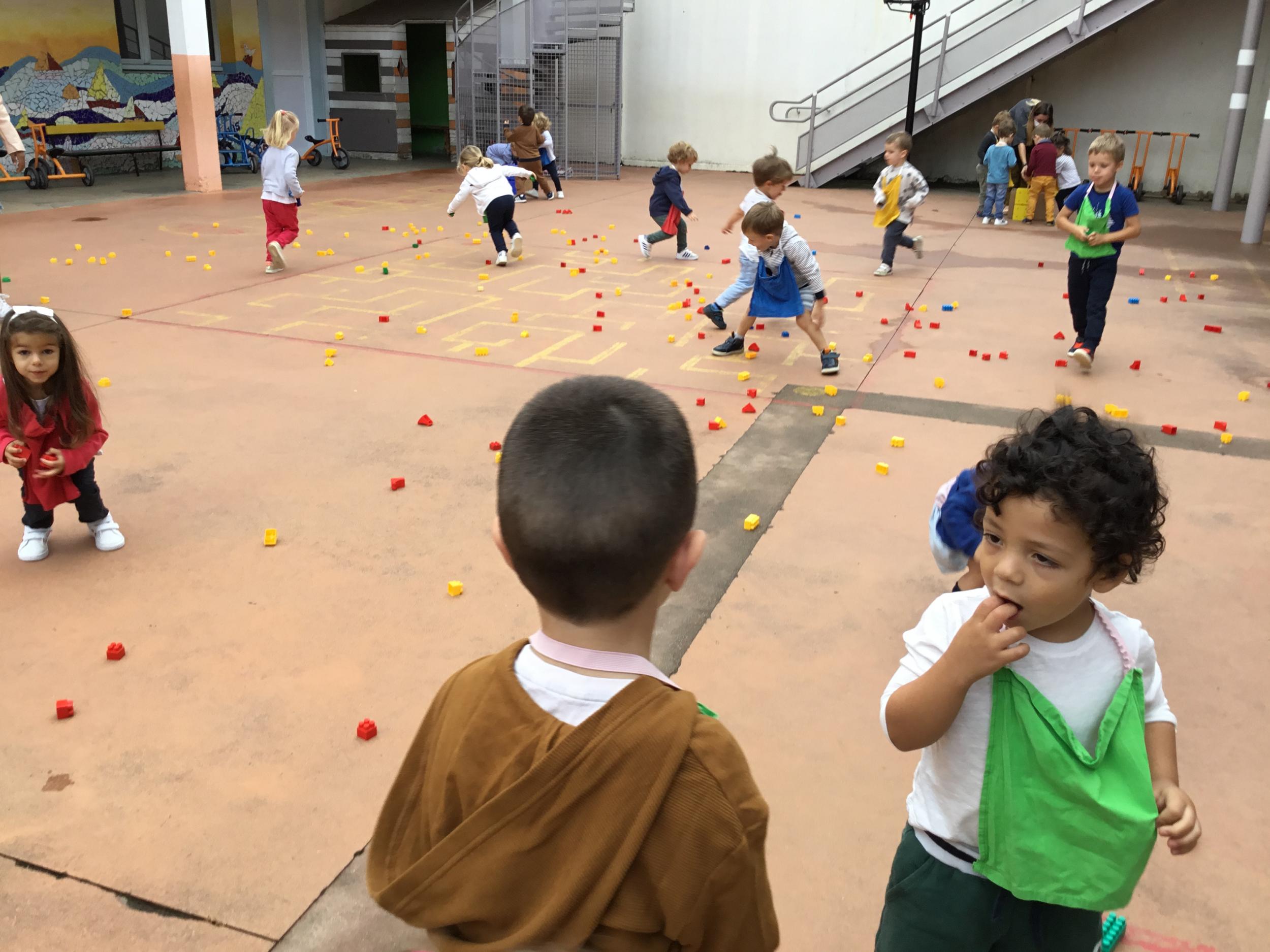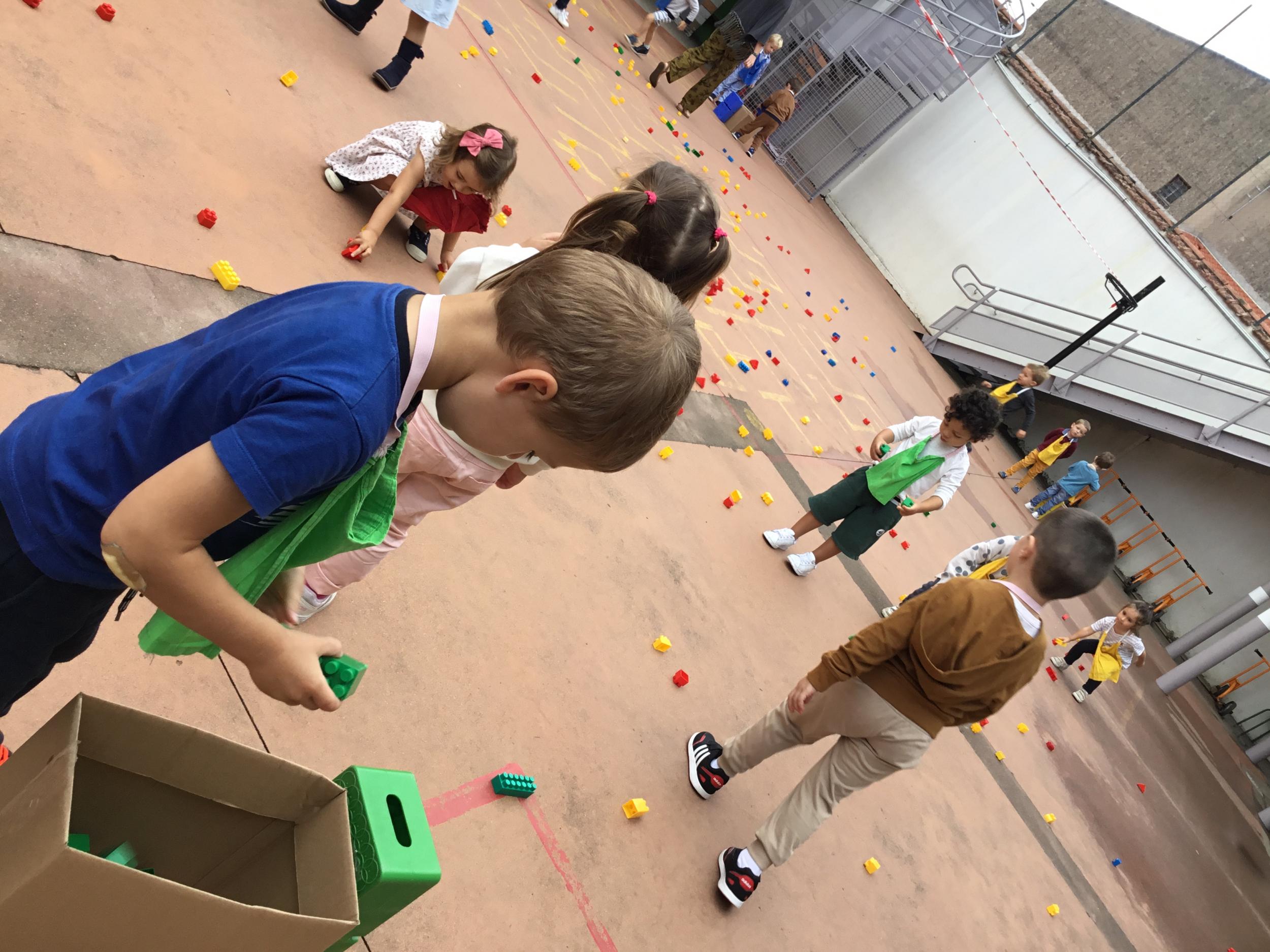 Dans la cour de récréation , tous les legos étaient éparpillés. Chaque enfant portait un collier de couleur et faisait ainsi partie d’une équipe . 4 équipes étaient ainsi constituées. Chaque équipe était regroupée autour d’un carton. Au signal chaque membre de l’équipe devait aller ramasser les legos de la couleur de son équipe et les rapporter dans le carton qui lui était attribué . L’équipe gagnante était celle qui était la plus rapide.