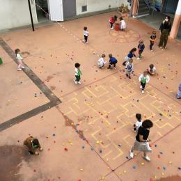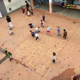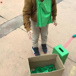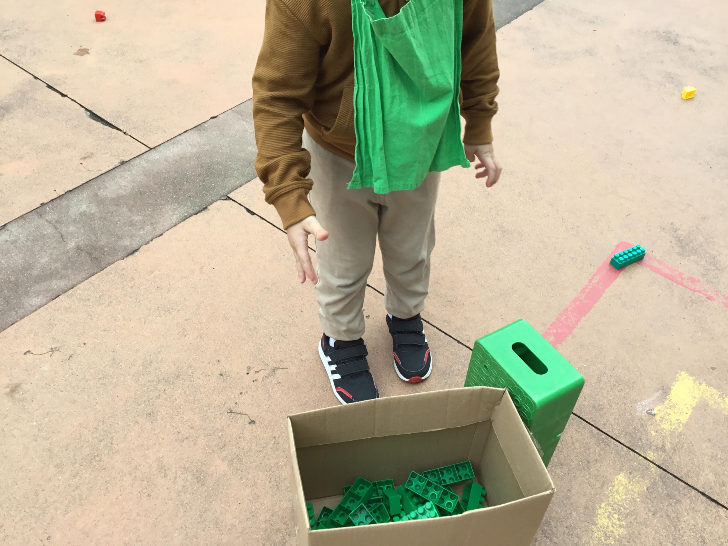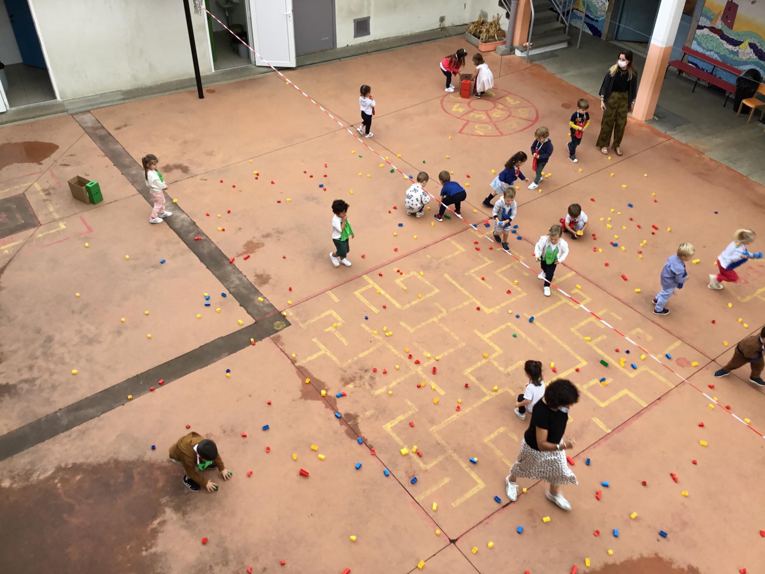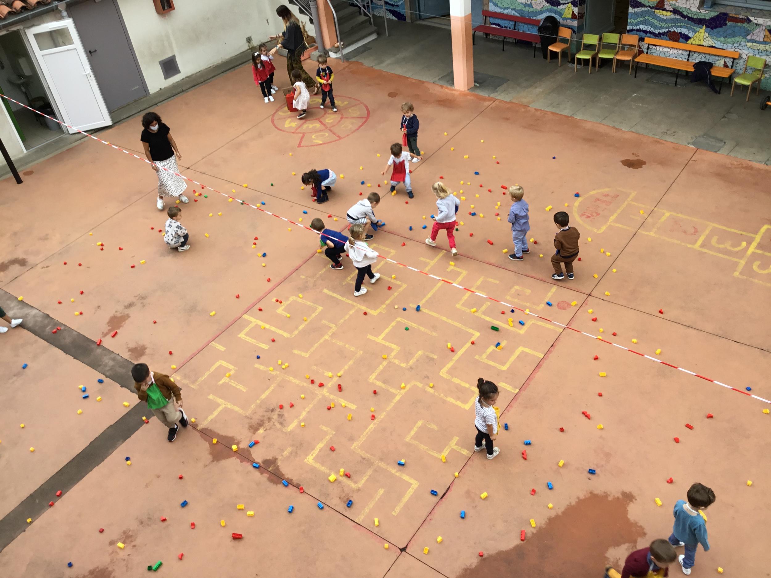 Dans la cour de récréation , tous les legos étaient éparpillés. Chaque enfant portait un collier de couleur et faisait ainsi partie d’une équipe . 4 équipes étaient ainsi constituées. Chaque équipe était regroupée autour d’un carton. Au signal chaque membre de l’équipe devait aller ramasser les legos de la couleur de son équipe et les rapporter dans le carton qui lui était attribué . L’équipe gagnante était celle qui était la plus rapide.