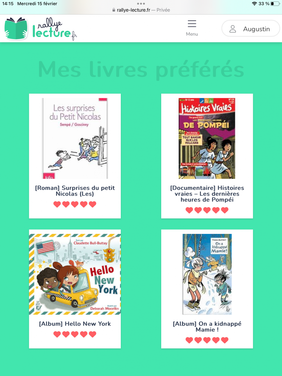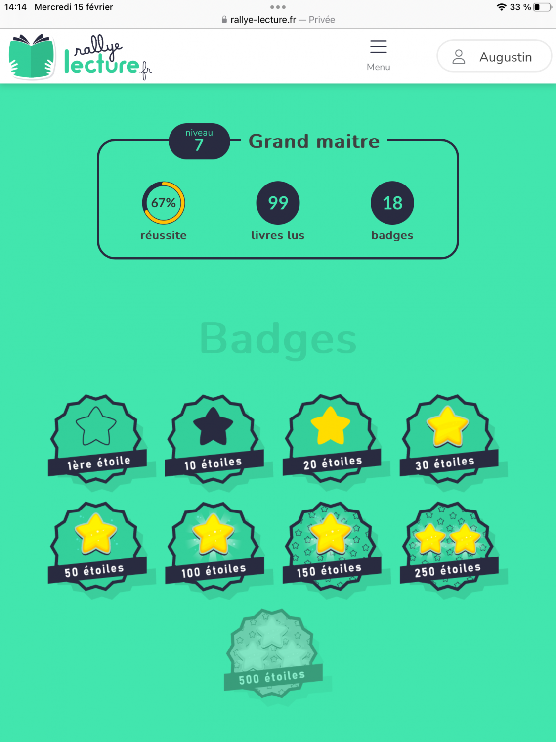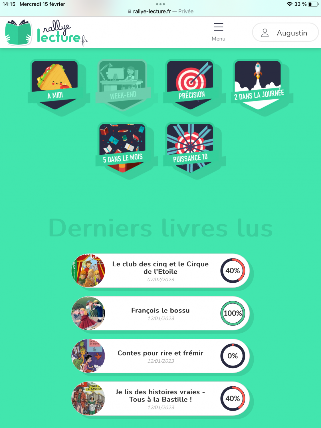 On a en plus un site internet pour la lecture, il s'appelle Rallye Lecture. Comme Classe Numérique, il y a un code de classe et un autre personnel. Cette application consiste à lire des libres et faire des exercices dessus pour s'entraîner à la lecture compréhension. Plus on lit et plus on réussit, plus on gagne de points. Il y a aussi des défis qui nous font gagner des badges. Parfois on peut se lancer des défis nous-mêmes, par exemple : avoir 142 points en "enquêtes policières", avoir 200 étoiles...