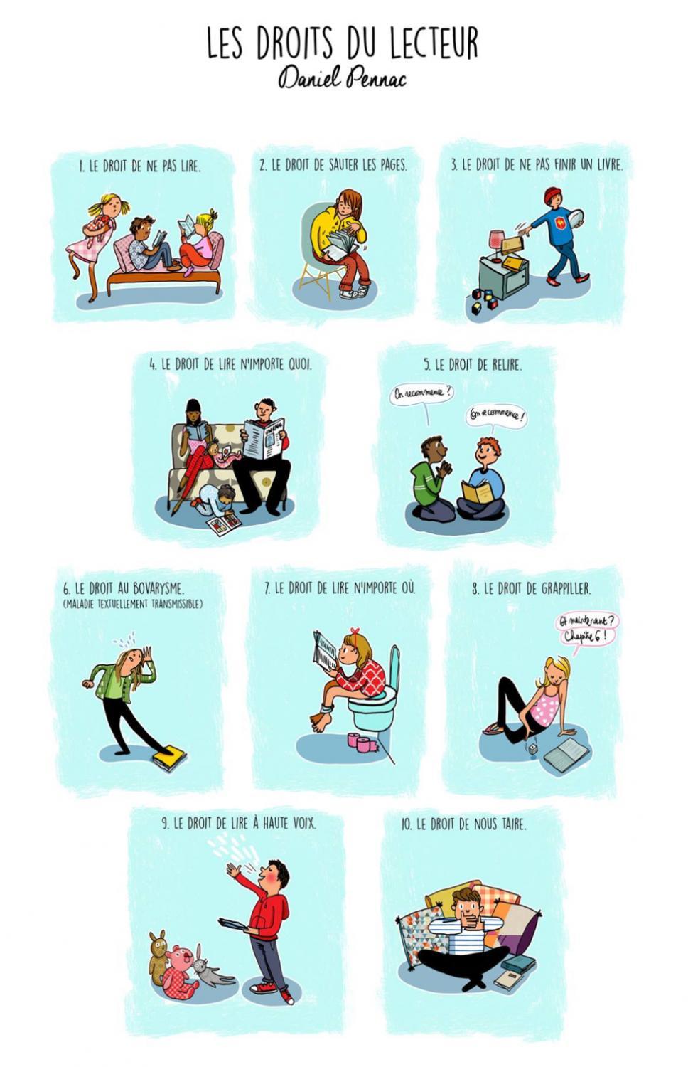 Quand on prend un livre, on doit le reposer au même endroit car c'est la règle pour qu'on puisse le retrouver. On a le droit de sauter des pages, de ne pas finir de tout lire, etc... Le créateur de ces droits s'appelle Daniel PENNAC.