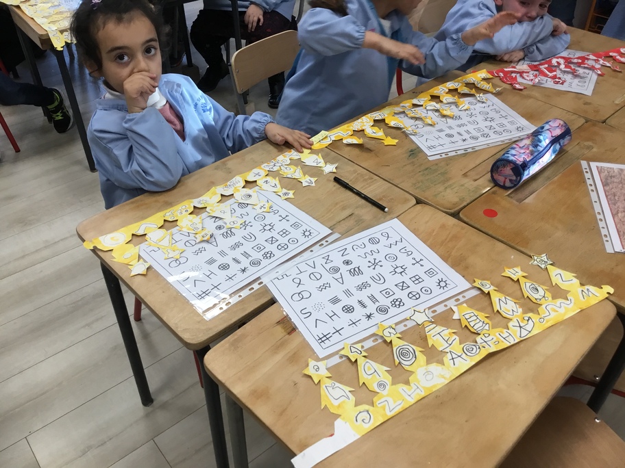 Mais avant cette belle fête, il a fallu confectionner sa couronne en réalisant des graphismes variées avec des la gomme à dessiner, recouvrir le tout d'encre colorée, enlever la gomme, redessiner les motifs au feutre fin noir...