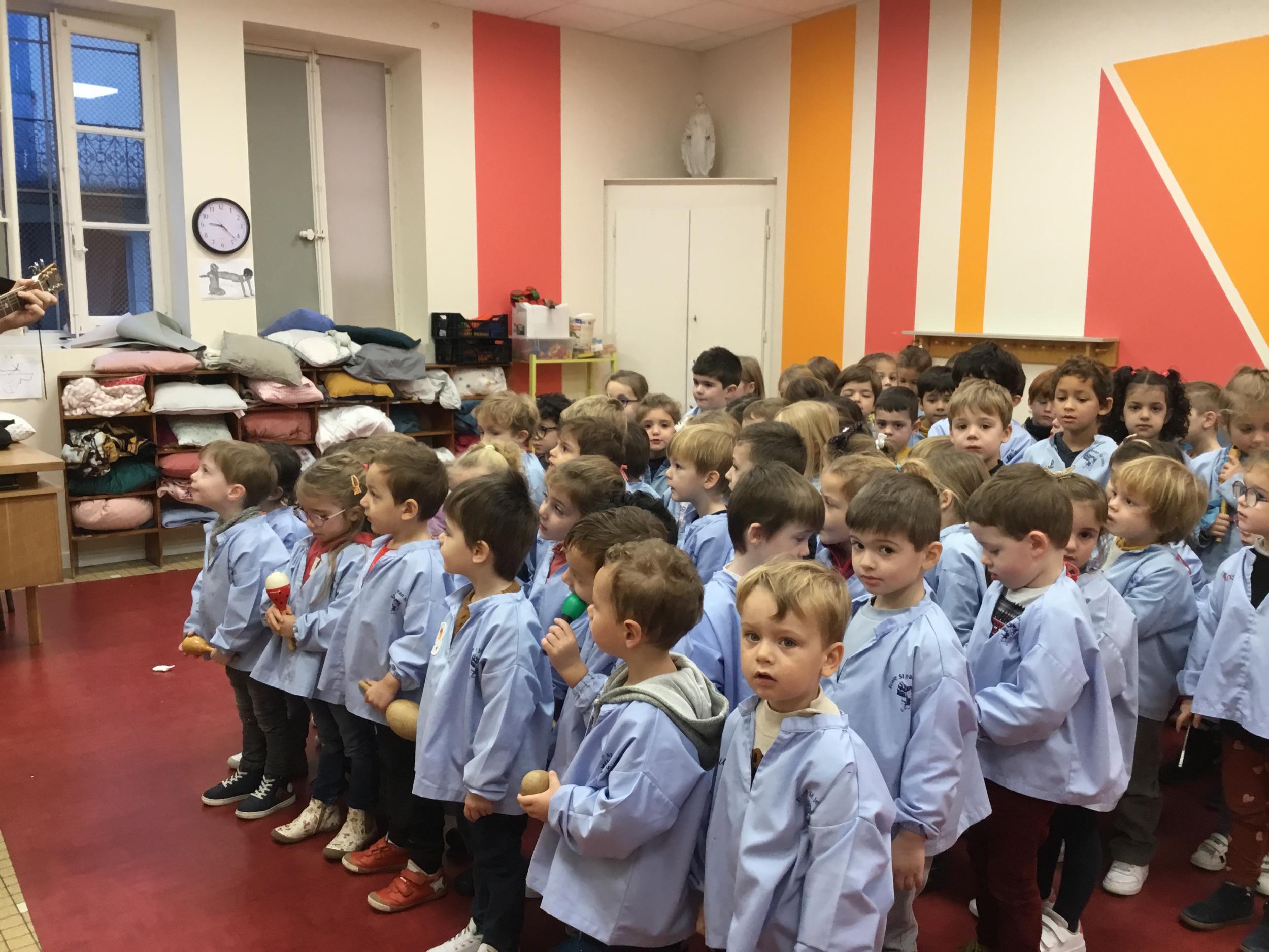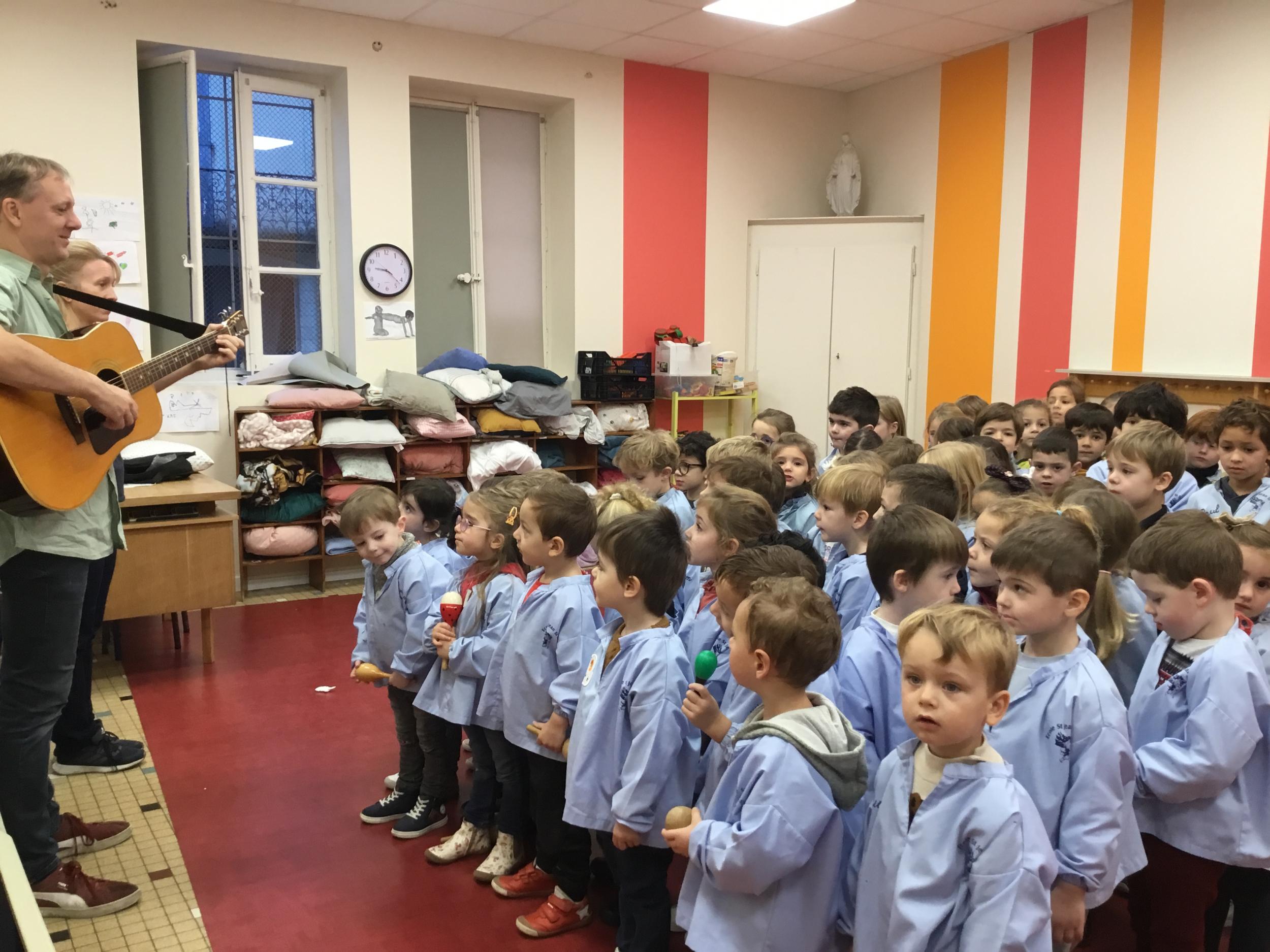 Tous les vendredis avec les moyens et les grandes sections , nous chantons ensemble . Le maître joue de la guitare. En ce moment nous répétons les chants que nous chanterons le soir du marché de Noël devant nos parents… Réservez votre soirée … C est le 9 décembre 😀