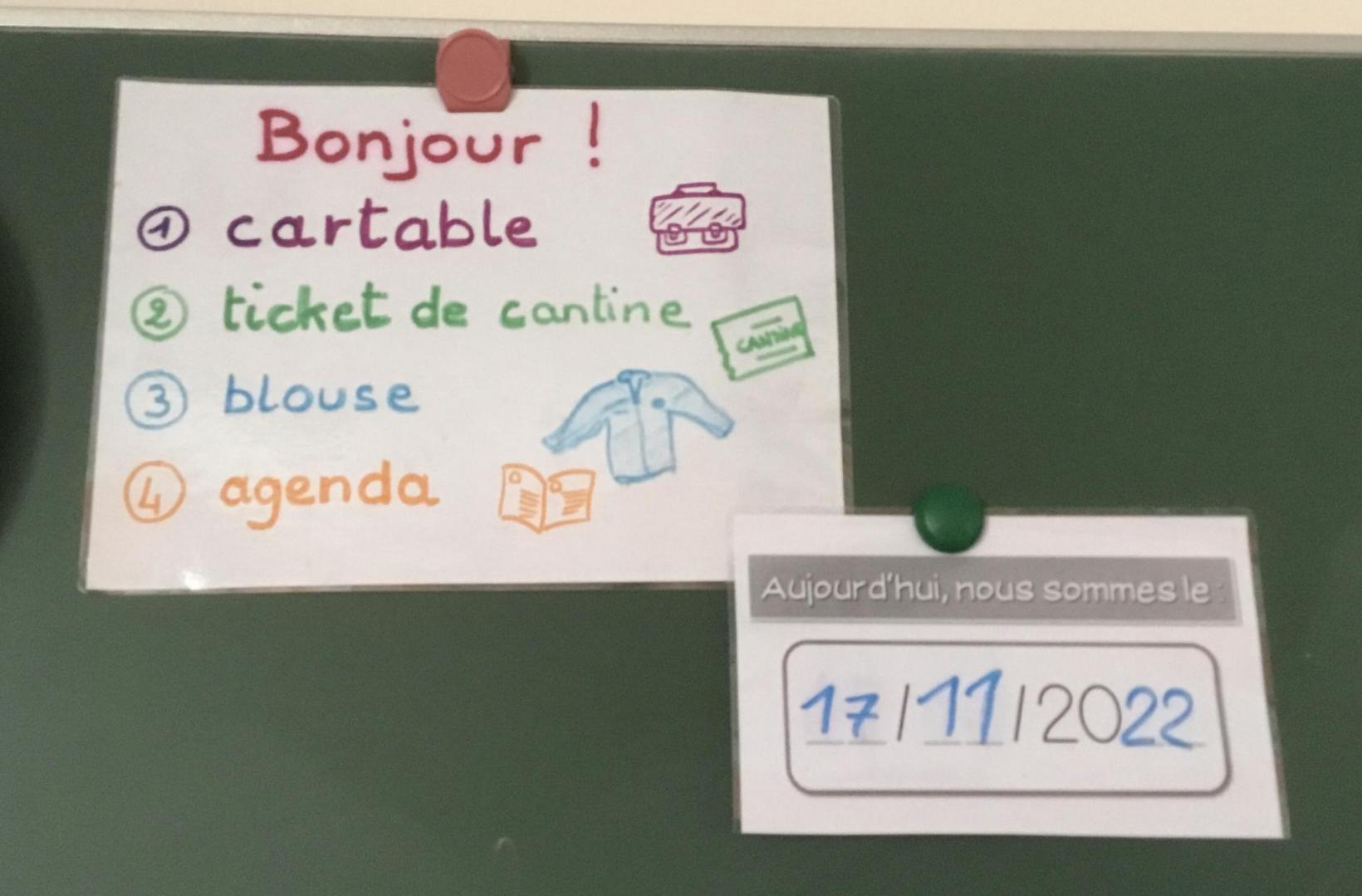 Dans notre cahier du jour, on écrit la date la date en bleu et les matières en noir et on attend que la maîtresse dise « One, two, three, connection ! »