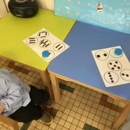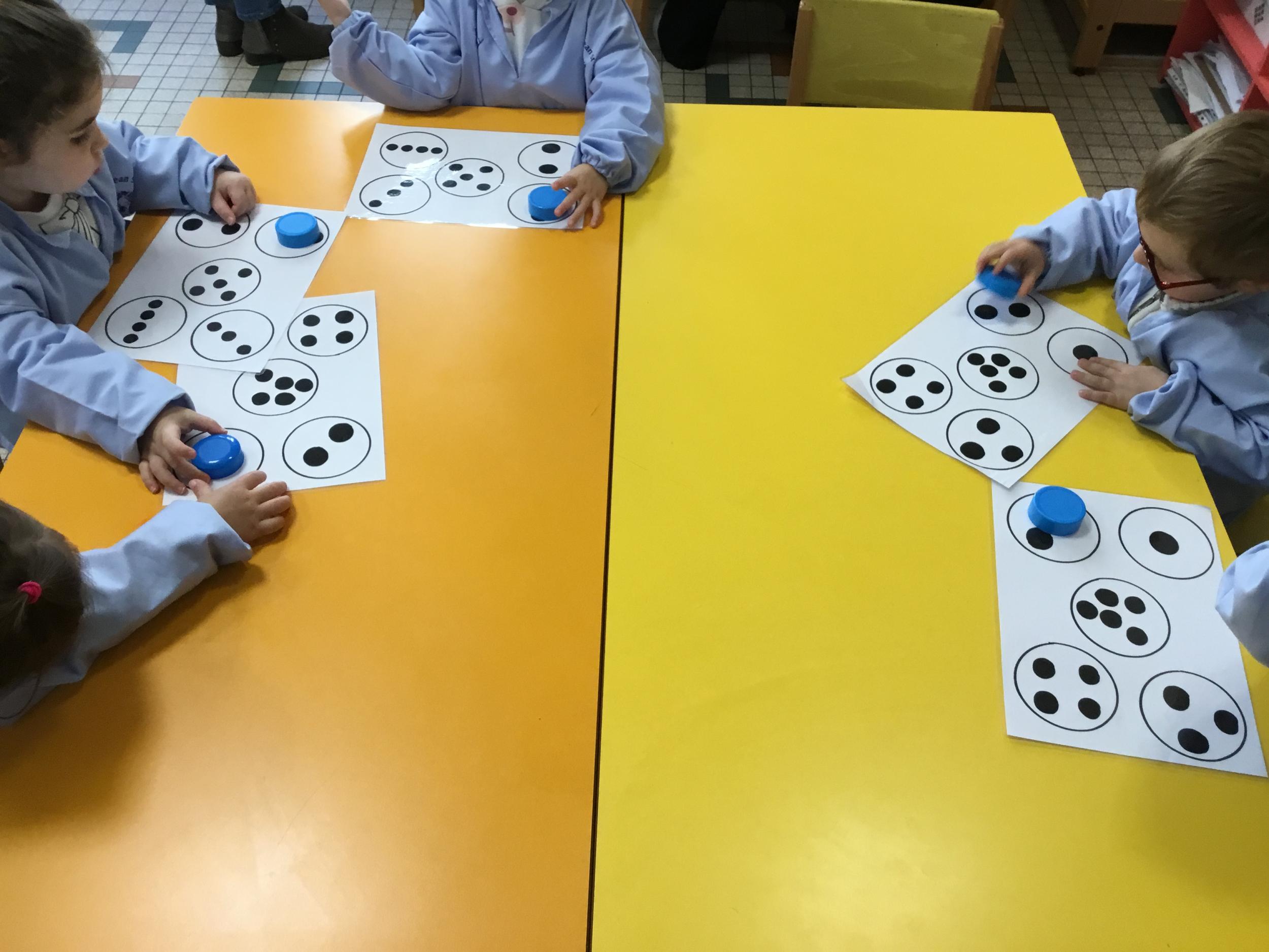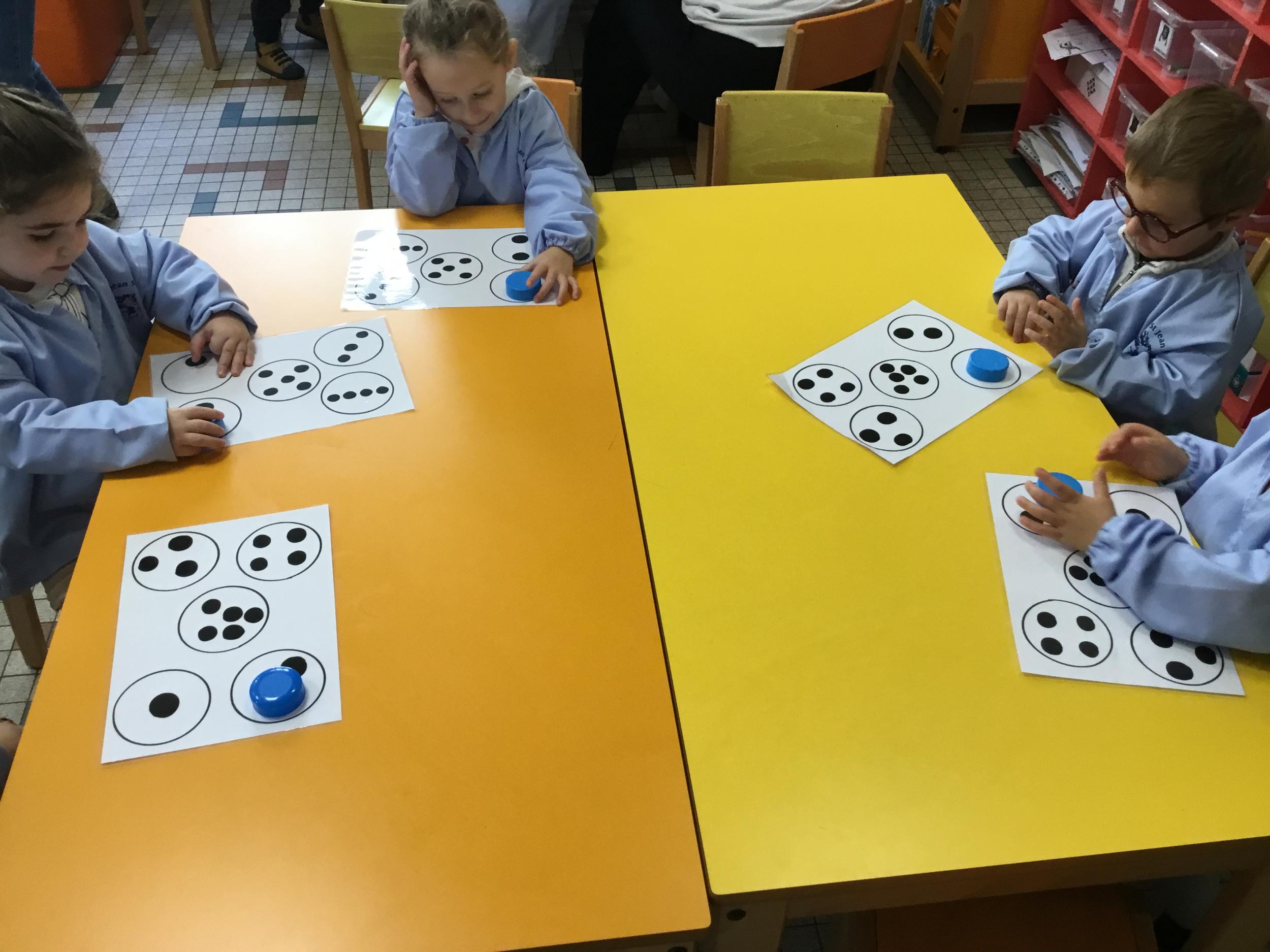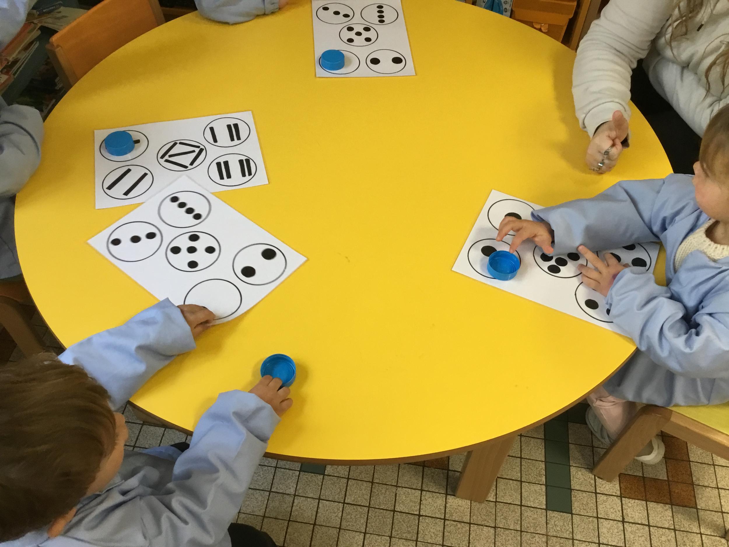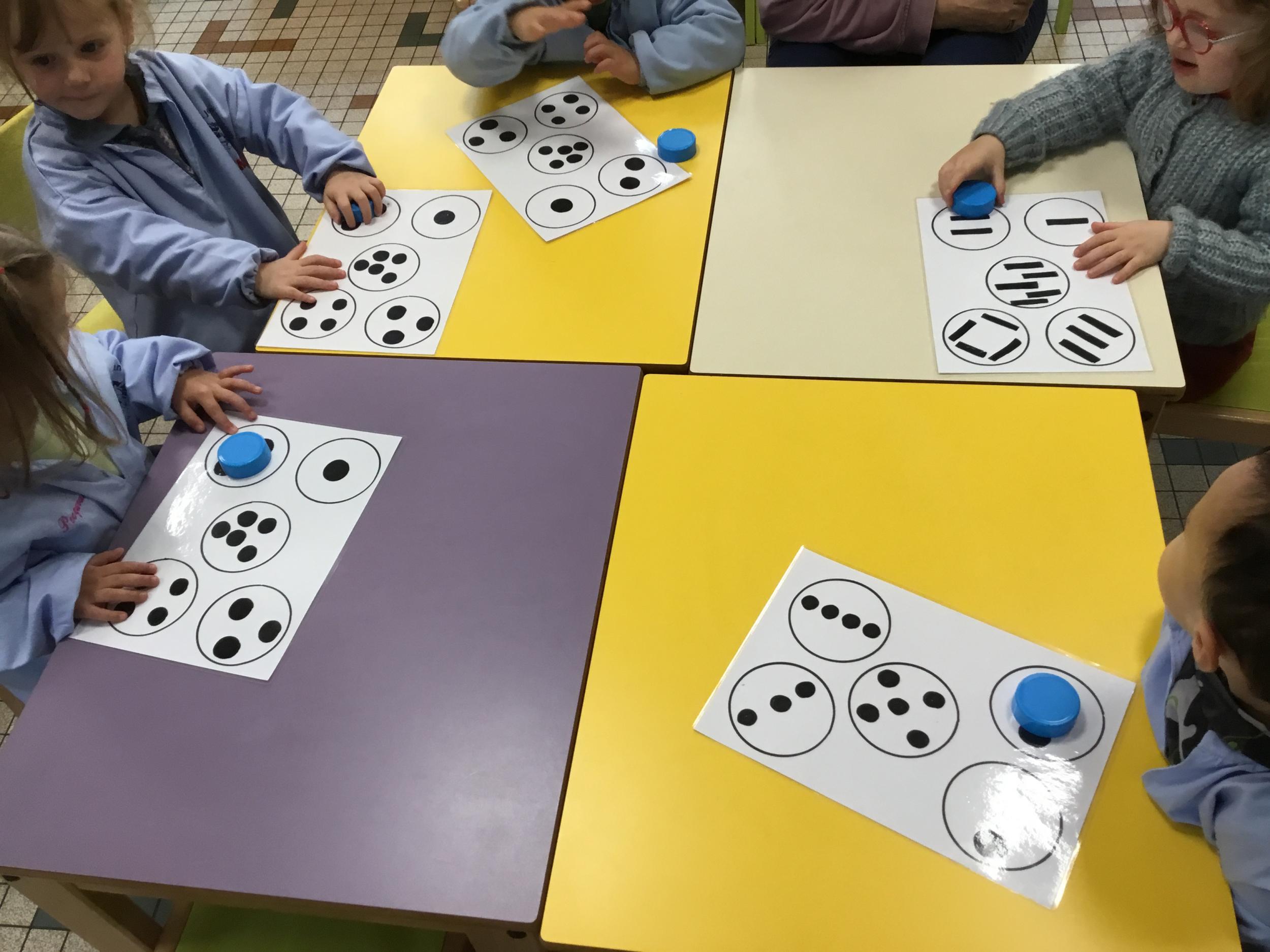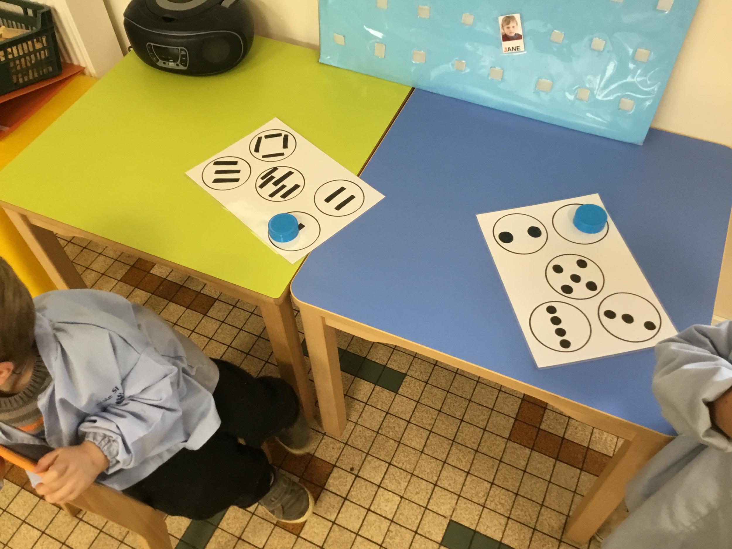 Puis chaque enfant a reçu une planche plastifiée sur laquelle sont représentées des quantités. L’élève écoute un frappé ( pan… pan pan.. ou pan pan pan ) et doit montrer à quelle représentation le frappé correspond sur sa planche. A aucun moment le nombre de frappés est nommé .