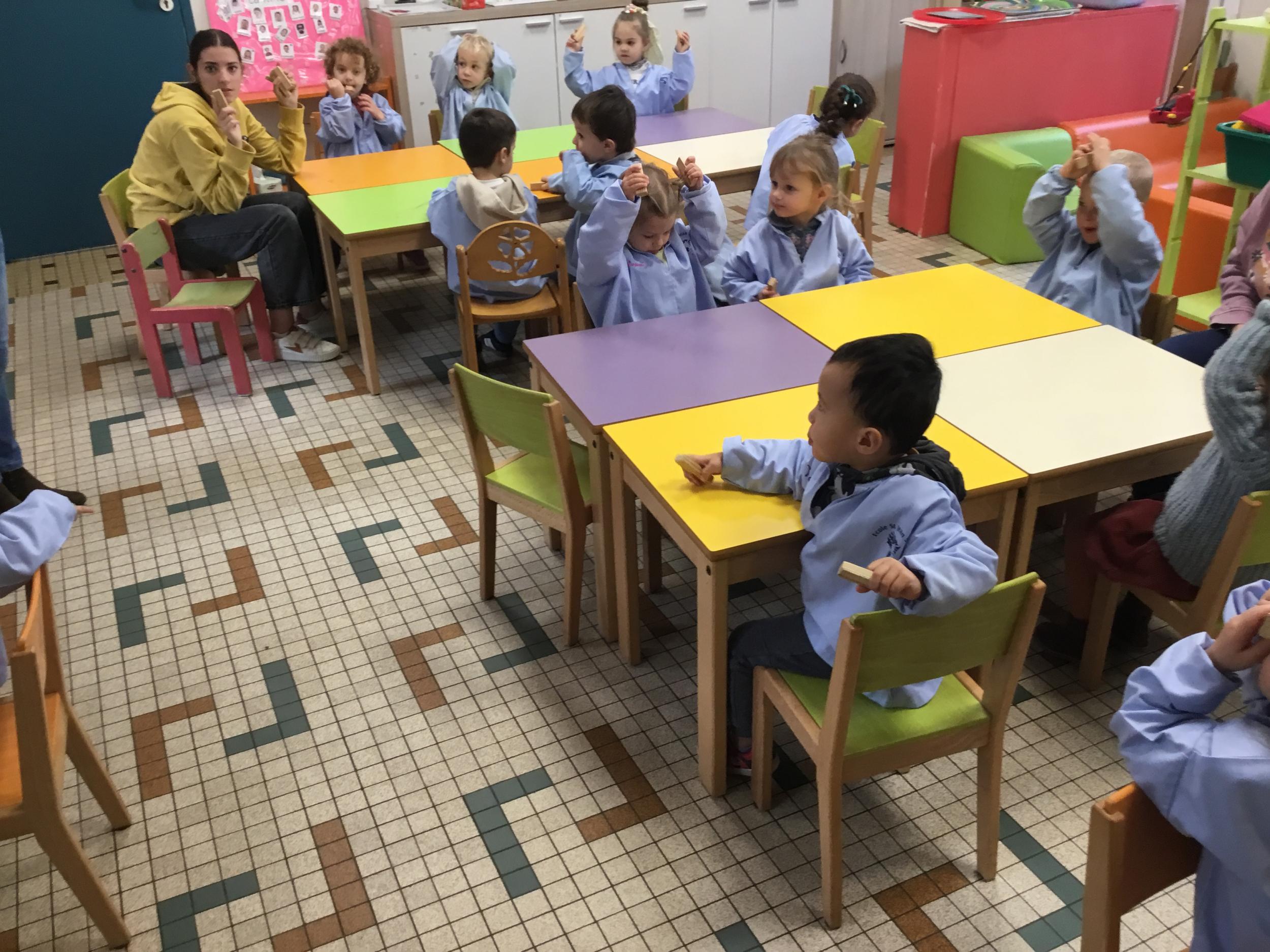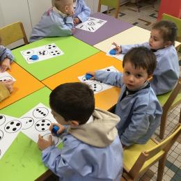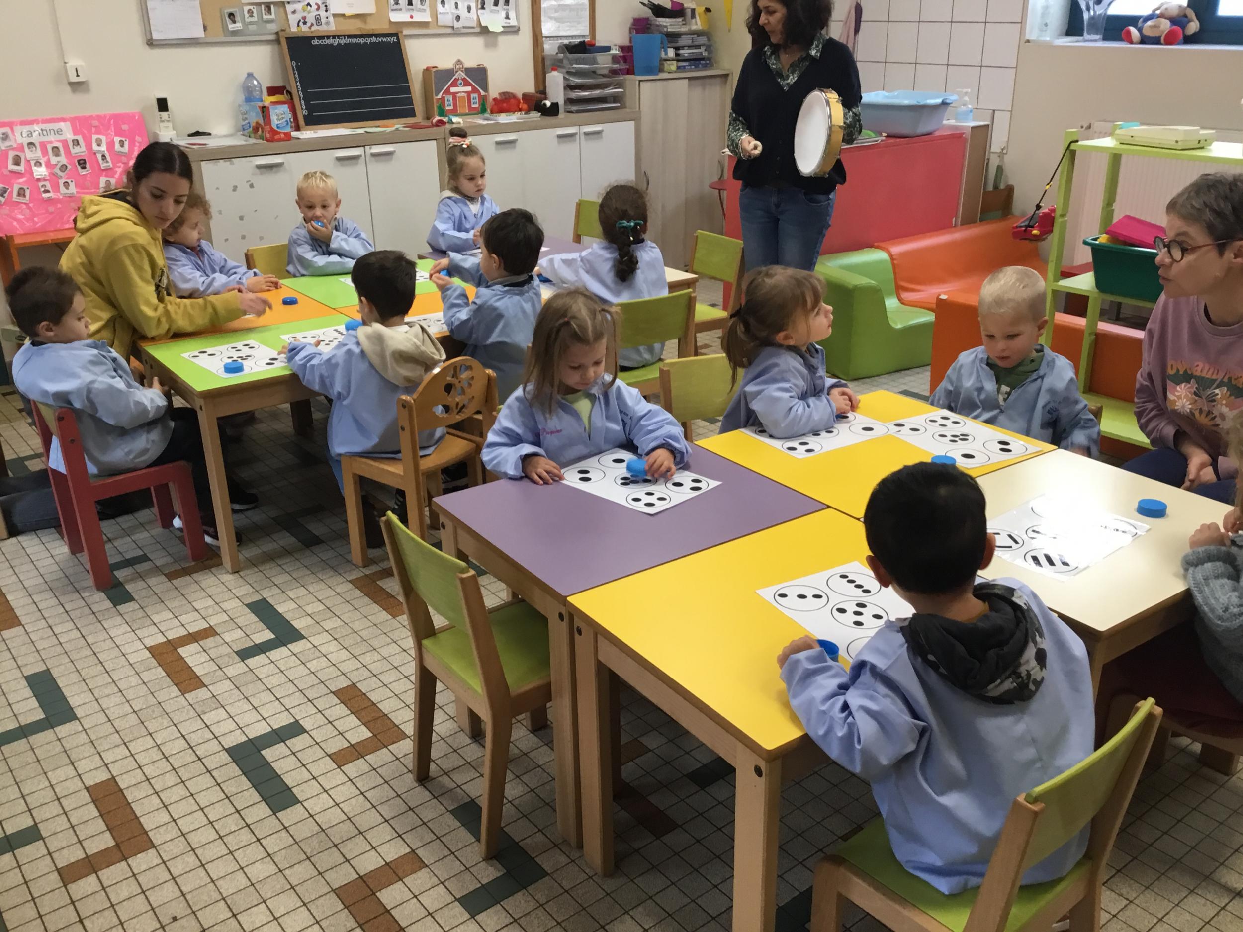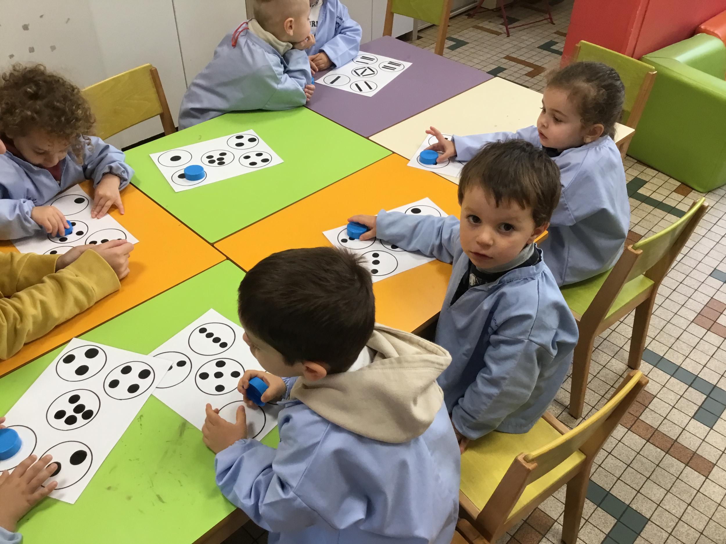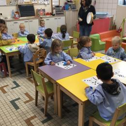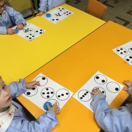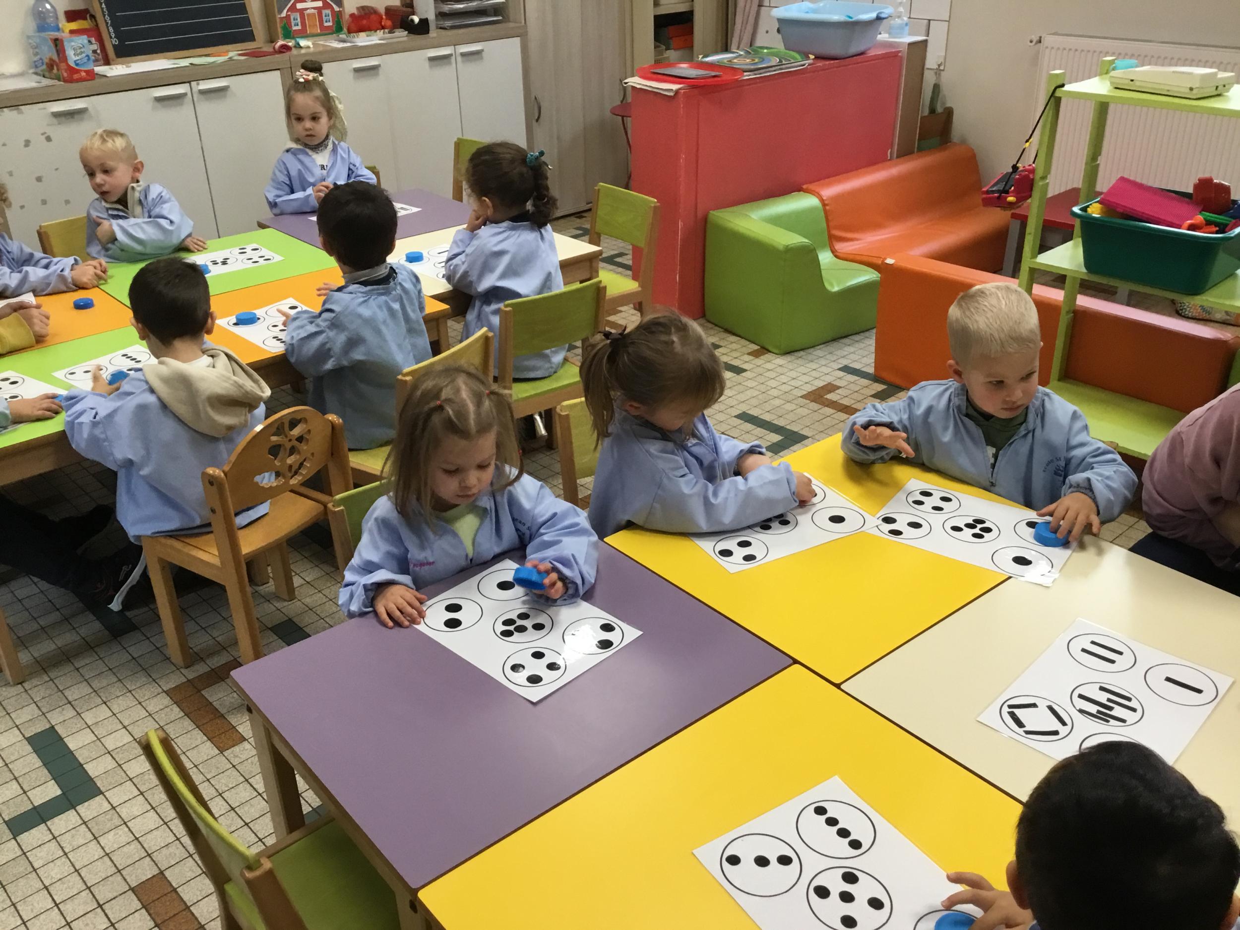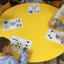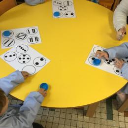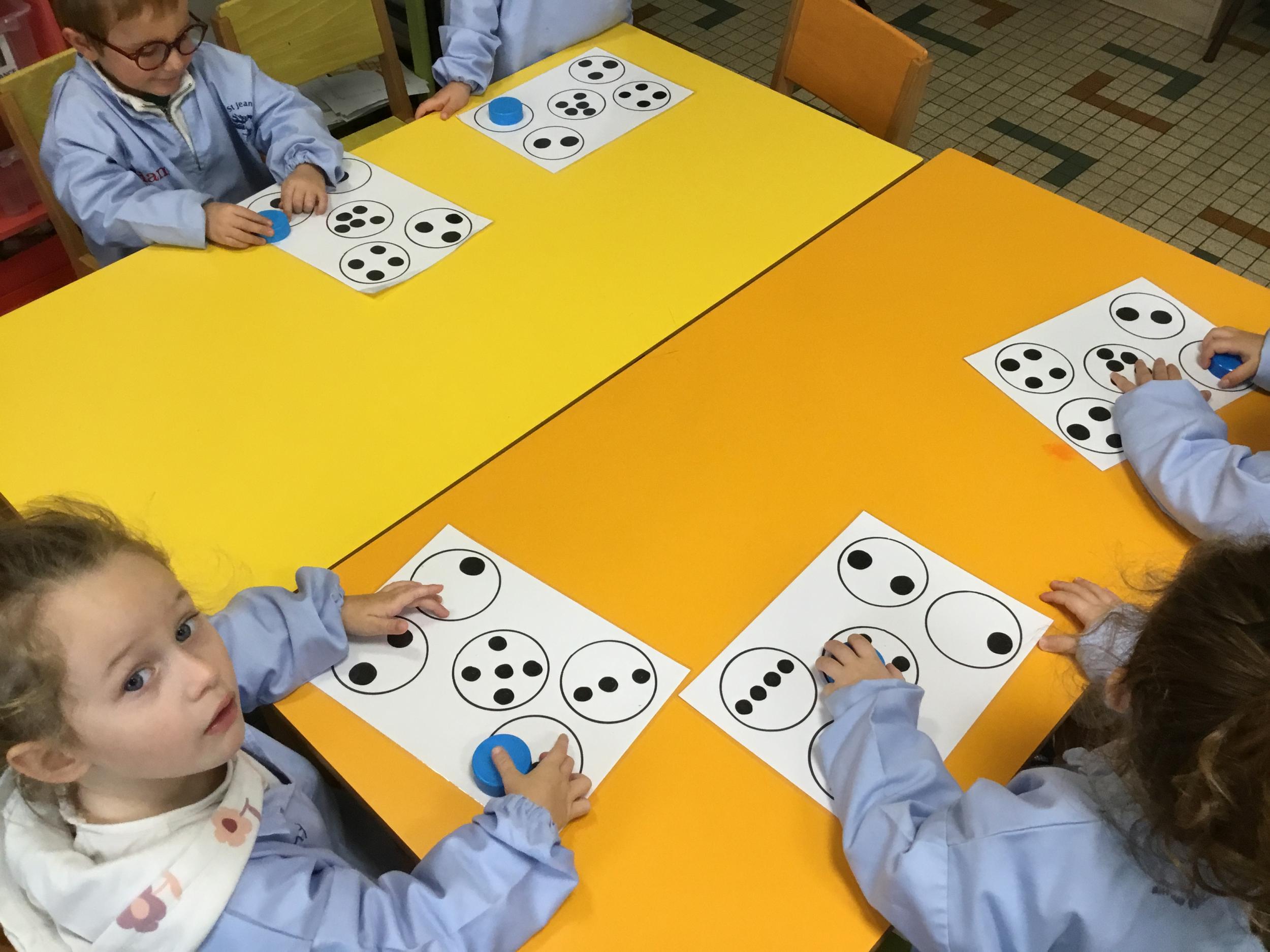 Puis chaque enfant a reçu une planche plastifiée sur laquelle sont représentées des quantités. L’élève écoute un frappé ( pan… pan pan.. ou pan pan pan ) et doit montrer à quelle représentation le frappé correspond sur sa planche. A aucun moment le nombre de frappés est nommé .