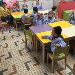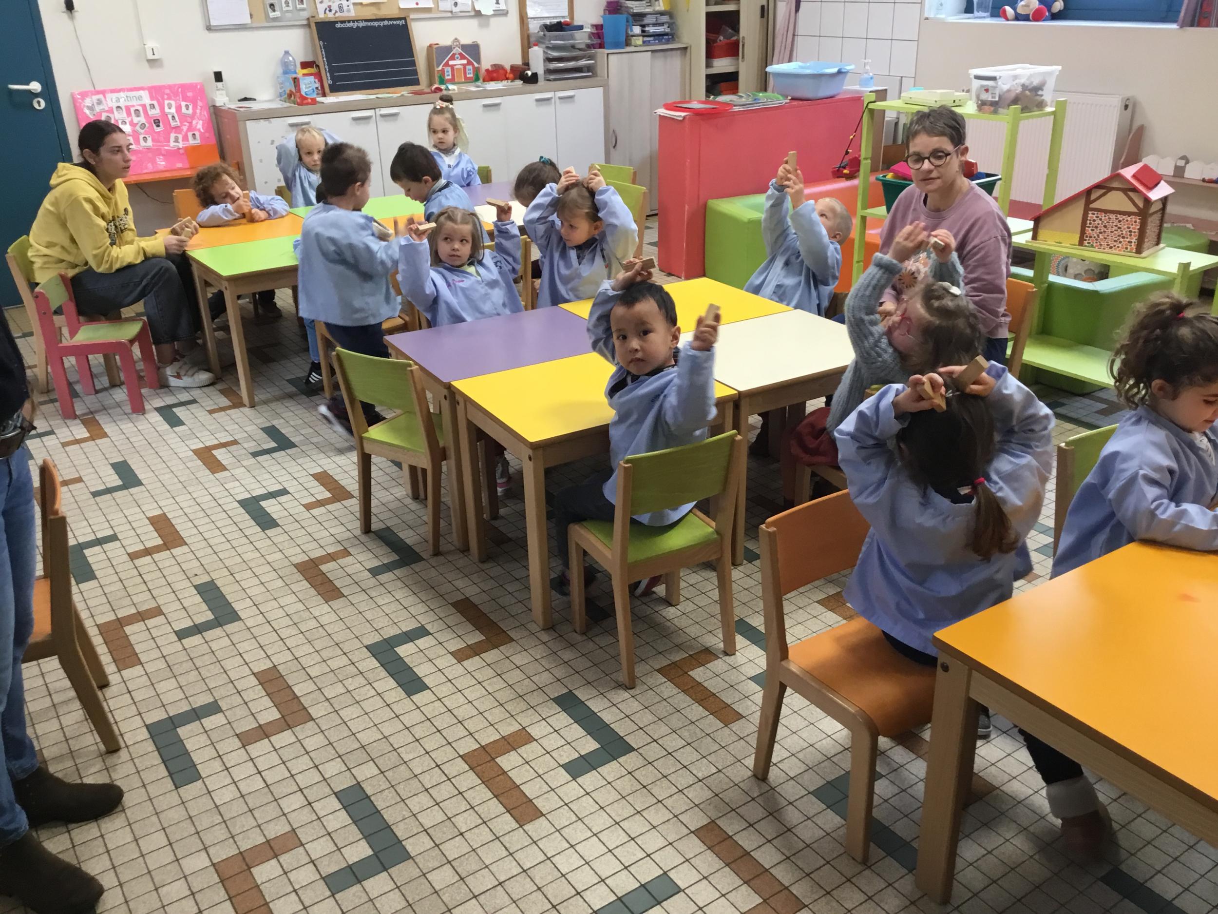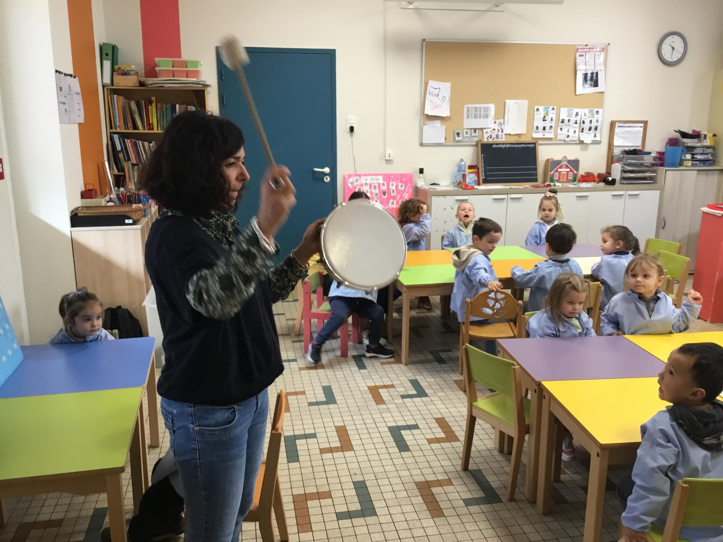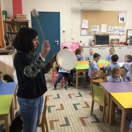 Tout d’abord nous avons travaillé l’écoute et la reproduction de frappés (pan pan … ou pan … ou pan pan pan ) , Un exercice extrêmement difficile car les élèves ont tendance à frapper dans leur mains pour le plaisir et en oublient la consigne… qui demande contrôle et concentration.