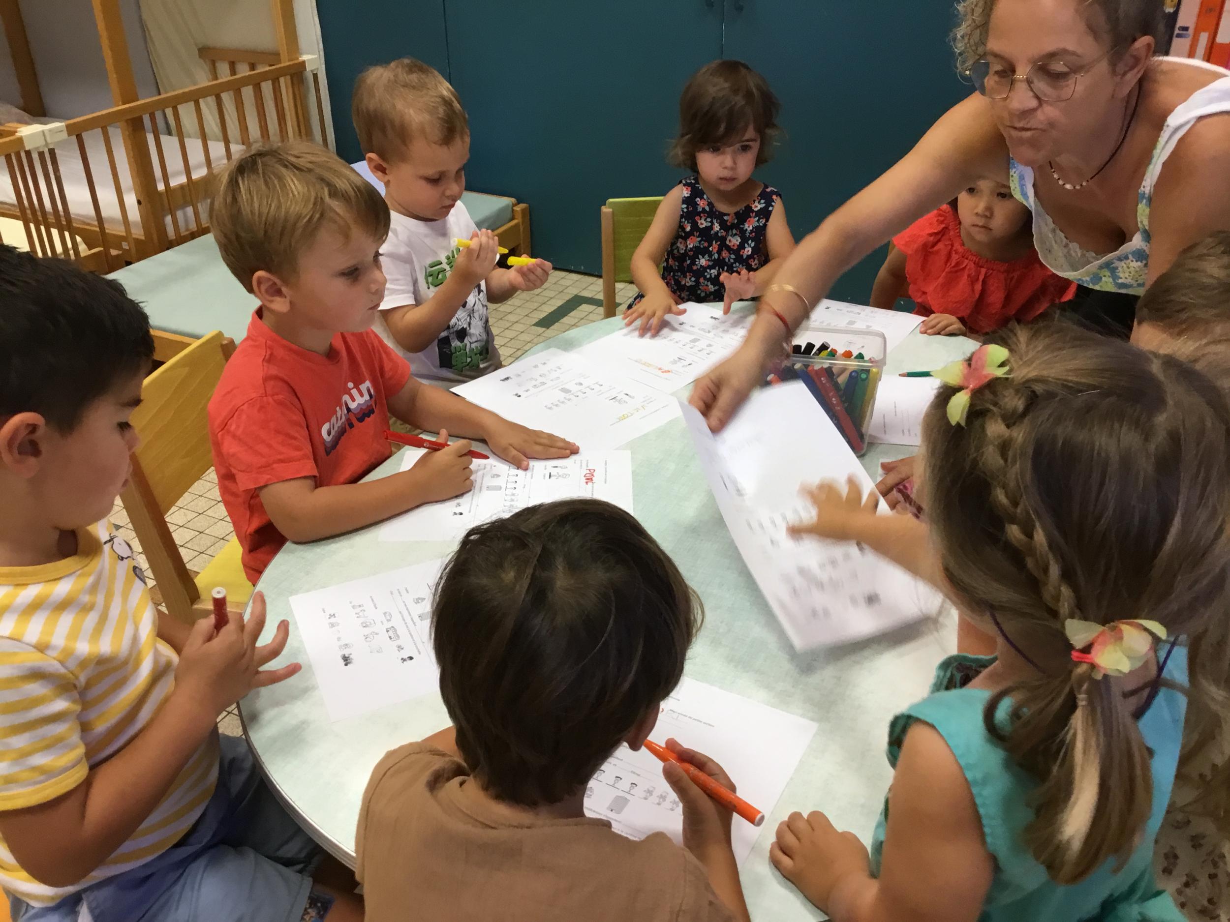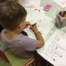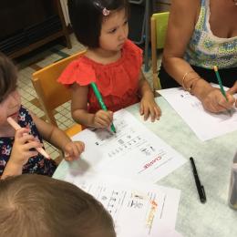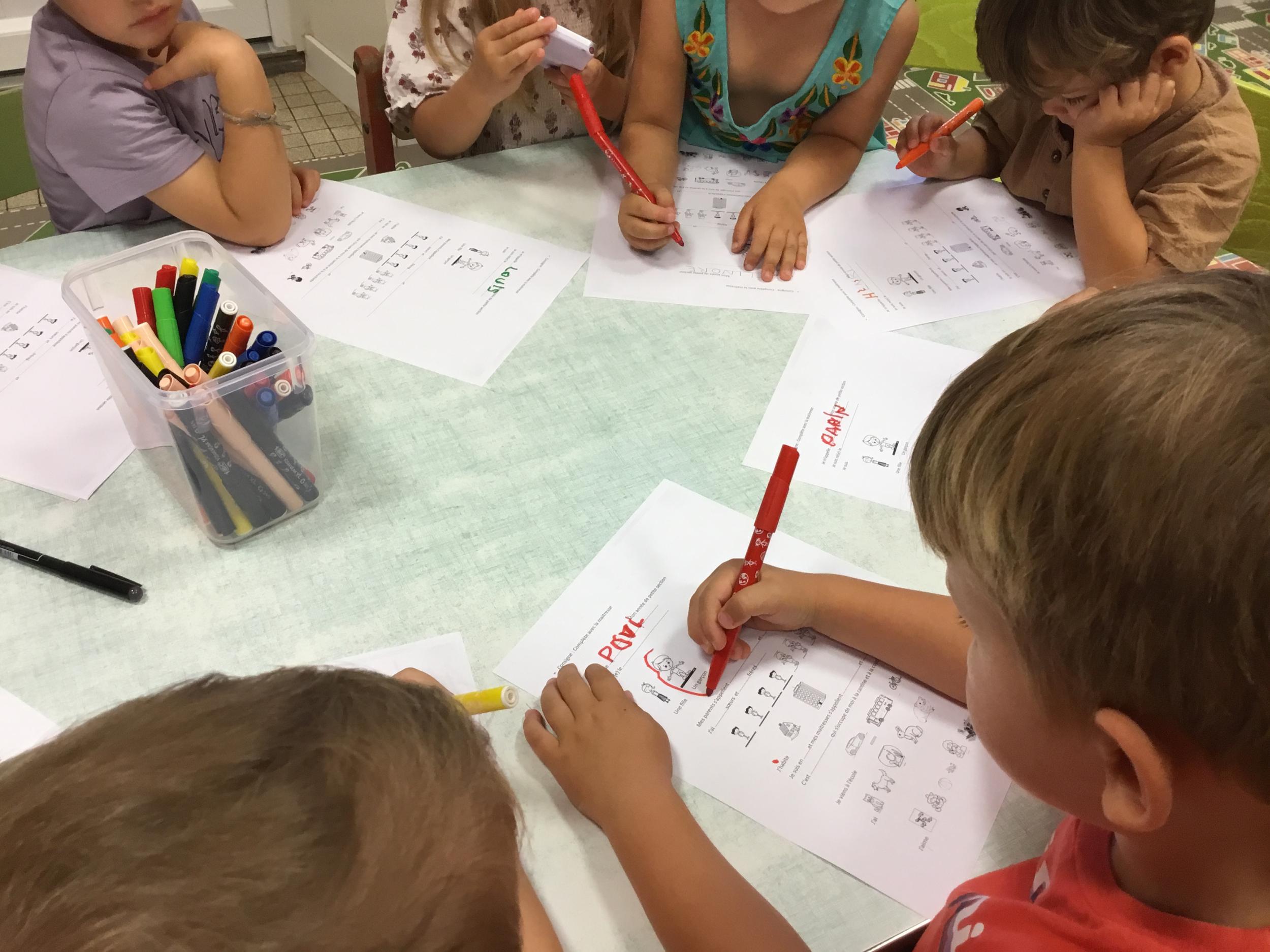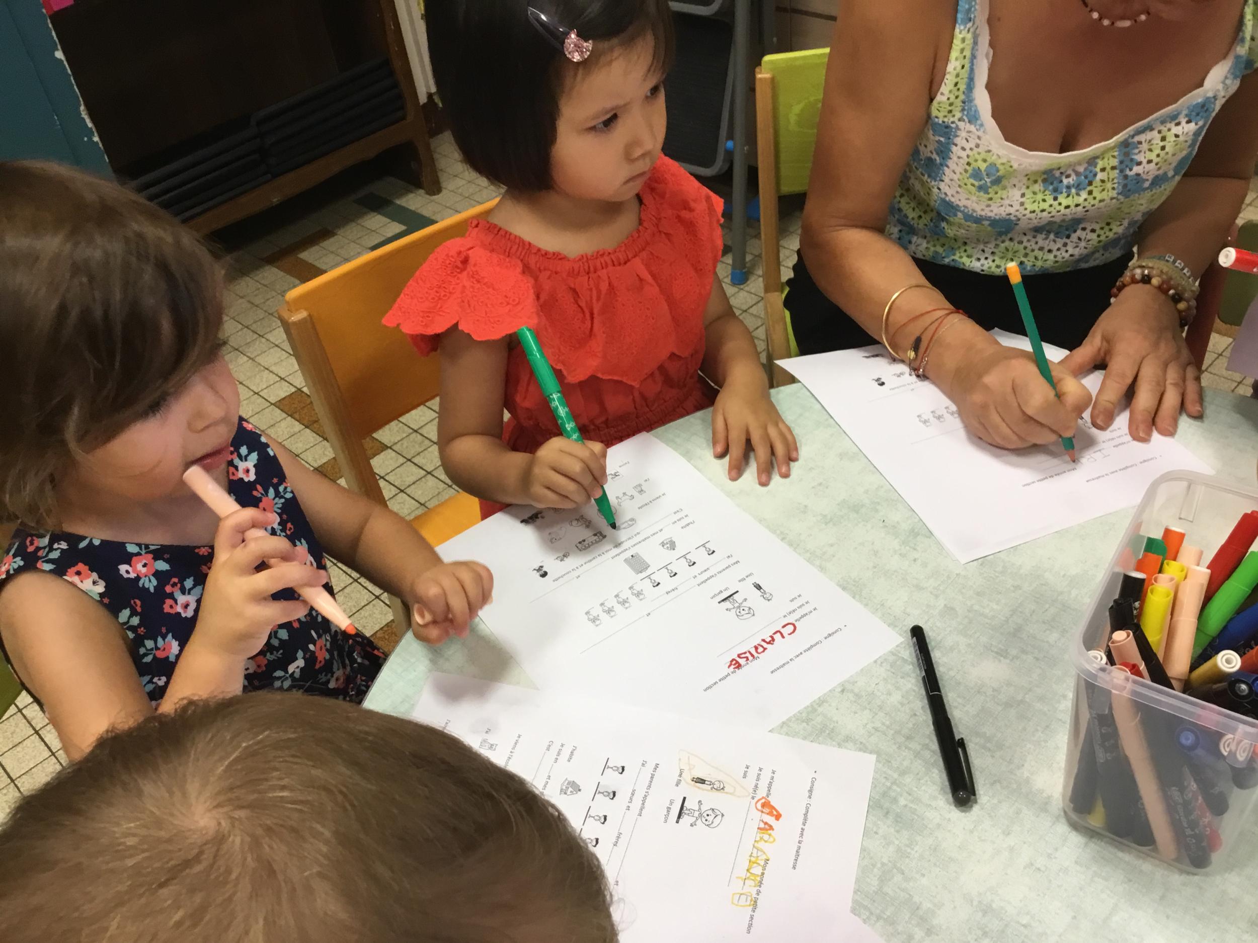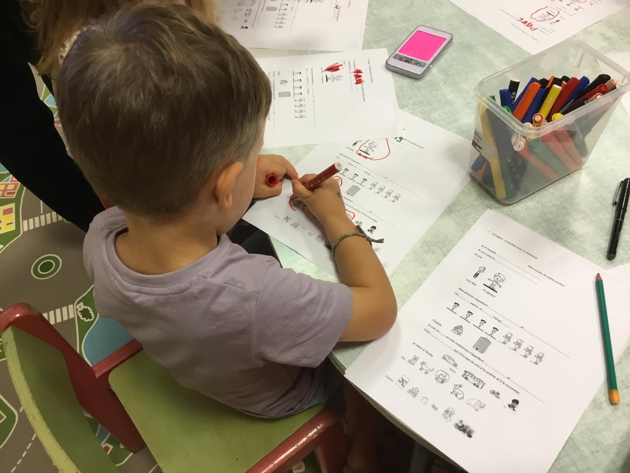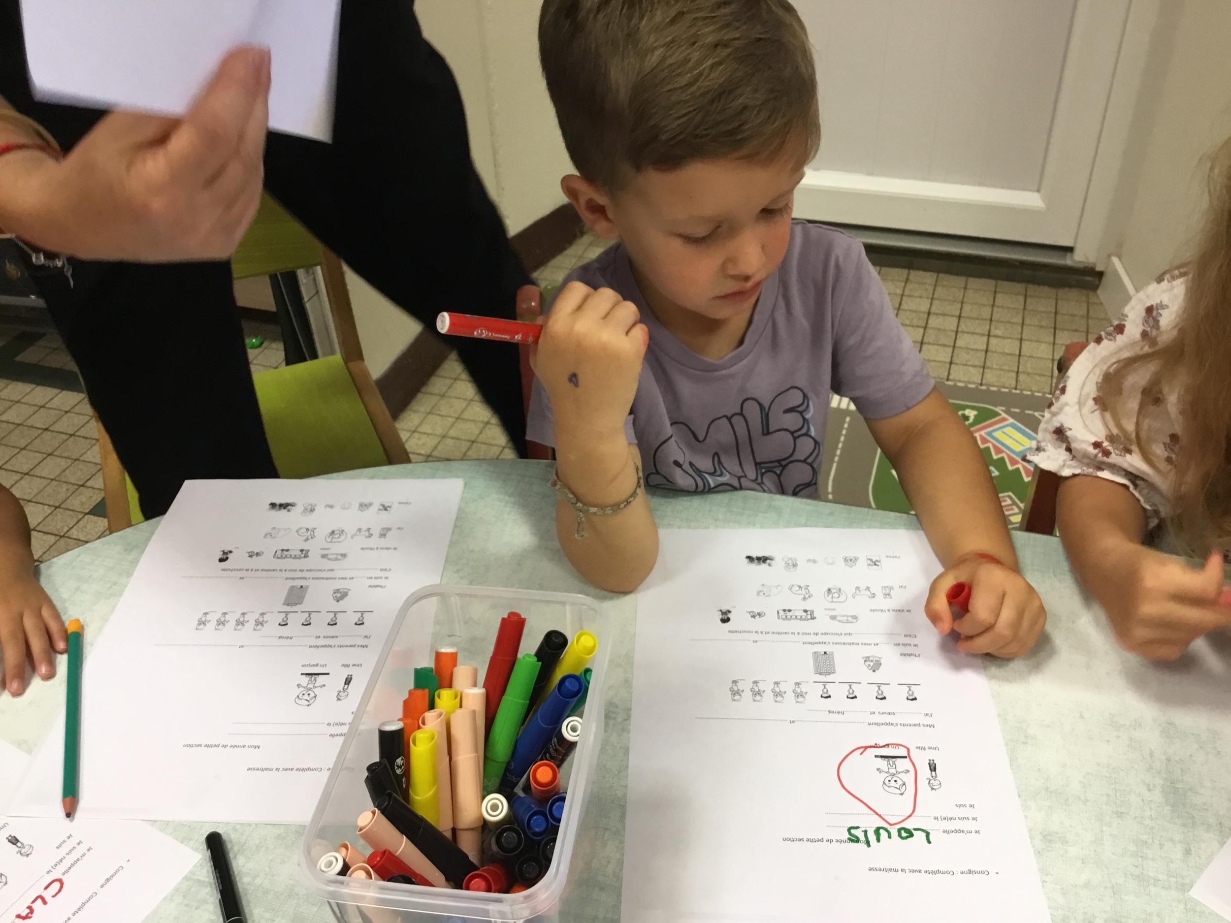 Les enfants qui ont l’habitude de venir à l’école ont complété une fiche de présentation. Il fallait entourer leur lieu d’habitation, dire s’ils venaient à l’école en vélo ou en voiture…..choisir leur jouets préférés, nommer le prénom de leur parents……