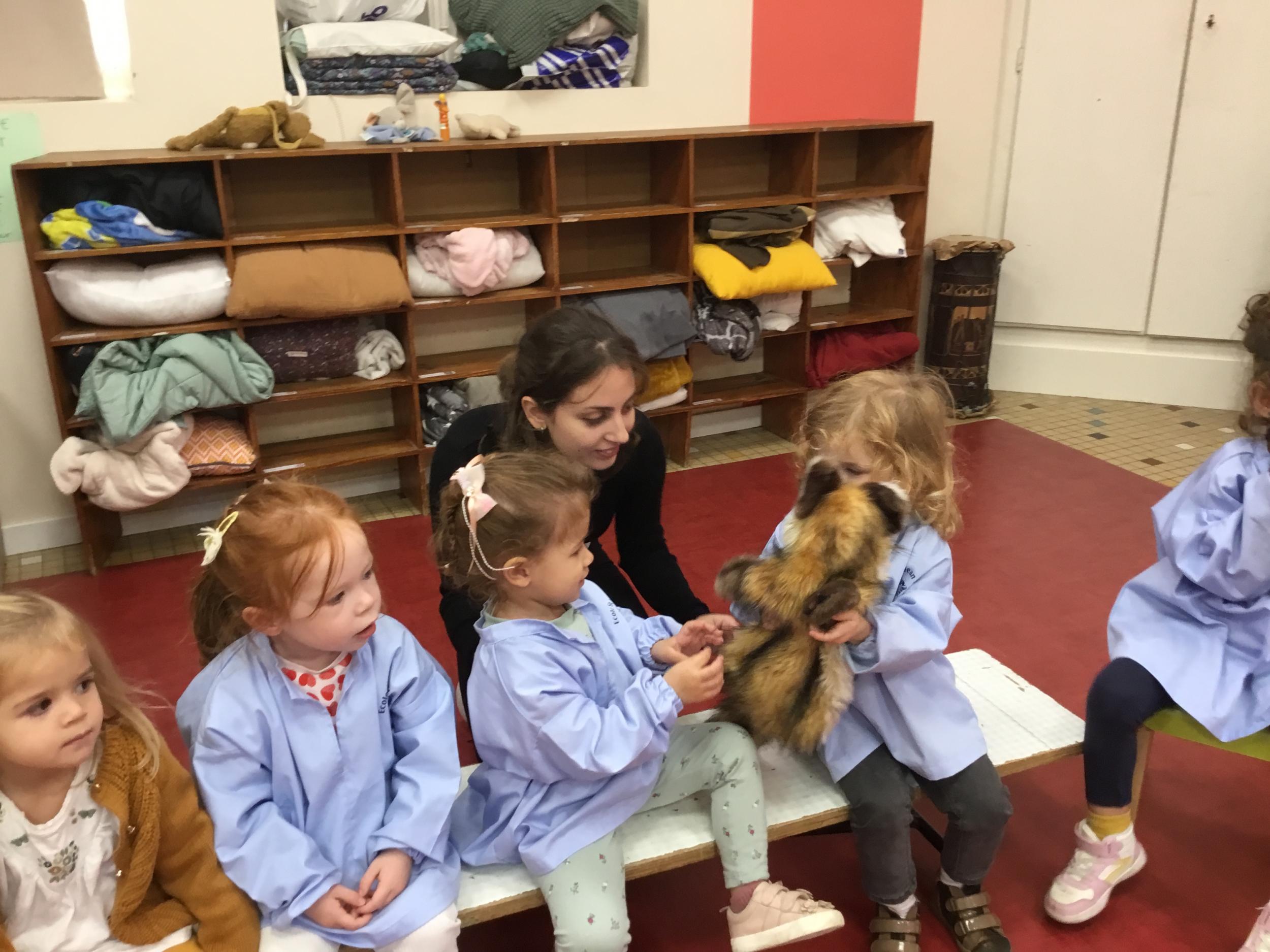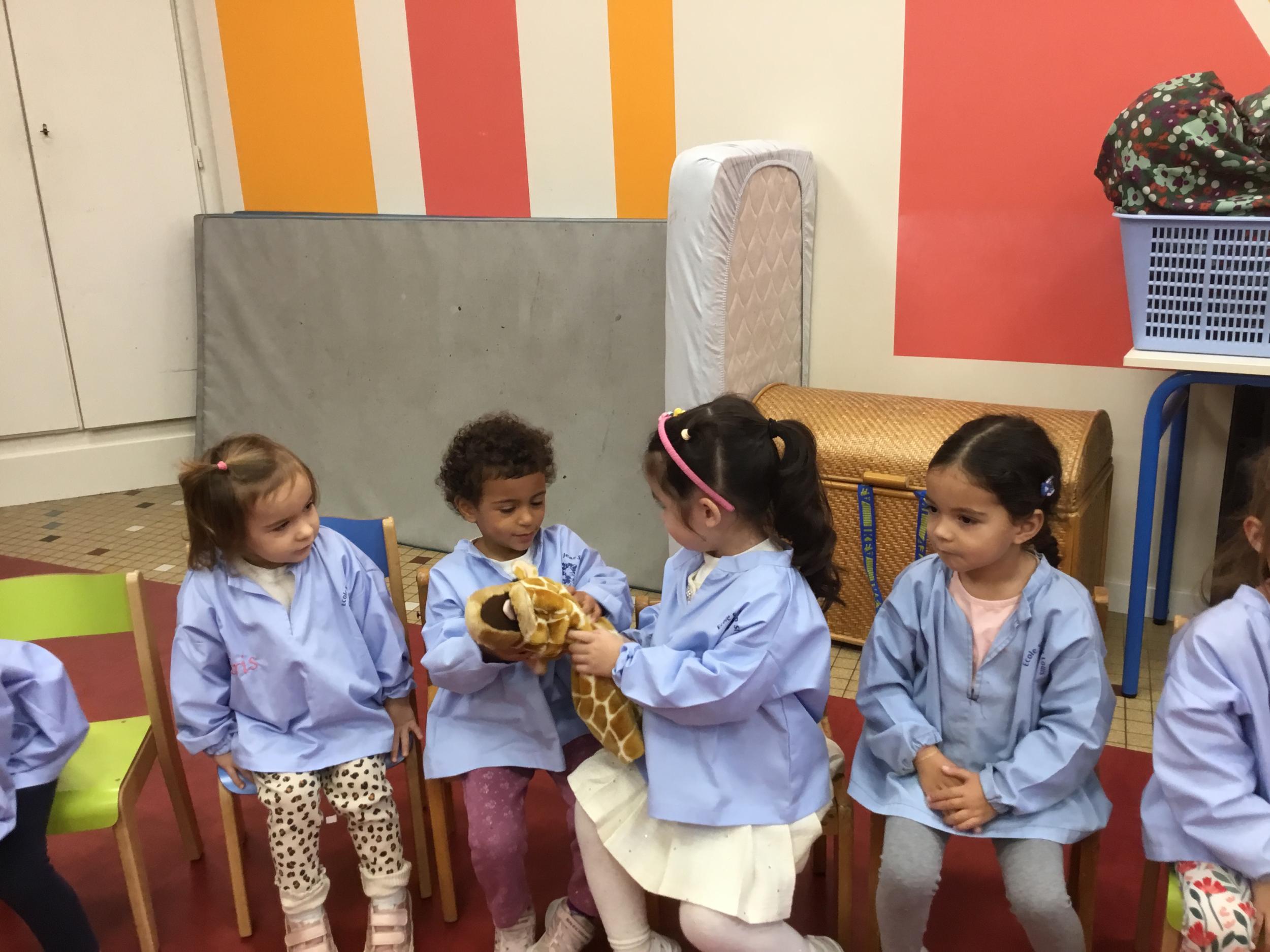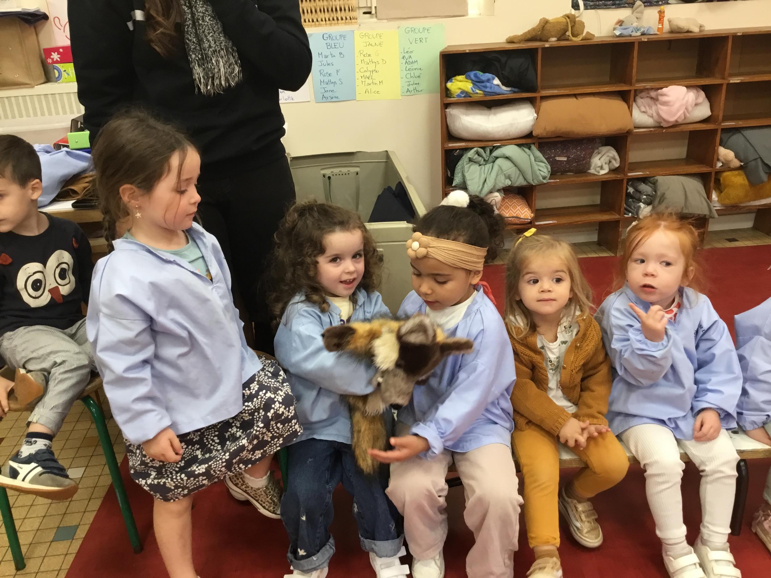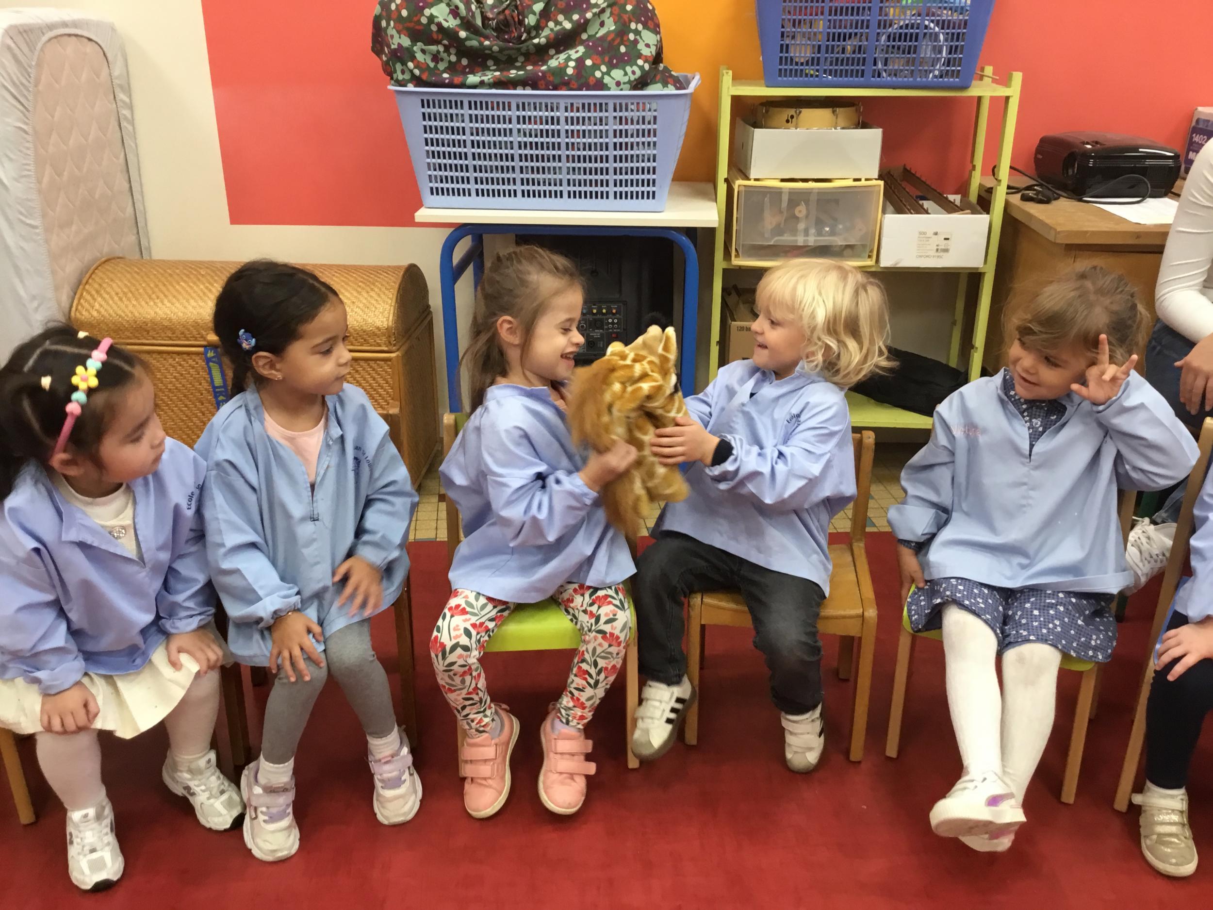 Nous avons découvert l’atelier de Gigi et Loulou…. Ses chants, ses règles, et le sens de cet atelier. Avec Gigi et Loulou les élèves vont repérer des émotions en fonction des situations jouées, vont pouvoir peut être s’identifier, et à leur tour s’exprimer. Tous ont souhaité toucher , tenir dans leur mains Gigi comme Loulou. Nous avons essayé de nous les faire passer doucement en se regardant dans les yeux .
