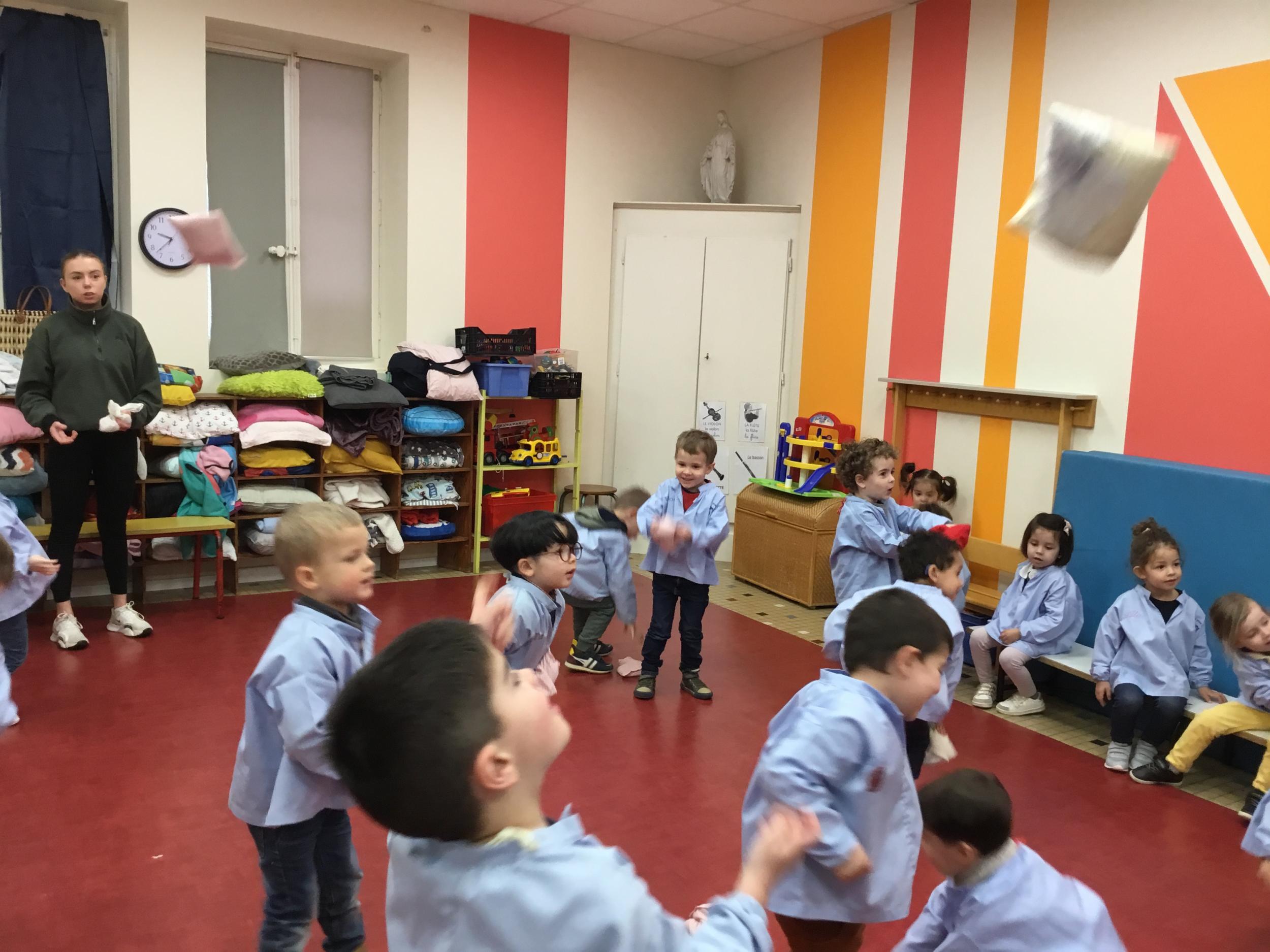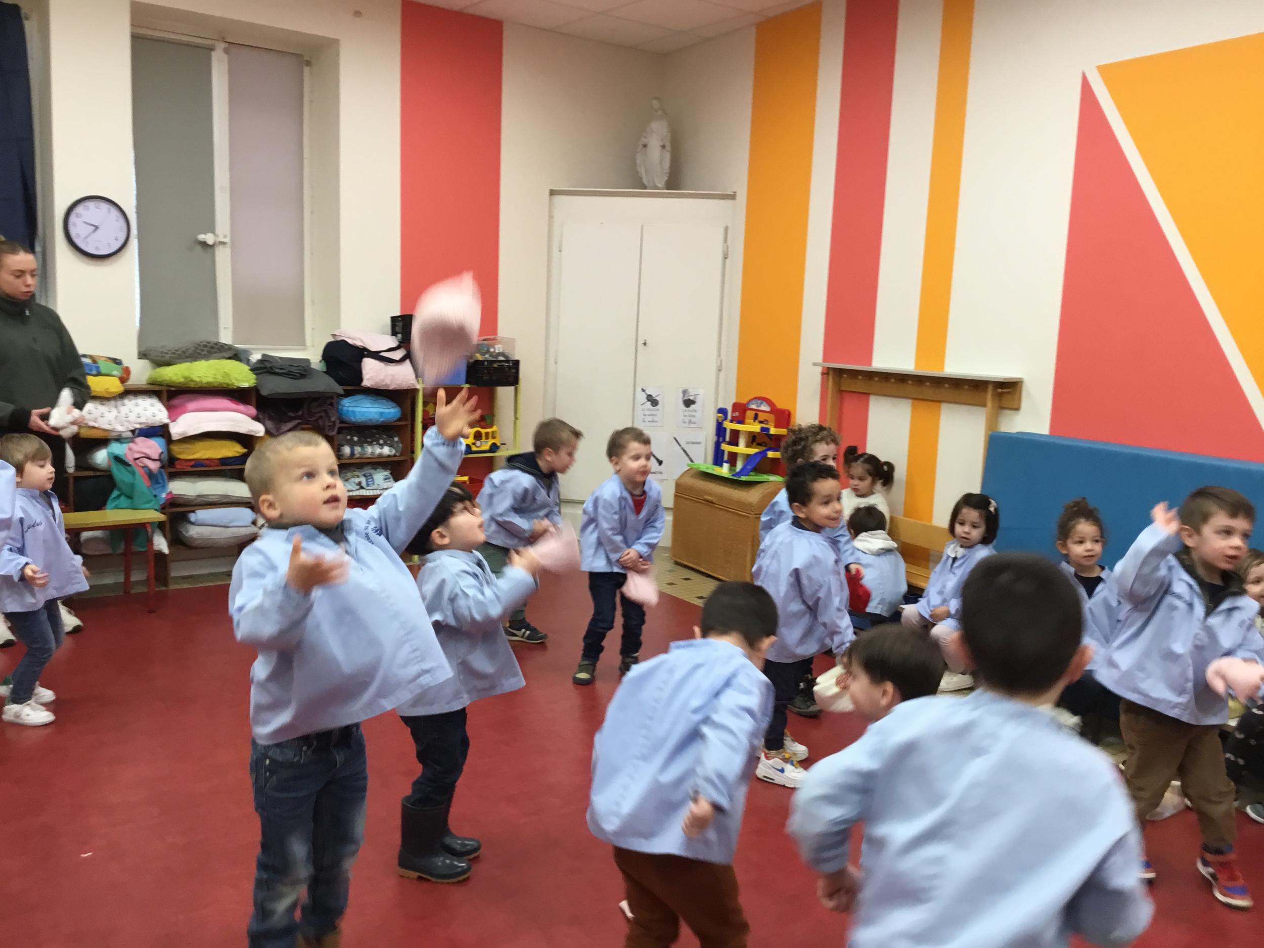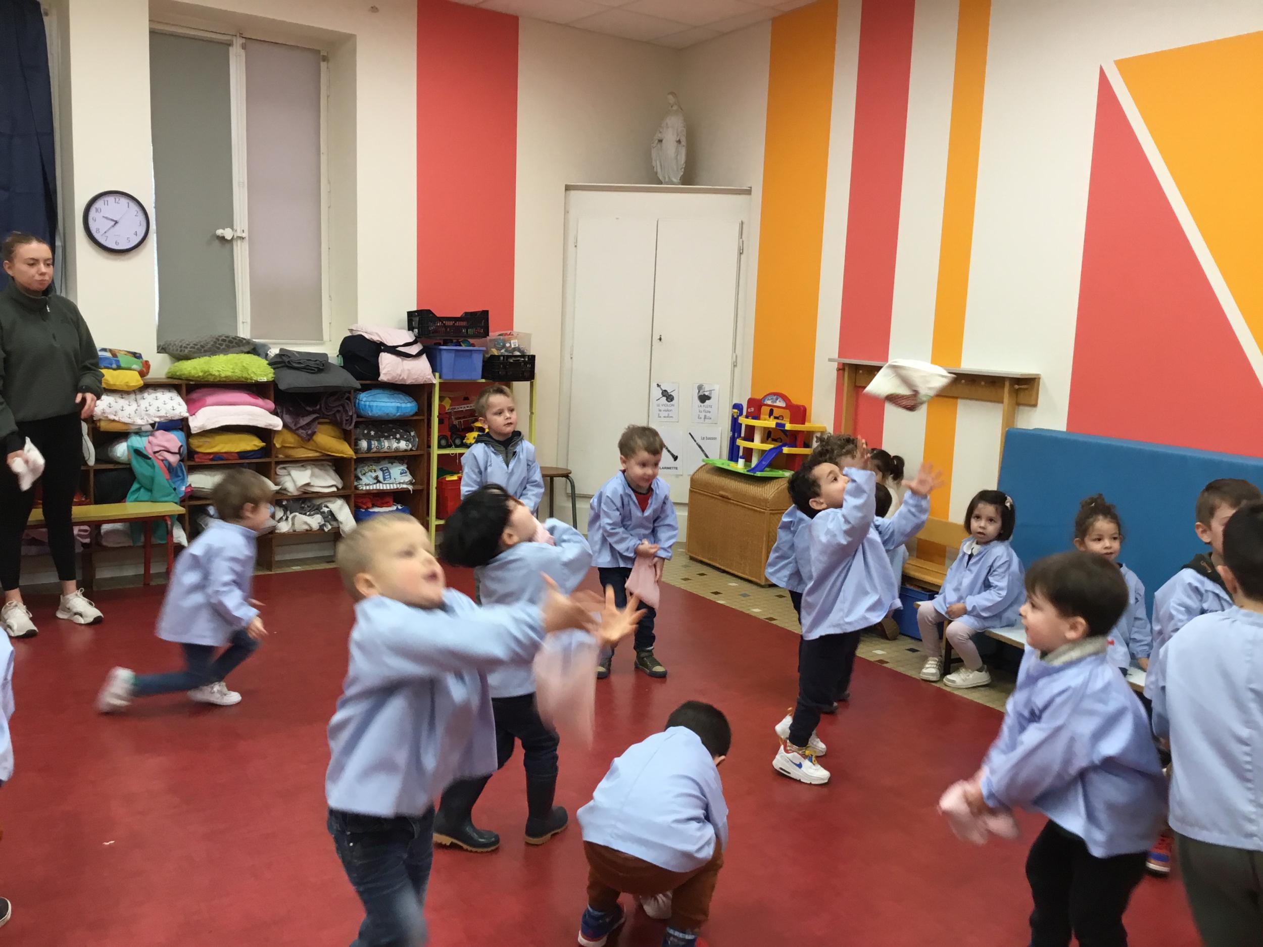 Nous avons appris à lancer et pour plus de facilité la maîtresse nous a donné un petit sac remplie de graines. Nous nous sommes entraînés à lancer d’une main dans l’autre, à lancer en l’air, à lancer loin. Puis nous avons tenté de jouer à un jeu collectif mais c’est encore difficile de respecter les règles….