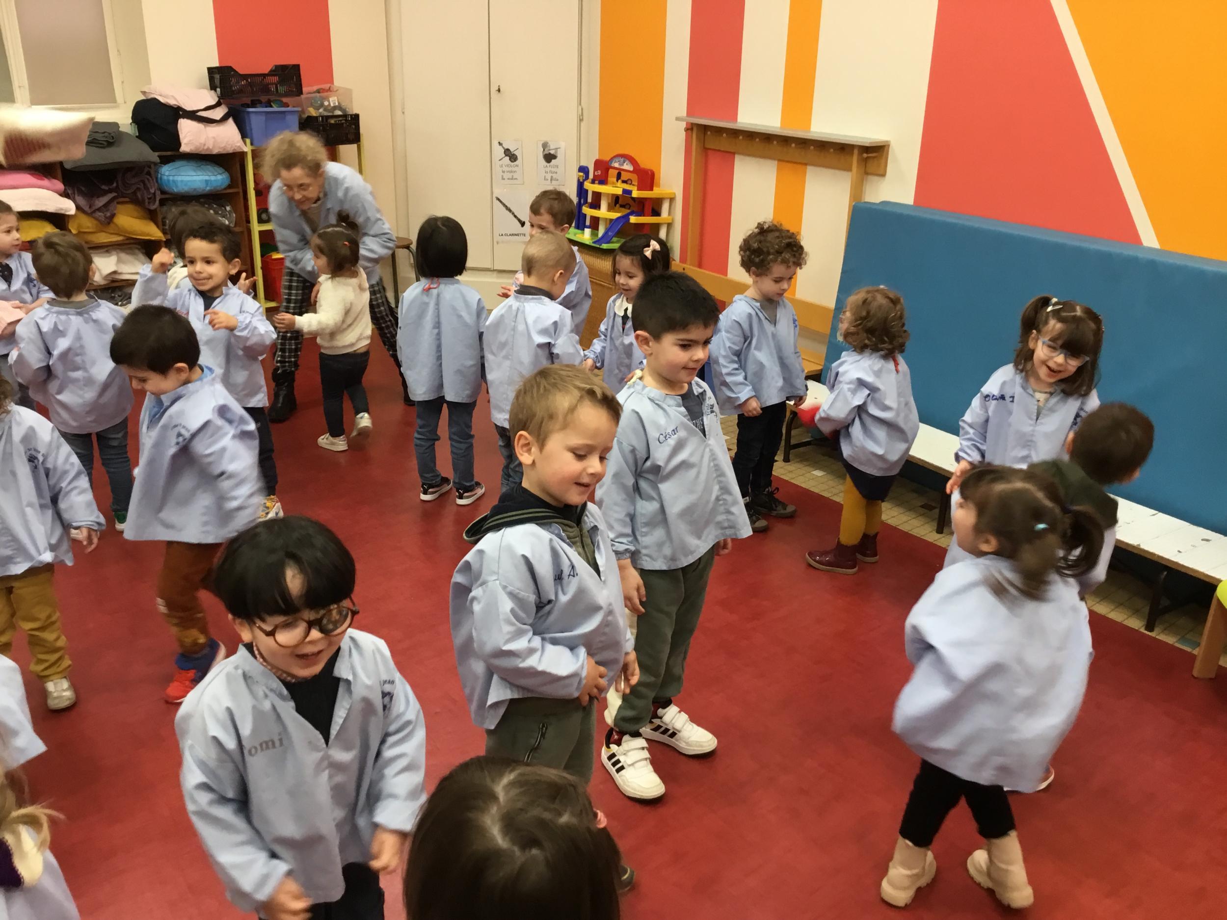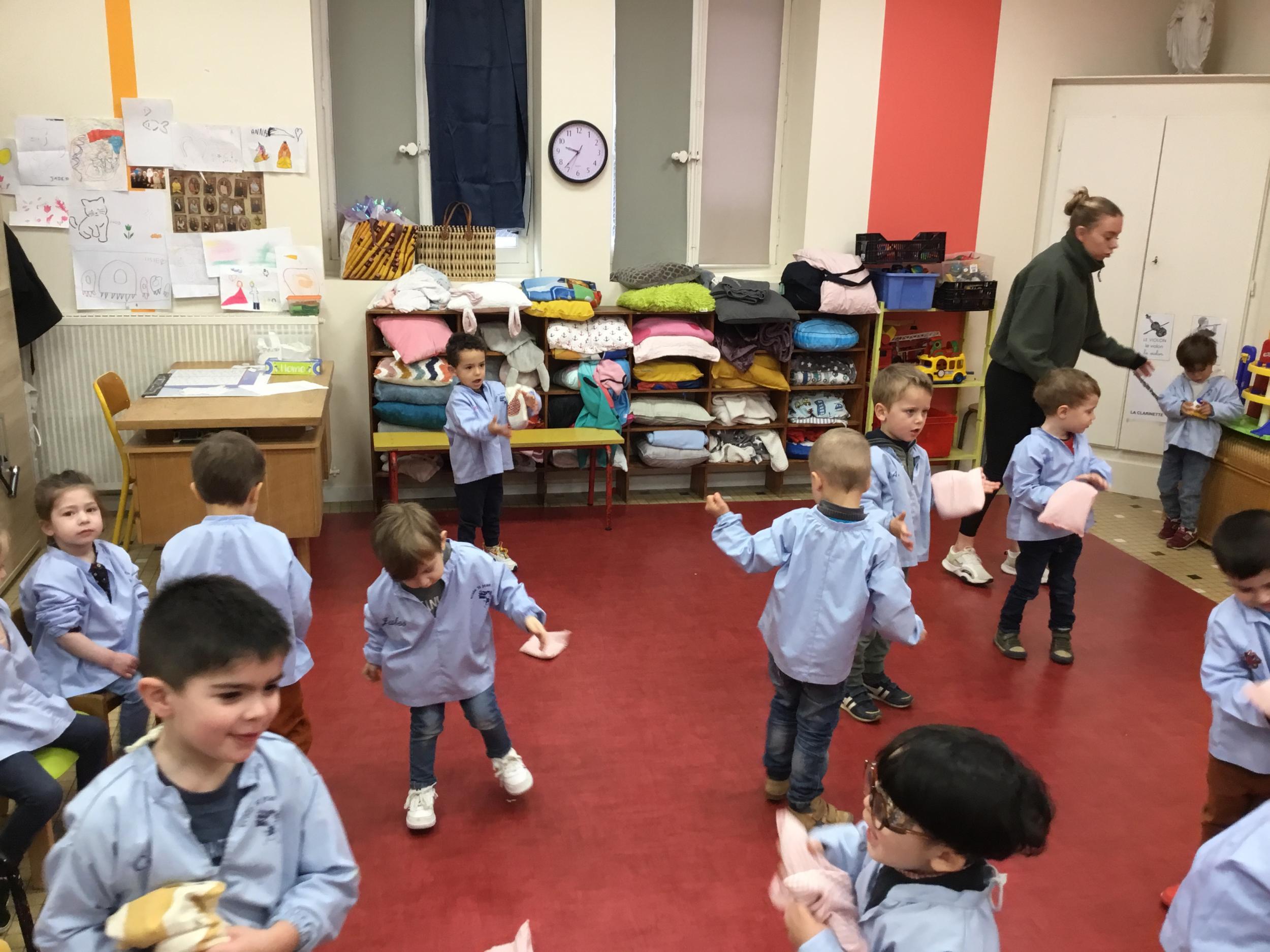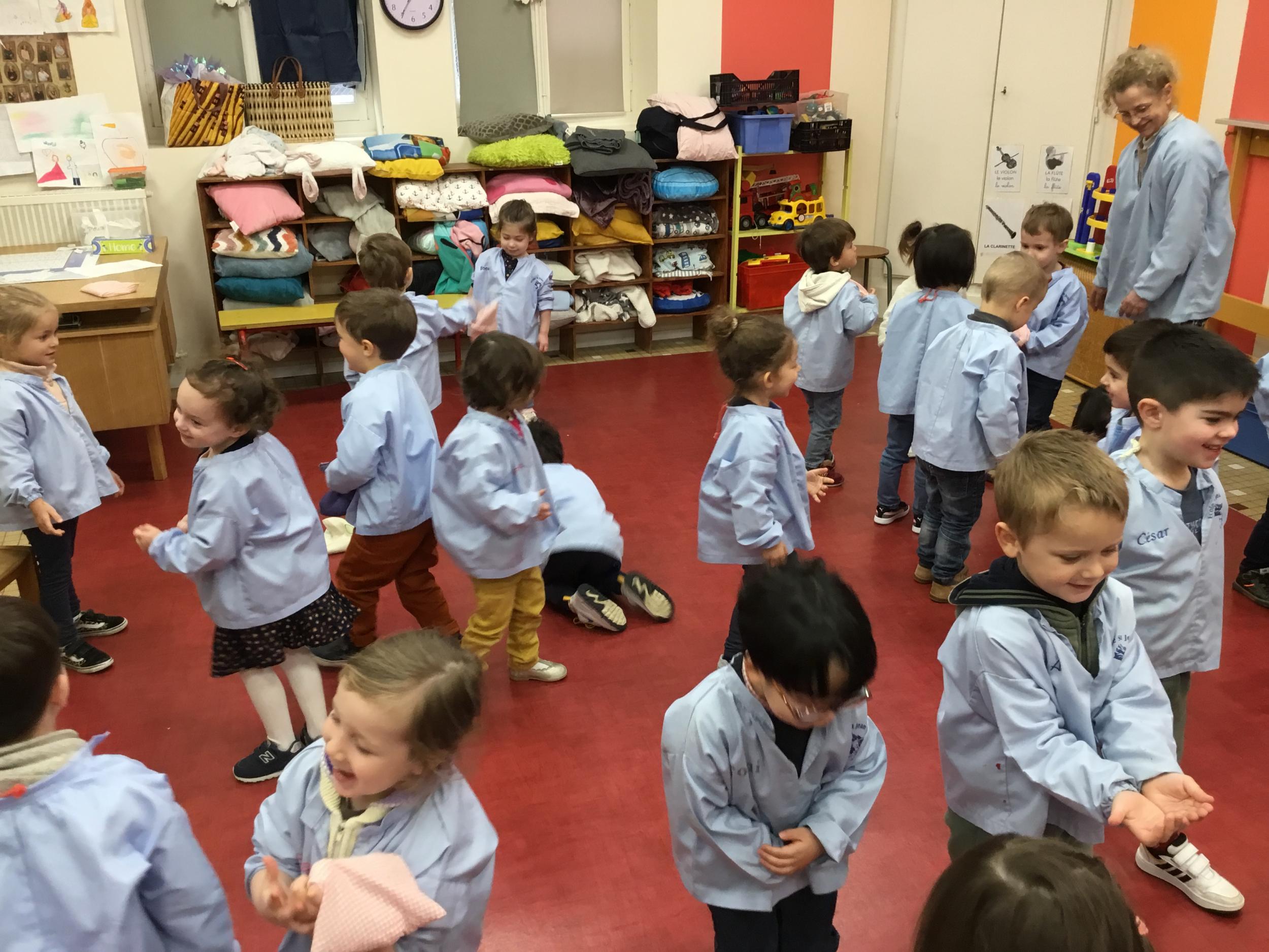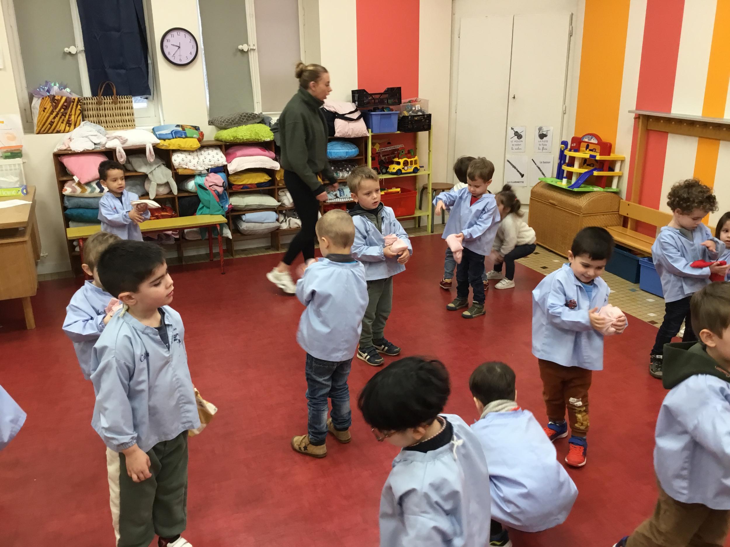 Nous avons appris à lancer et pour plus de facilité la maîtresse nous a donné un petit sac remplie de graines. Nous nous sommes entraînés à lancer d’une main dans l’autre, à lancer en l’air, à lancer loin. Puis nous avons tenté de jouer à un jeu collectif mais c’est encore difficile de respecter les règles….