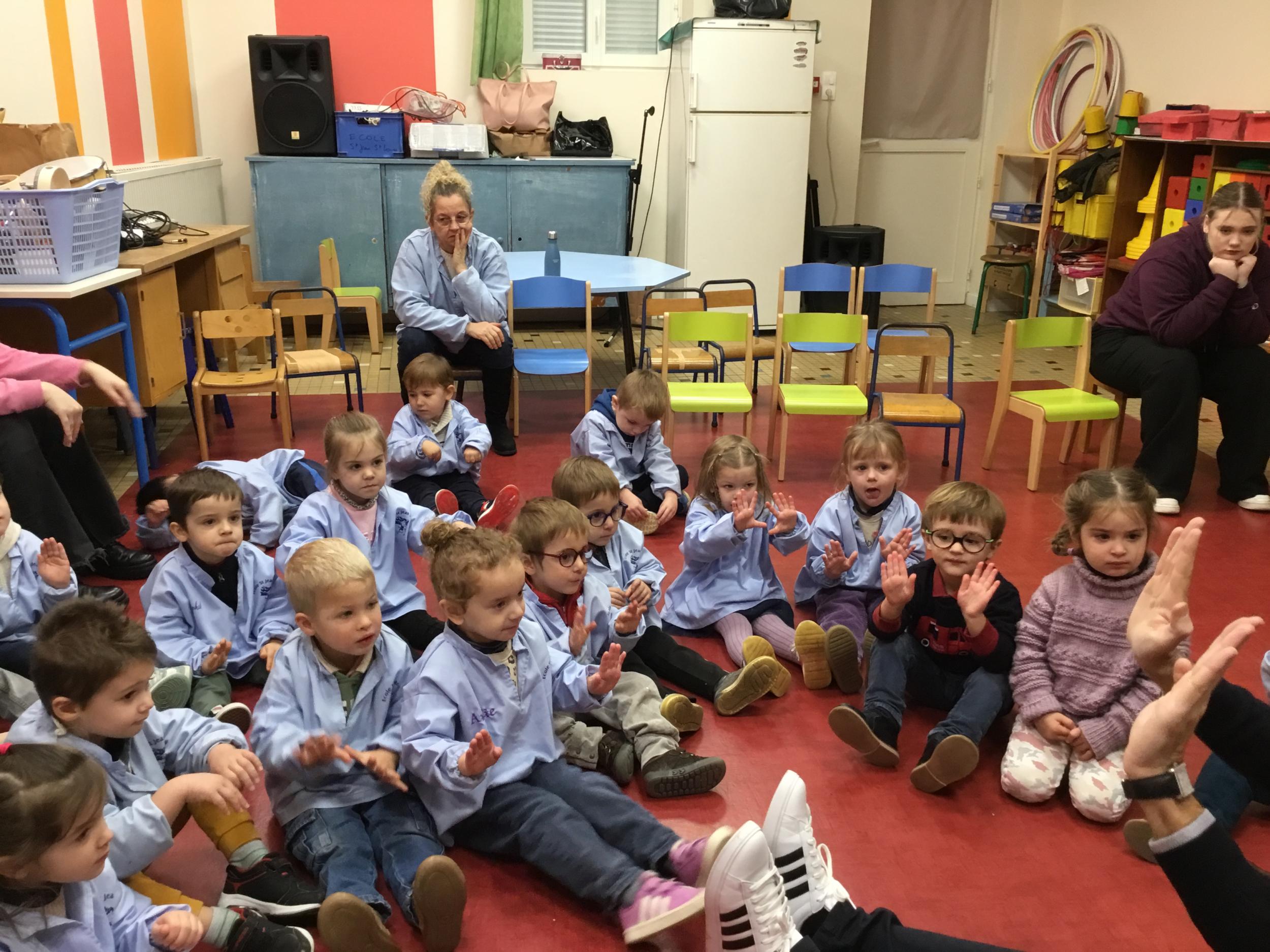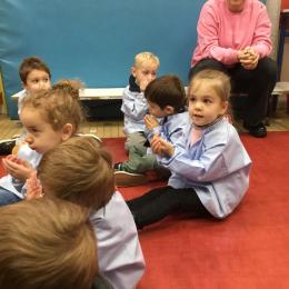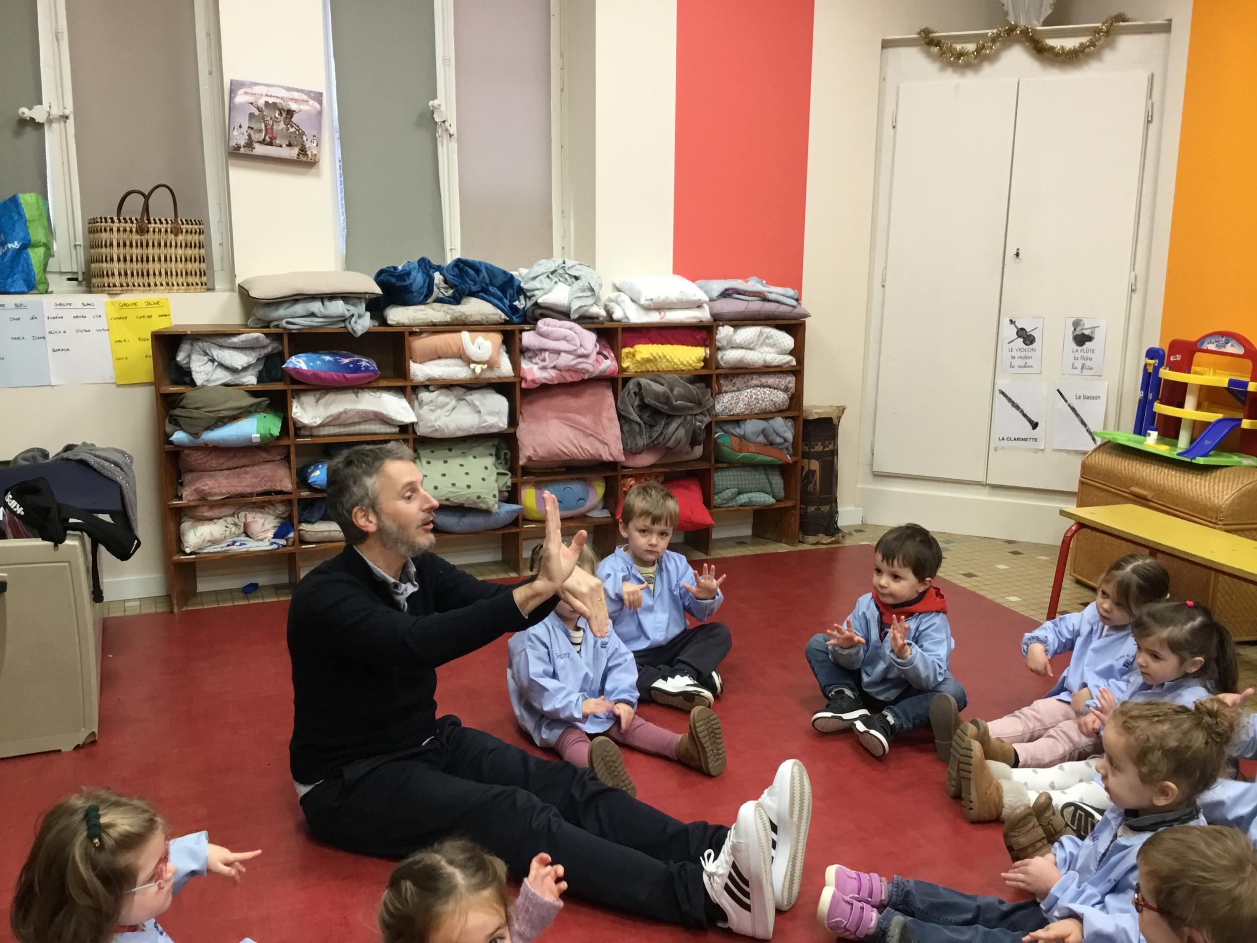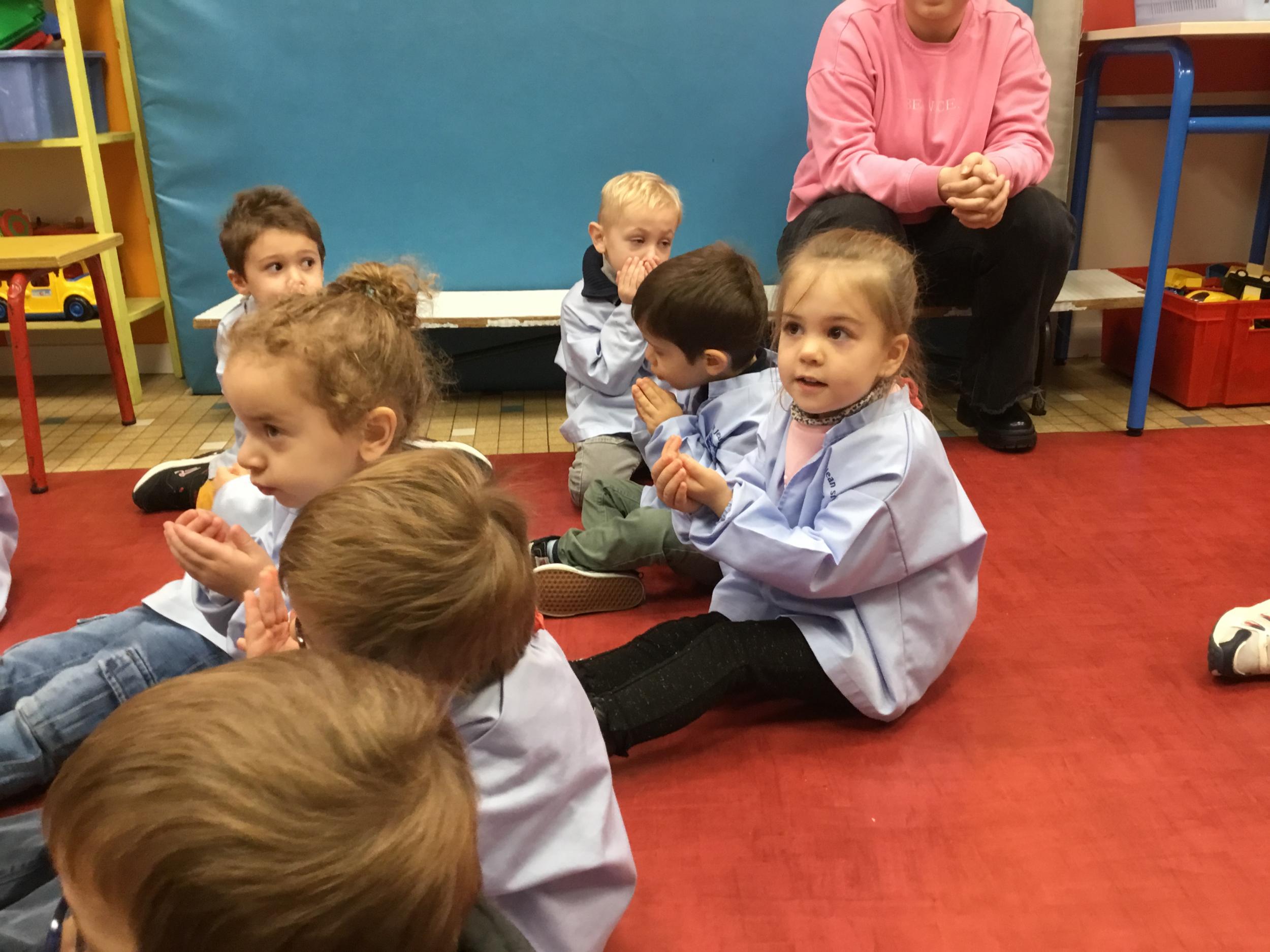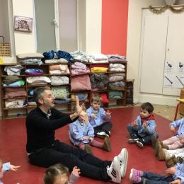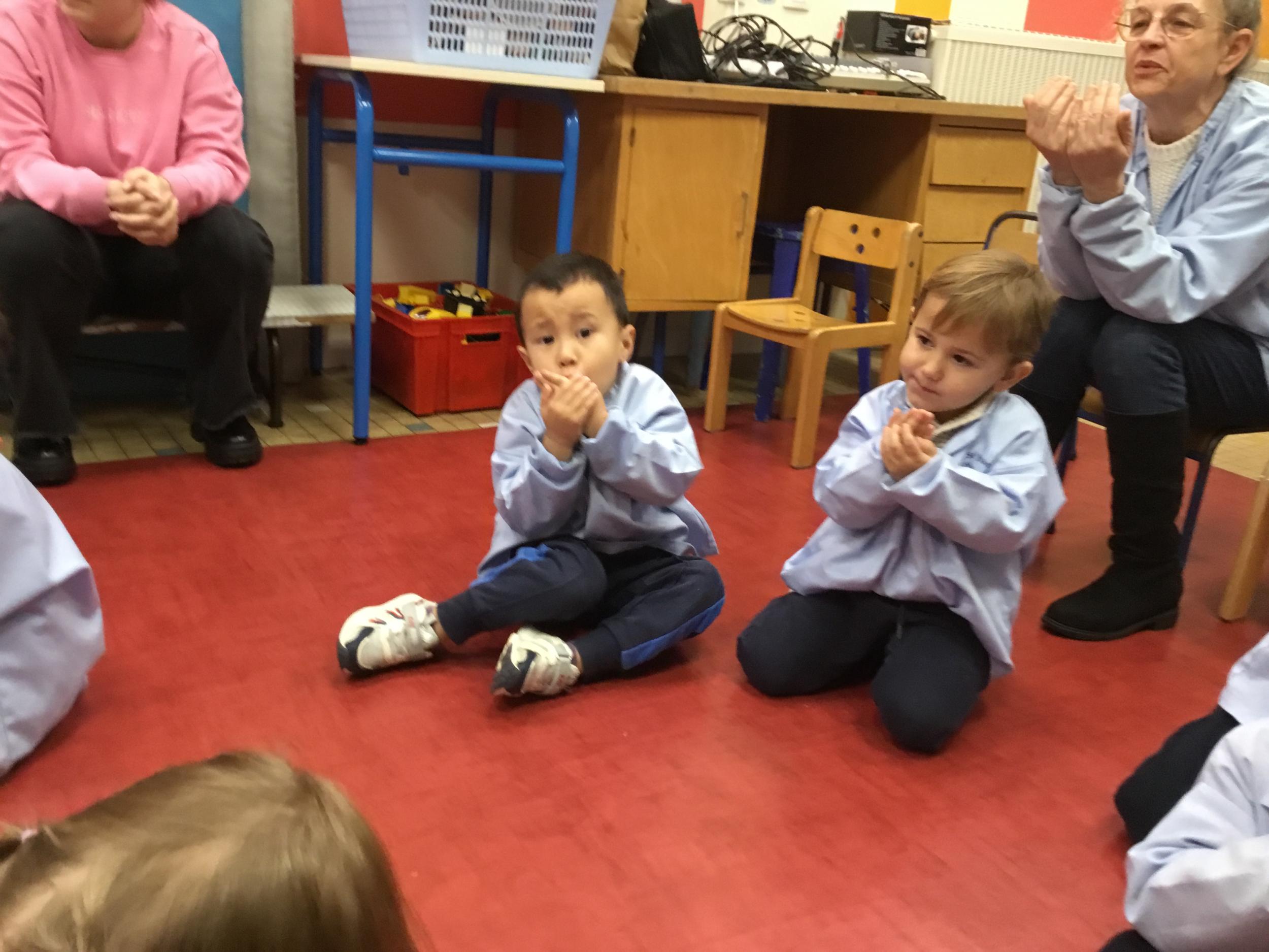 Aujourd’hui Aymeric est venu dans notre classe pour nous apprendre à nous poser, nous concentrer. Il nous a montré comment fait le canard avec ses pattes, un exercice de coordination pas facile quand on a 3 ans !!!! Et cela demande beaucoup de concentration … Voyant que c’était encore un peu difficile , nous avons tenté le même exercice avec les mains … encore un peu dur … alors on a simplifié encore … les mains en haut , puis les deux en bas … 🙏