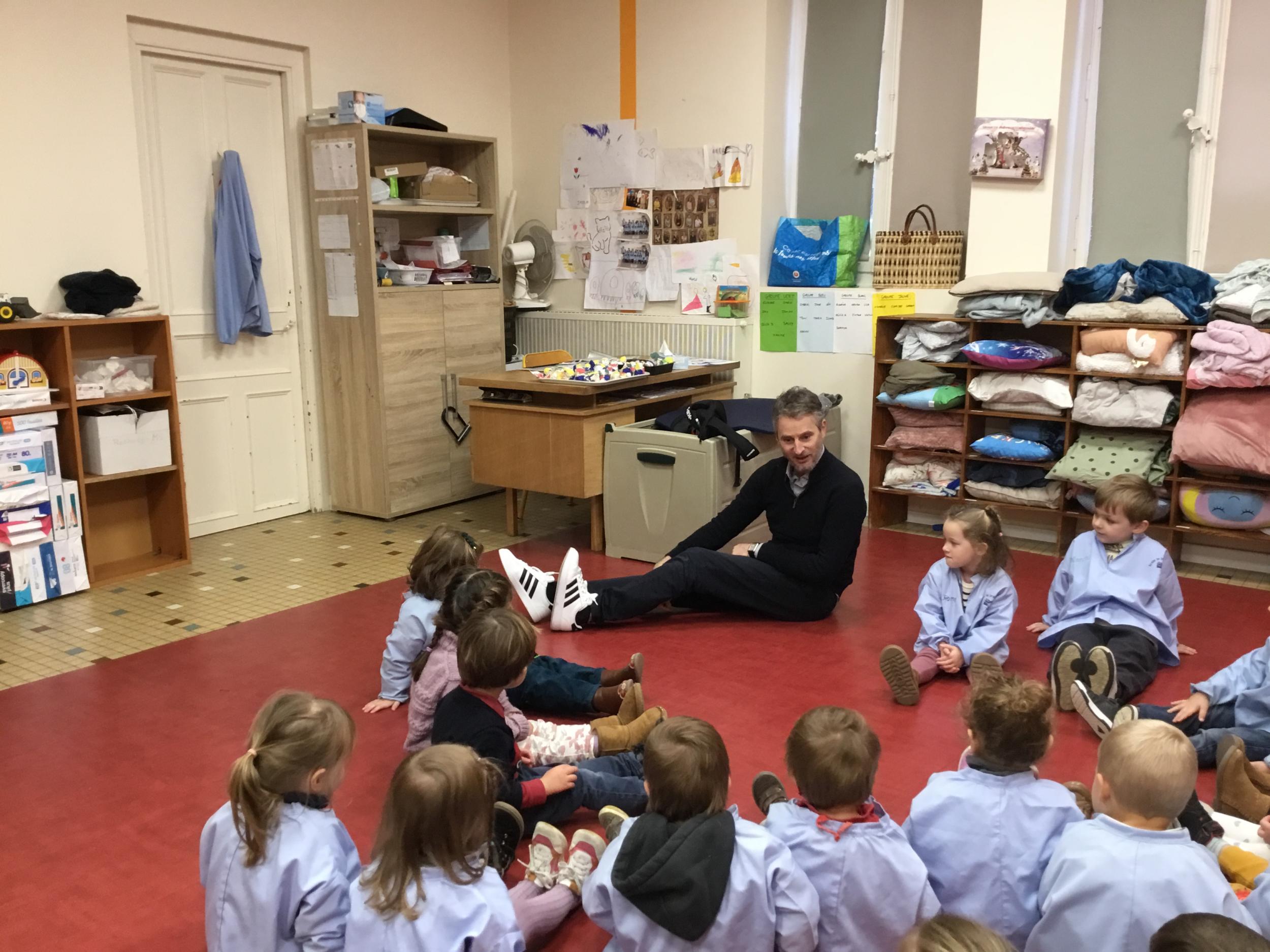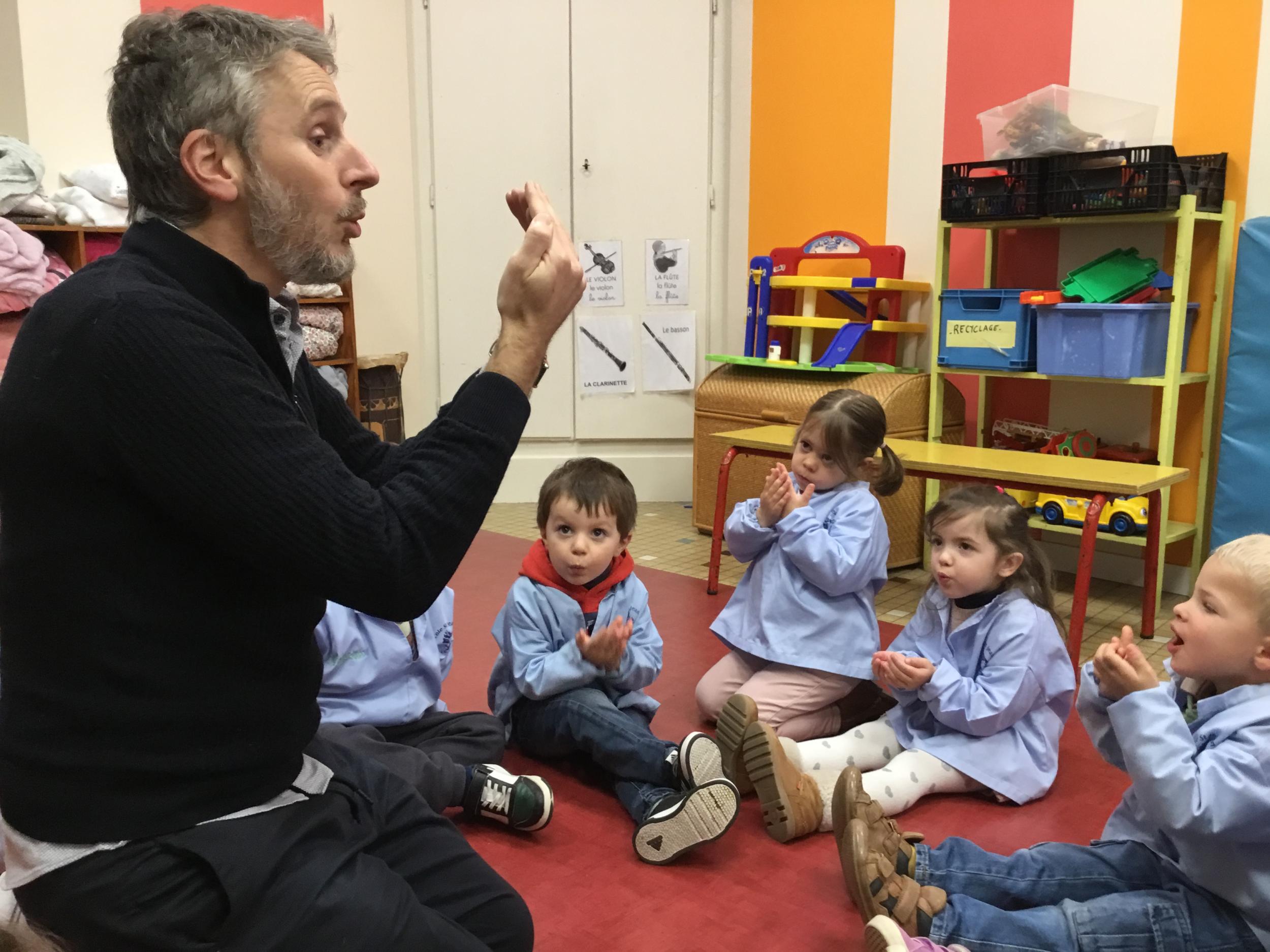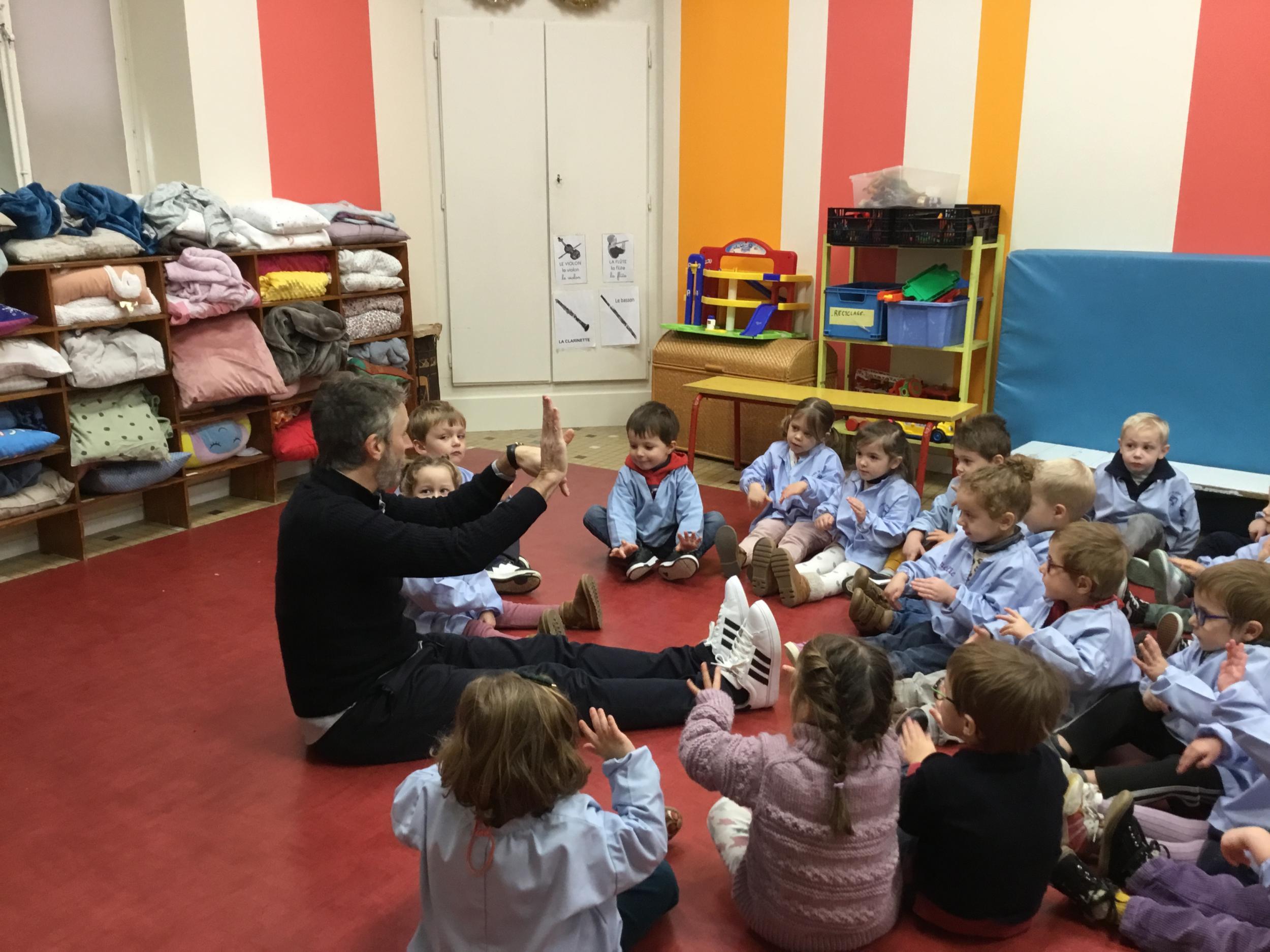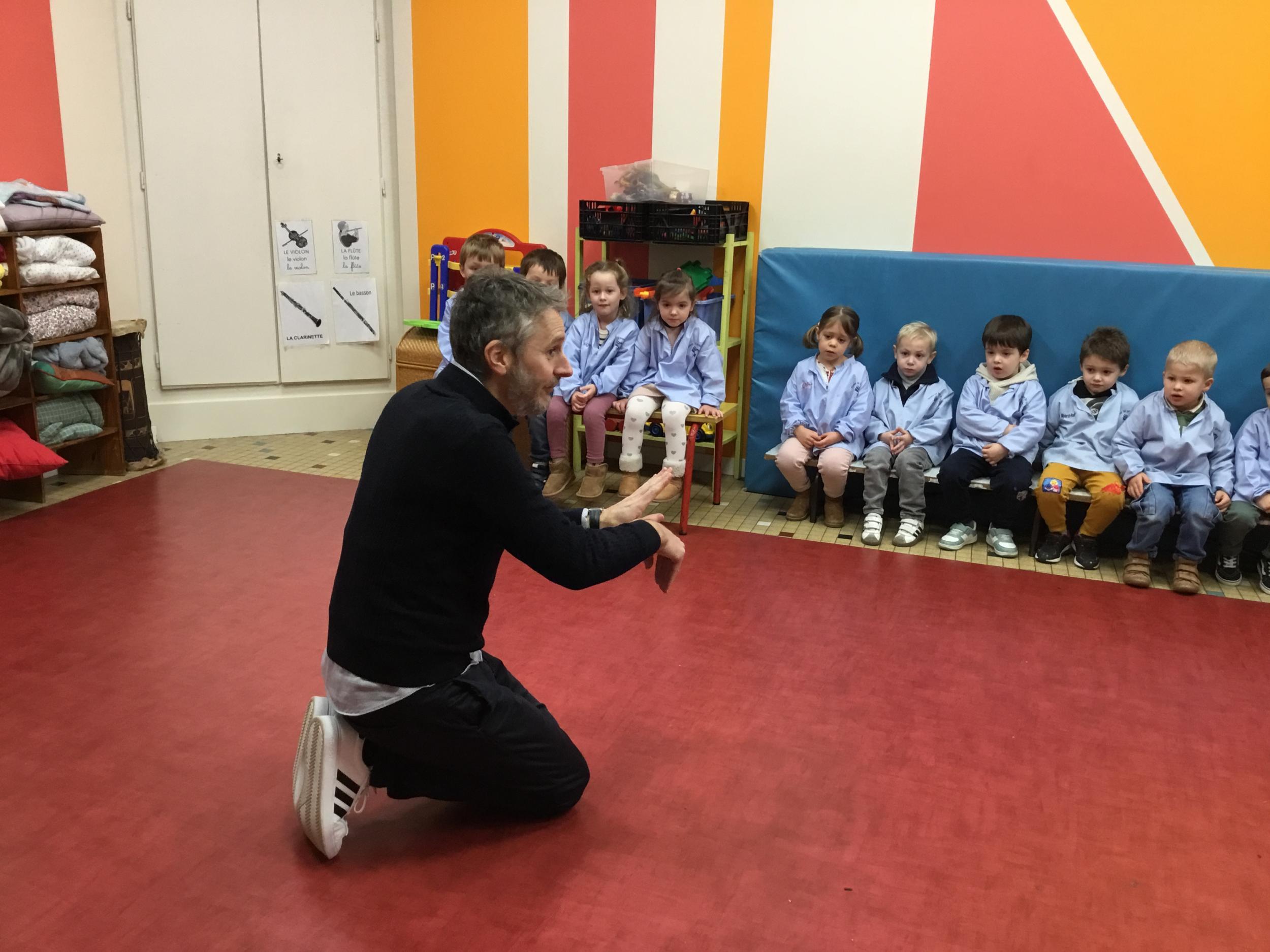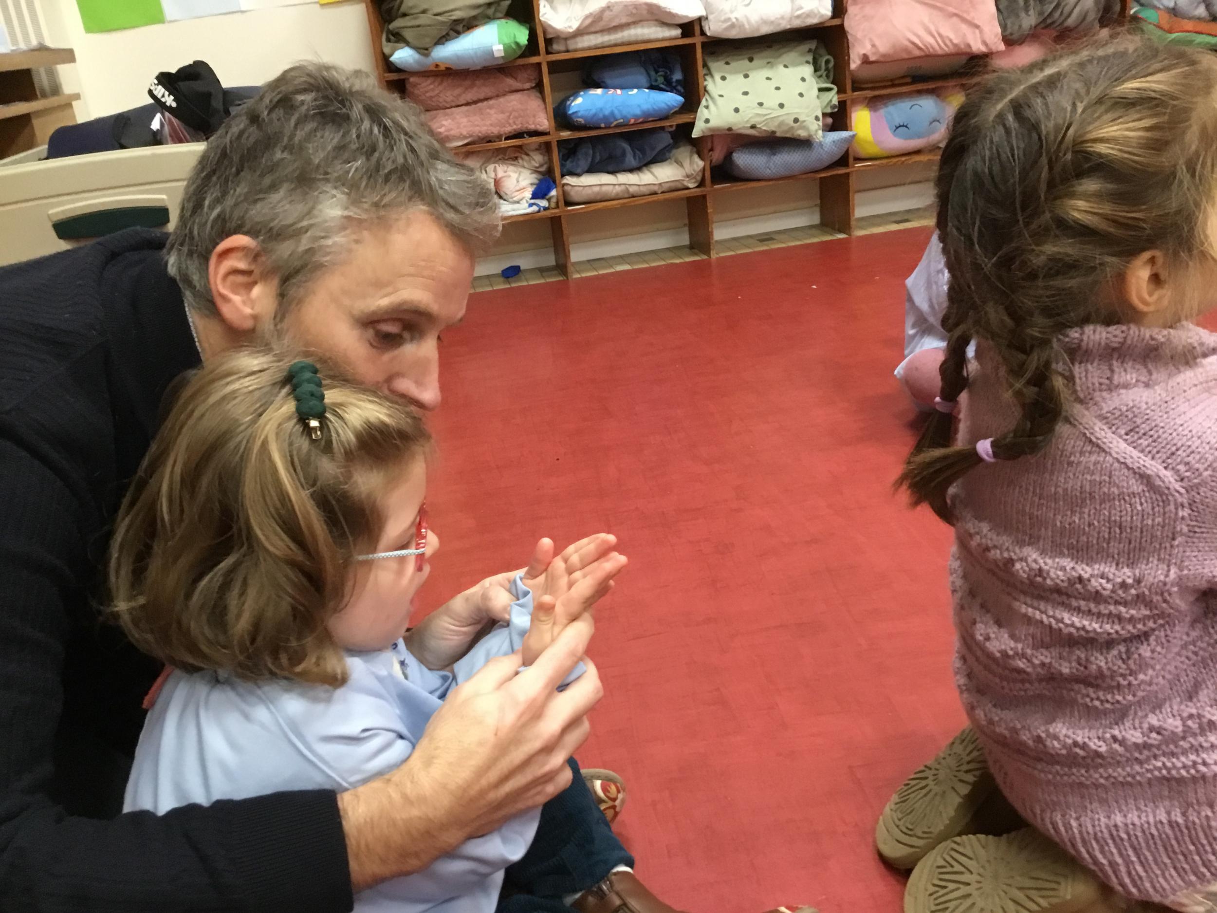 Aujourd’hui Aymeric est venu dans notre classe pour nous apprendre à nous poser, nous concentrer. Il nous a montré comment fait le canard avec ses pattes, un exercice de coordination pas facile quand on a 3 ans !!!! Et cela demande beaucoup de concentration … Voyant que c’était encore un peu difficile , nous avons tenté le même exercice avec les mains … encore un peu dur … alors on a simplifié encore … les mains en haut , puis les deux en bas … 🙏
