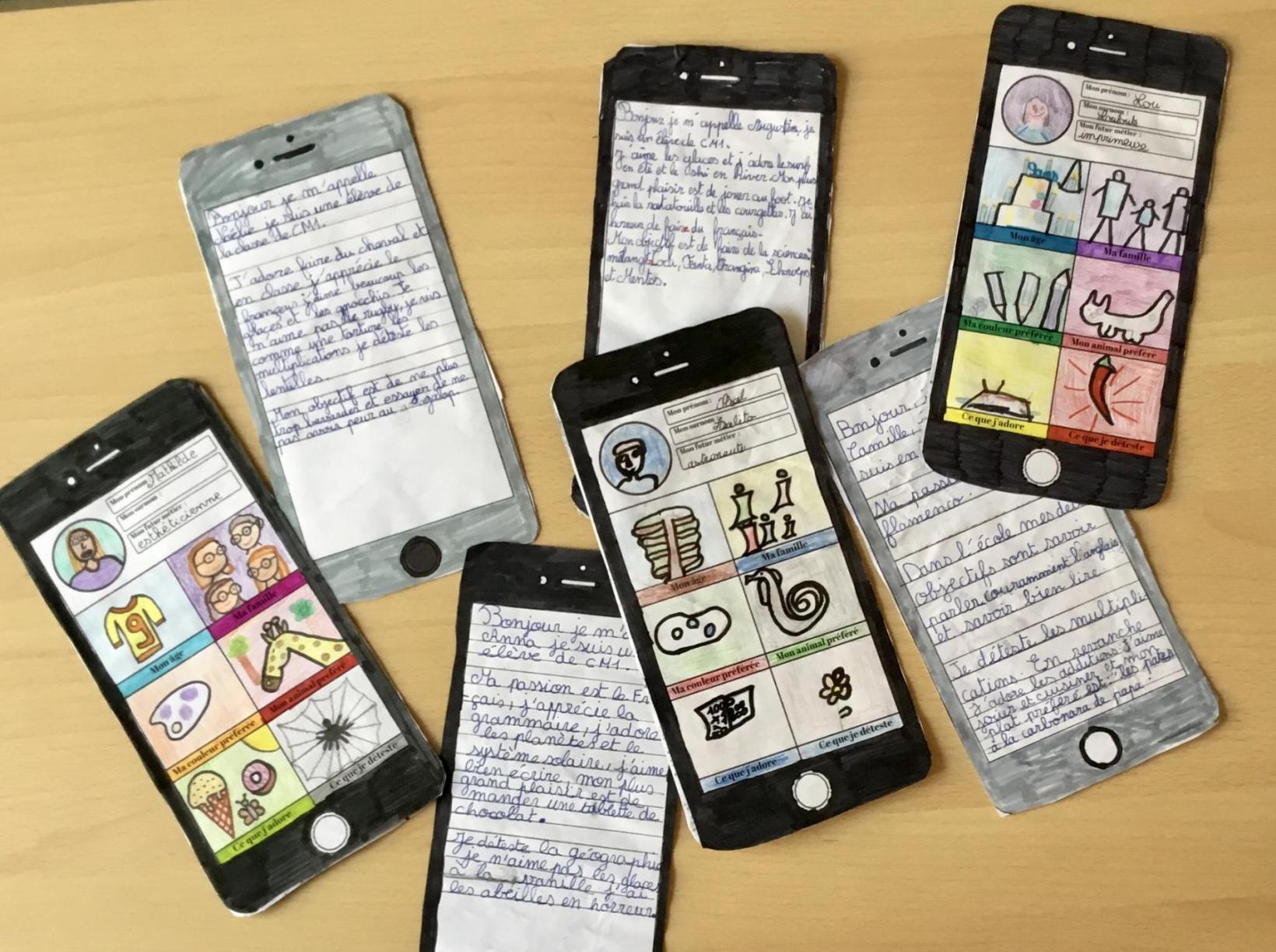 En début d’année, on a travaillé sur des smartphones en papier pour que la maîtresse nous connaisse mieux. On a pu se présenter en dessinant et en écrivant notre âge, nos activités, notre famille, nos goûts à l’école et à la maison. On a expliqué ce que l’on voudrait faire plus tard comme métier.