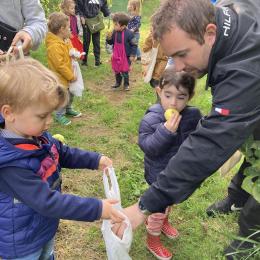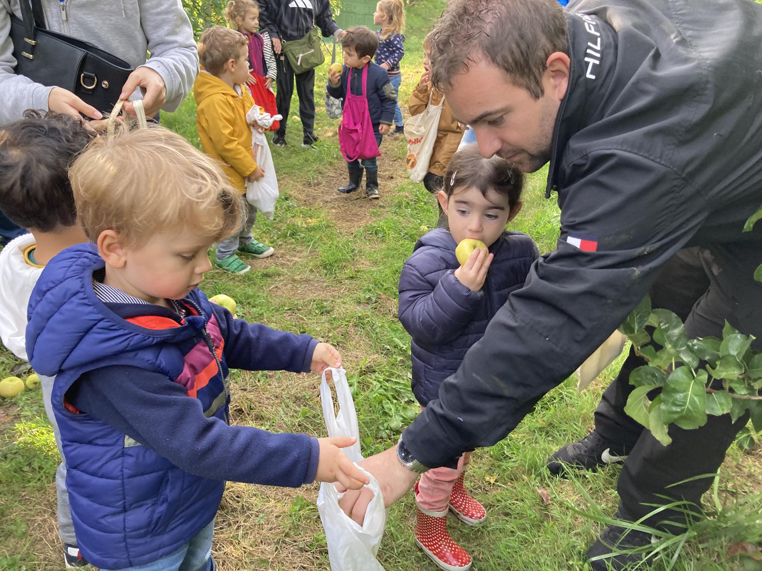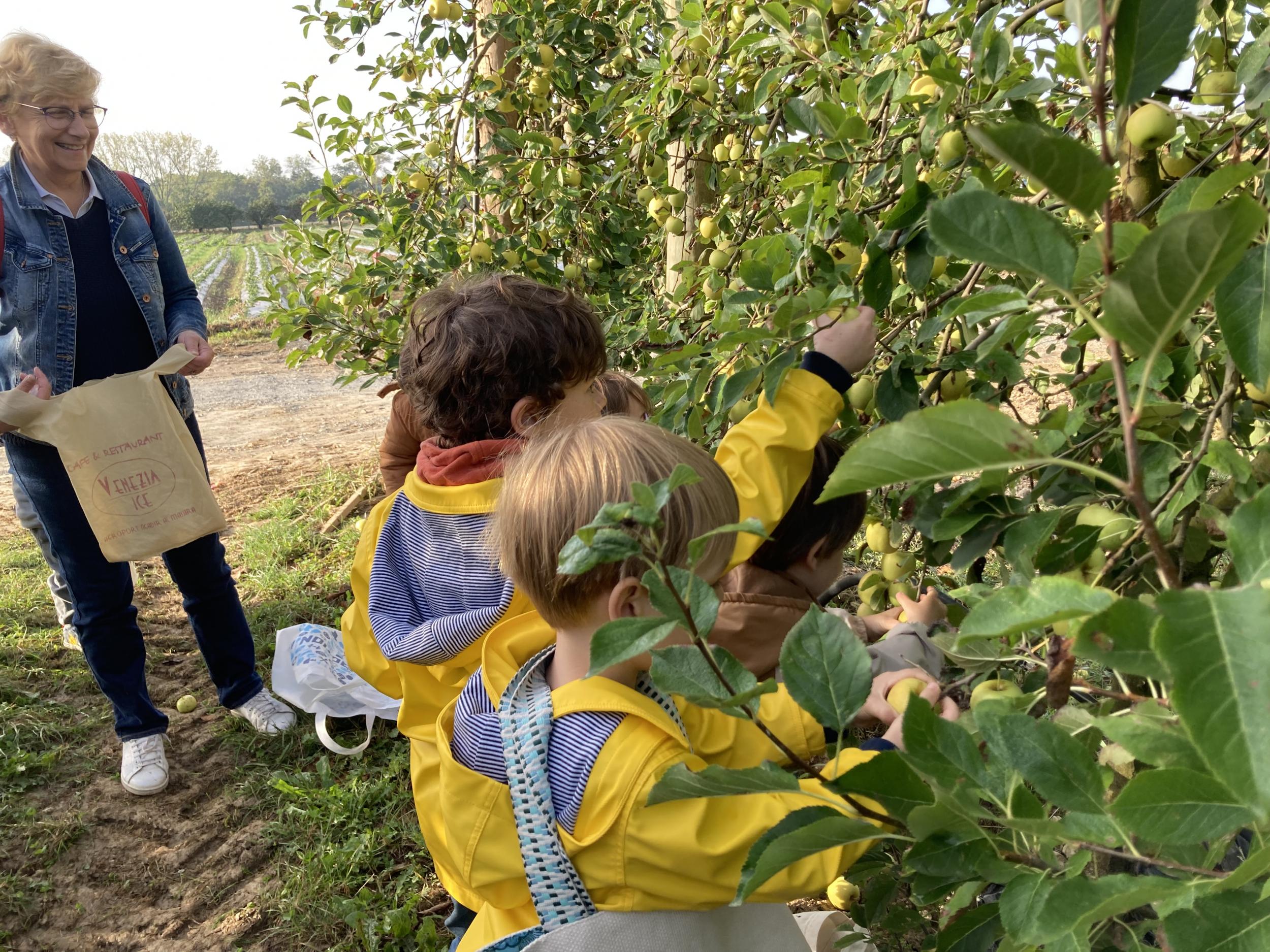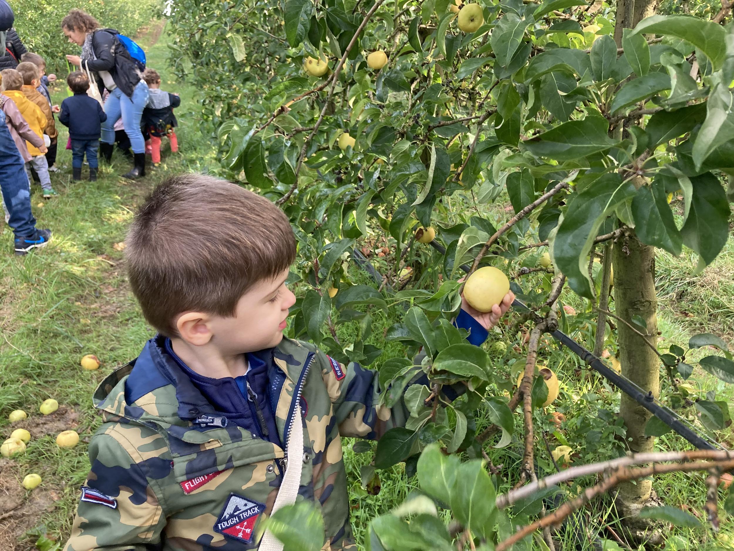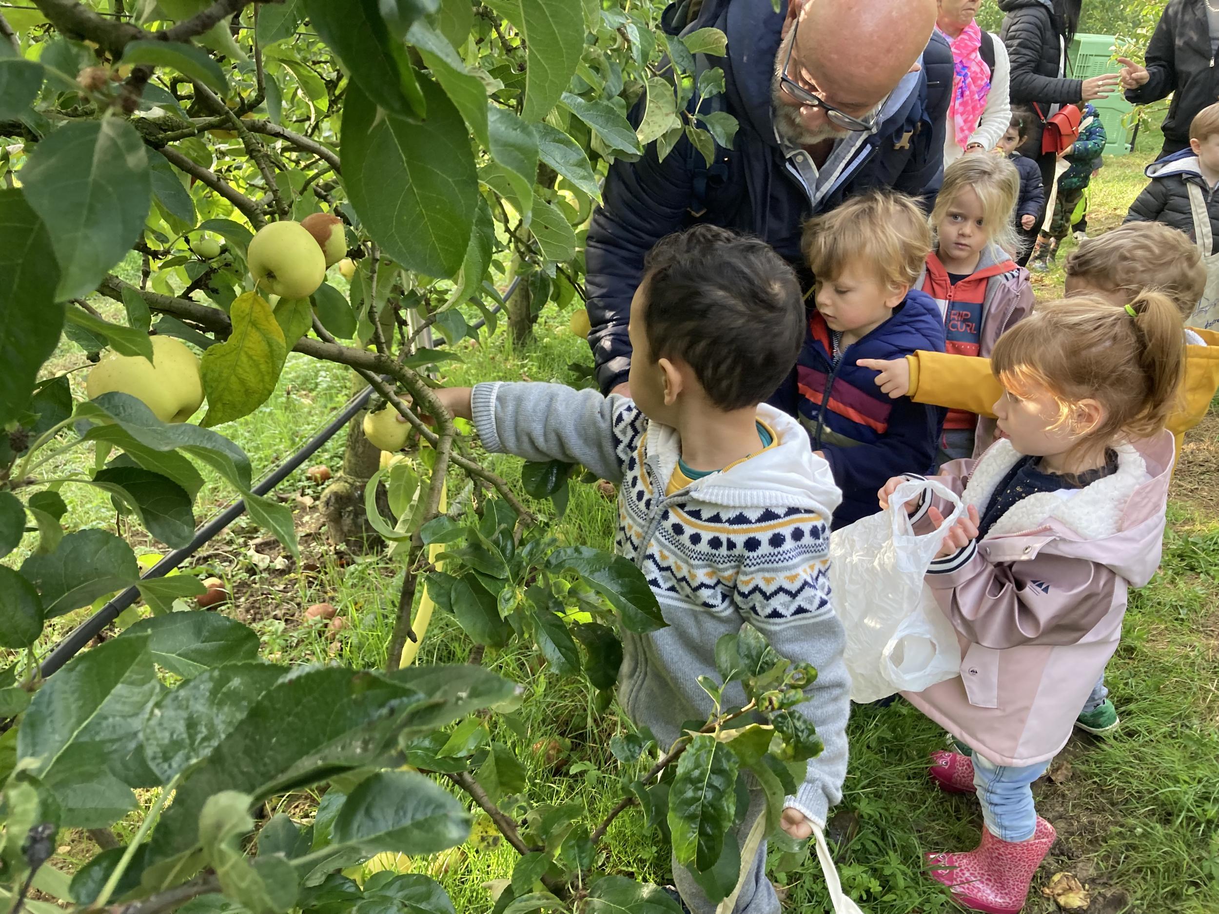 Les PS, MS et GS ont pris le bus pour se rendre au verger de Montdragon . Nous avons fait une belle cueillette. Mais avant cela, avec les PS nous avions lu l’affiche …les élèves avaient fait des hypothèses à partir des photos et avaient donné du sens à cet écrit .Car lire : c’est faire des hypothèses de sens et le vérifier par le décodage .