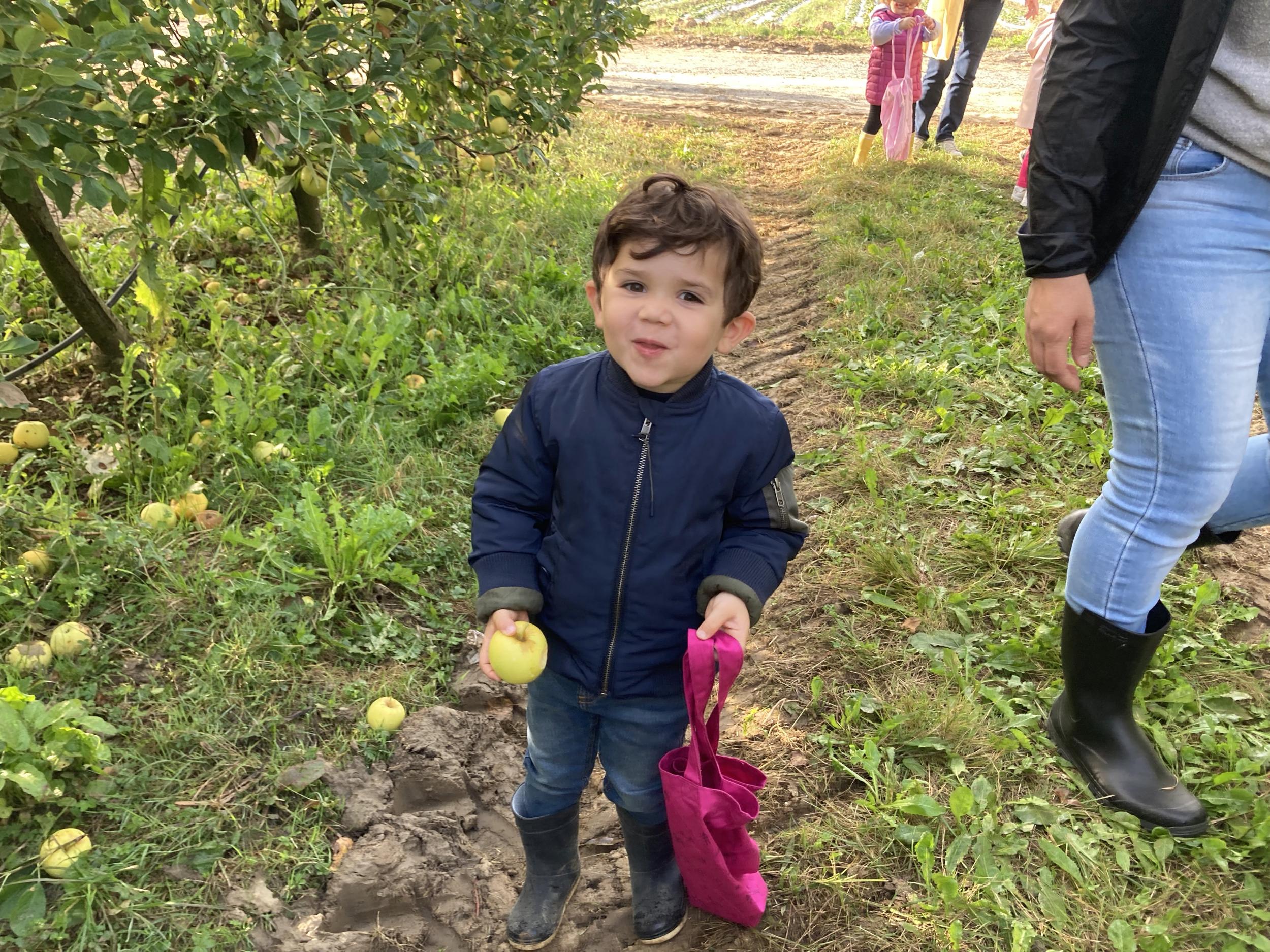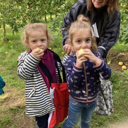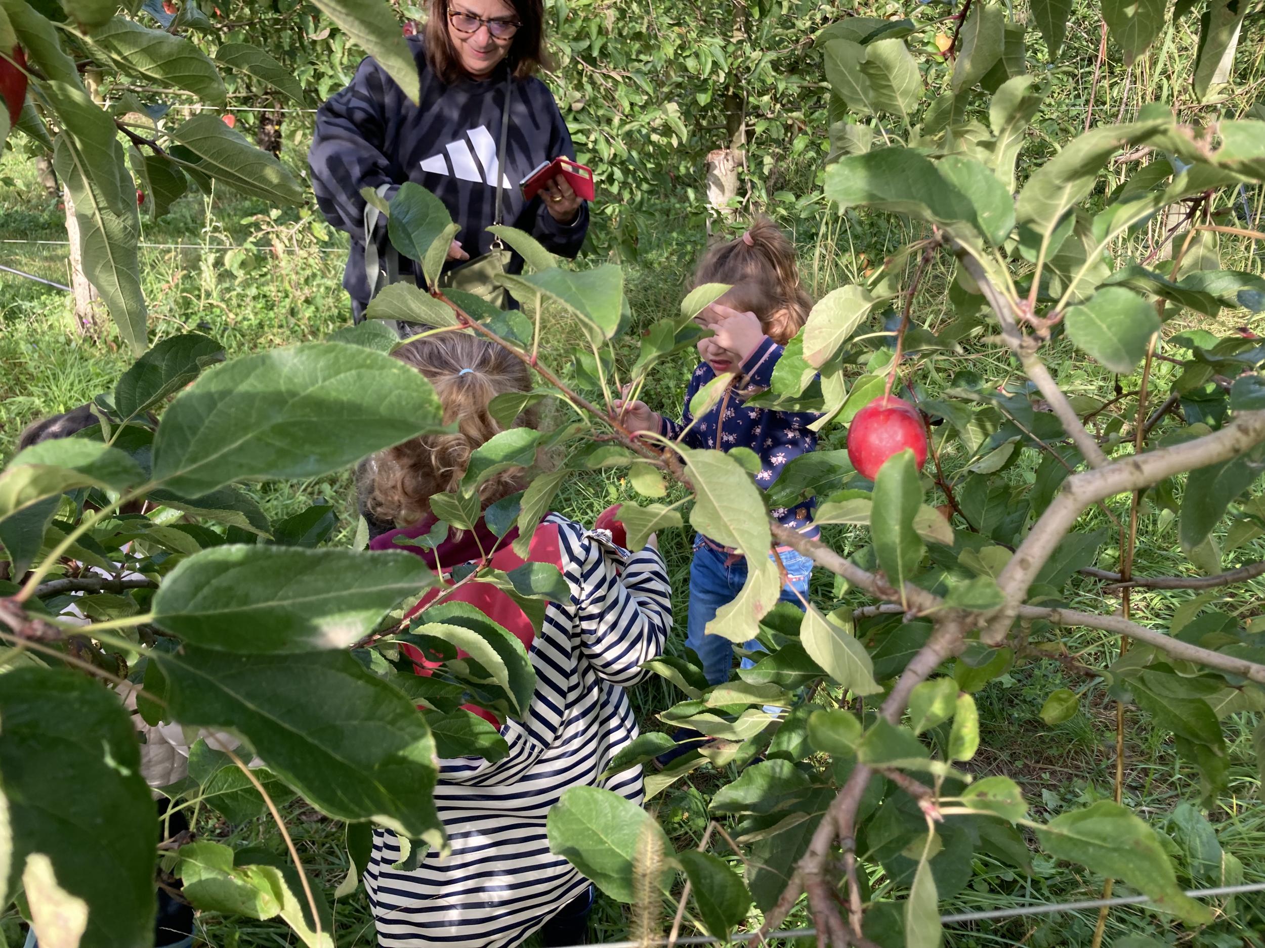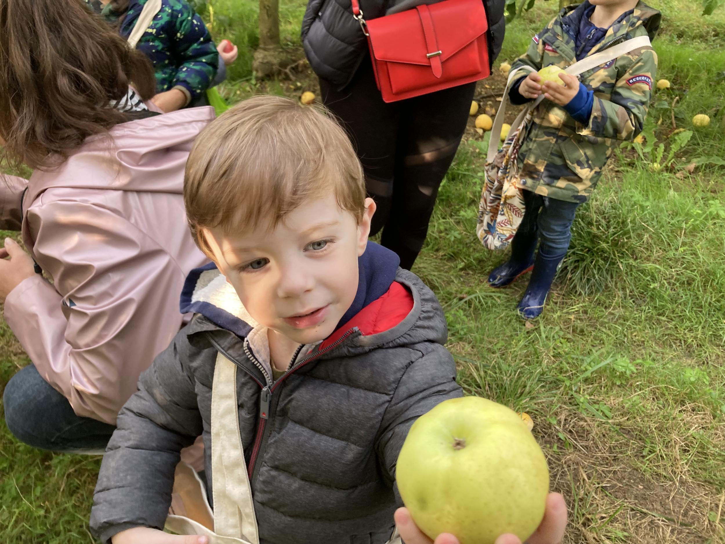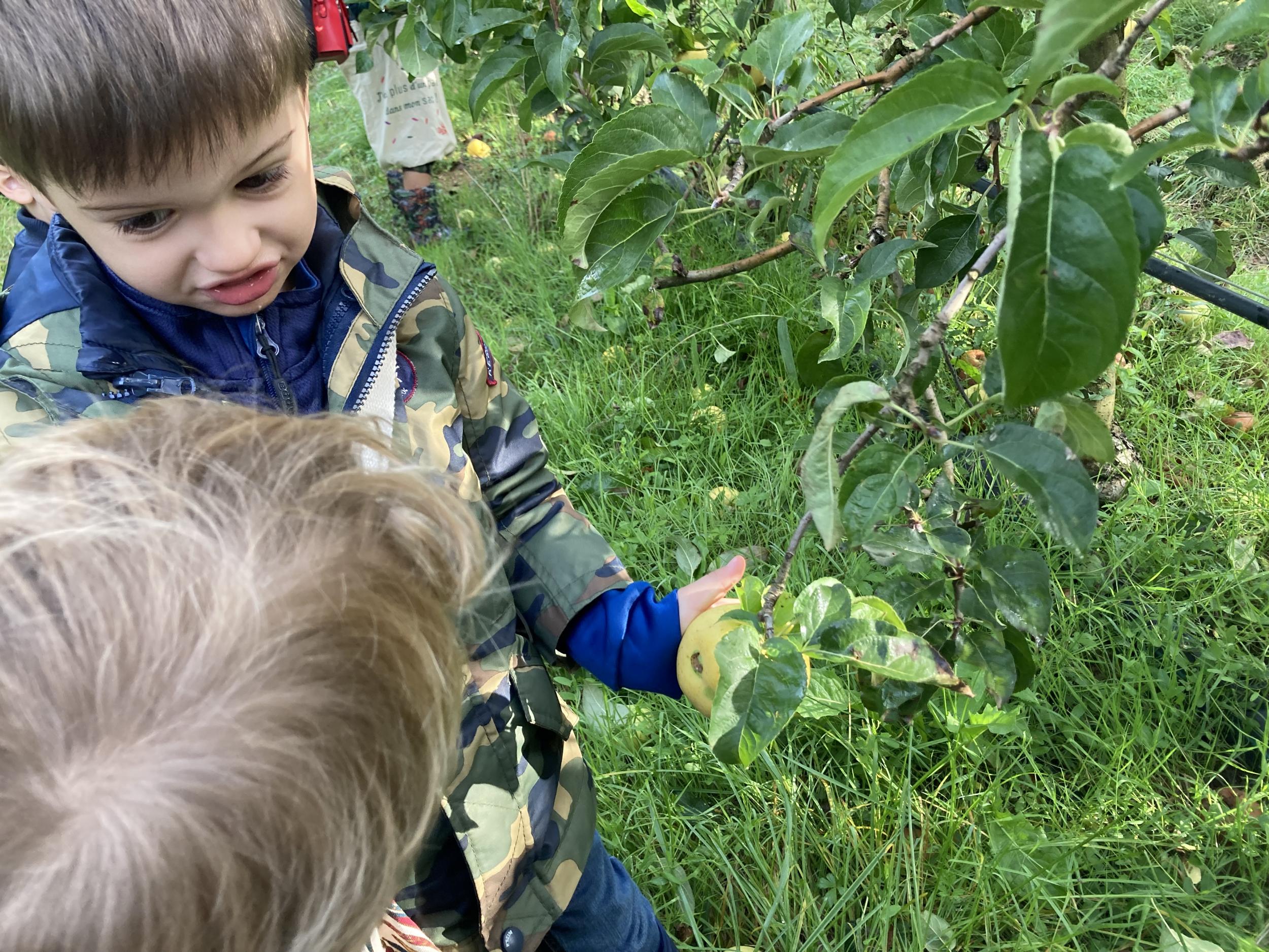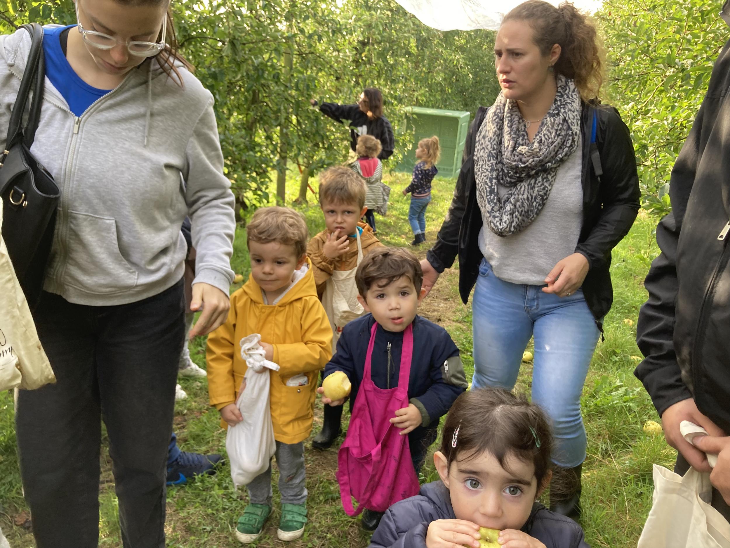 Les PS, MS et GS ont pris le bus pour se rendre au verger de Montdragon . Nous avons fait une belle cueillette. Mais avant cela, avec les PS nous avions lu l’affiche …les élèves avaient fait des hypothèses à partir des photos et avaient donné du sens à cet écrit .Car lire : c’est faire des hypothèses de sens et le vérifier par le décodage .