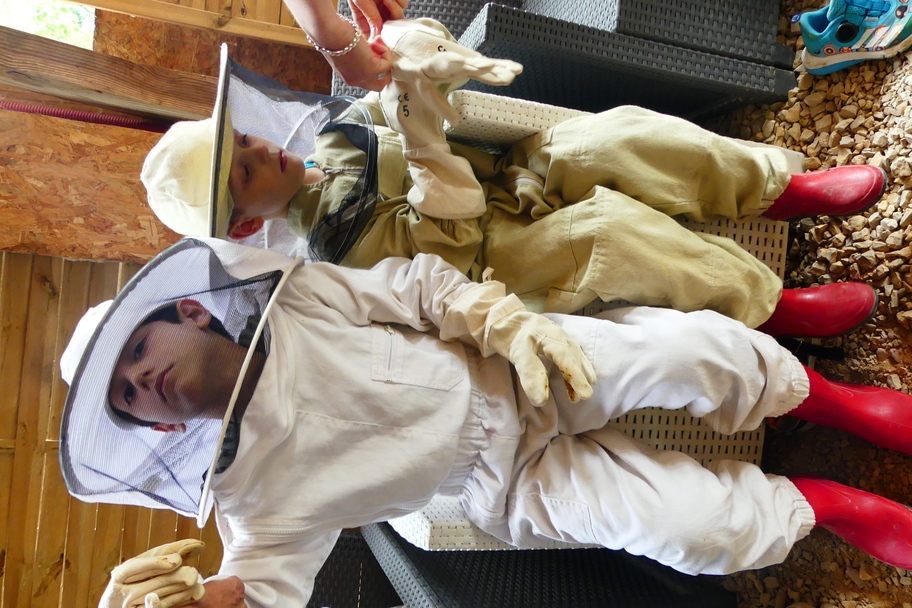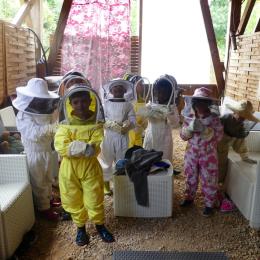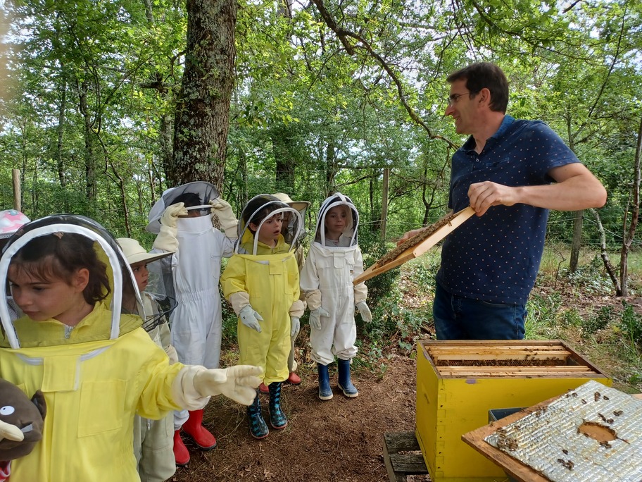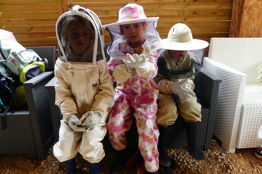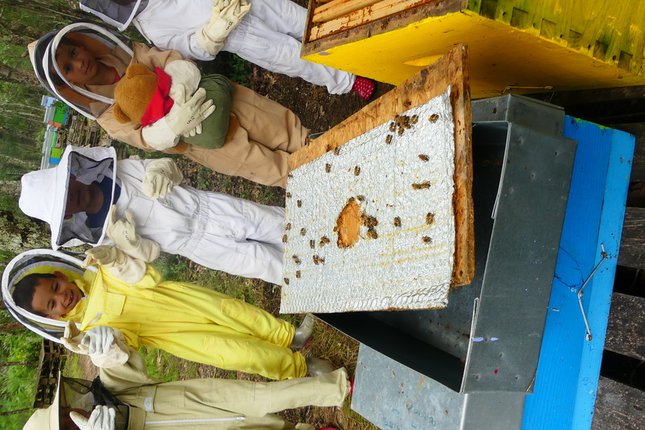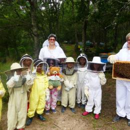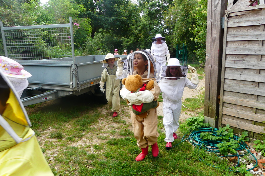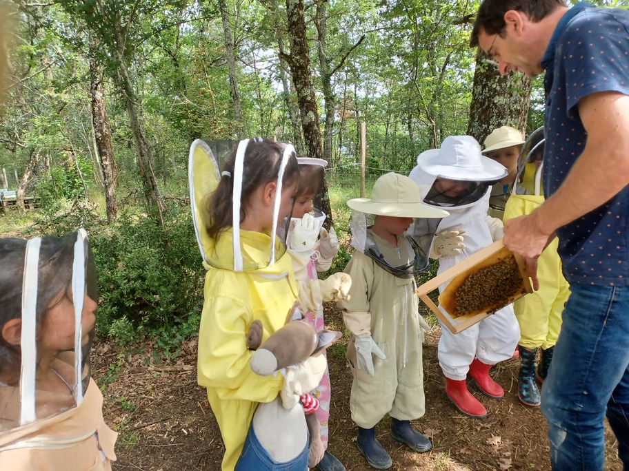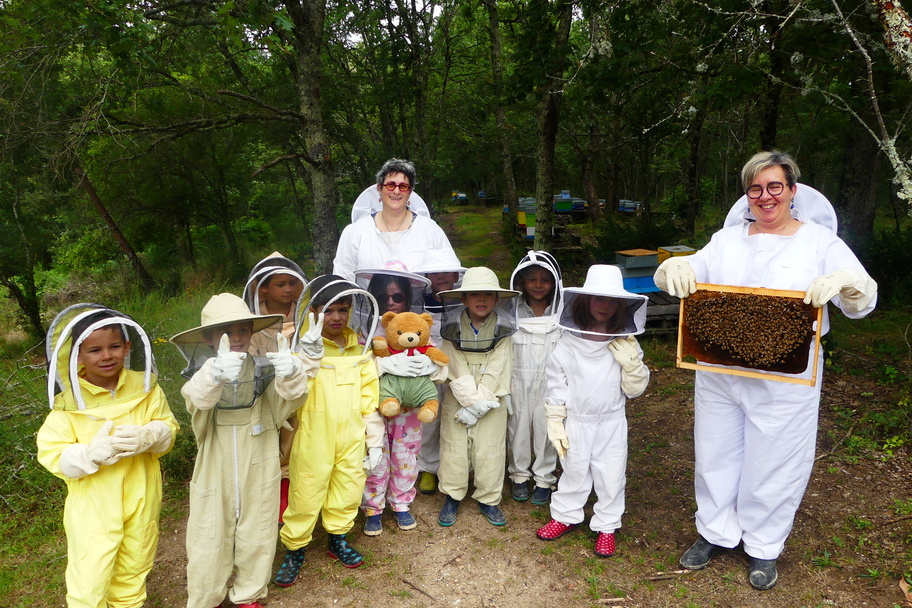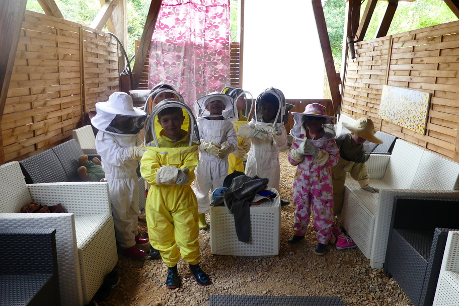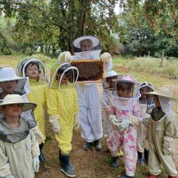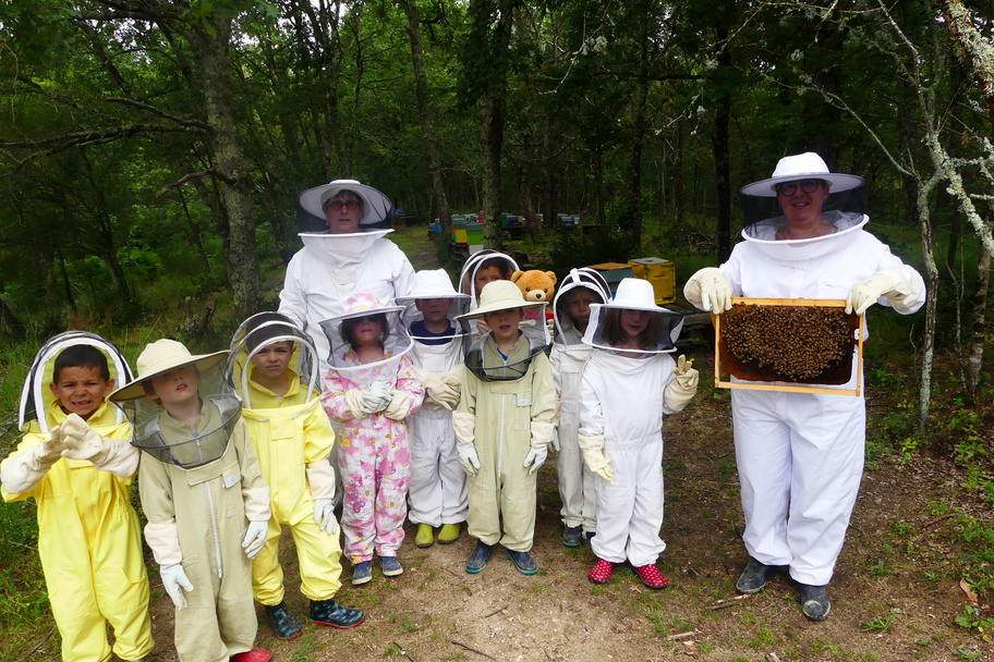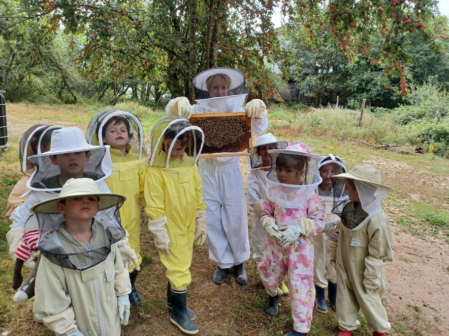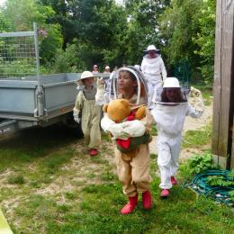 Mardi 4 juillet, les élèves de Grande section ont terminé l'année par une sortie au rucher, clôturant ainsi le projet sur les insectes de cette dernière période. Au programme, s'habiller comme un vrai apiculteur, ouverture et observation d'une ruche, dégustation de divers miels, voir dans un prisme comme une abeille, écoute de leur langage et fabrication d'un joli petit insecte à l'aide d'un caillou coloré. Puis visite du potager et herbes aromatiques, découverte de poules et canards particuliers, pique nique dans la forêt pour terminer cette incroyable journée par la découverte du parcours sensoriel dans les bois.