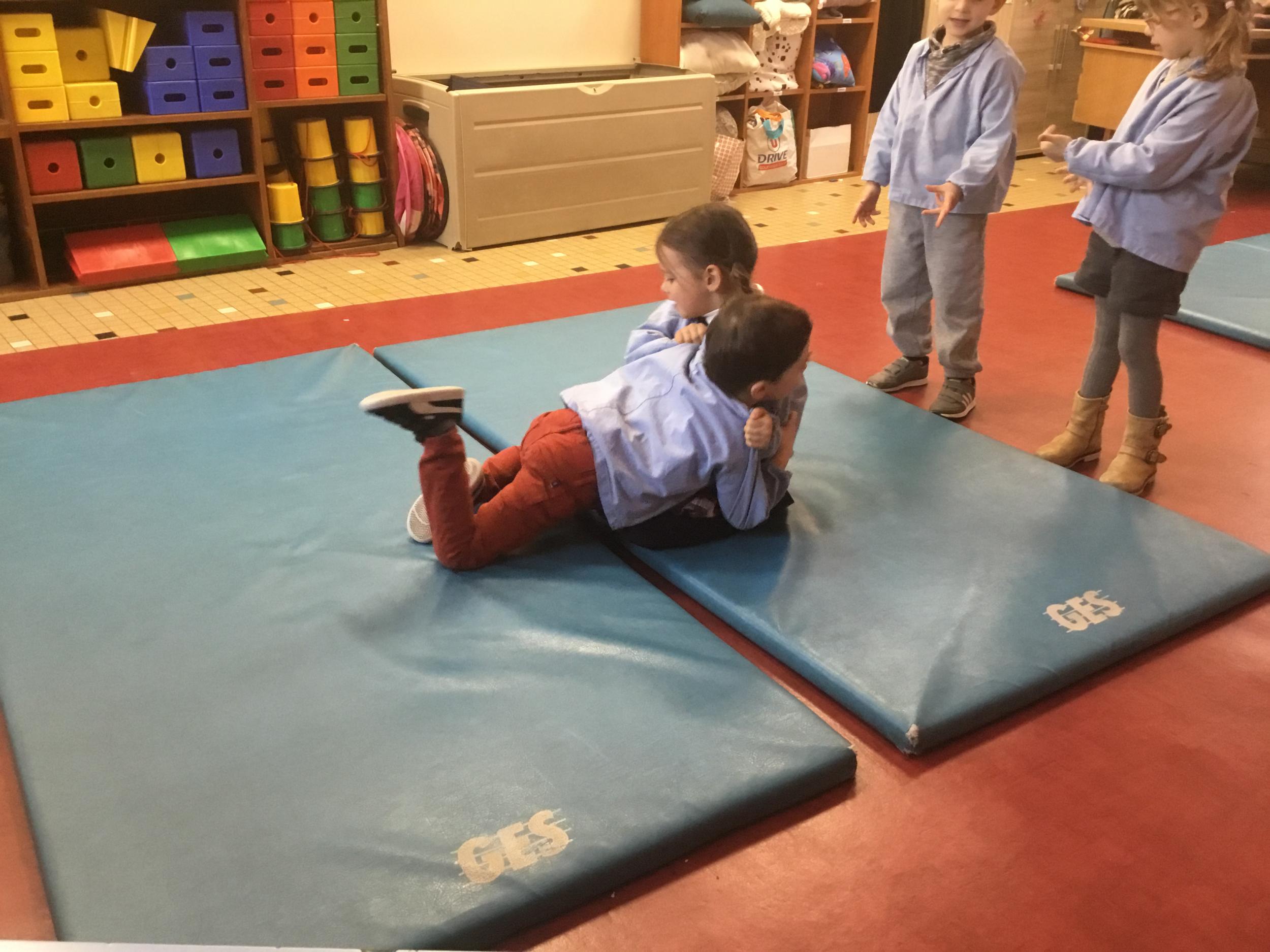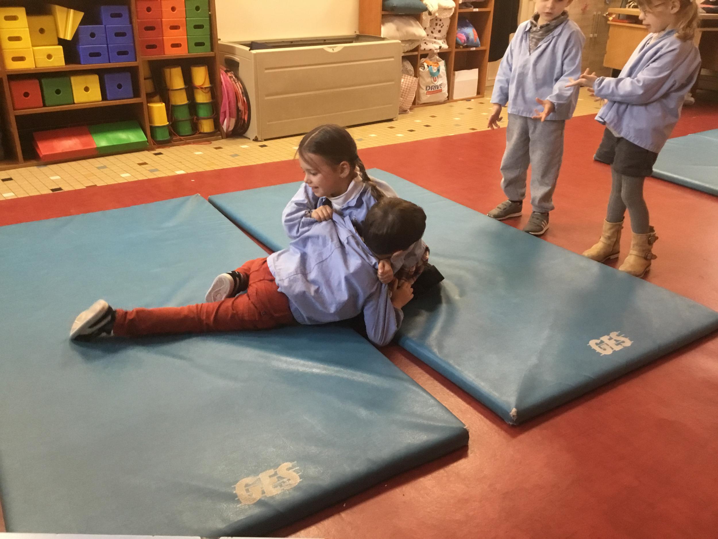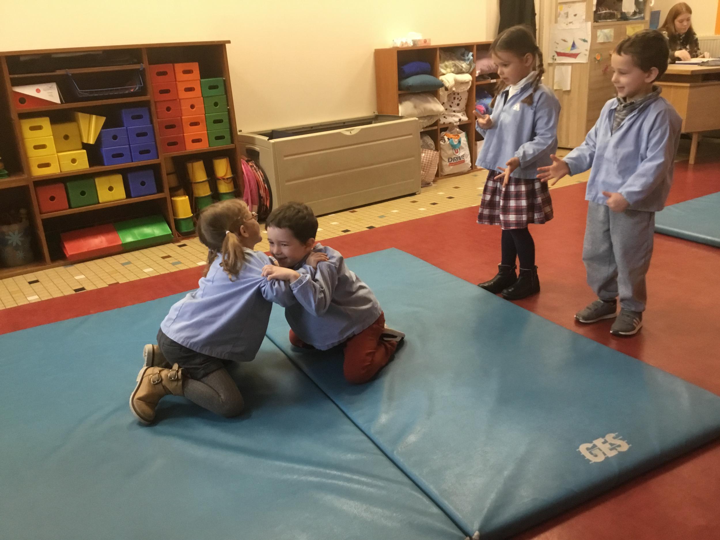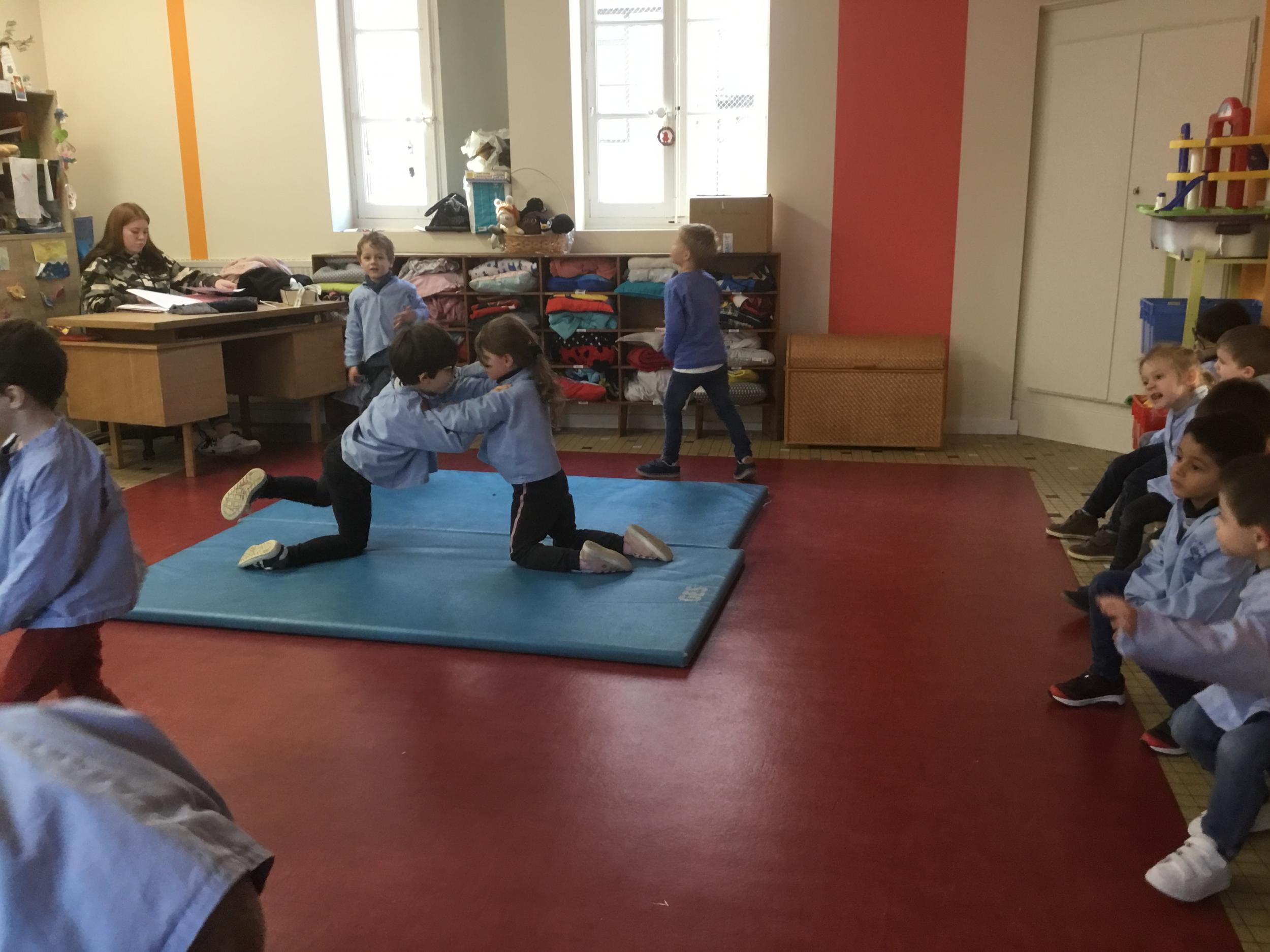 Les élèves apprennent à se responsabiliser , à respecter l’autre et les règles du jeu , à se distrubuer et à tenir leur rôle dans le groupe , à développer une stratégie d’attaque et de défense , à discuter avec les autres sur le choix du rôle de chacun lors des jeux d’opposition . Ils jouent à « la crêpe et au pâtissier », à « la grenouille et au jardinier » et au sumo.