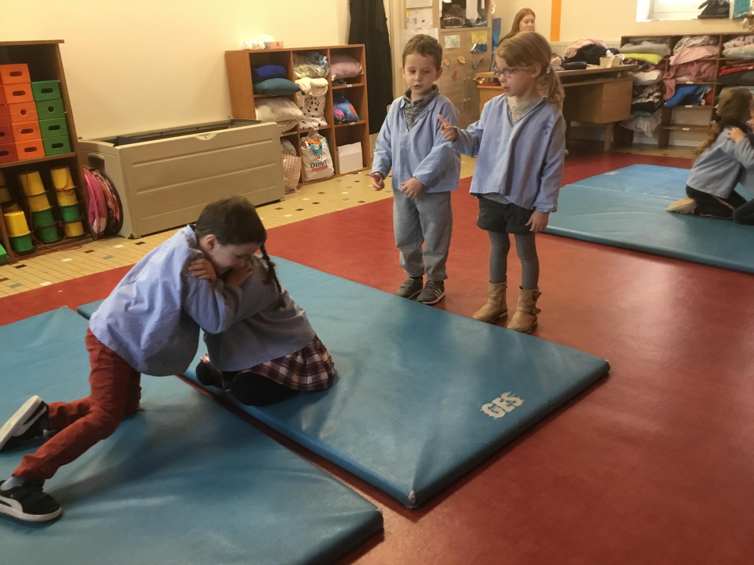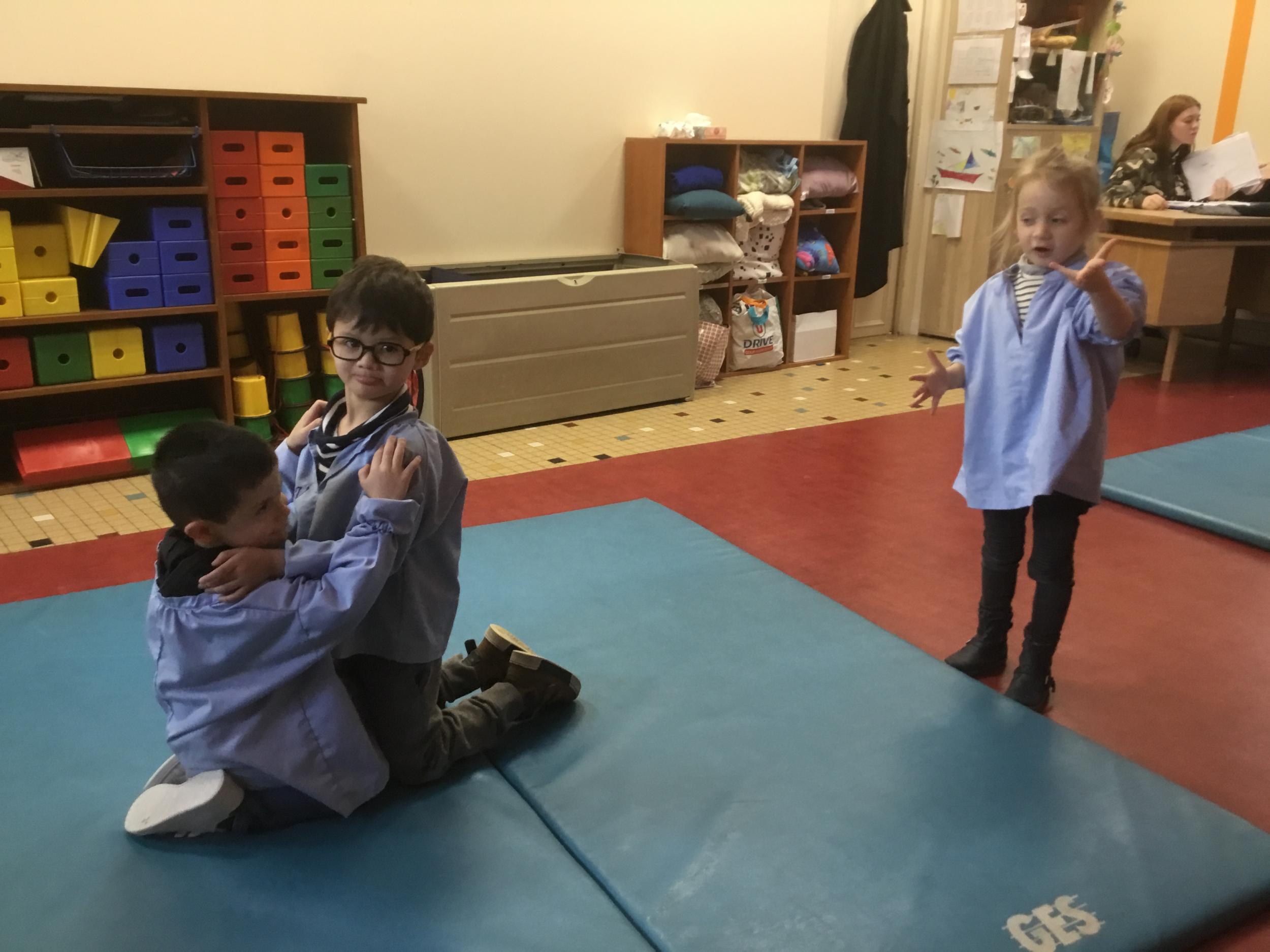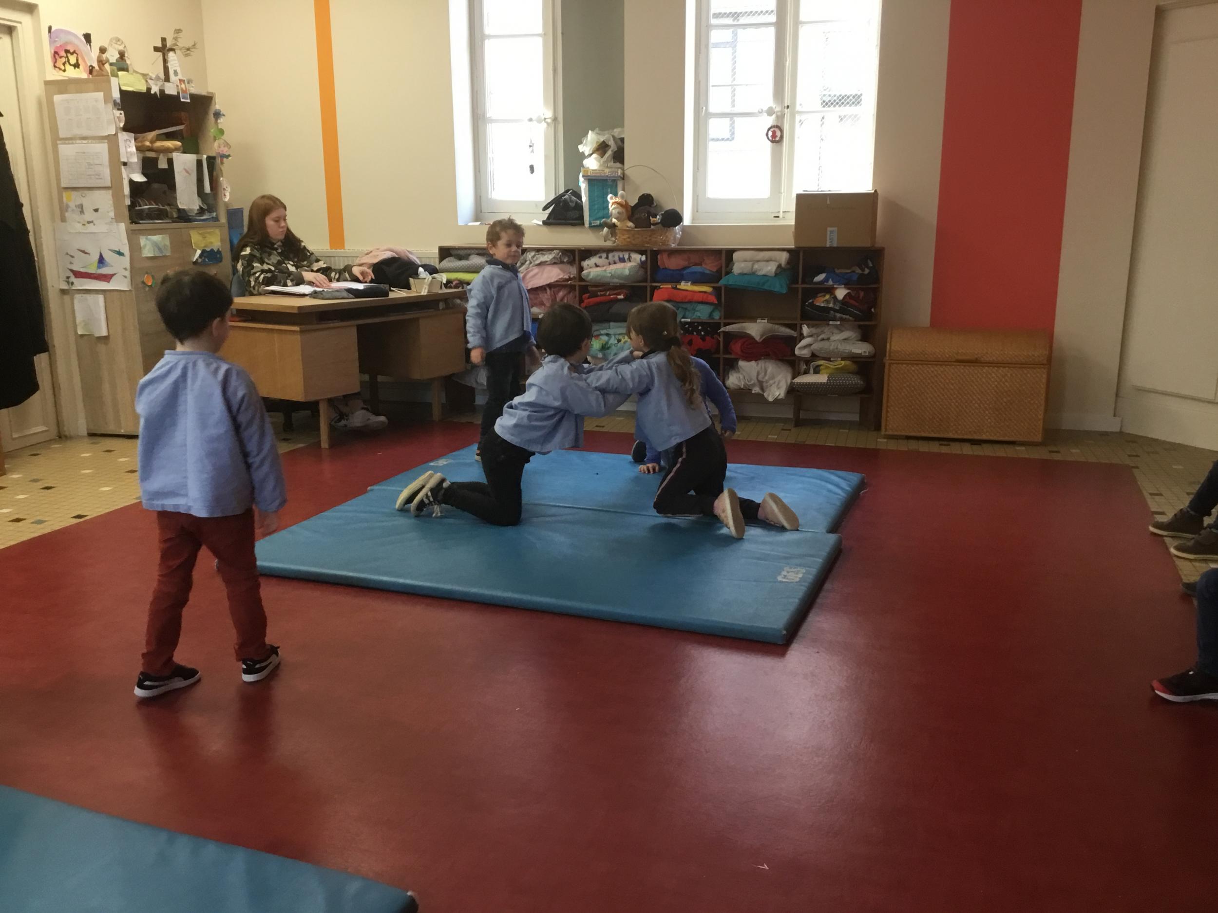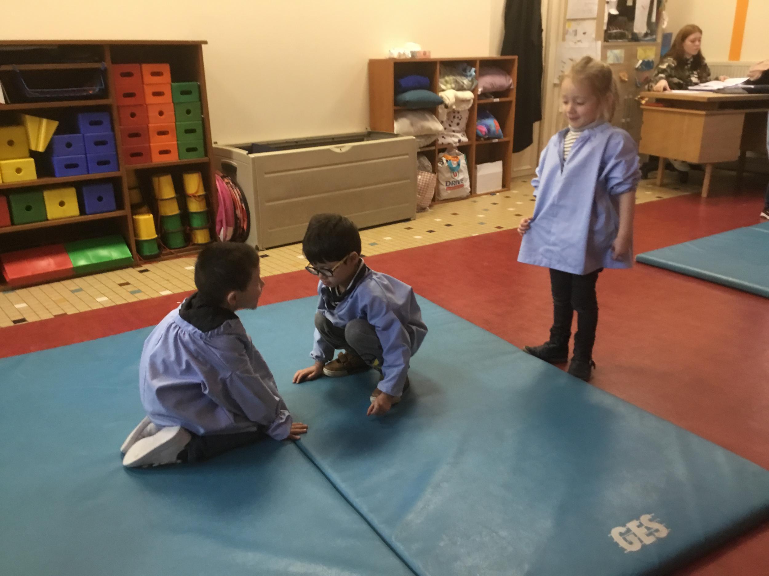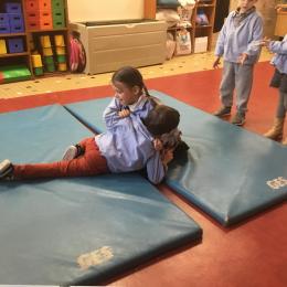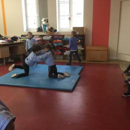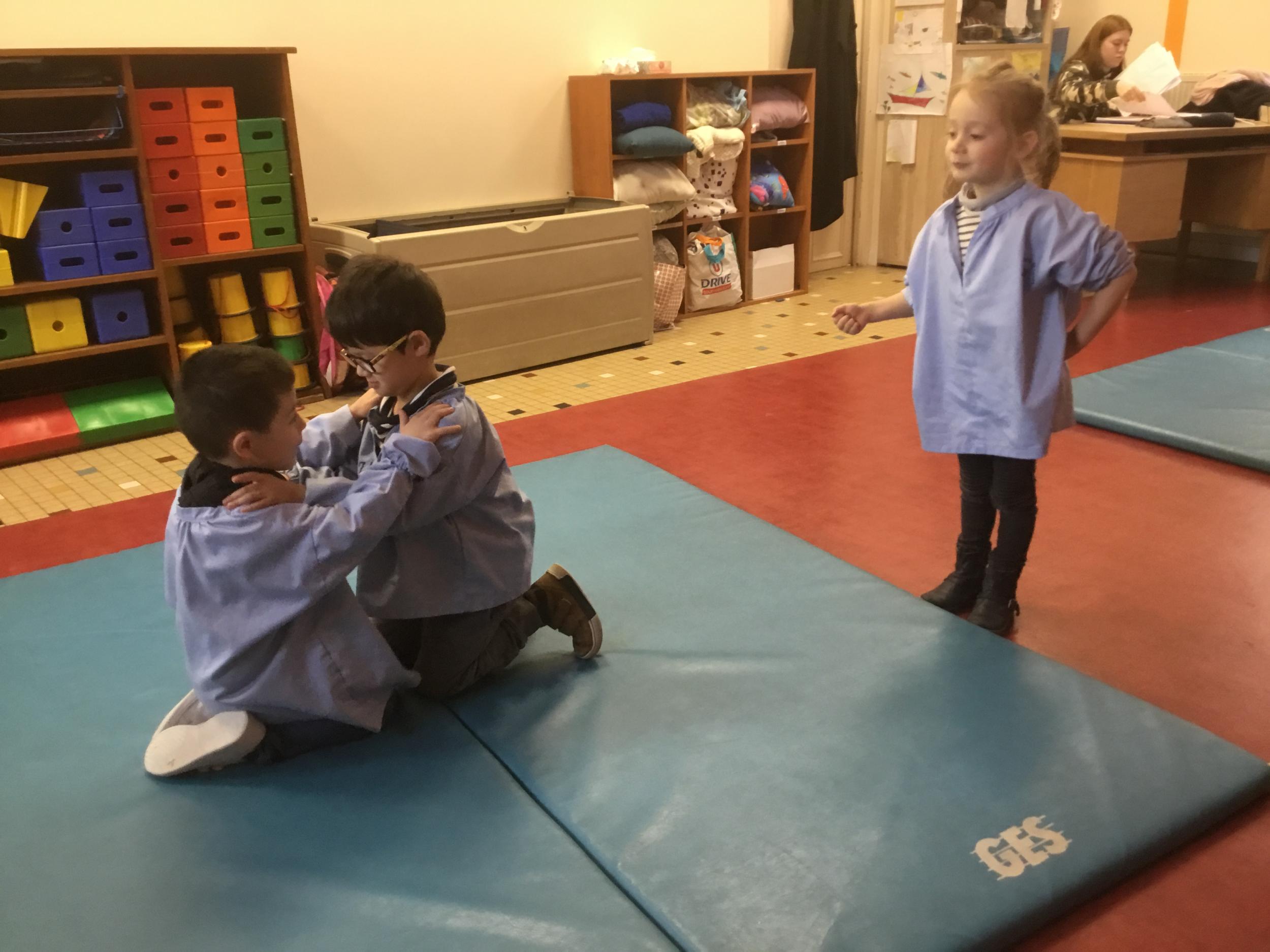 Les élèves apprennent à se responsabiliser , à respecter l’autre et les règles du jeu , à se distrubuer et à tenir leur rôle dans le groupe , à développer une stratégie d’attaque et de défense , à discuter avec les autres sur le choix du rôle de chacun lors des jeux d’opposition . Ils jouent à « la crêpe et au pâtissier », à « la grenouille et au jardinier » et au sumo.