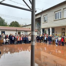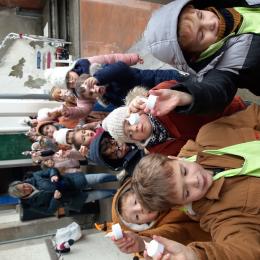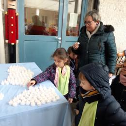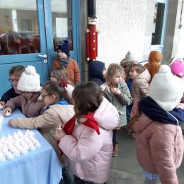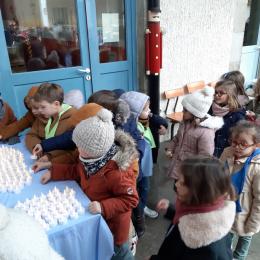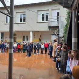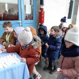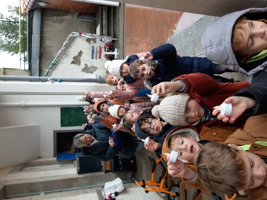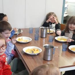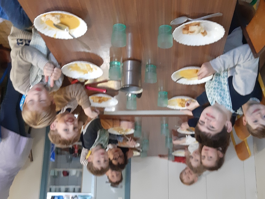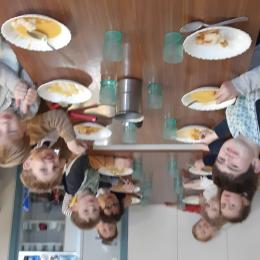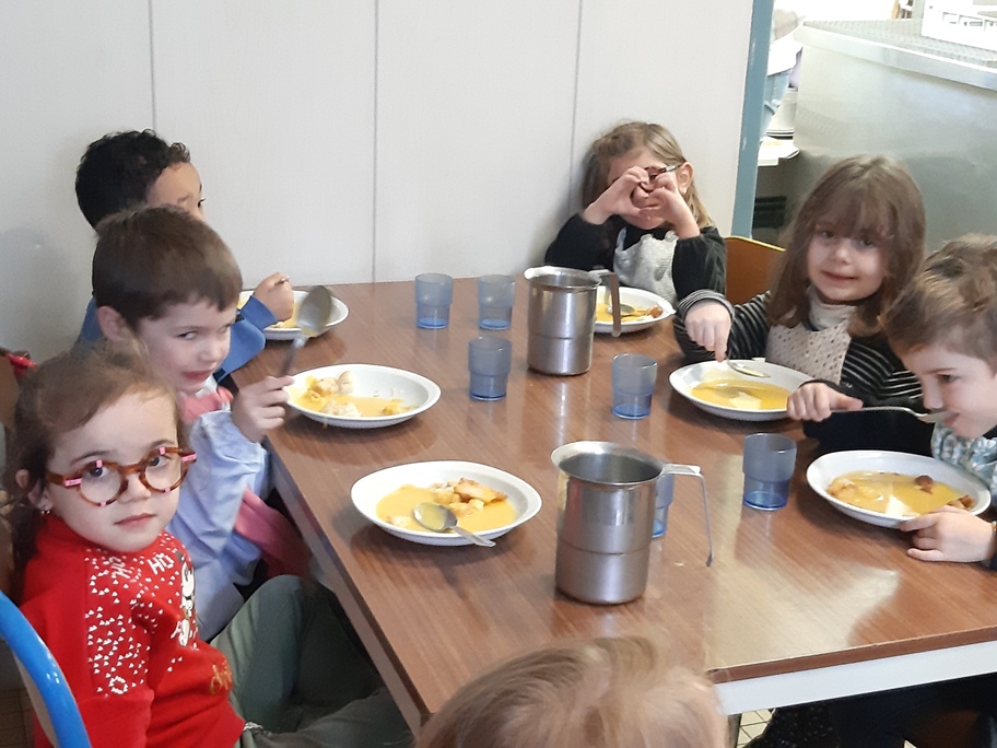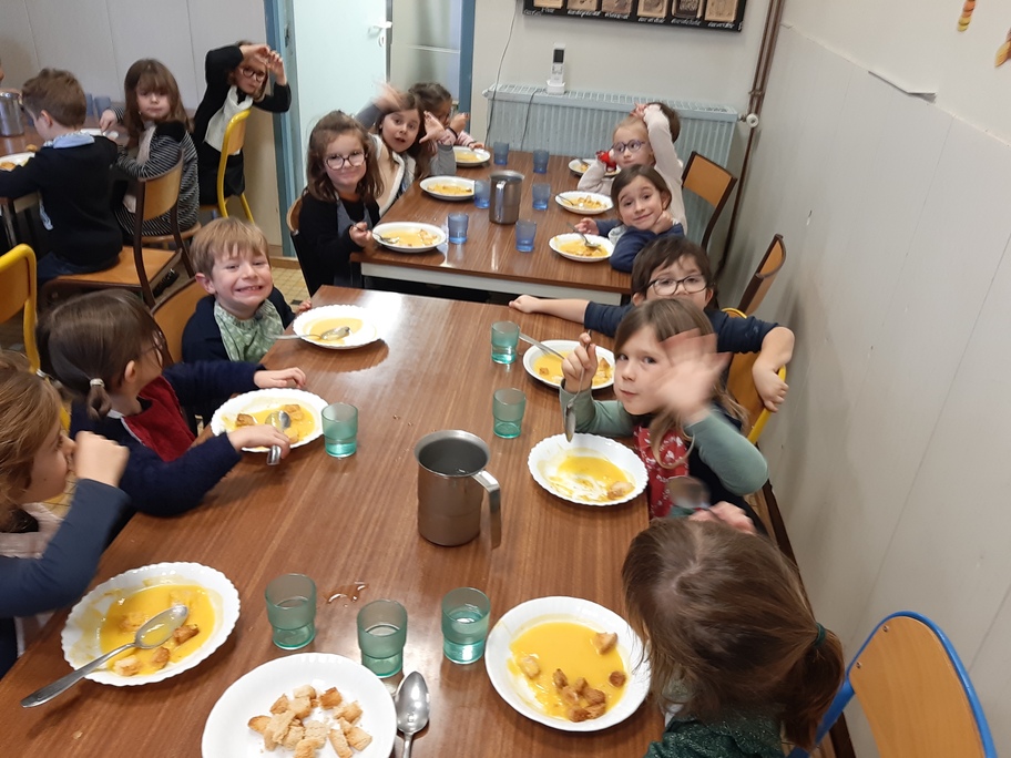 A midi, 21 élèves sur 24 ont participé au repas solidaire avec le bol de soupe (succulente avec ses croûtons!) et la banane. Maîtresse Bérengère a même mangé avec nous à la cantine!