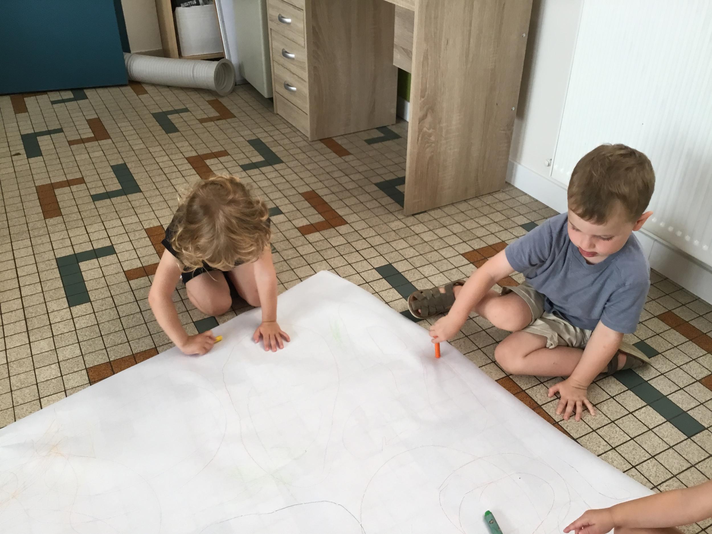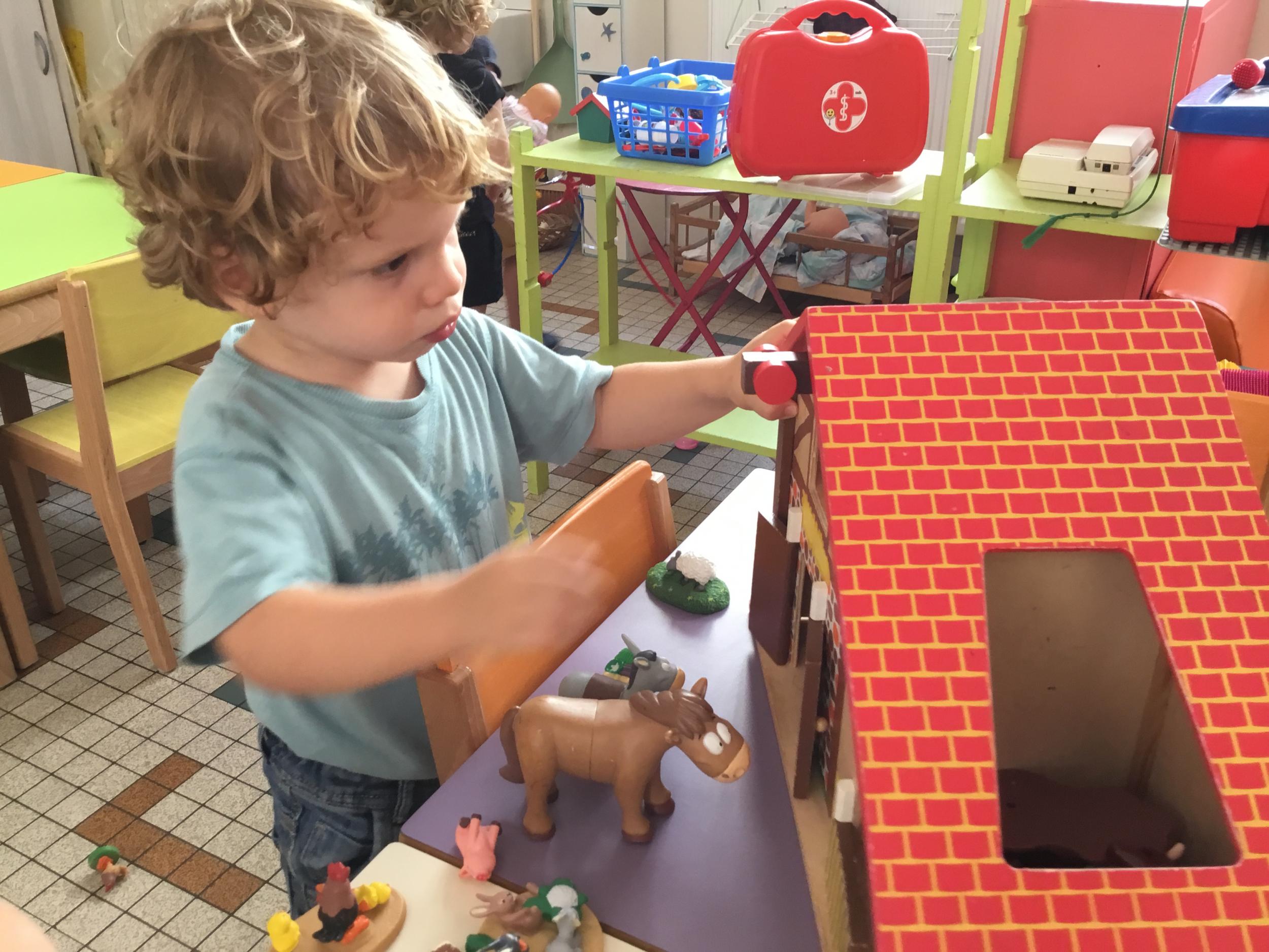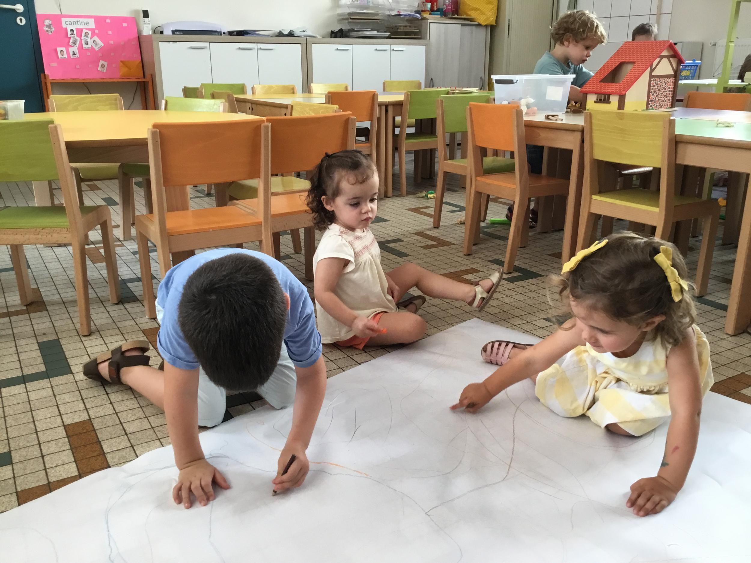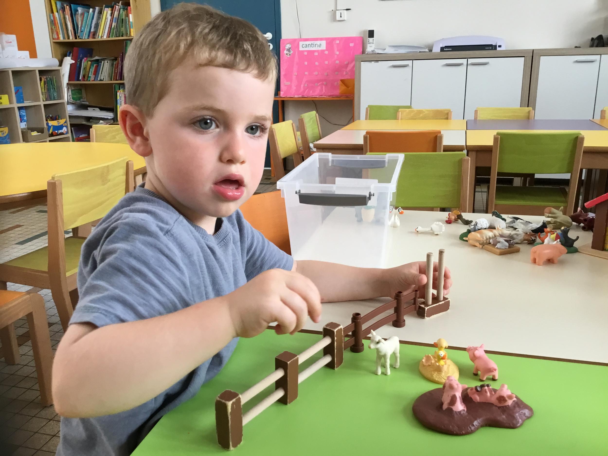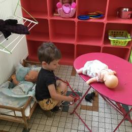 Certain ont choisi de tracer des chemins sur un grand rouleau de papier posé au sol, d’autres ont préféré jouer à la poupée, au docteur, ou développer leur imagination avec les animaux . La maîtresse les observe , les écoute, pose des questions, l’occasion de travailler le vocabulaire et l’expression orale .