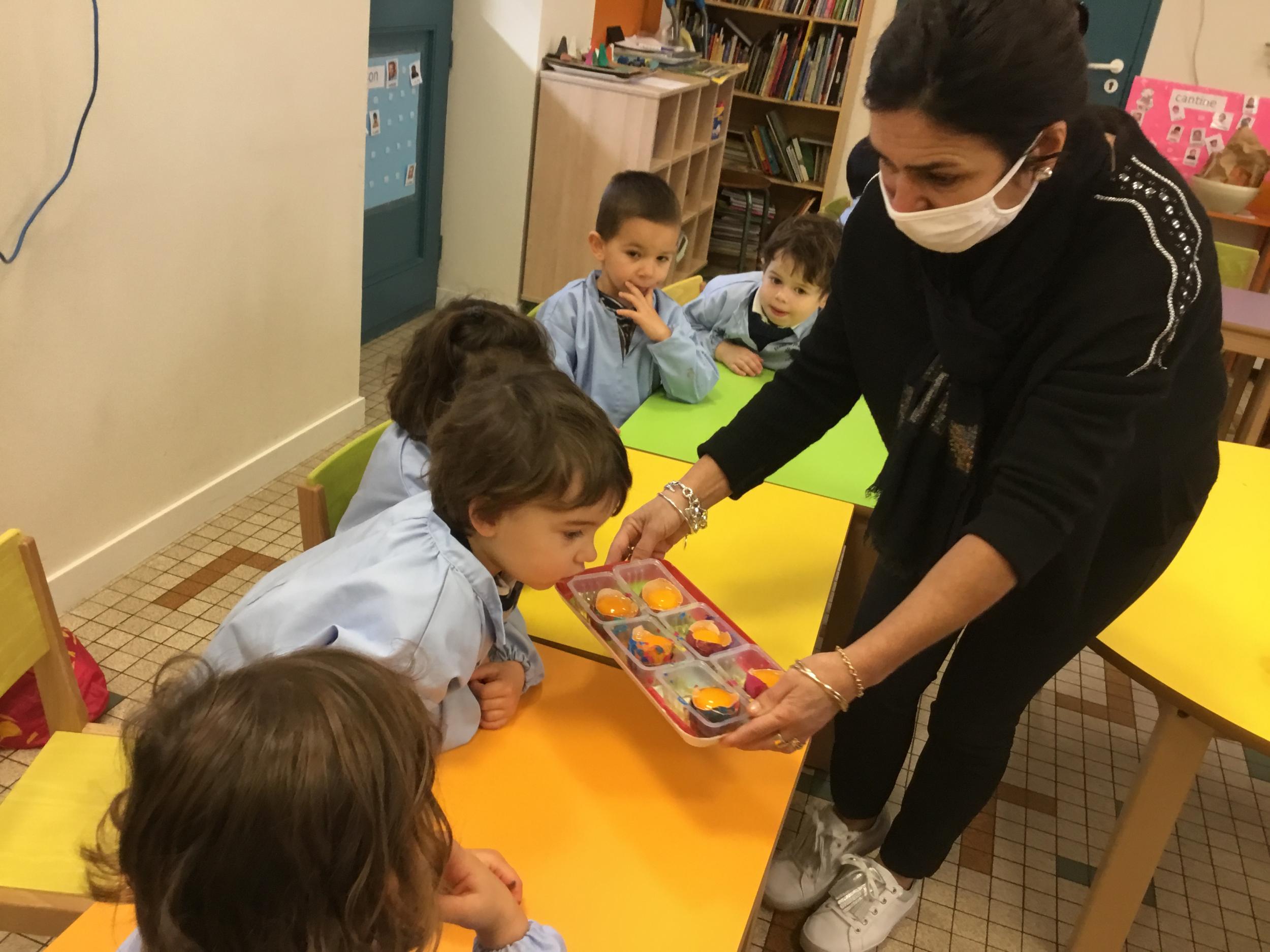 Puis la maîtresse a fait remarquer que les œufs ainsi décorés étaient comme les enfants , comme les grands, tous différents. Ensemble nous avons cherché nos différences: les cheveux, les yeux, la taille, la couleur de la peau....