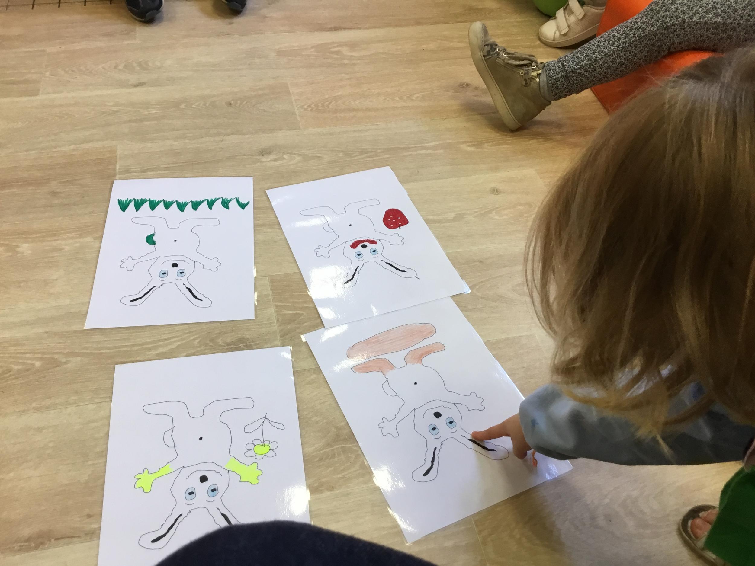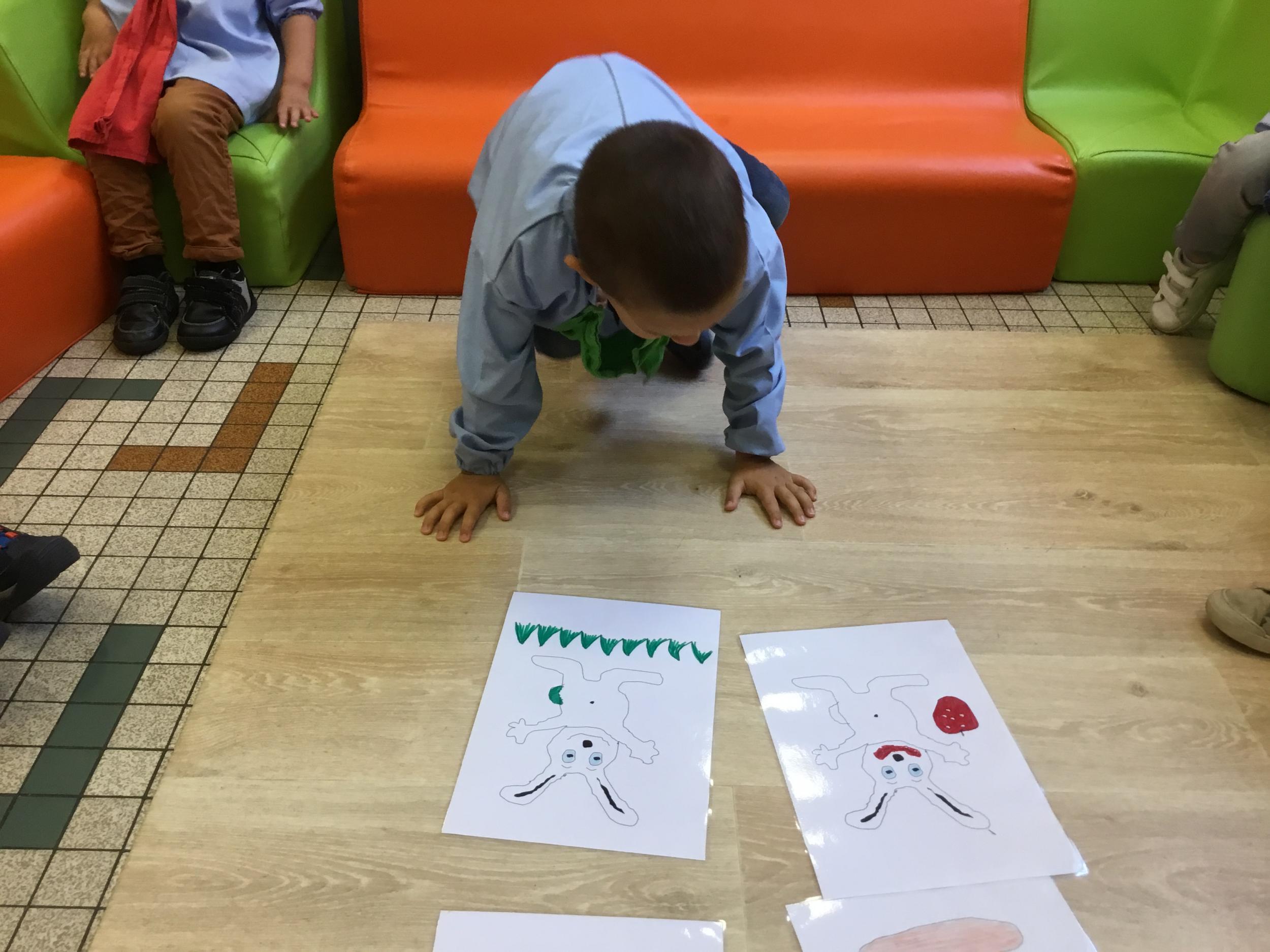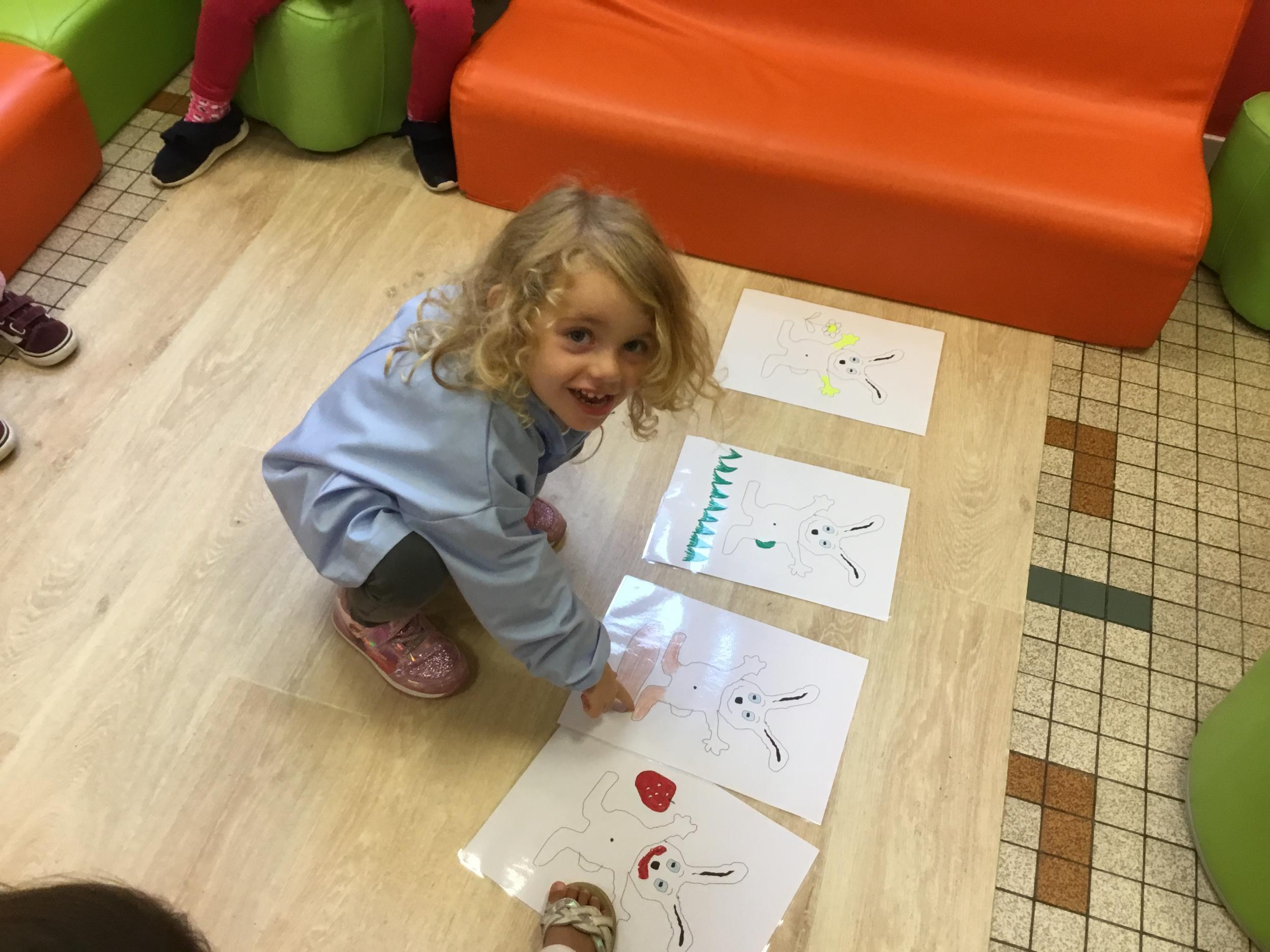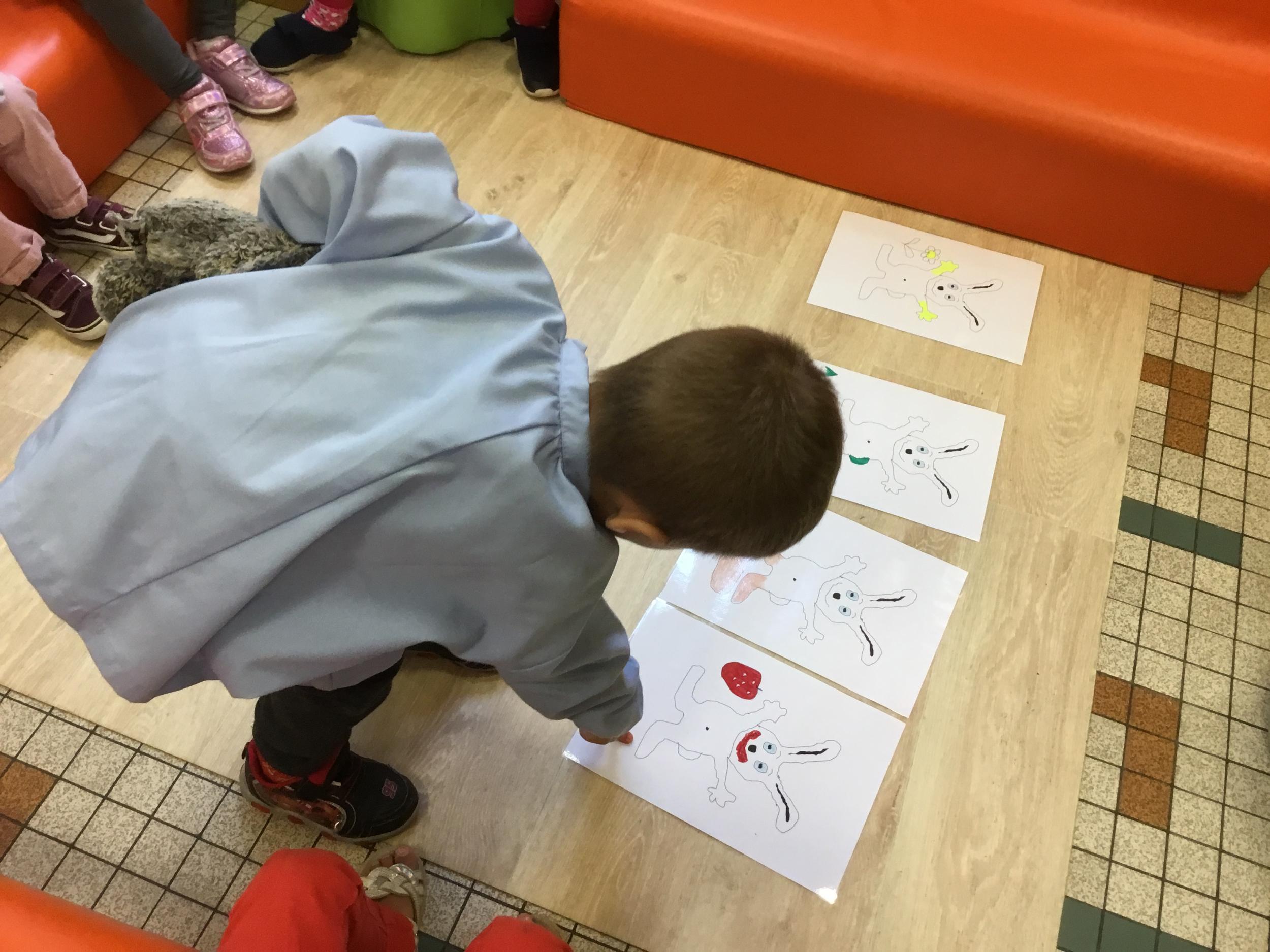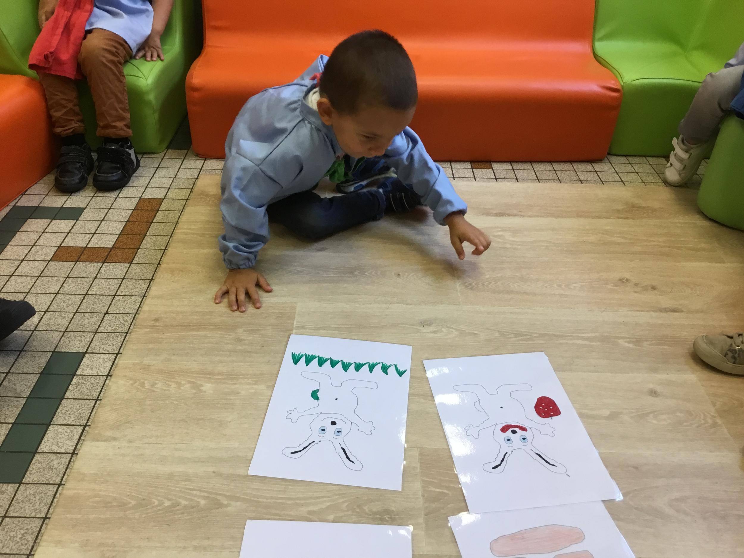 Cet album permet de travailler sur le thème des couleurs et le schéma corporel. Le mardi, les élèves ont raconté l’histoire à partir d’images de l’histoire. Un jeu autour de ces images leur a permis de faire deviner une image qui leur plaisait parmi toutes celles proposées à leur camarade. Pas toujours facile de faire deviner une image sans devoir la monter à ses camarades en utilisant seulement des mots ou une courte phrase pour les plus bavards.