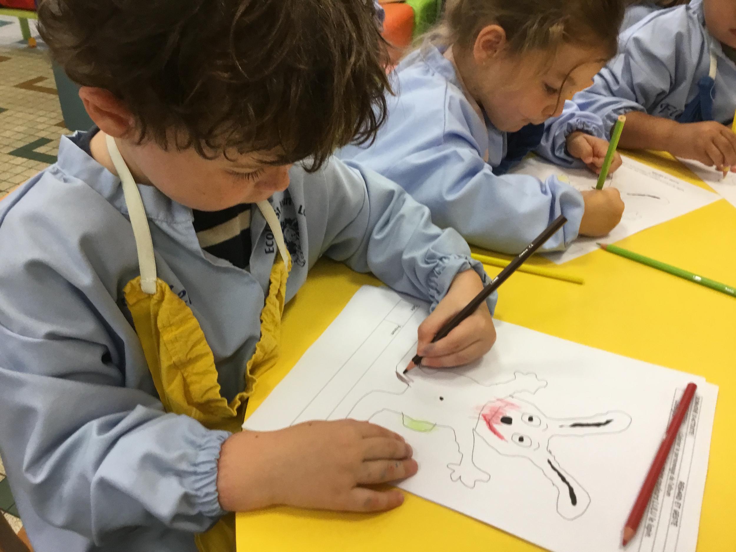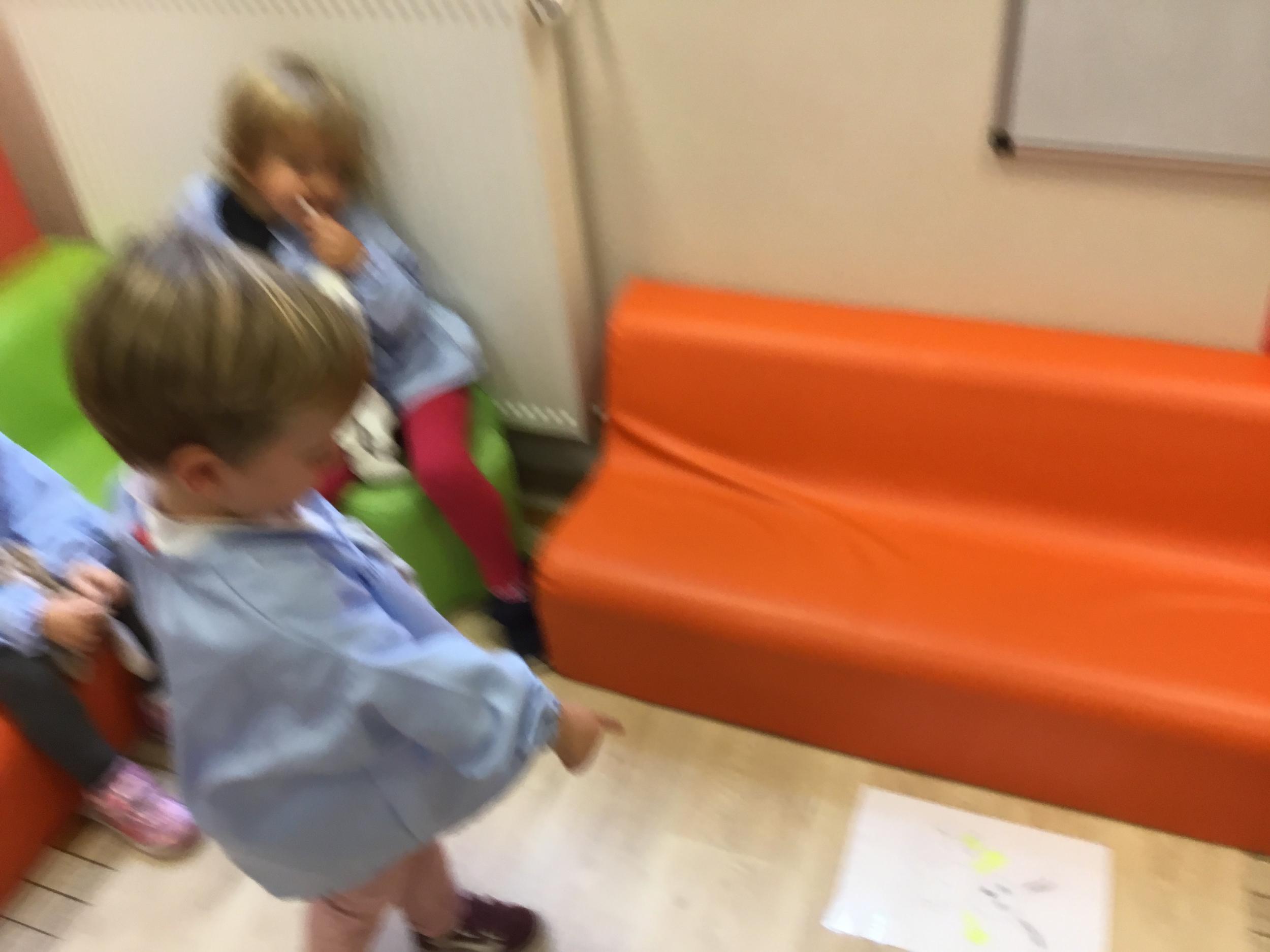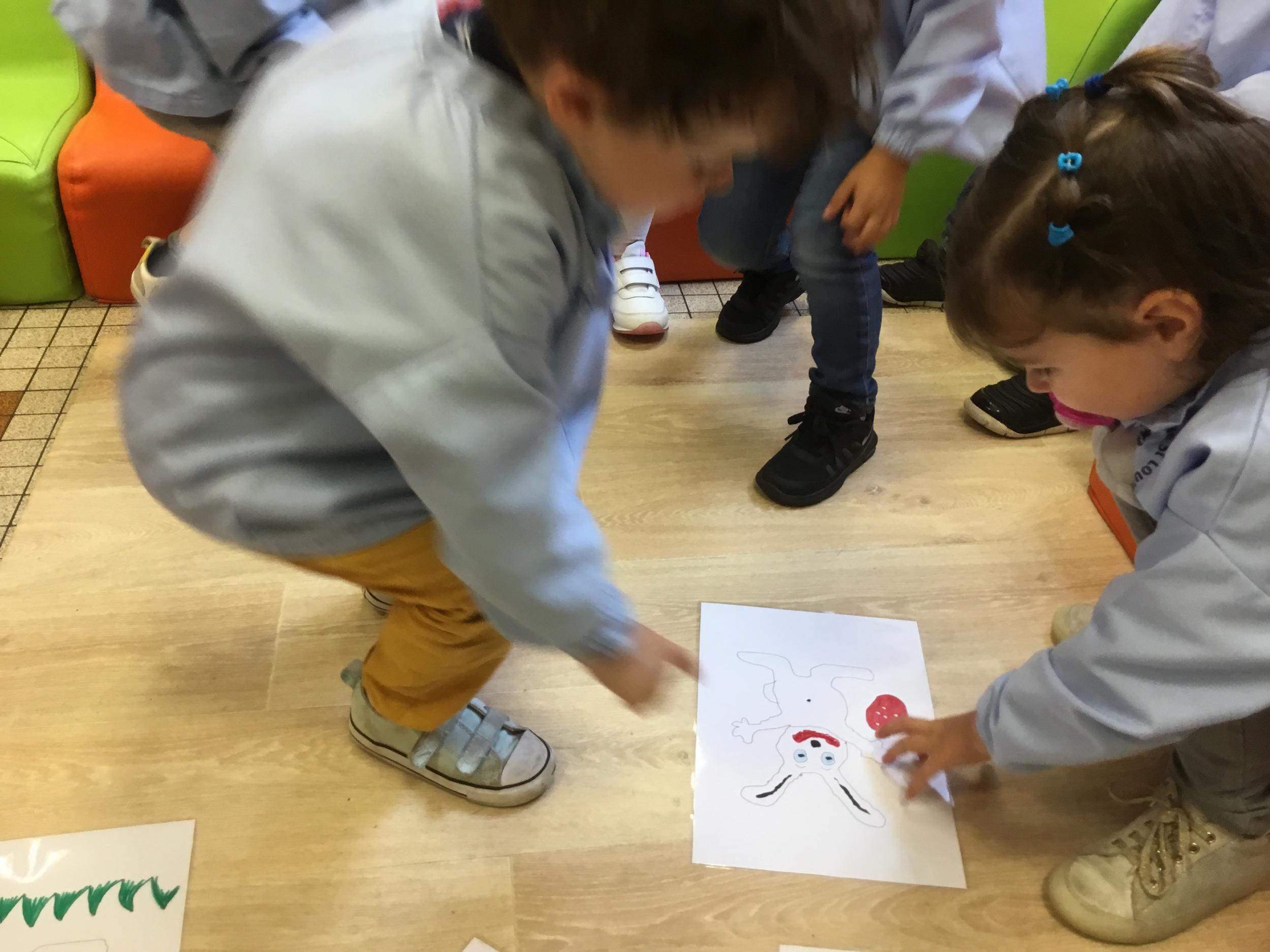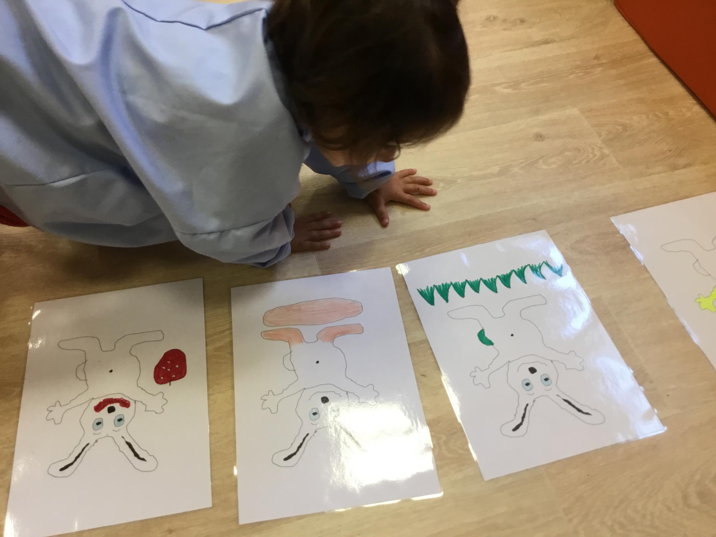 Cet album permet de travailler sur le thème des couleurs et le schéma corporel. Le mardi, les élèves ont raconté l’histoire à partir d’images de l’histoire. Un jeu autour de ces images leur a permis de faire deviner une image qui leur plaisait parmi toutes celles proposées à leur camarade. Pas toujours facile de faire deviner une image sans devoir la monter à ses camarades en utilisant seulement des mots ou une courte phrase pour les plus bavards.