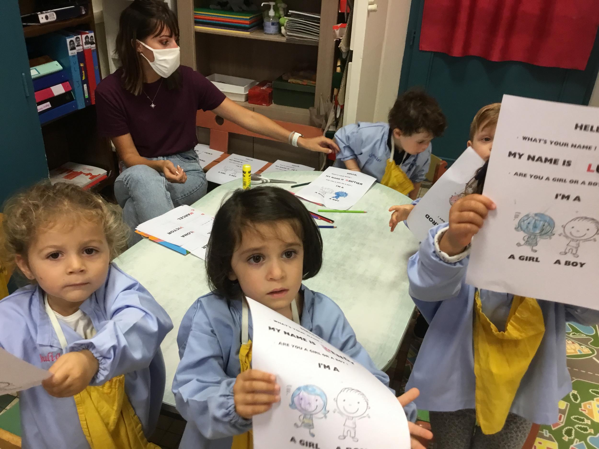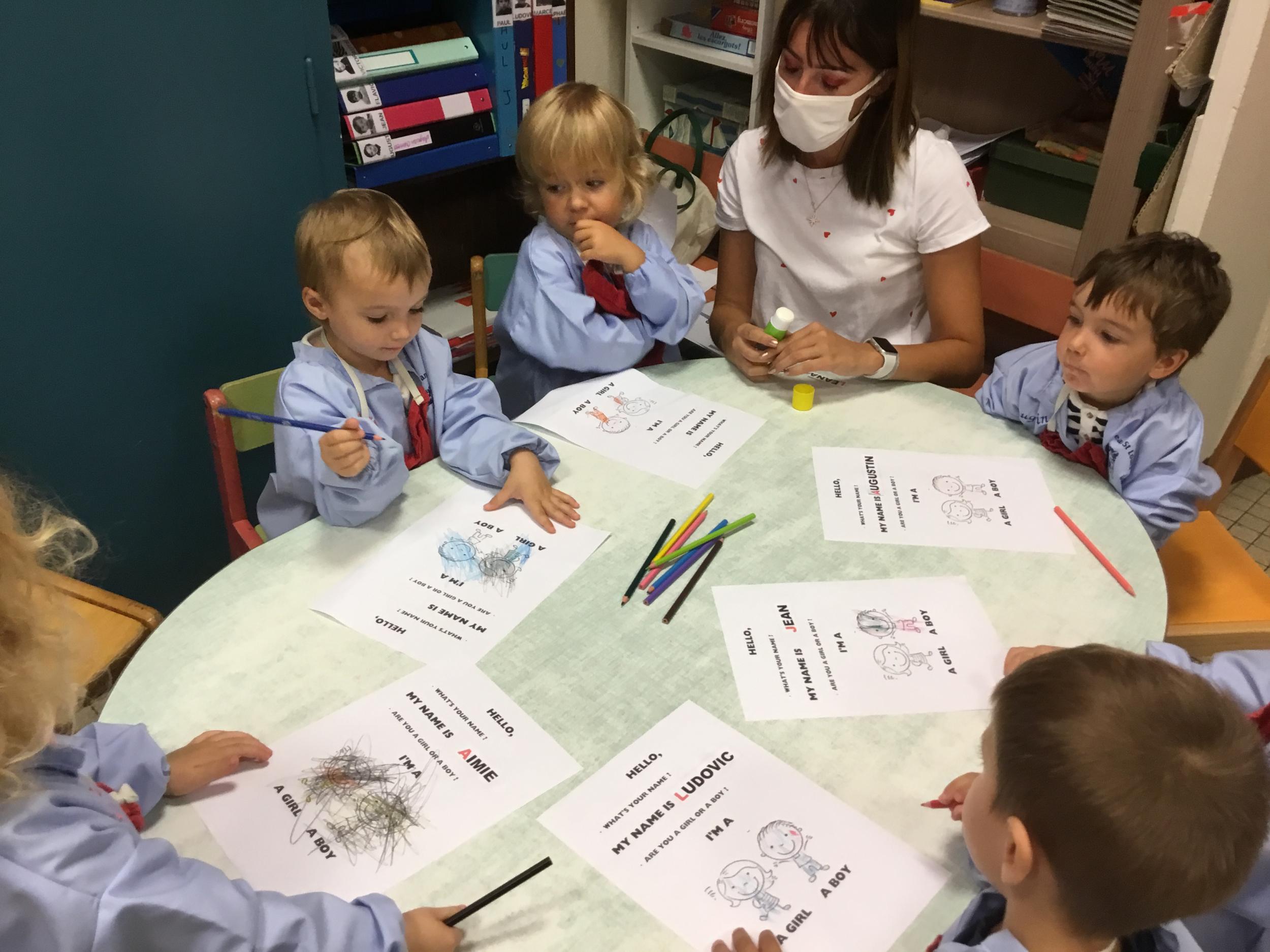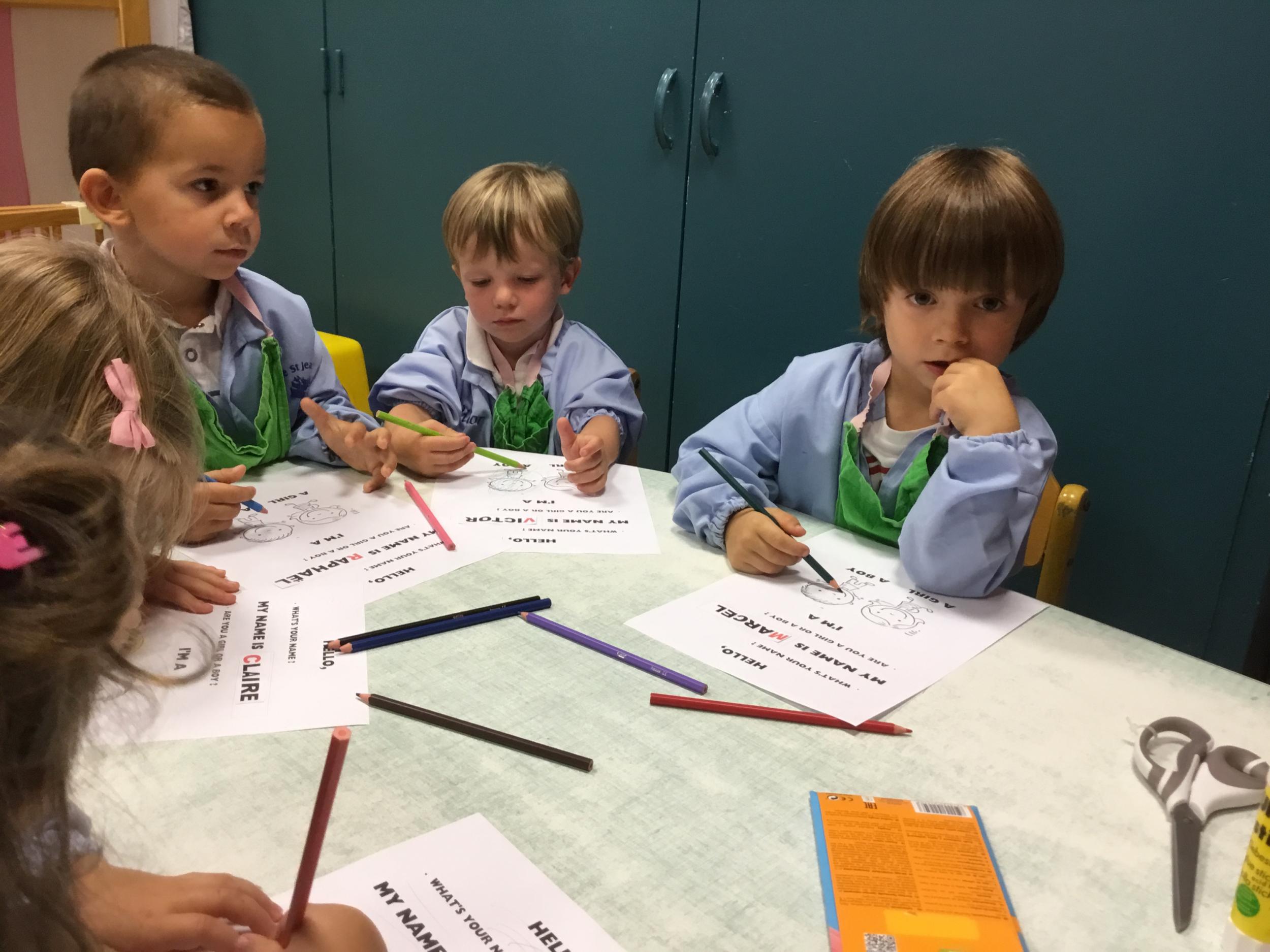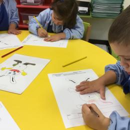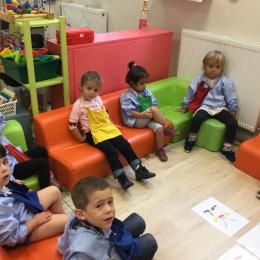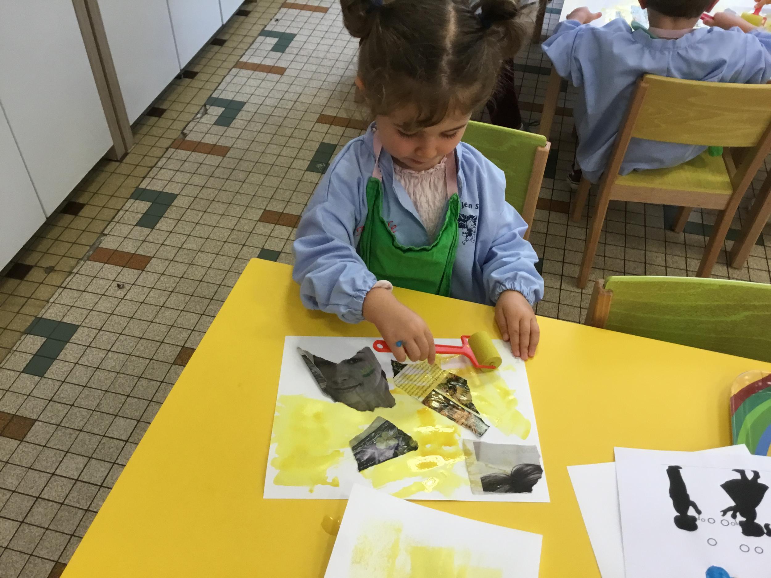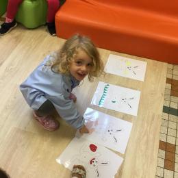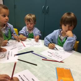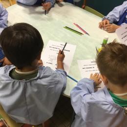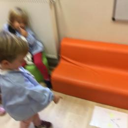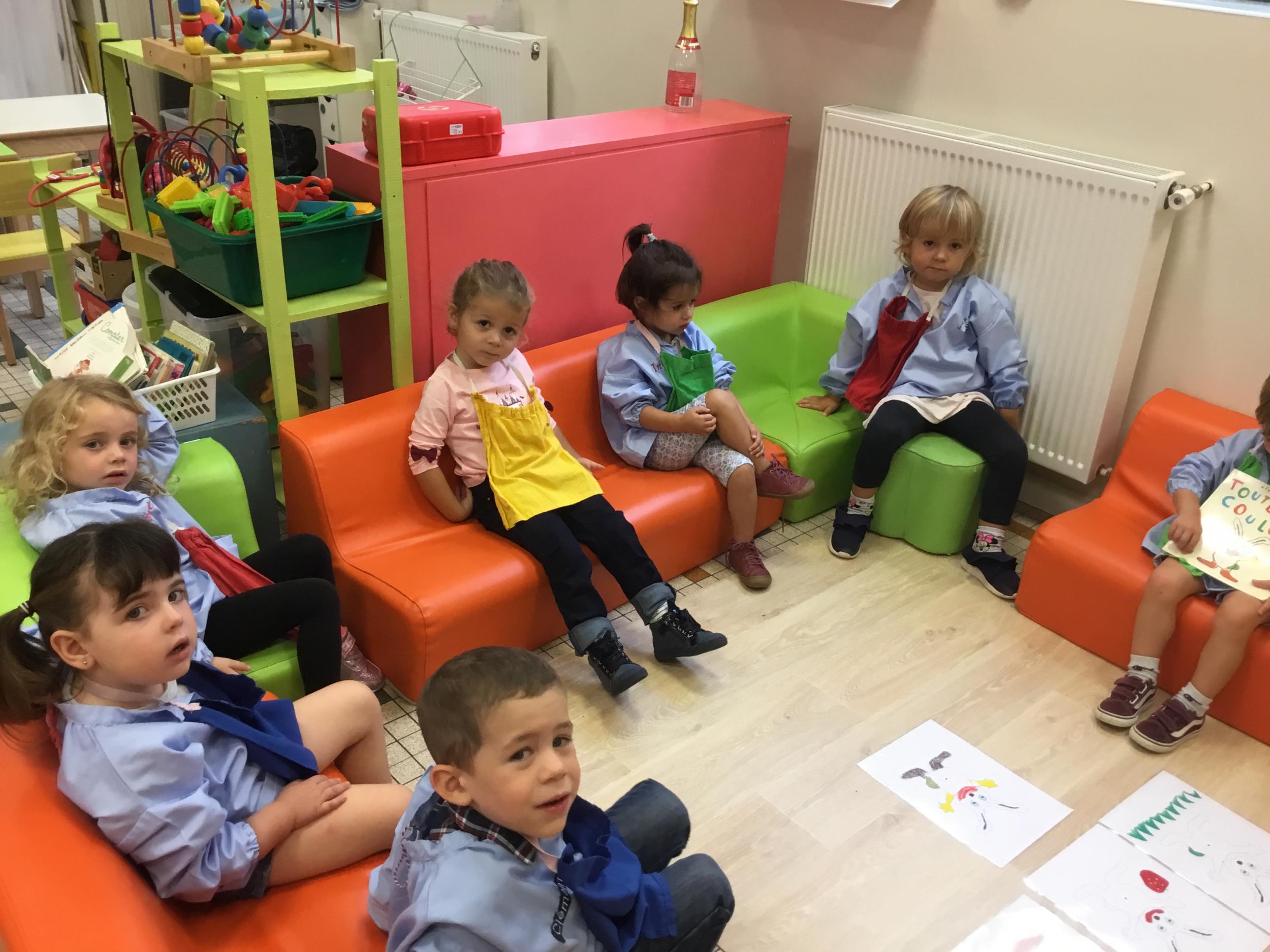 Cet album permet de travailler sur le thème des couleurs et le schéma corporel. Le mardi, les élèves ont raconté l’histoire à partir d’images de l’histoire. Un jeu autour de ces images leur a permis de faire deviner une image qui leur plaisait parmi toutes celles proposées à leur camarade. Pas toujours facile de faire deviner une image sans devoir la monter à ses camarades en utilisant seulement des mots ou une courte phrase pour les plus bavards.