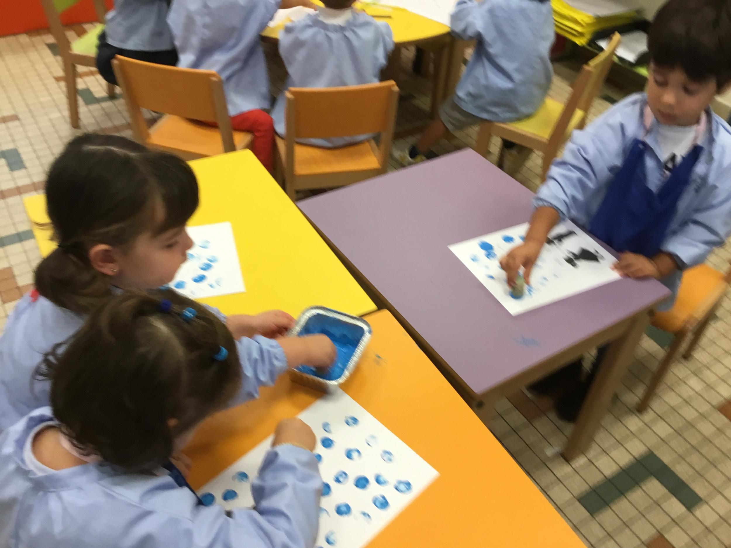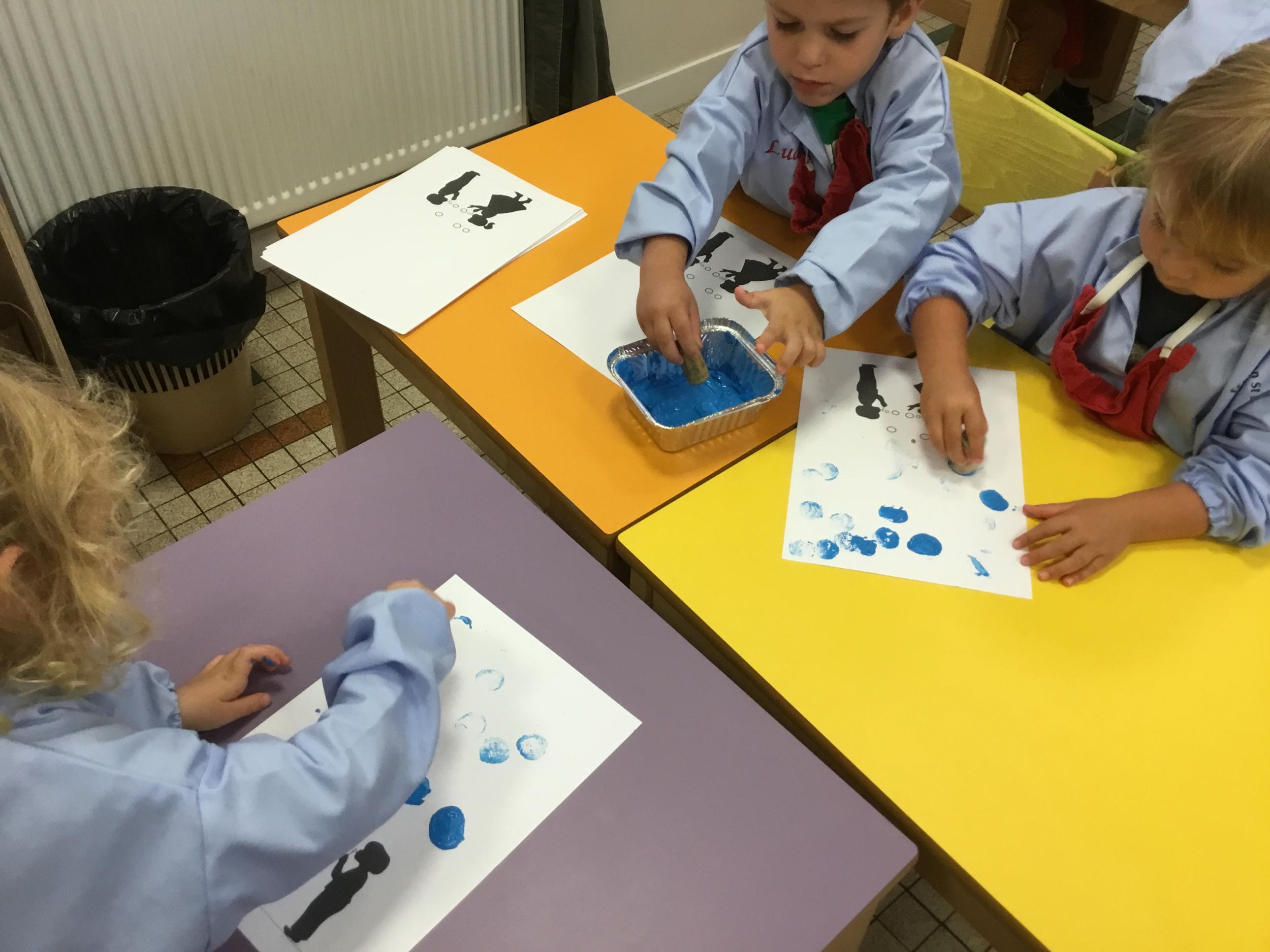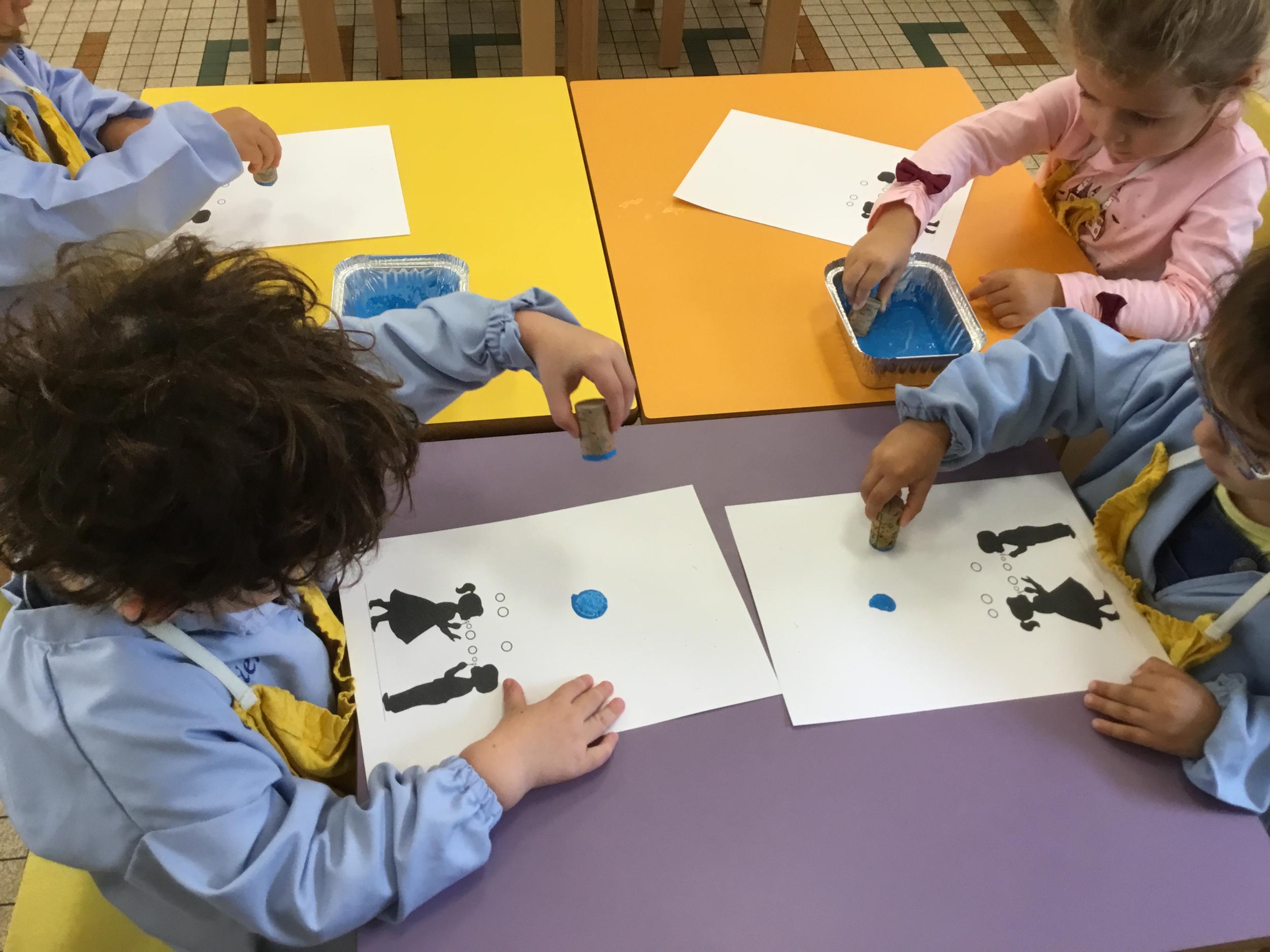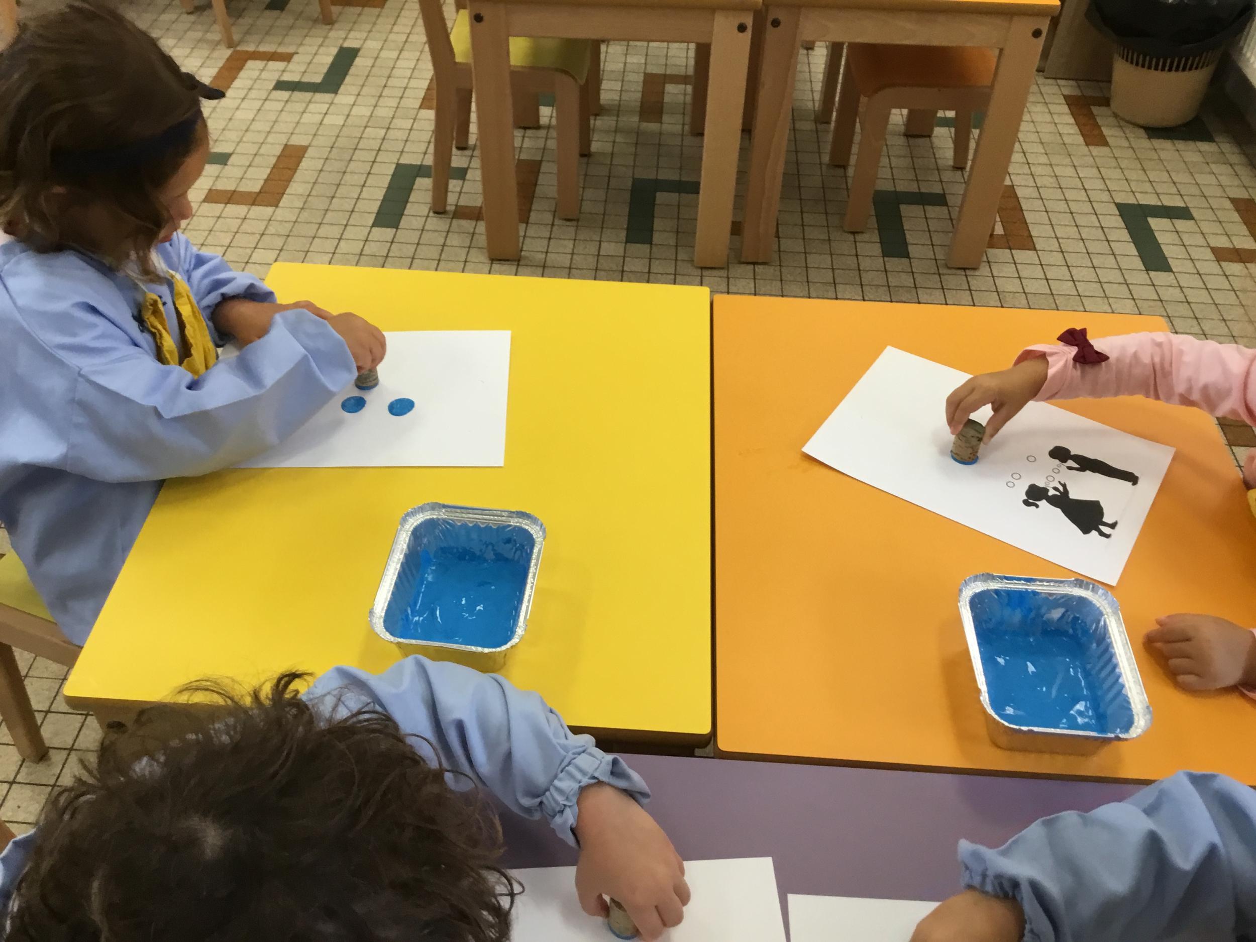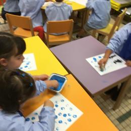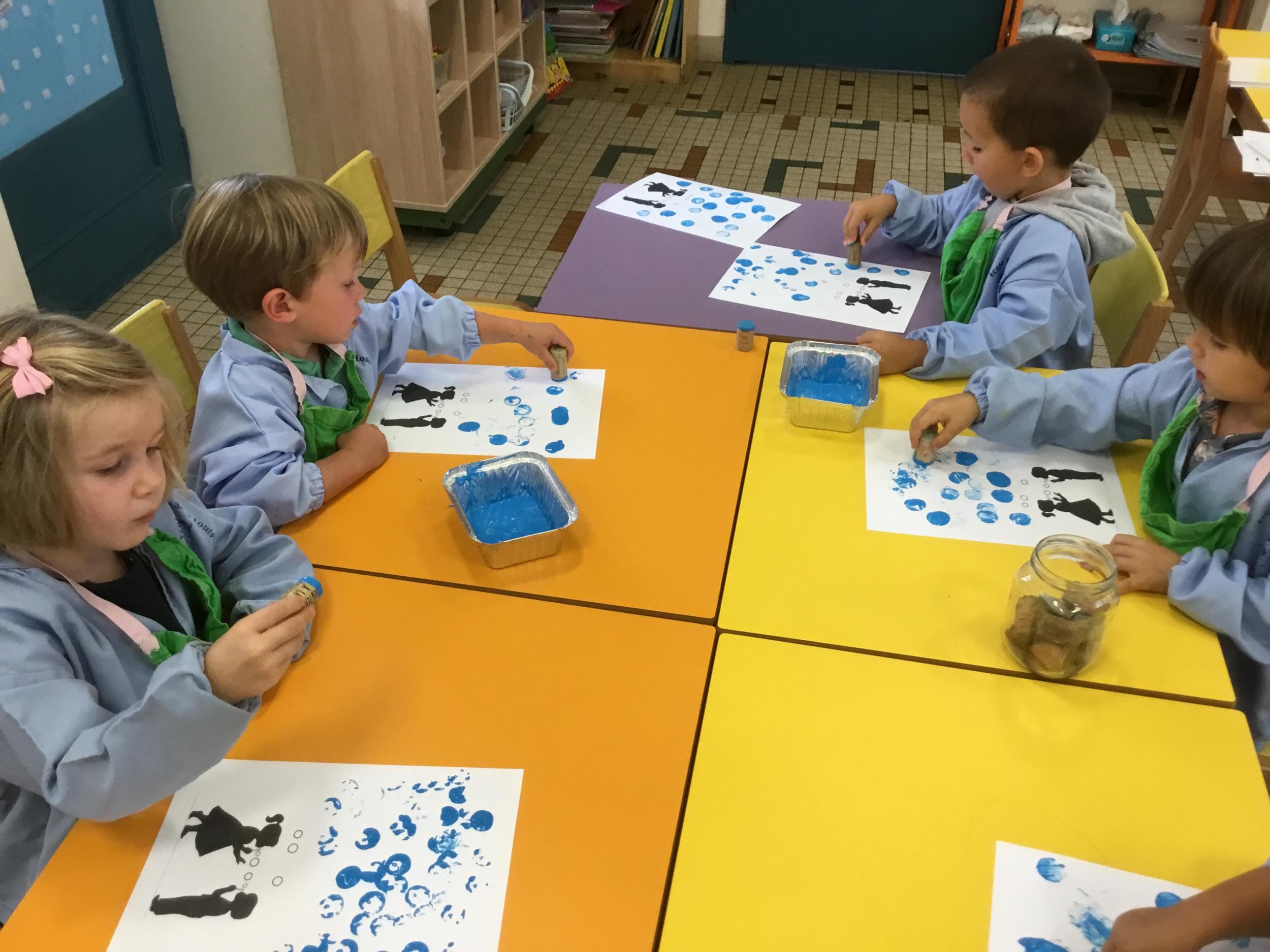 Lors des ateliers les élèves ont travaillé sur l’activité plastique « Laisser une trace ». Cette semaine ils ont travaillé avec la trace laissée par un bouchon et la couleur bleue.