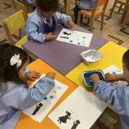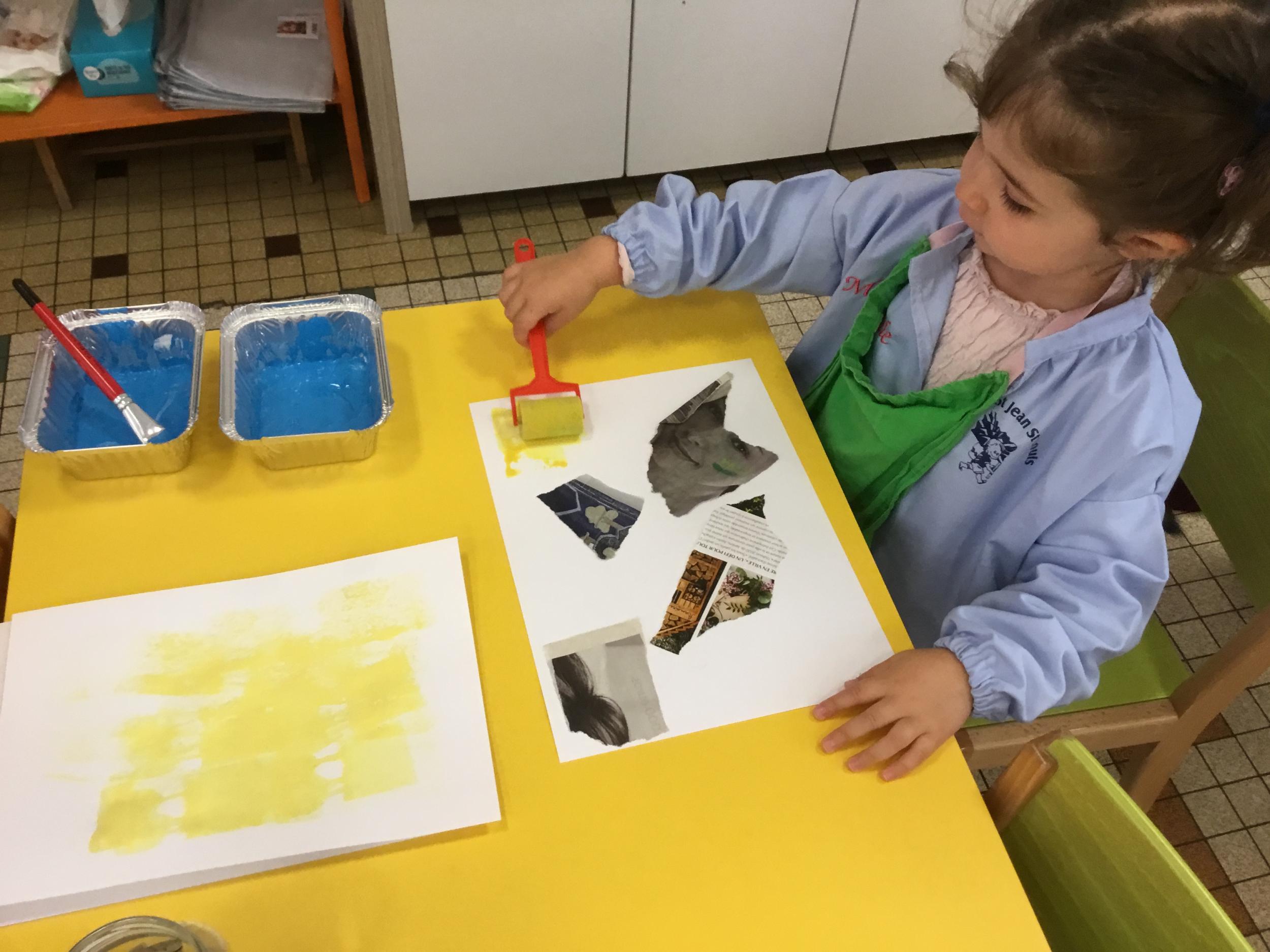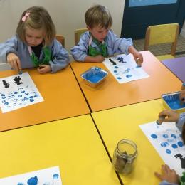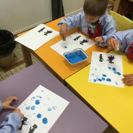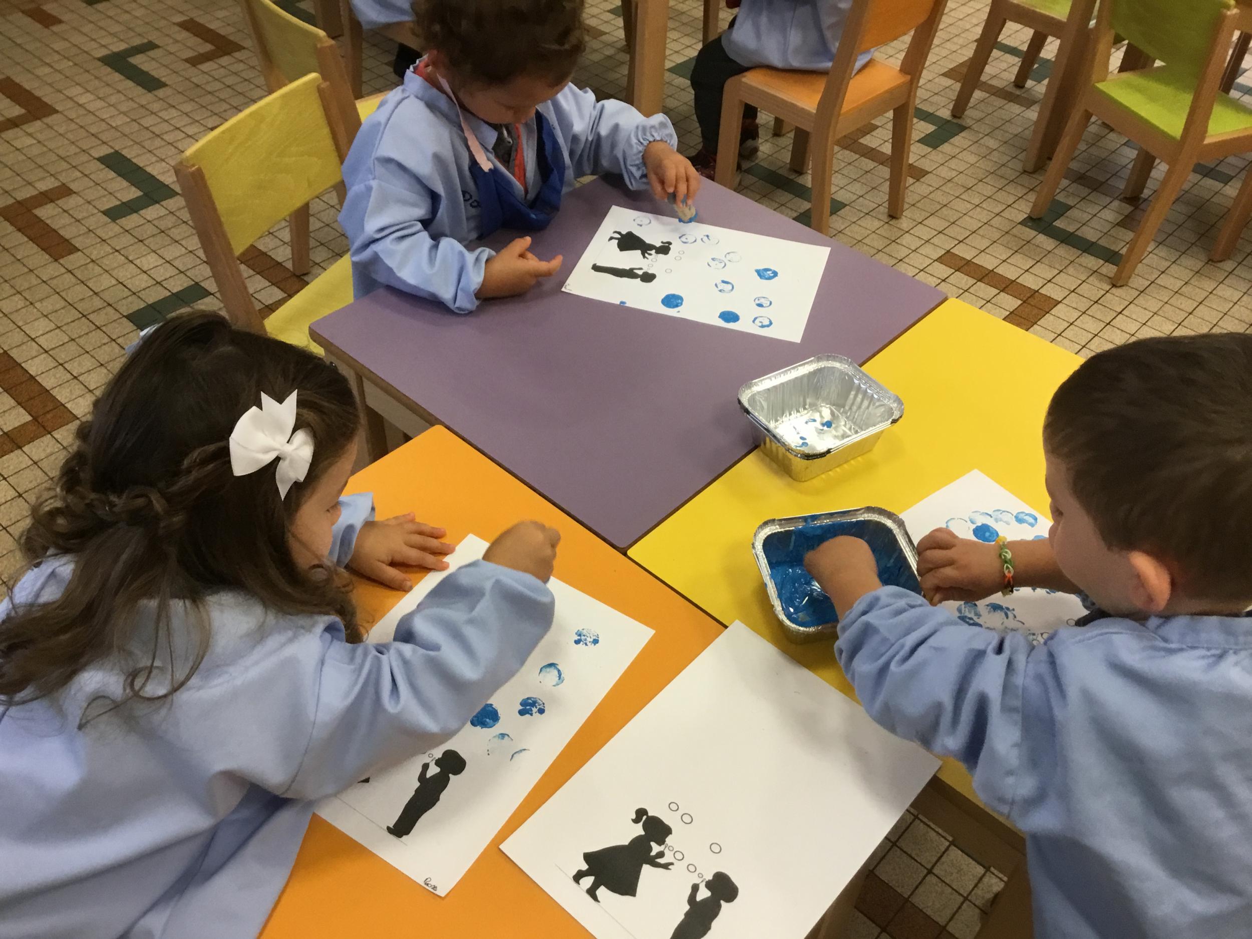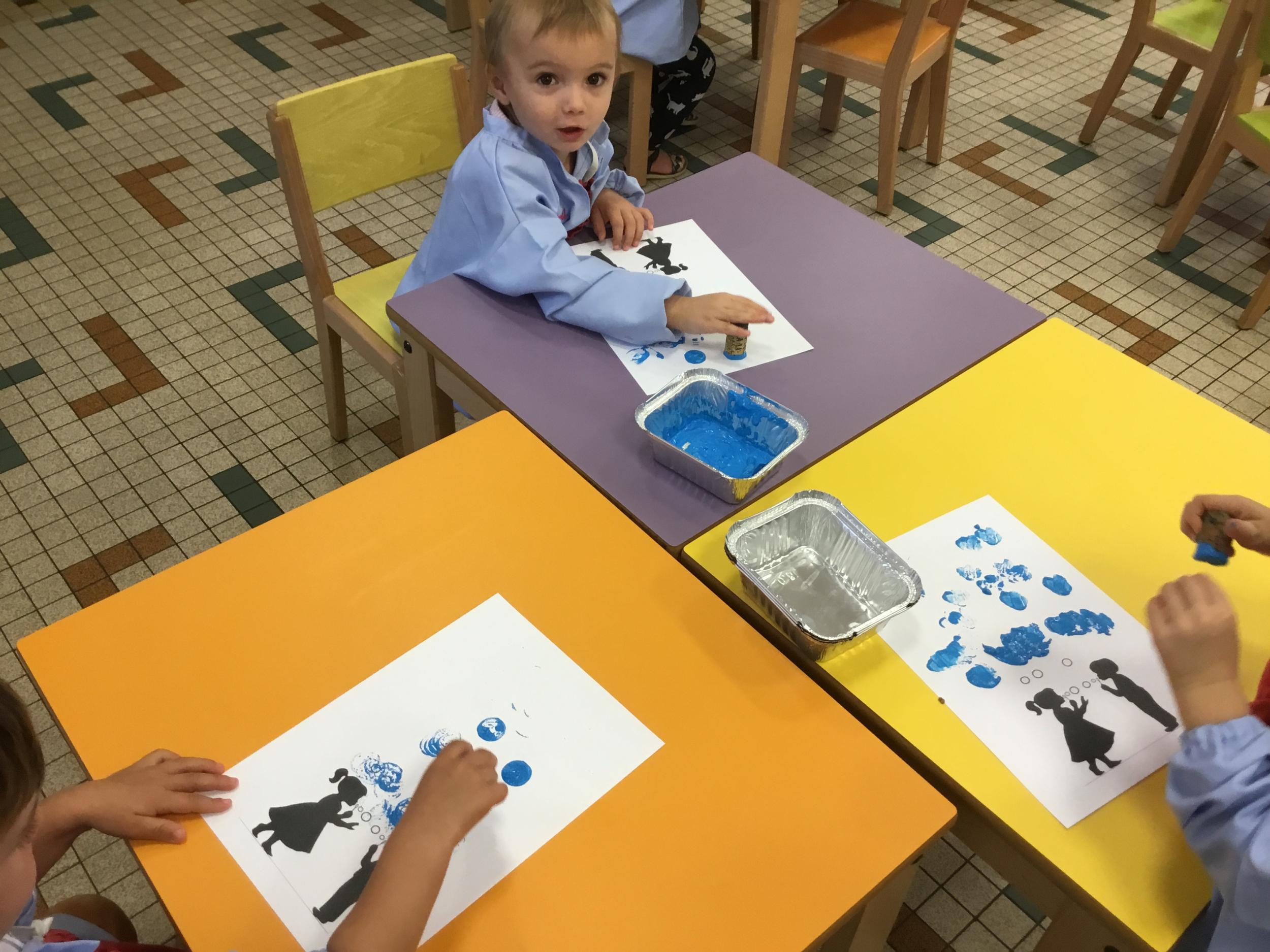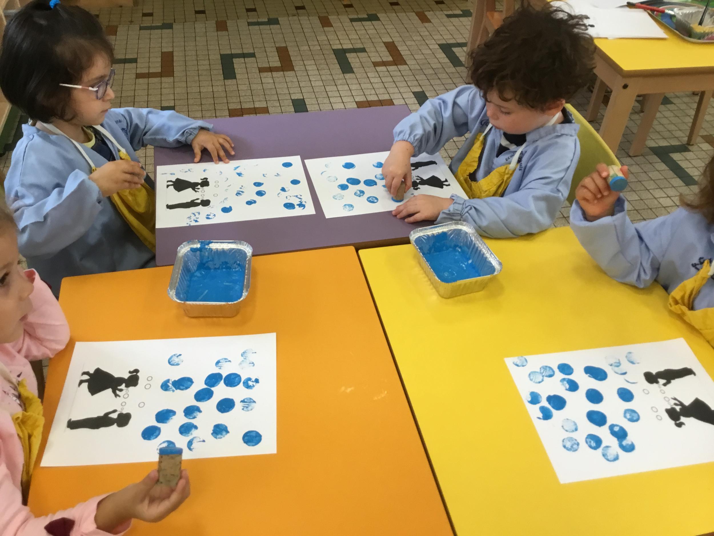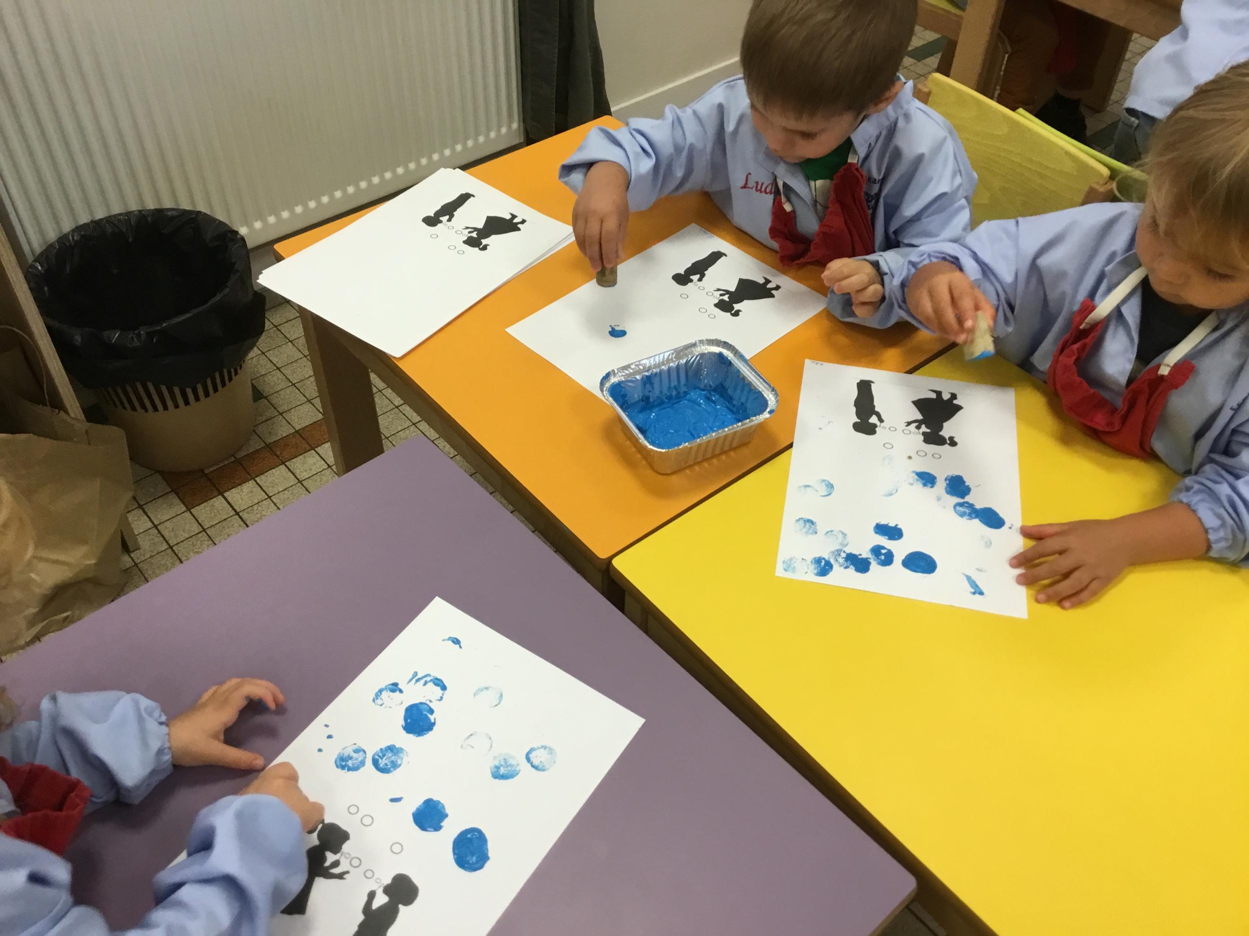 Lors des ateliers les élèves ont travaillé sur l’activité plastique « Laisser une trace ». Cette semaine ils ont travaillé avec la trace laissée par un bouchon et la couleur bleue.