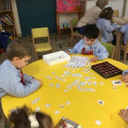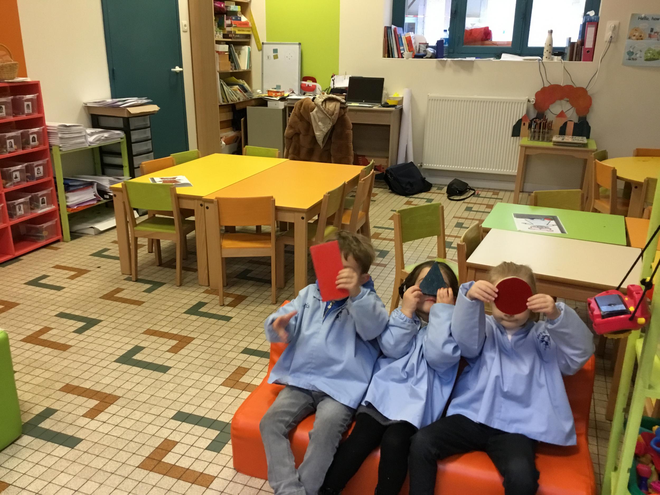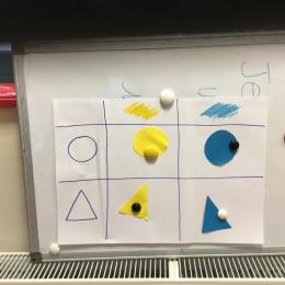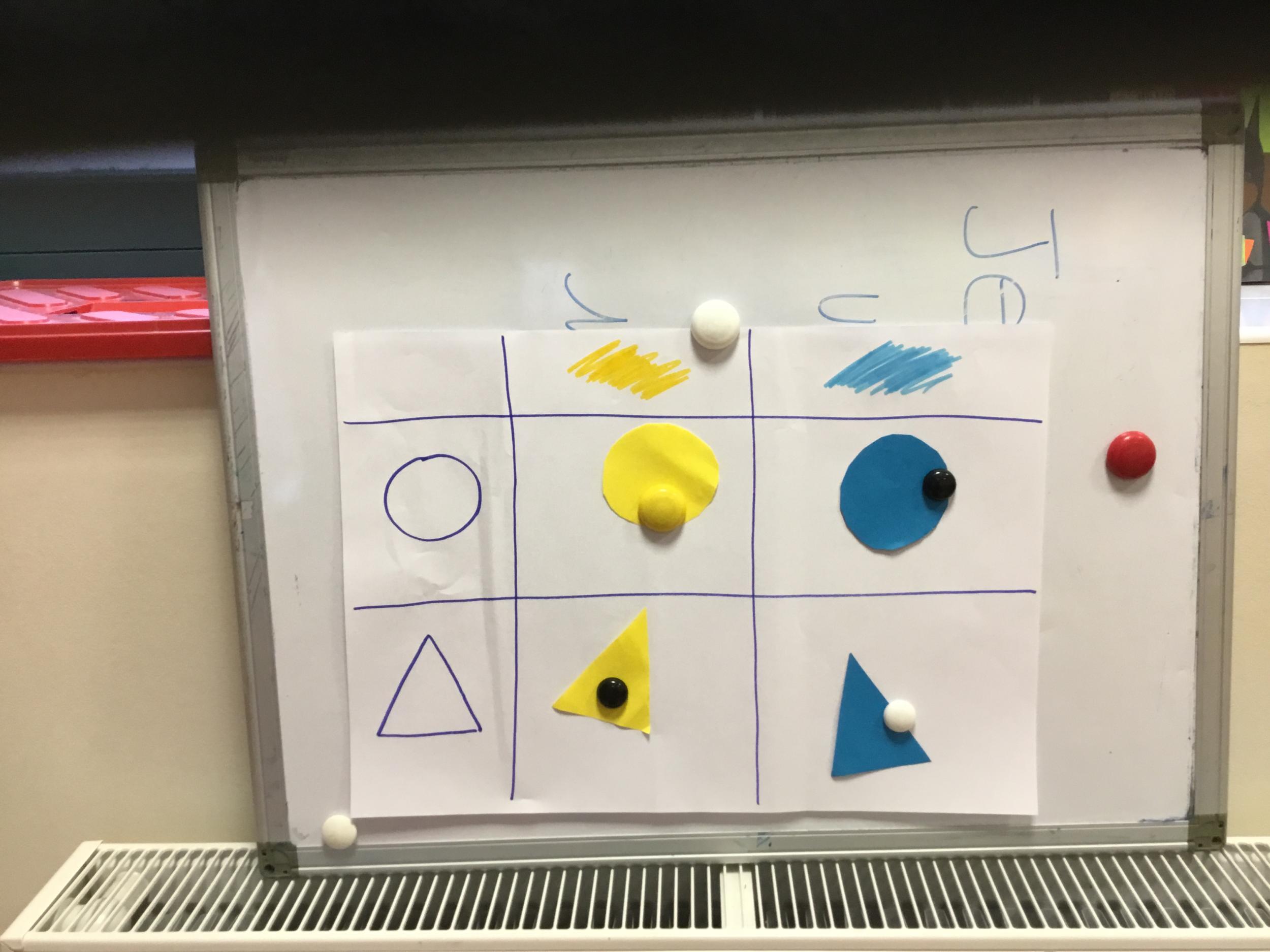 Après avoir manipulé, joué avec les différentes formes, après avoir appris à les nommer, les avoir triées, classées de différentes façons , nous apprenons à compéter un tableau à double entrée .