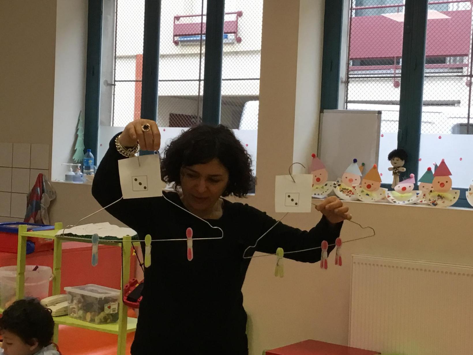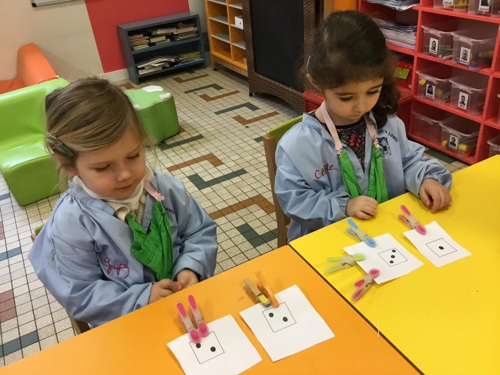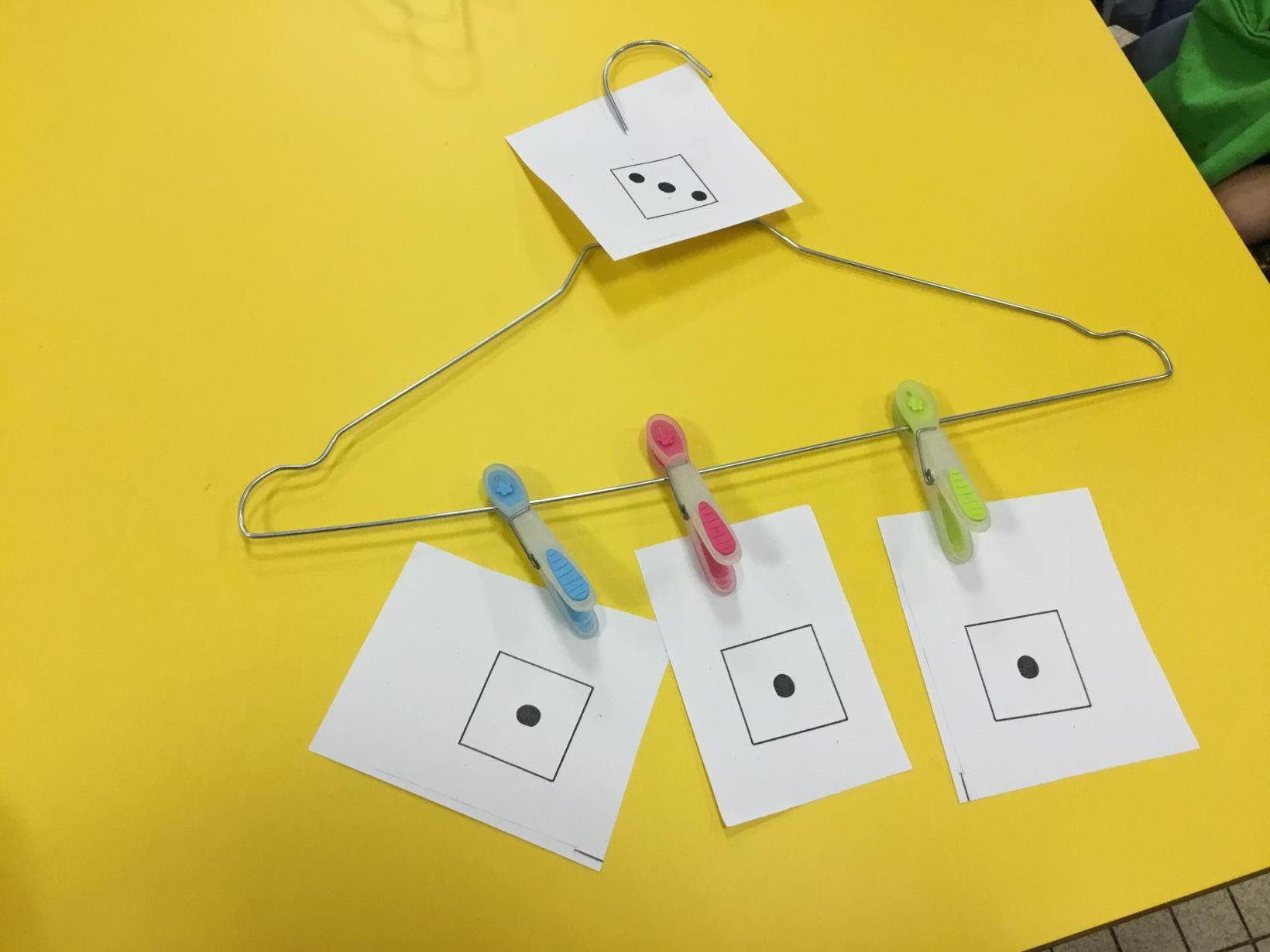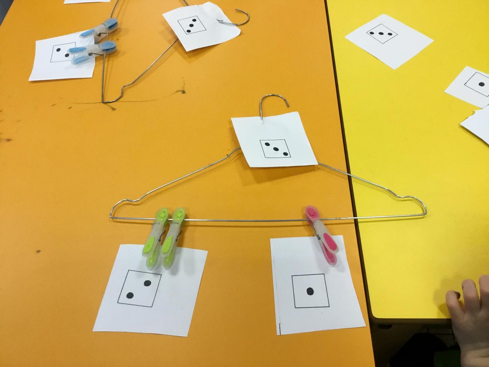 Pour bien comprendre le nombre et ce qu’il représente la maîtresse nous a proposé de travailler avec des épingles à linge. Chacun a accroché 3 épingles sur un cintre. Certains en avaient mis une de chaque couleur, d’autres par exemple 2 roses et une jaune .. Ceci nous a permis de comprendre que 3 peut être 1 et 1 et 1 ou 1 et 2 ou 2 et 1 . Tout ce travail était pour développer des stratégies de dénombrements. Ainsi certains ont décomposé 4 : en 1 et 1 et 1 et 1 ou 2 et 1 et 1 ou 2 et 2 …..