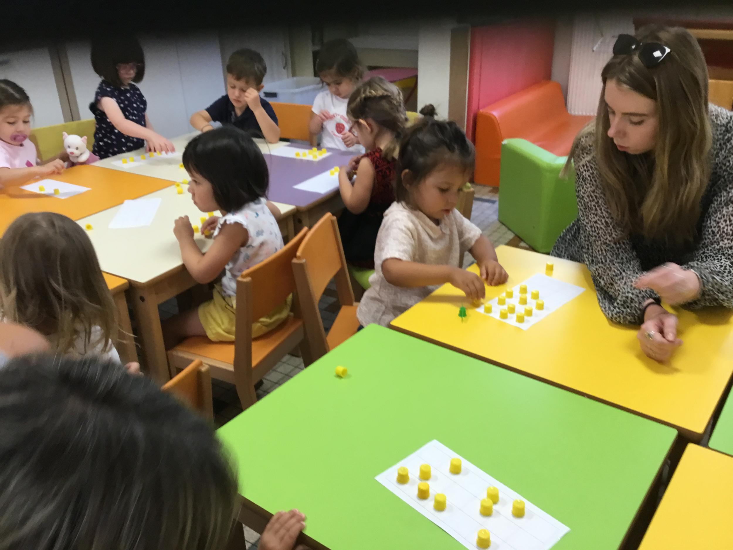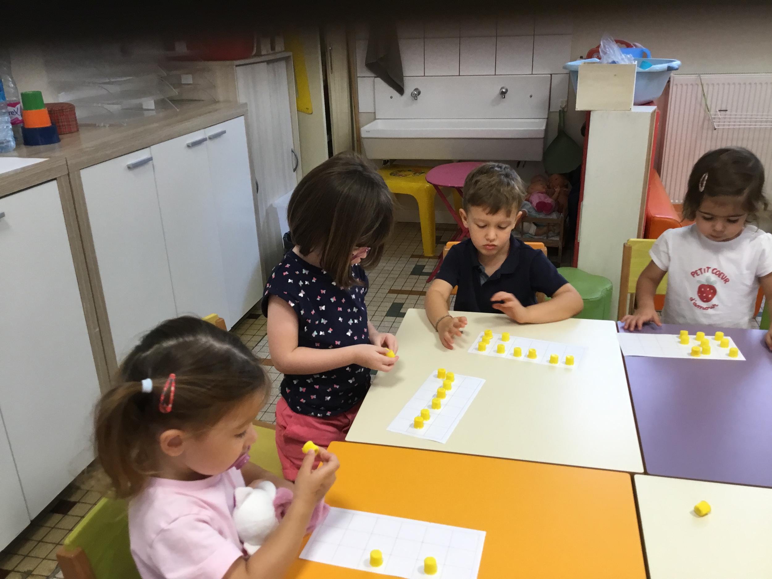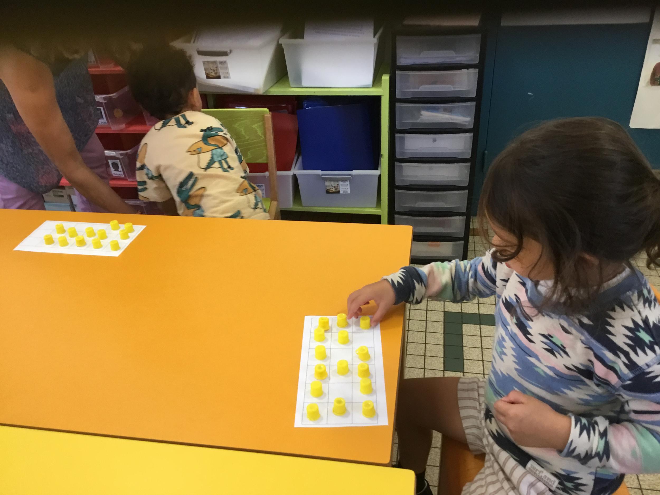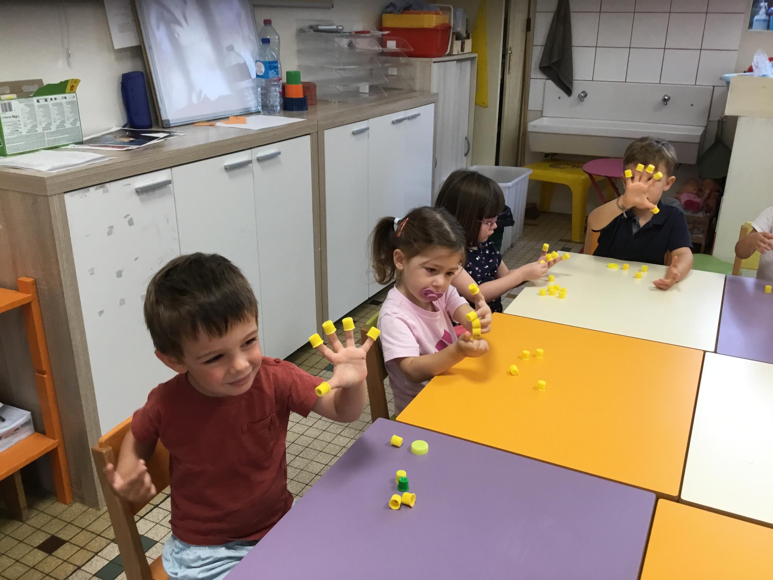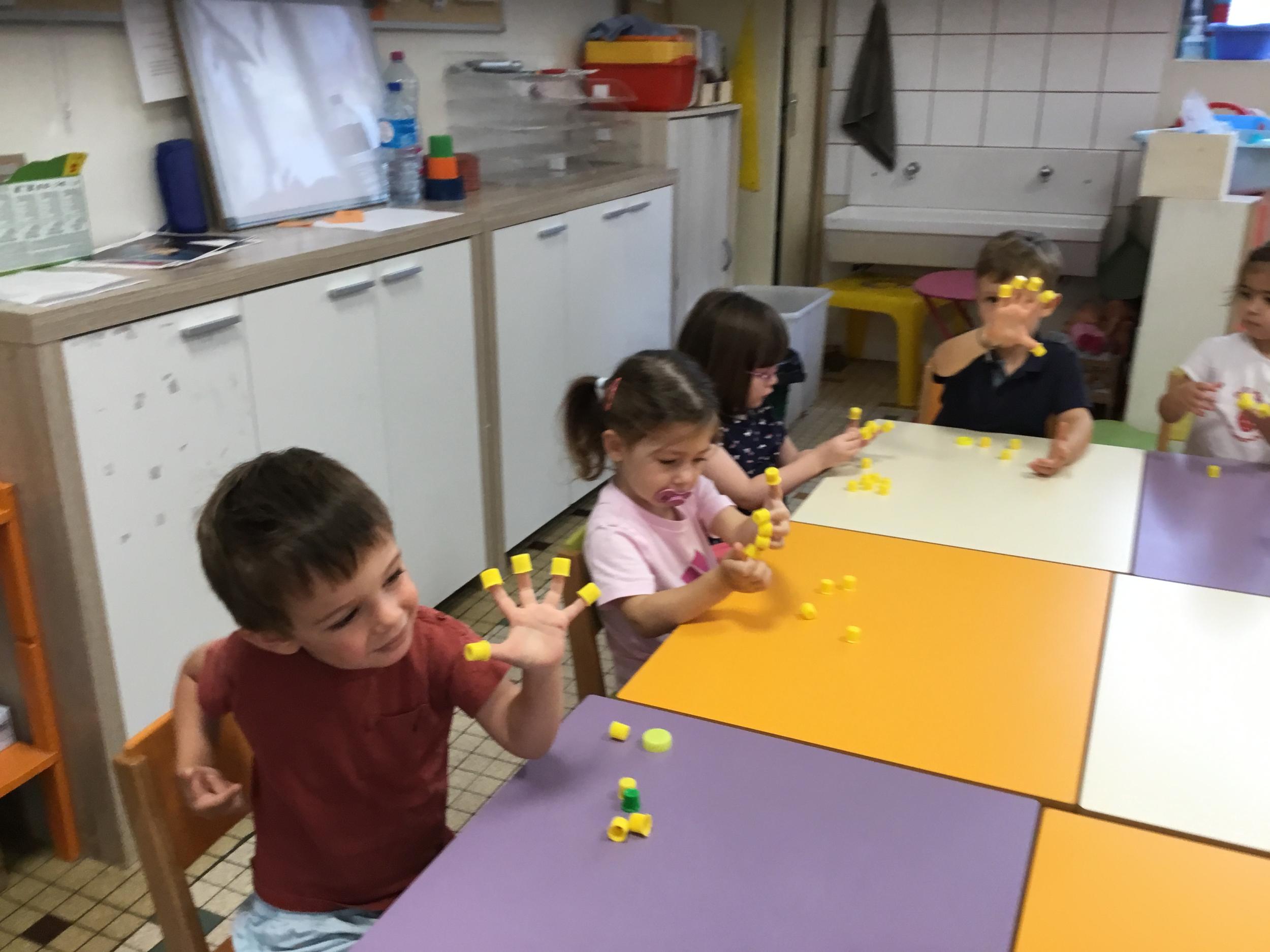 Pour comprendre les notions de « trop » ou « pas assez » nous avons travaillé avec des bouchons . La maîtresse a distribué des bouchons et chacun devait les placer au bout des doigts ….. Un petit chapeau sur chaque doigt … l’occasion de travailler la motricité fine mais surtout d’observer si « j’en ai trop ou pas assez » Puis nous avons continué en posant un bouchon sur chaque case d un quadrillage .