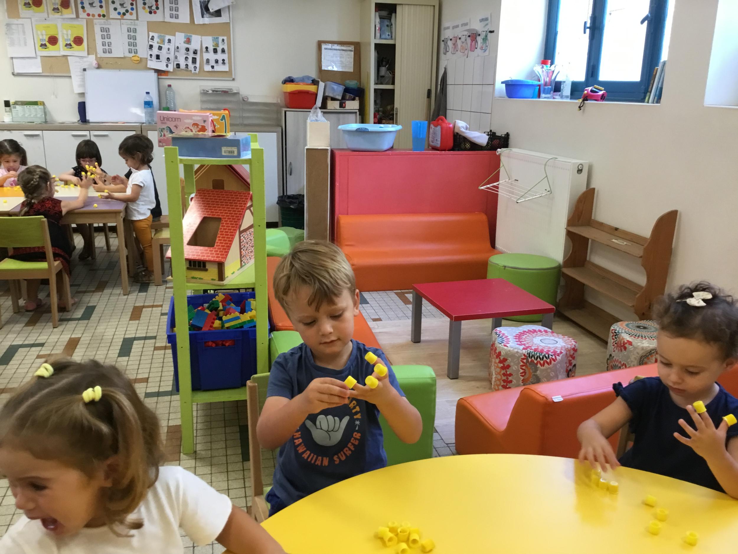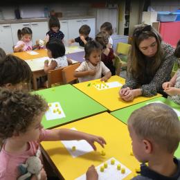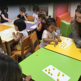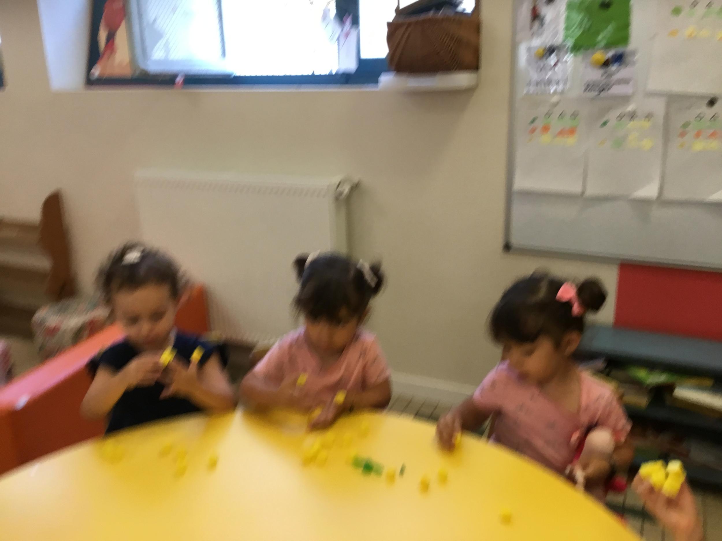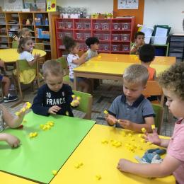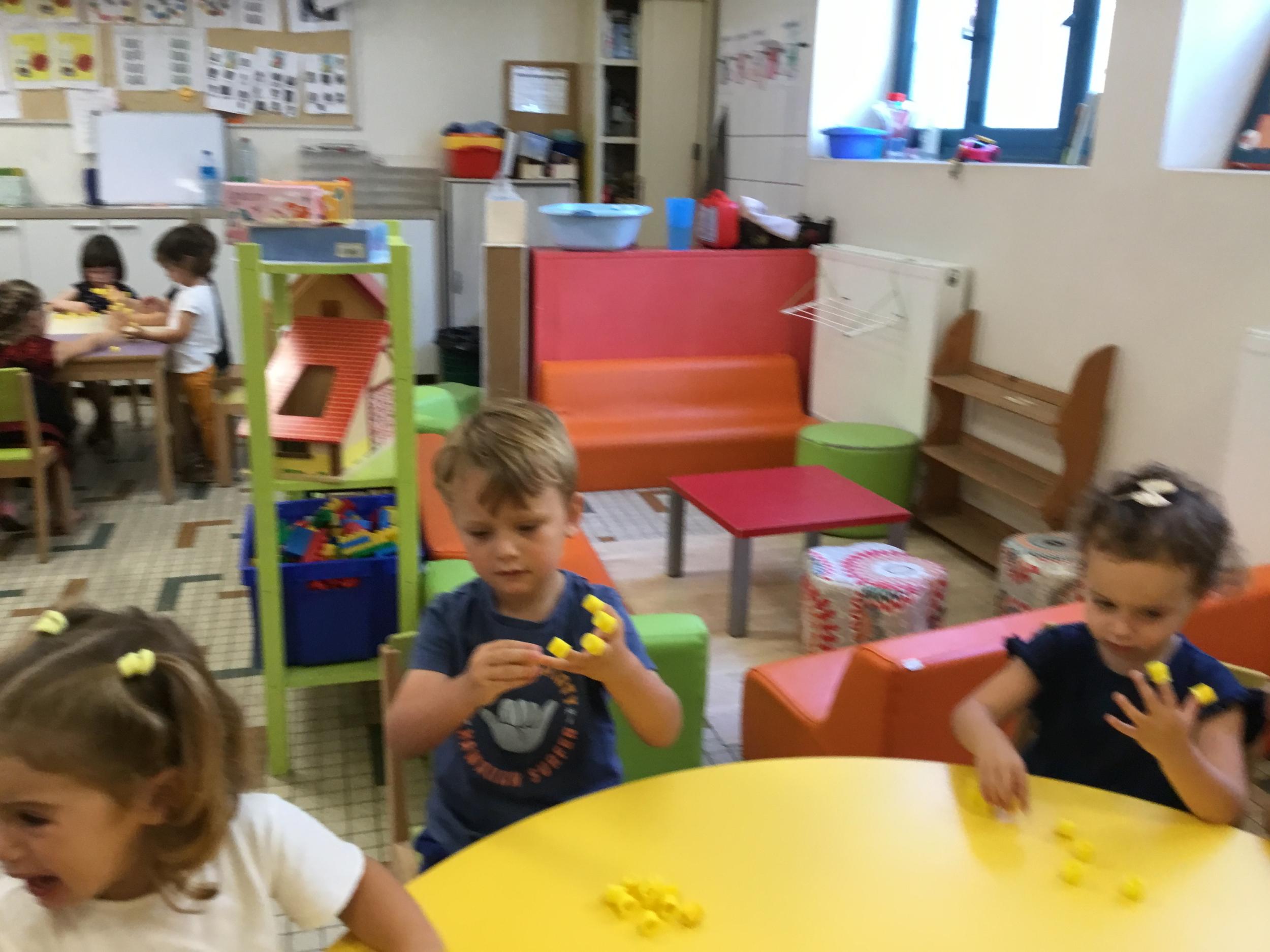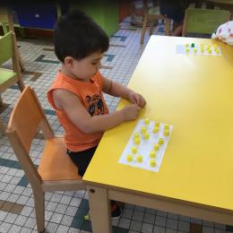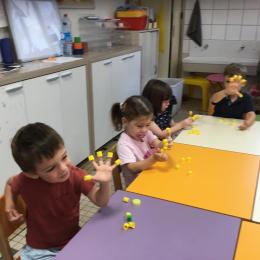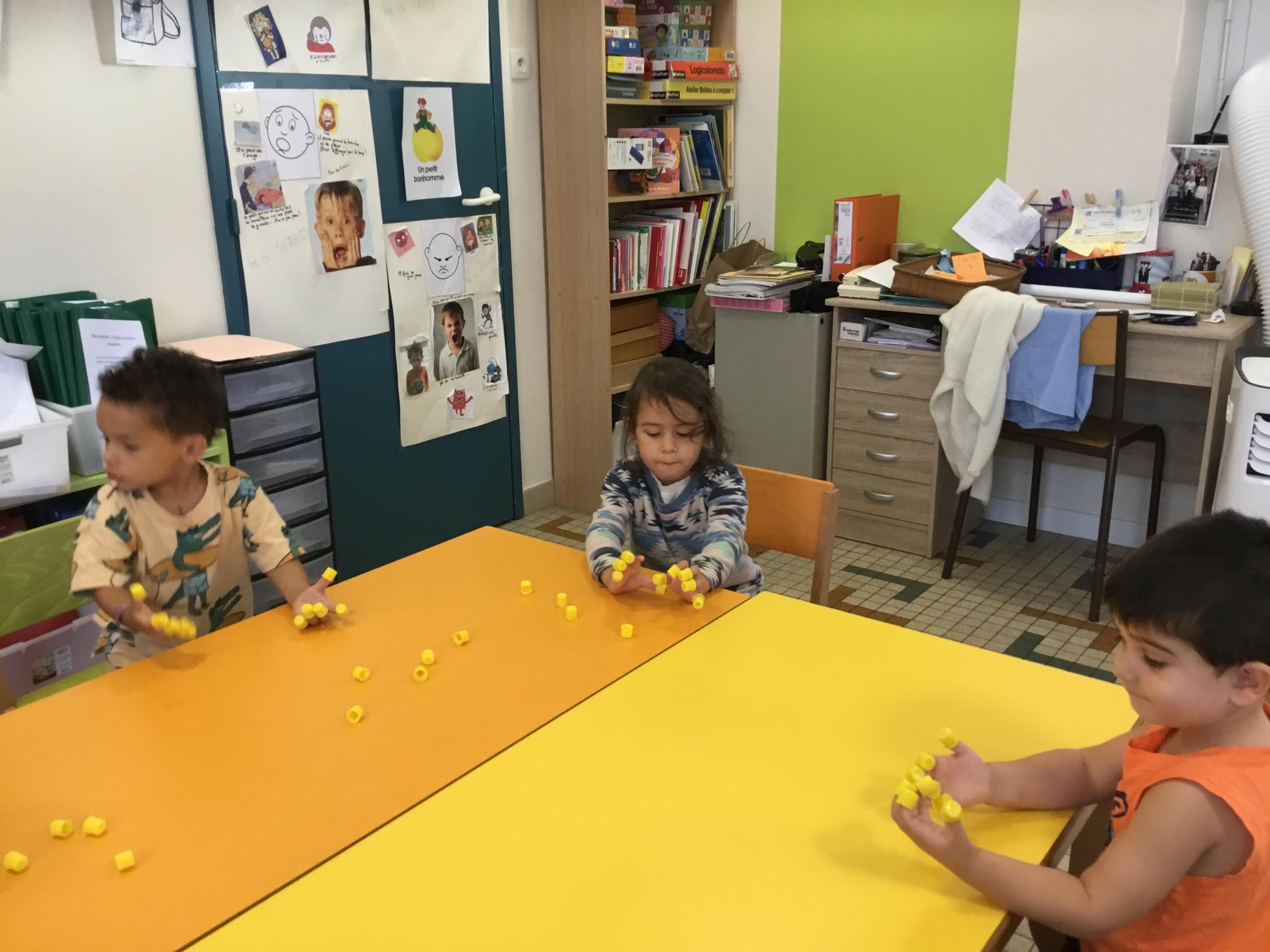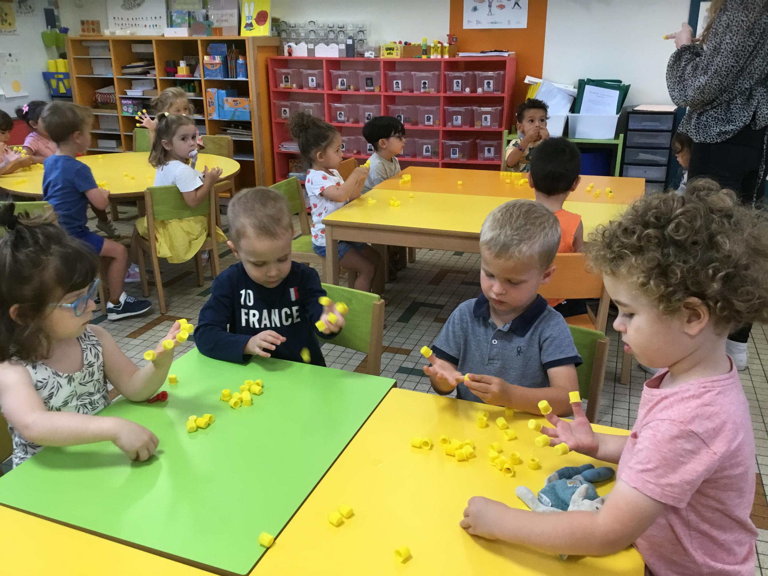 Pour comprendre les notions de « trop » ou « pas assez » nous avons travaillé avec des bouchons . La maîtresse a distribué des bouchons et chacun devait les placer au bout des doigts ….. Un petit chapeau sur chaque doigt … l’occasion de travailler la motricité fine mais surtout d’observer si « j’en ai trop ou pas assez » Puis nous avons continué en posant un bouchon sur chaque case d un quadrillage .